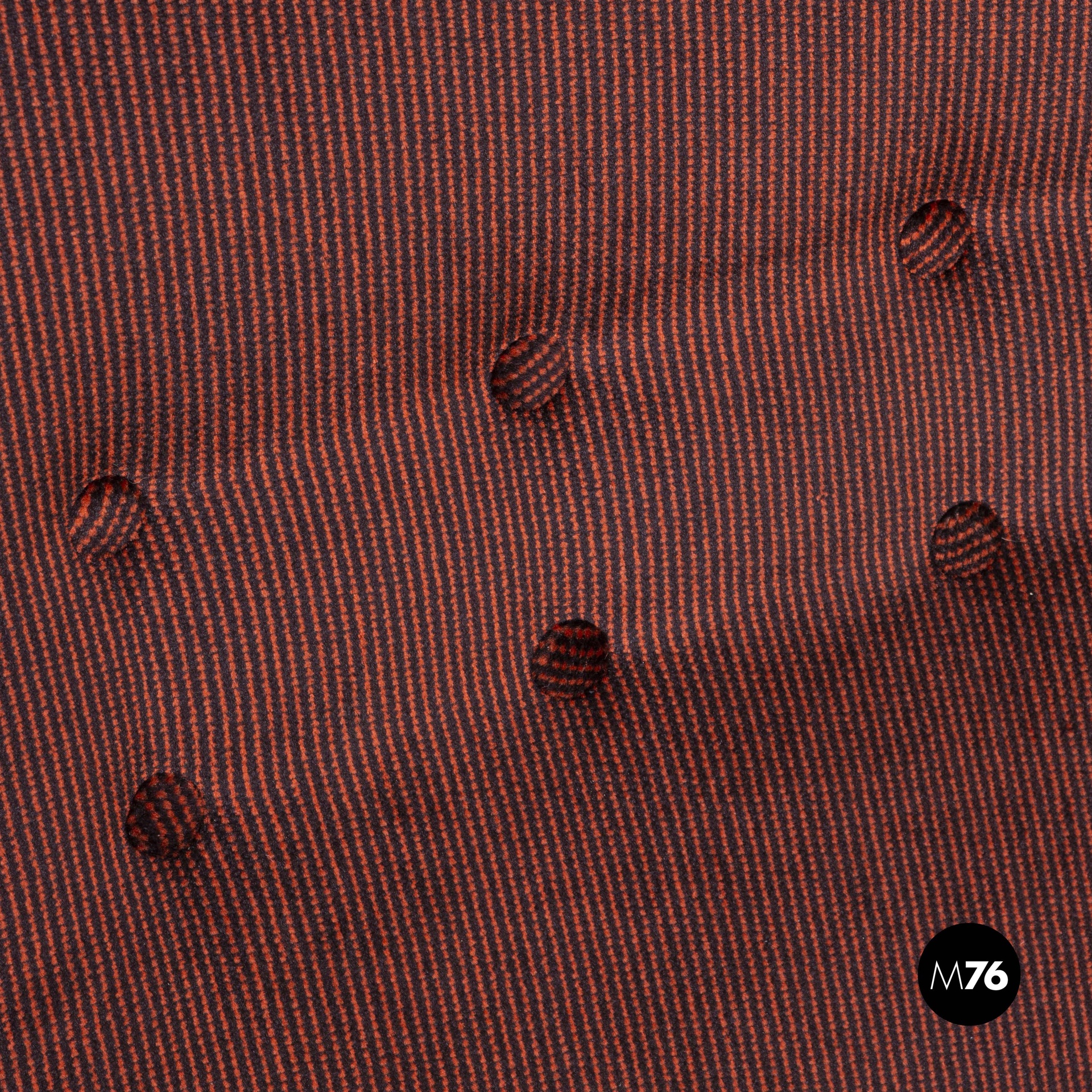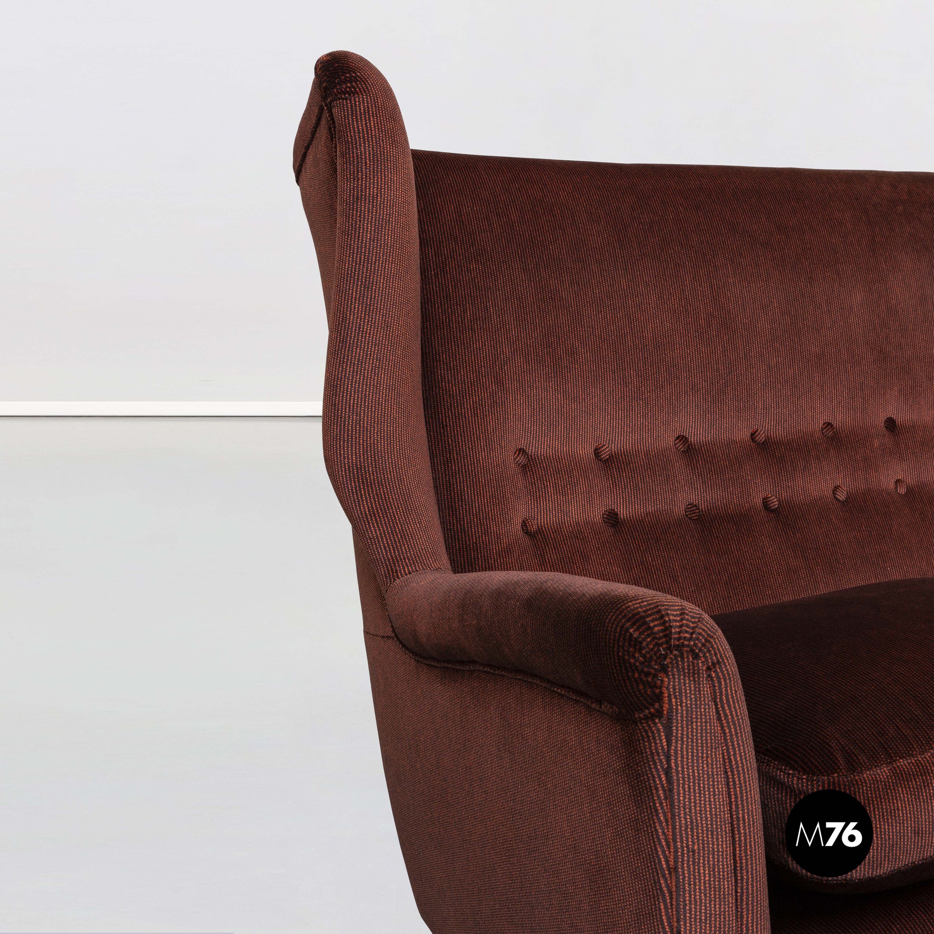 Divano a due posti in velluto a coste rosso scuro. Struttura con braccioli e schienale alto e confortevole, il tutto rivestito nel suo tessuto originale, con un’unica linea di cucitura su di esso e un’ampia forma curva per il poggiatesta. Schienale rifinito con bottoni. Poggia su quattro gambe tornite in legno, con una struttura robusta.