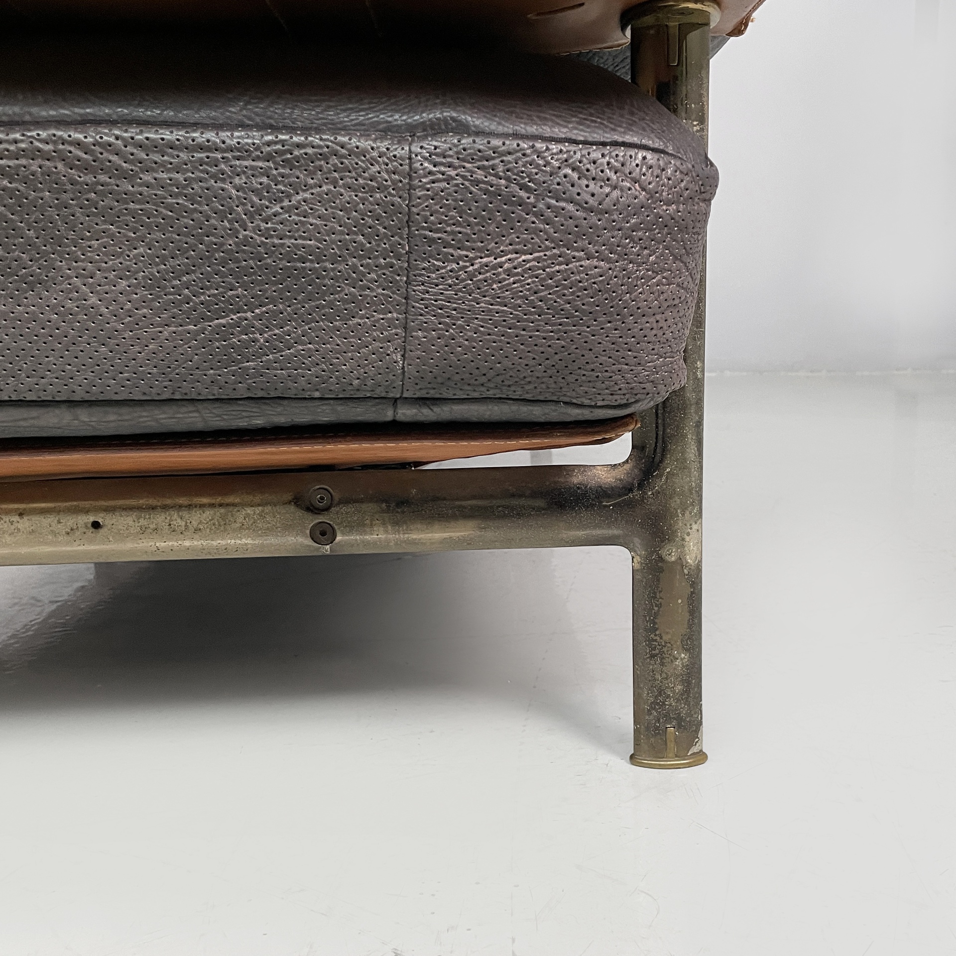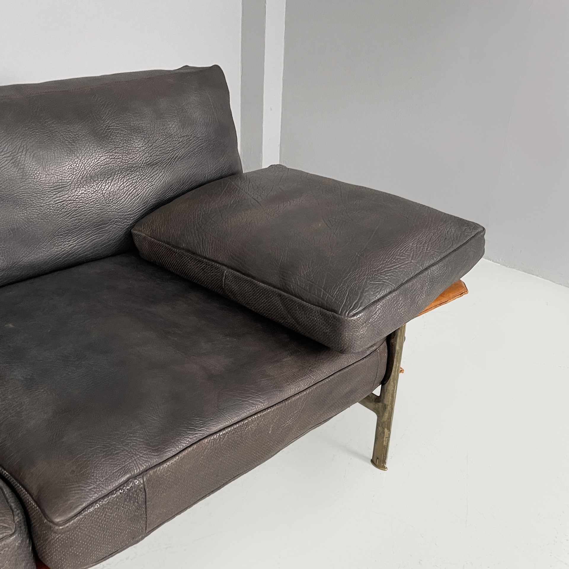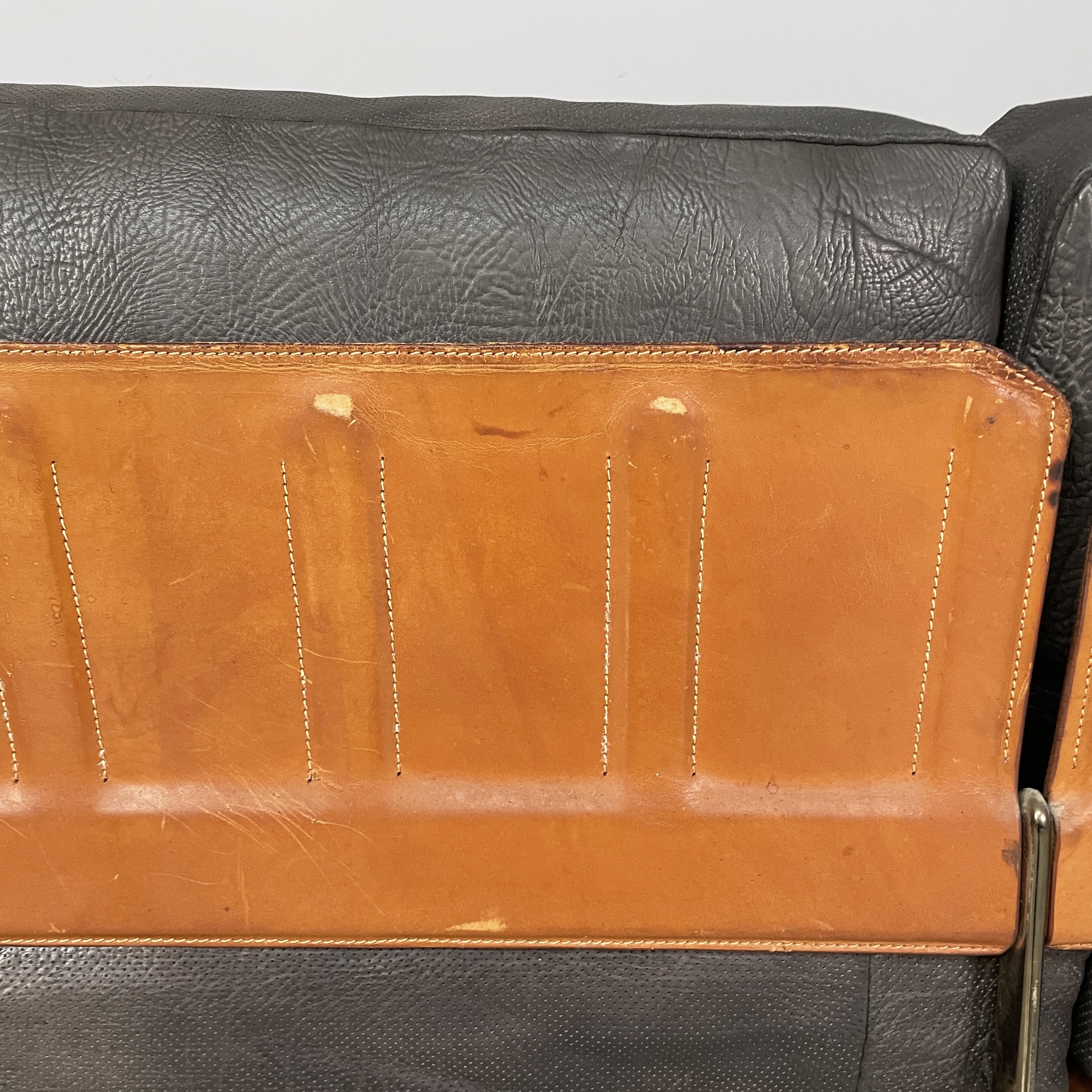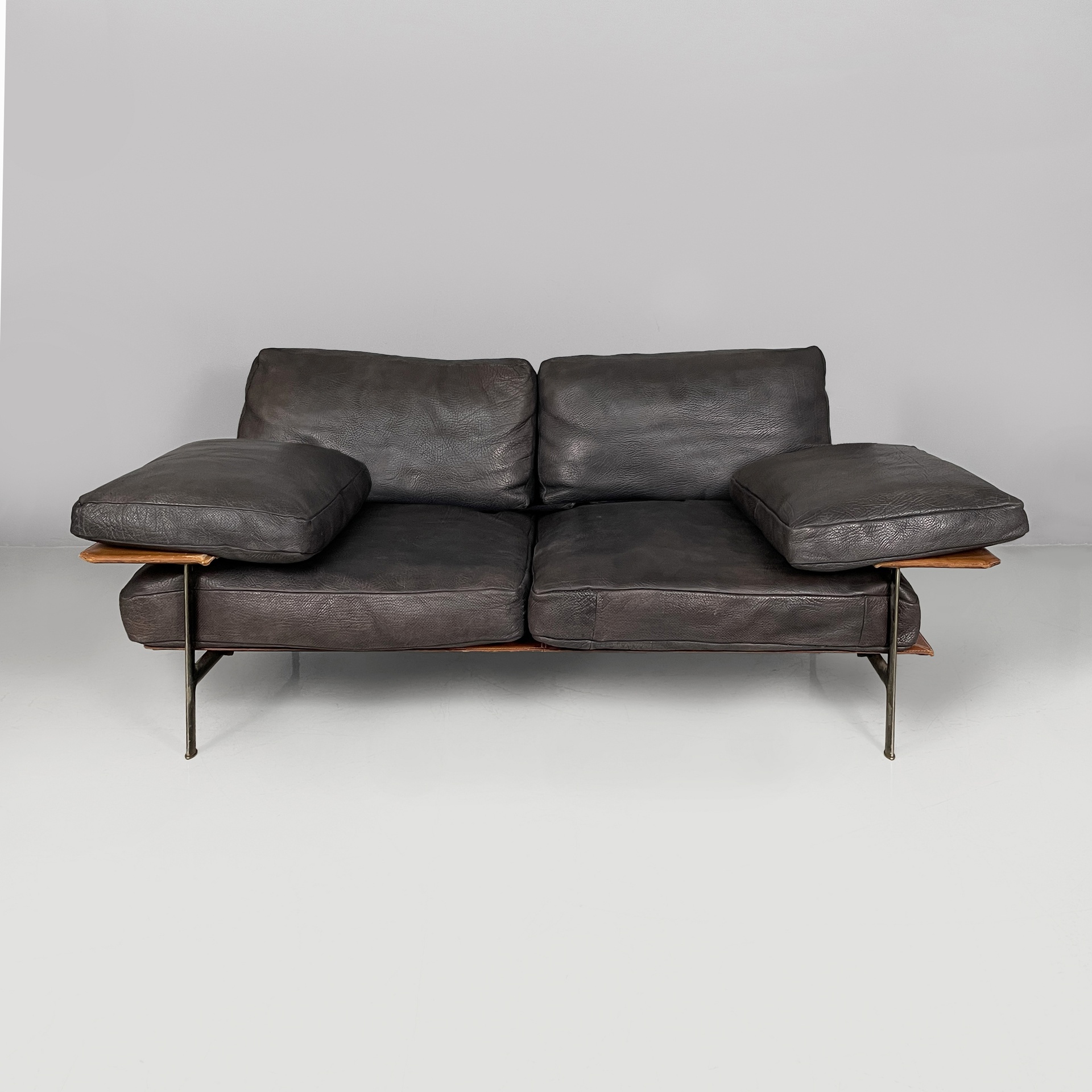 Divano a due posti modello Diesis in pelle nera e marrone di bufalo. La seduta, lo schienale sono composti da cuscini rettangolari in pelle nera. I braccioli sono composti da una struttura rivestita in pelle marrone, su cui poggiano i cuscini rettangolari in pelle nera. I cuscini presentano un profilo in pelle microforato. La struttura è in acciaio con dettagli in ottone.