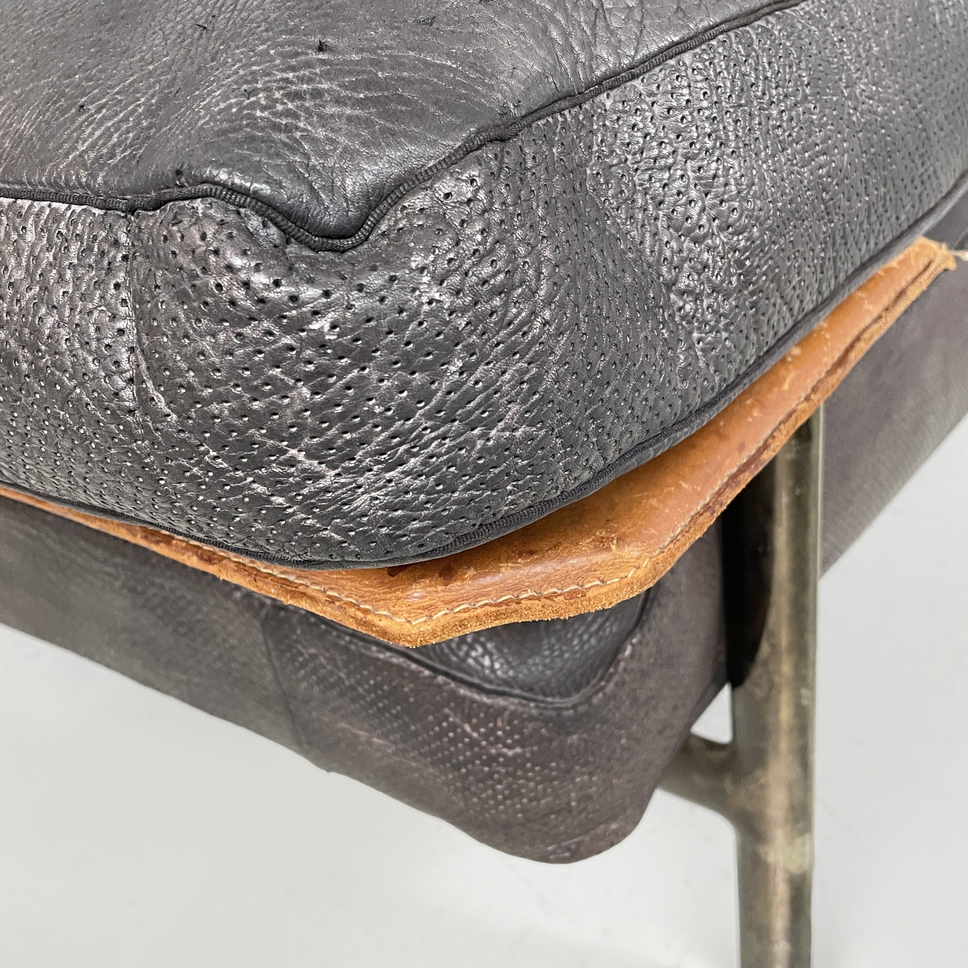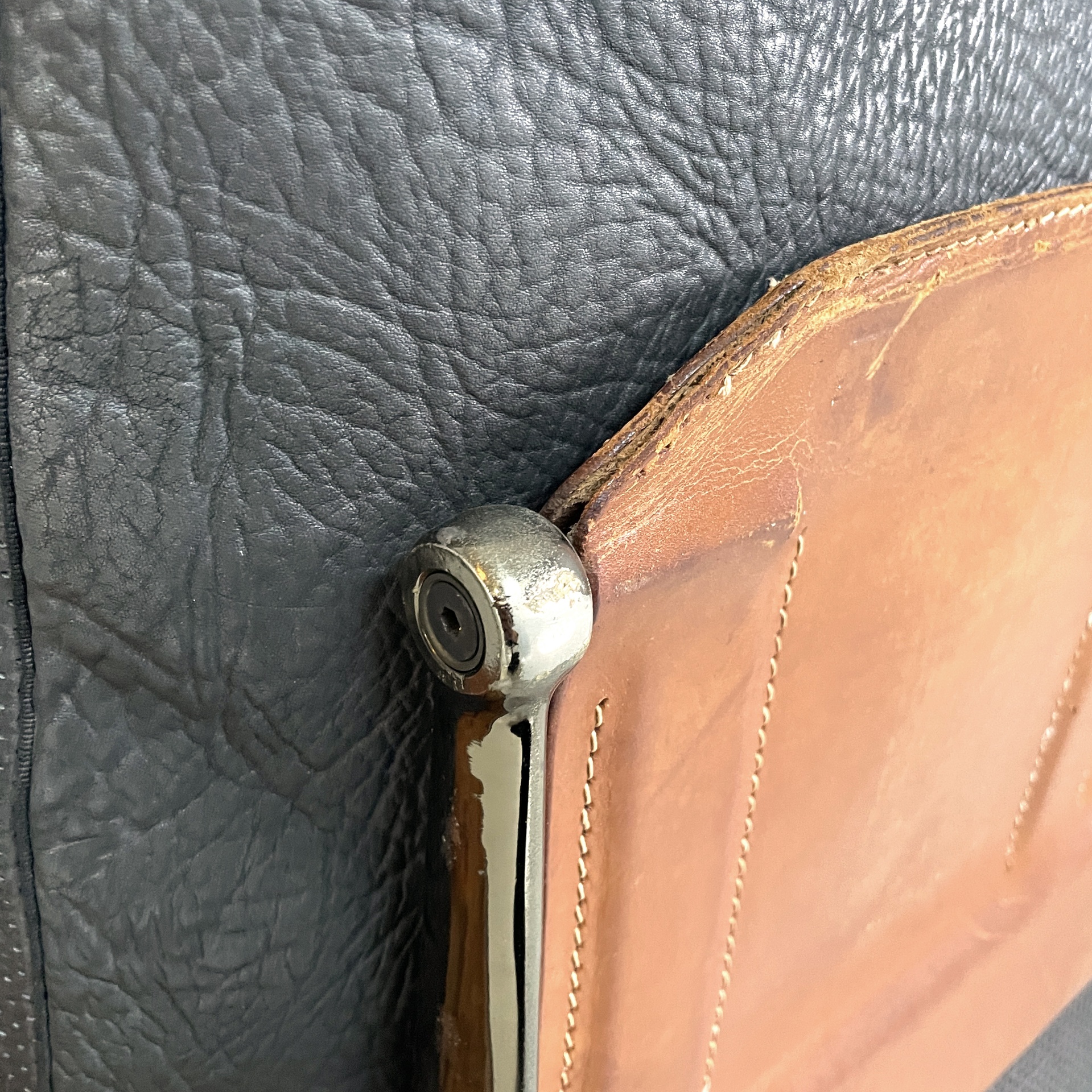 Buone condizioni. Segni sparsi sul cuoio dati dall’utilizzo. Segni del tempo sparsi sul metallo.
