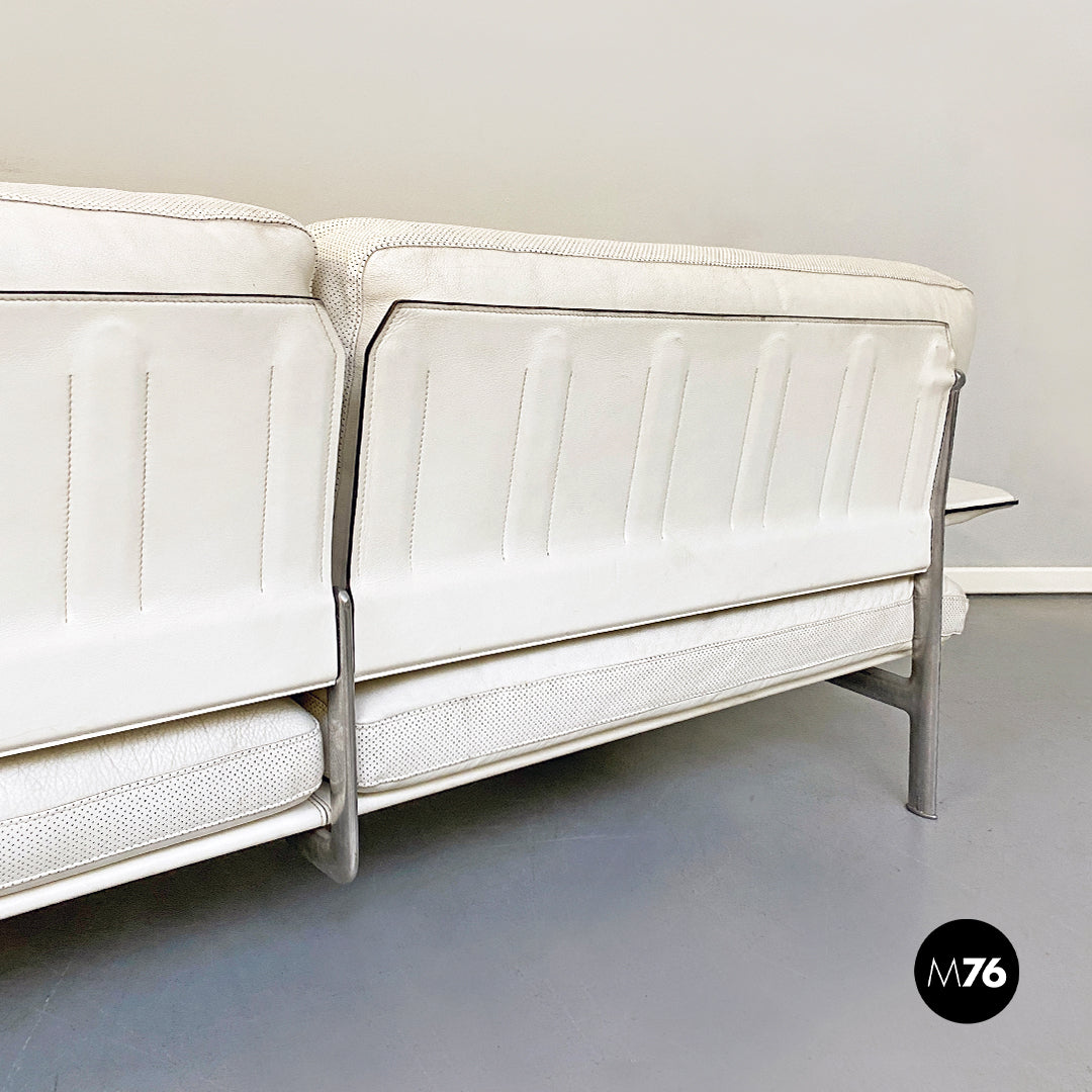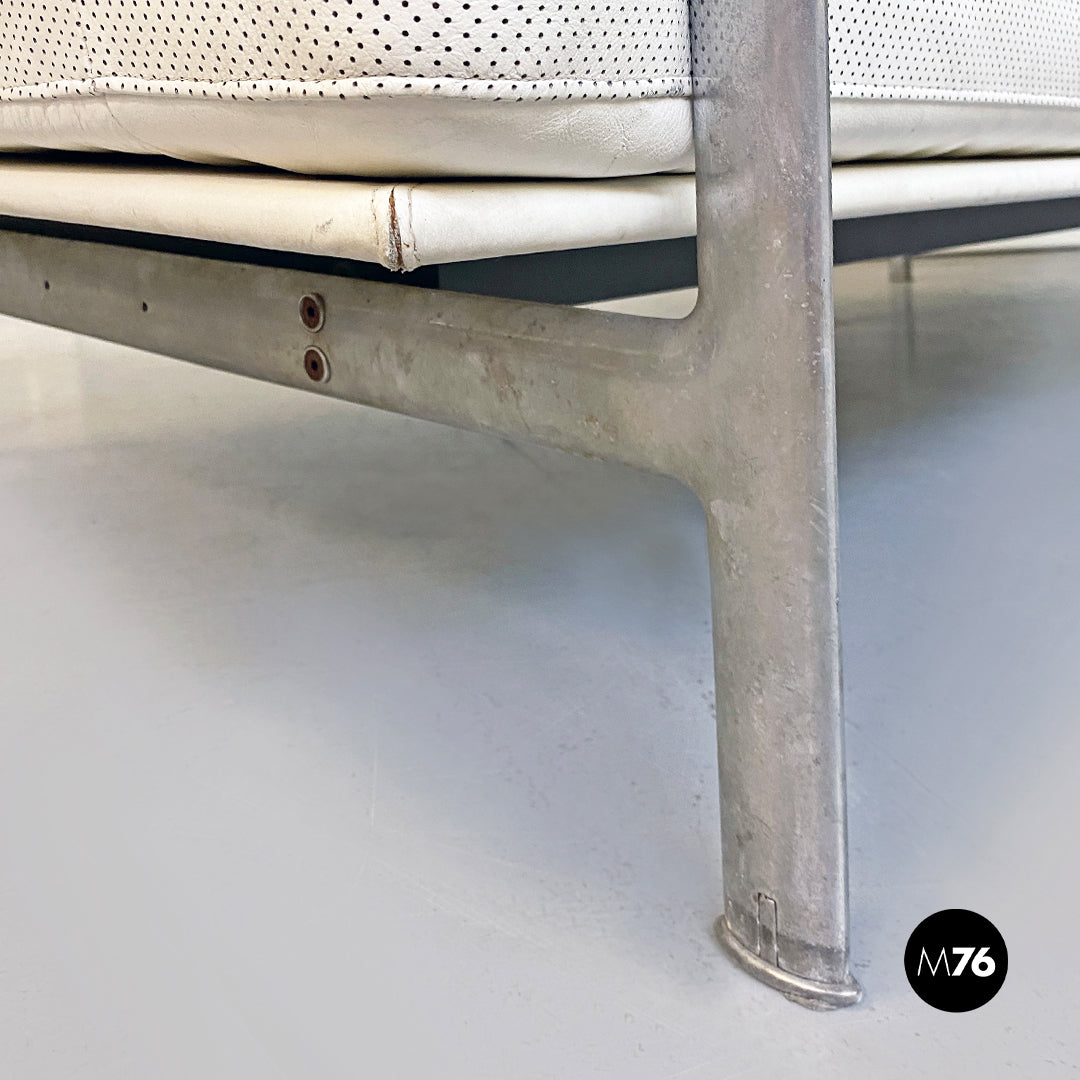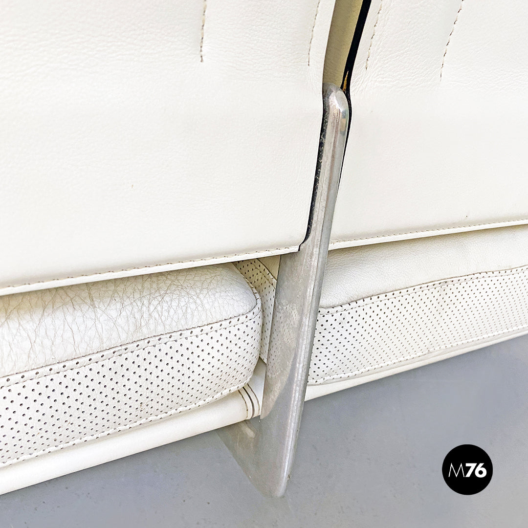 Divano tre posti modello Diesis con braccioli, con struttura in alluminio e cuscini imbottiti e rivesititi in pelle bianca dell’epoca, ancora perfetta.