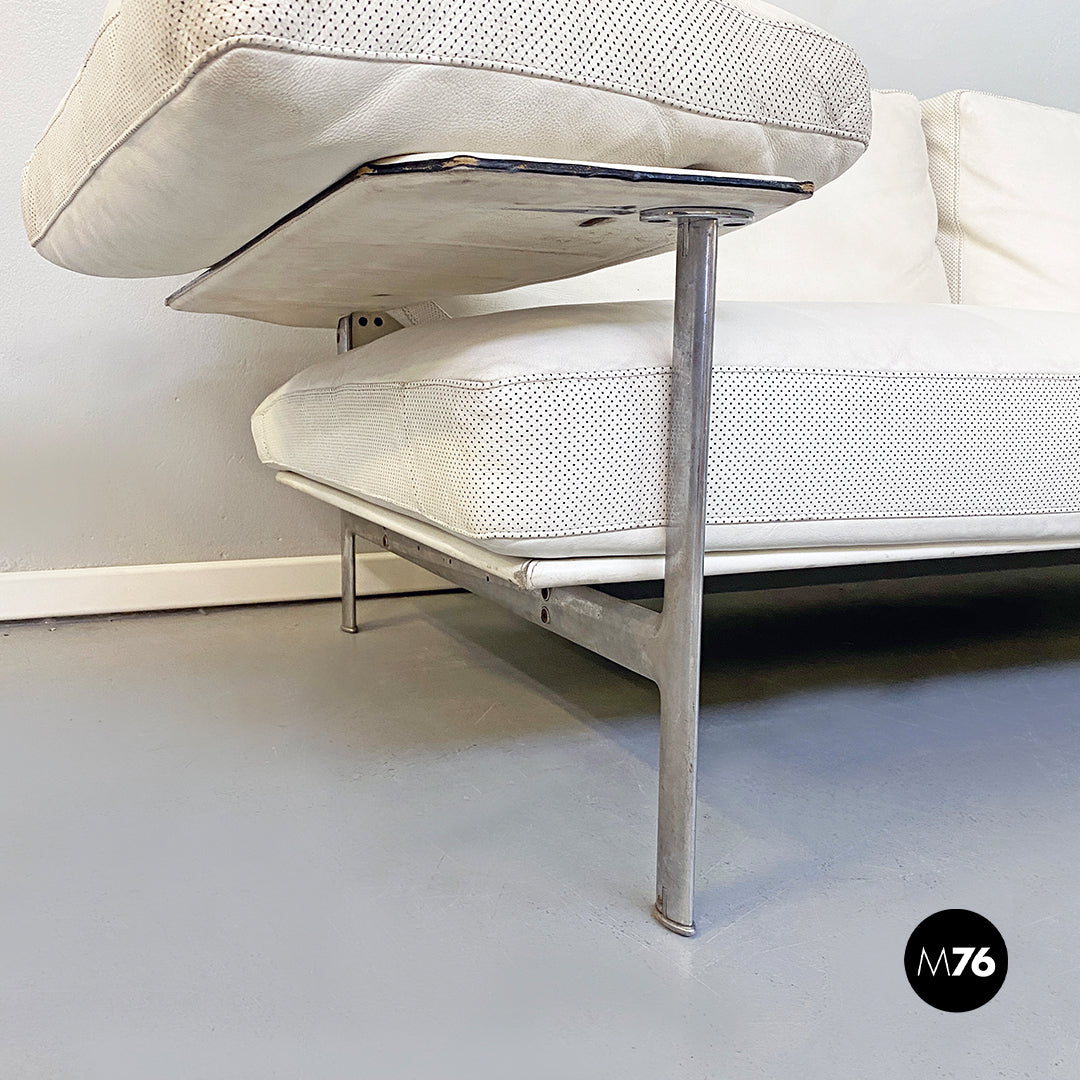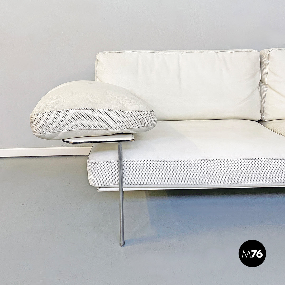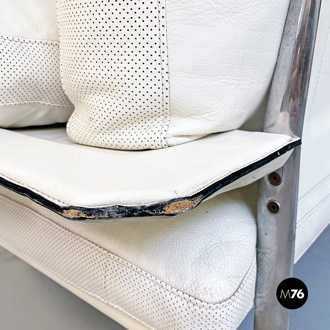 Divano tre posti modello Diesis con braccioli, con struttura in alluminio e cuscini imbottiti e rivesititi in pelle bianca dell’epoca, ancora perfetta.