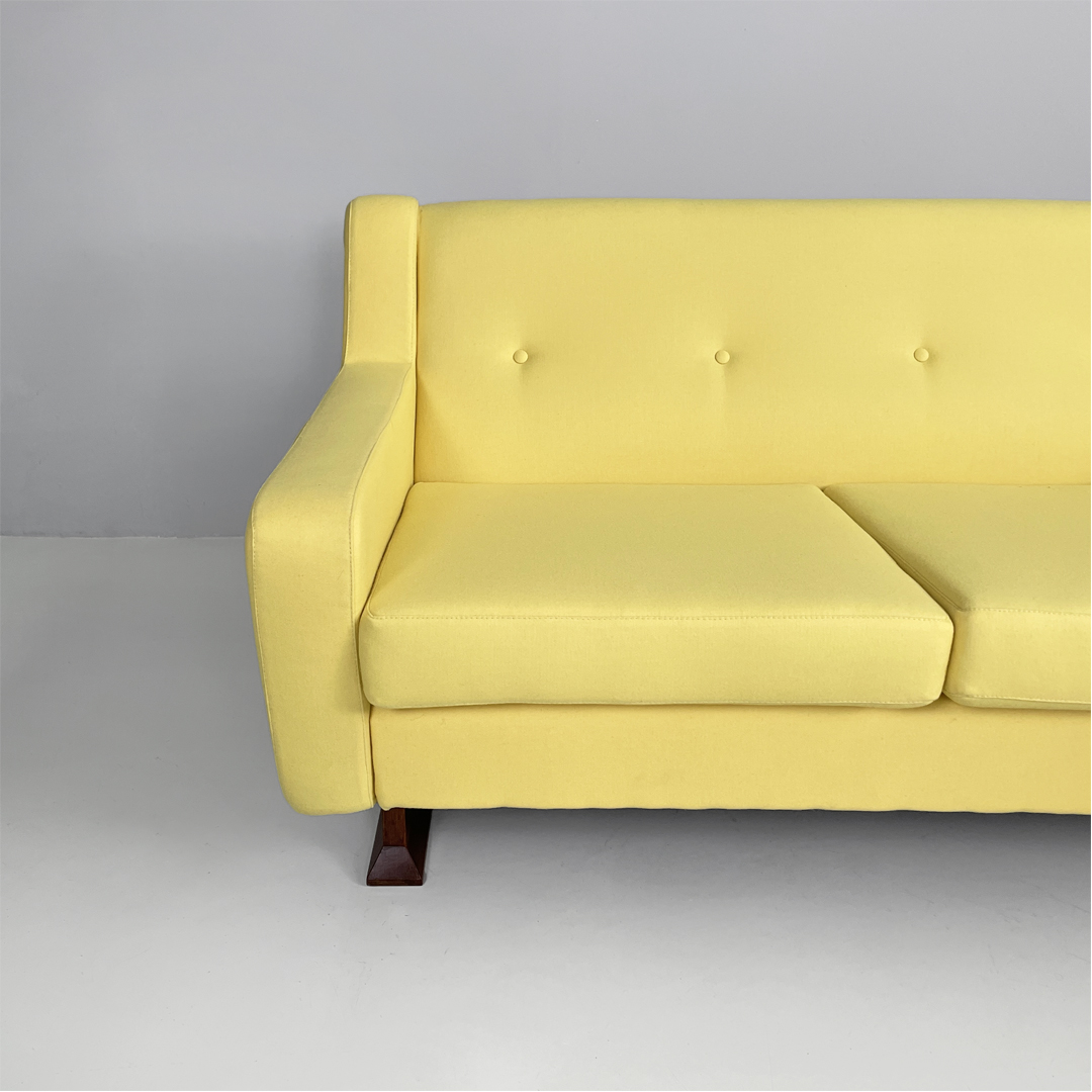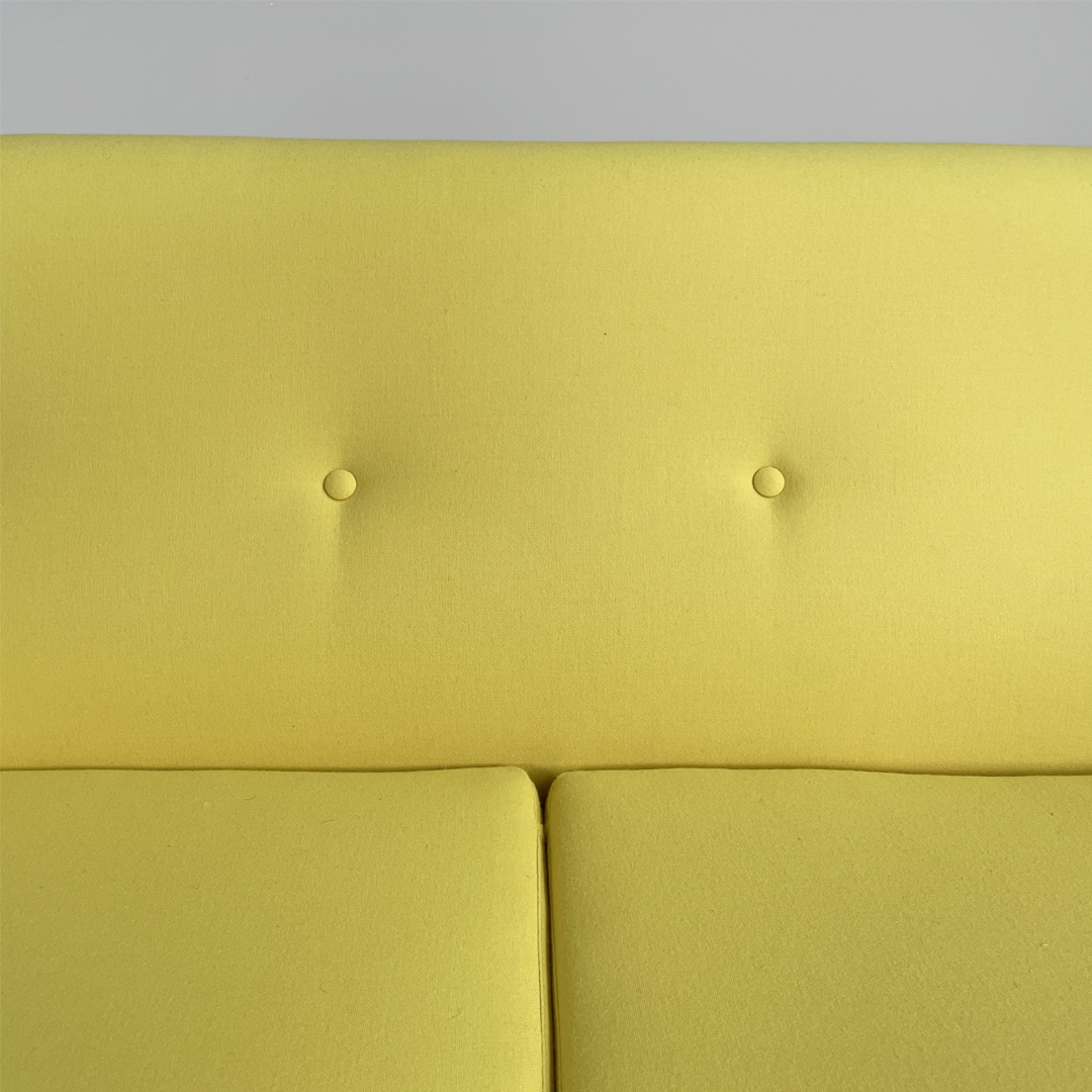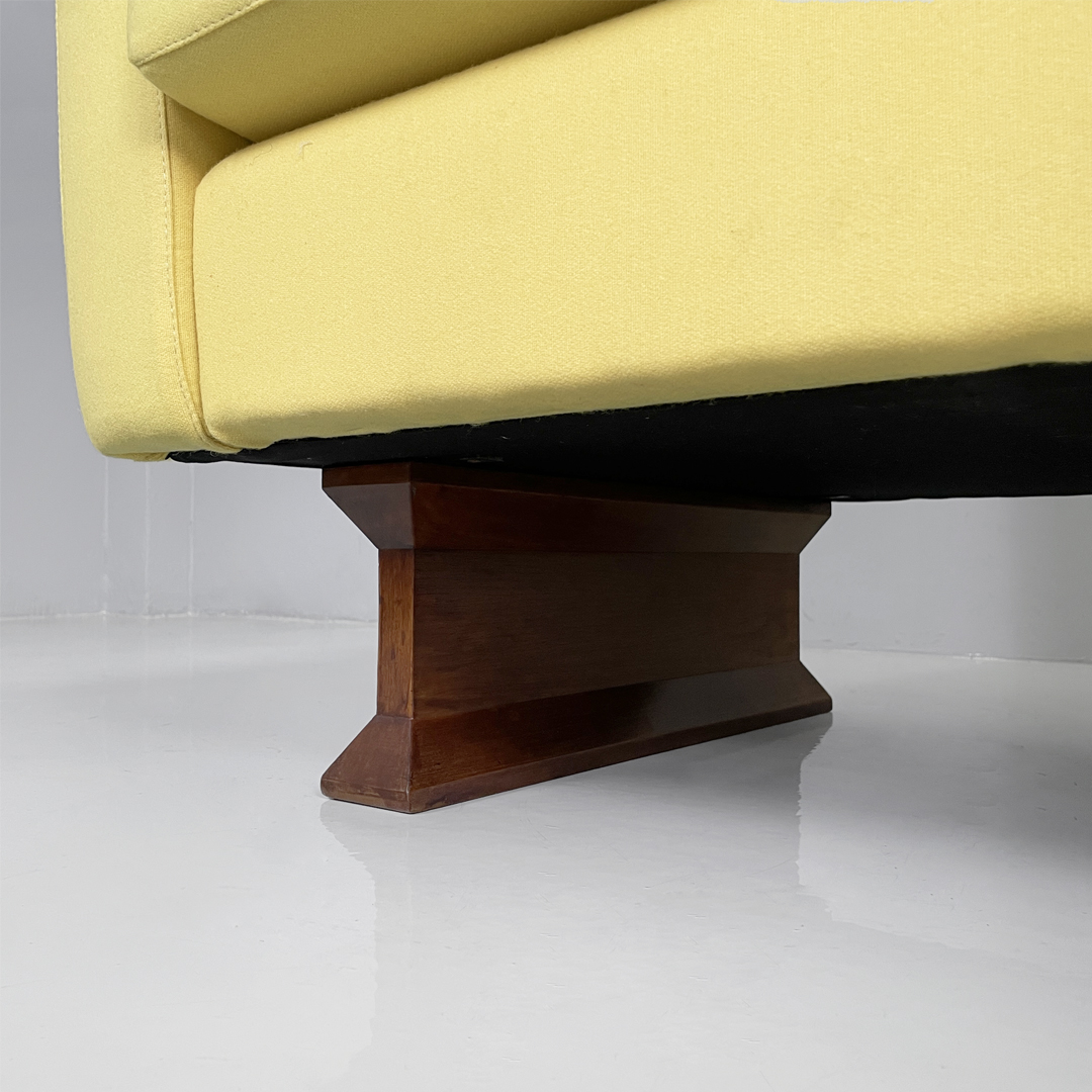 Divano modello DV33 con struttura in legno e rivestimento in tessuto. La seduta, schienale e braccioli sono imbottiti e rivestiti in tessuto giallo chiaro. La struttura e le due zampe sono in legno scuro.