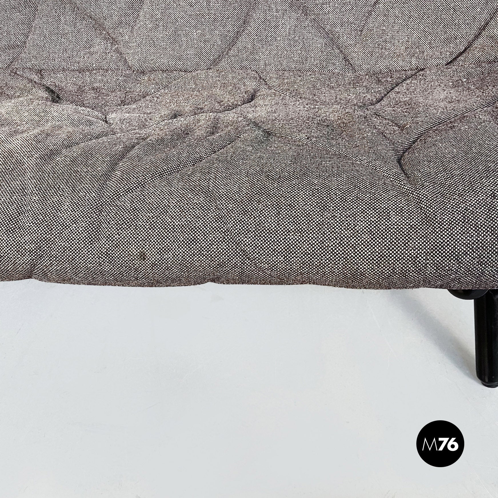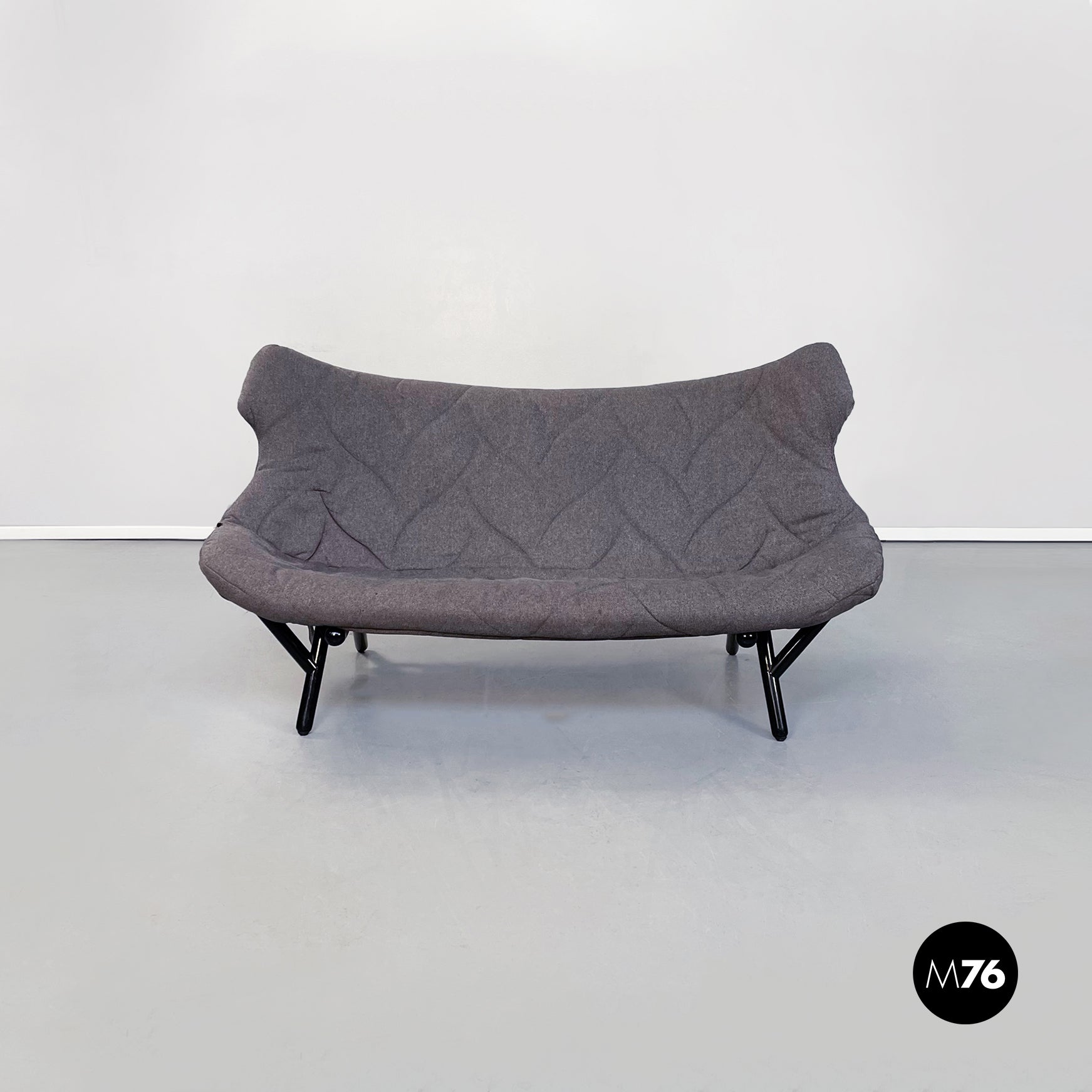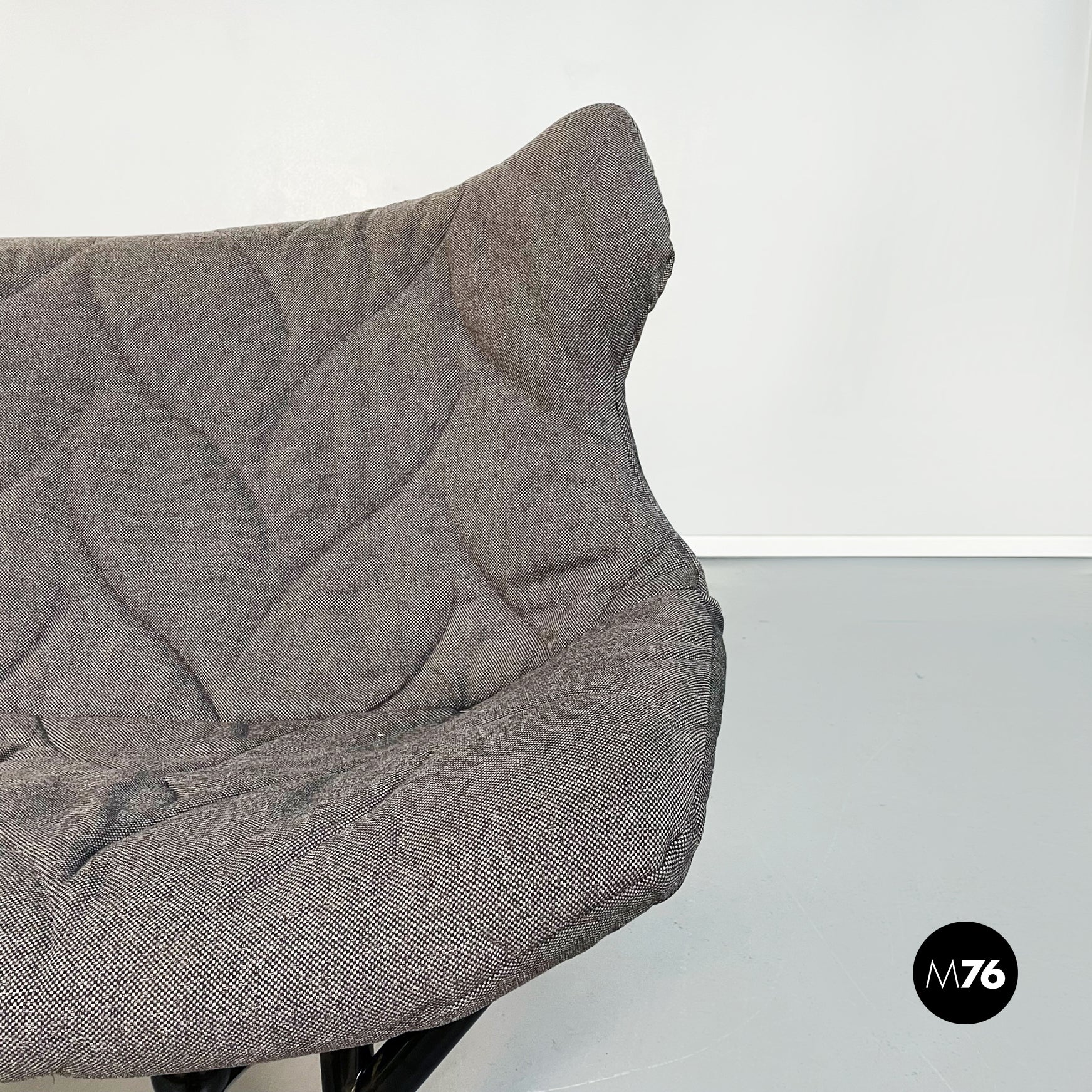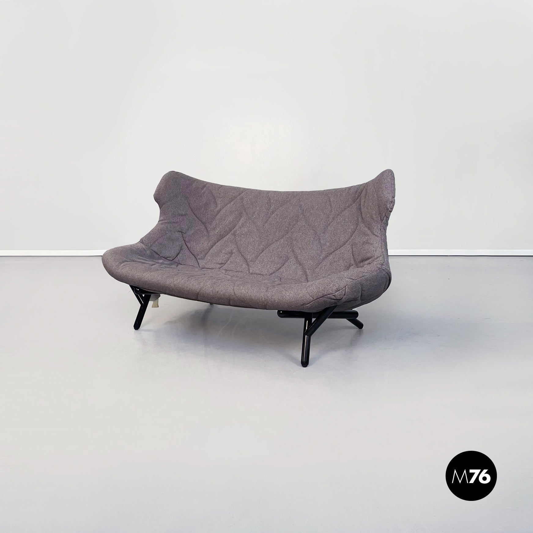 Divano modello Foliage a due posti con struttura tubolare in ferro verniciato nero, seduta e schienale imbottiti in schiuma poliuretanica e rivestita in tessuto grigio su cui sono impunturate delle forme di foglie. Infatti la seduta riprende la forma e l’idea della chioma di un albero.