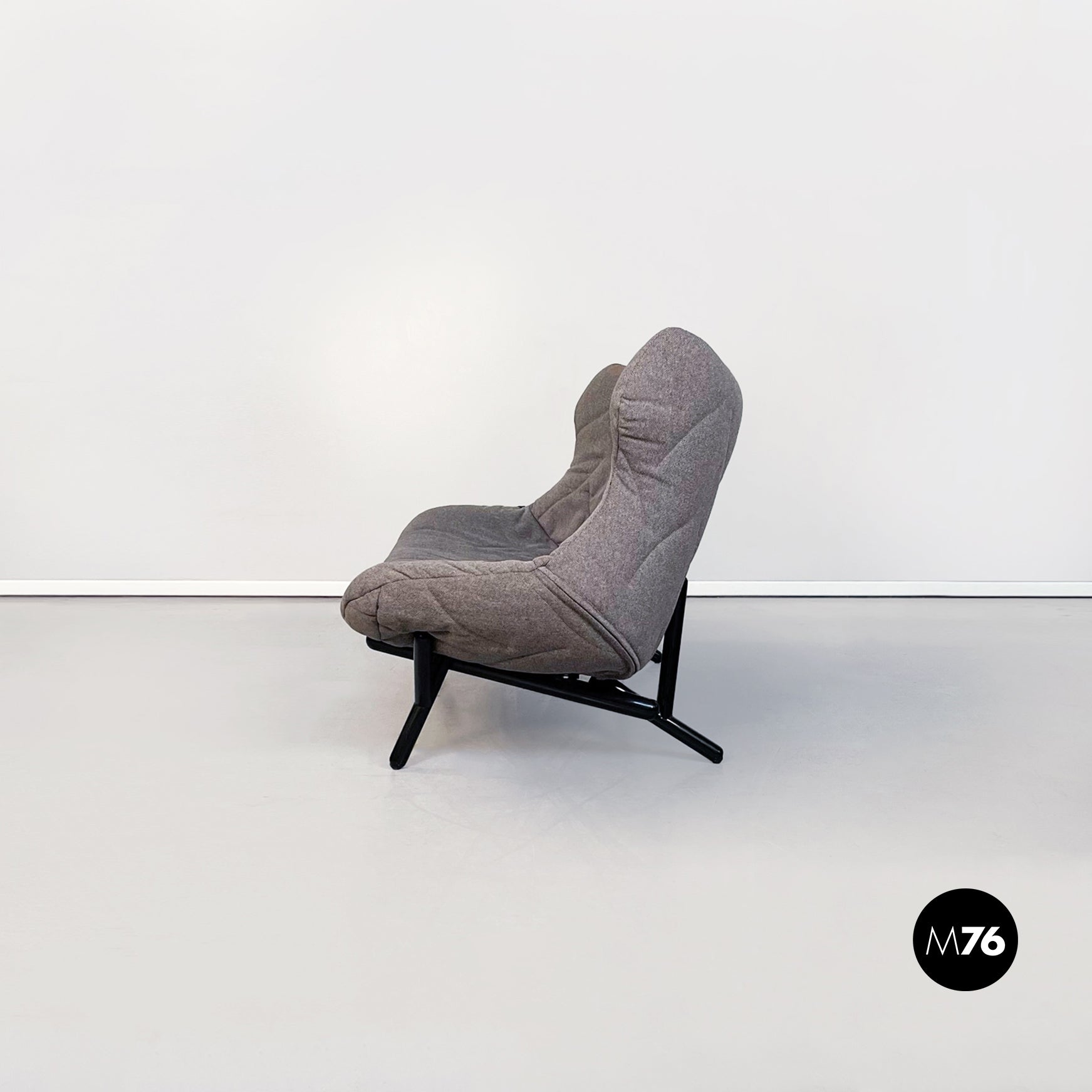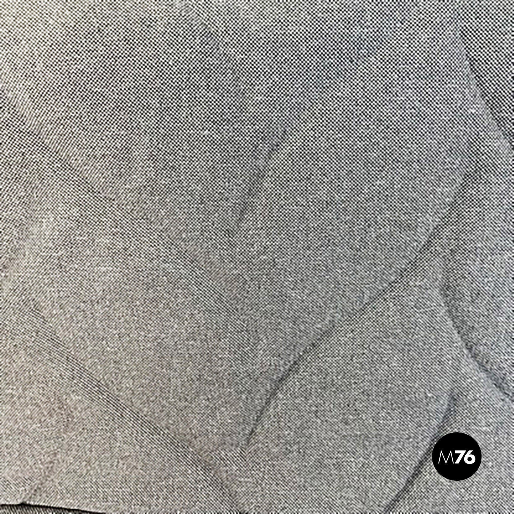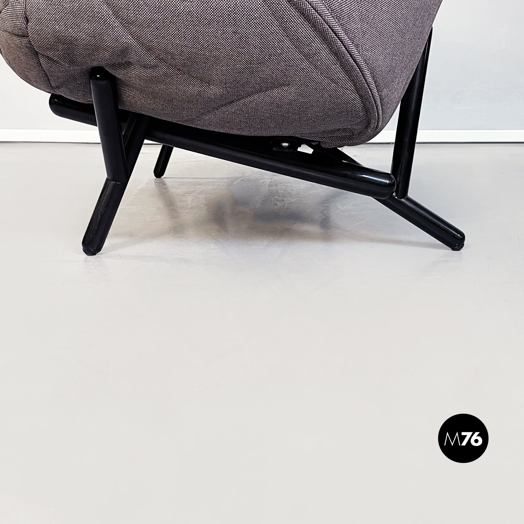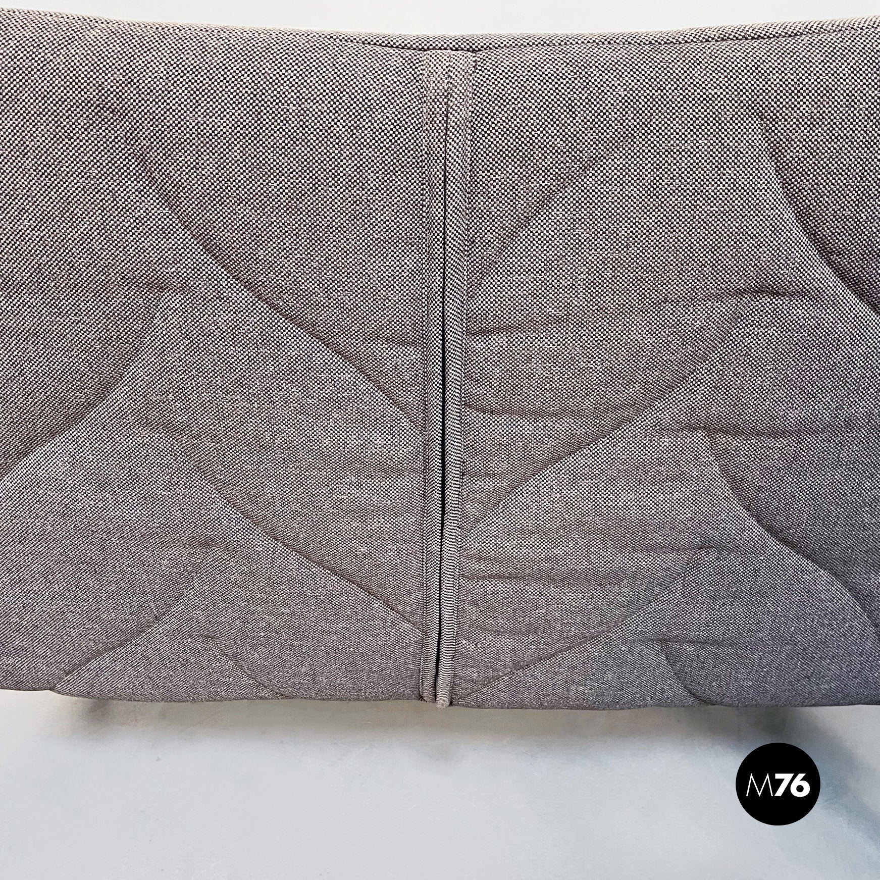 Divano modello Foliage a due posti con struttura tubolare in ferro verniciato nero, seduta e schienale imbottiti in schiuma poliuretanica e rivestita in tessuto grigio su cui sono impunturate delle forme di foglie. Infatti la seduta riprende la forma e l’idea della chioma di un albero.