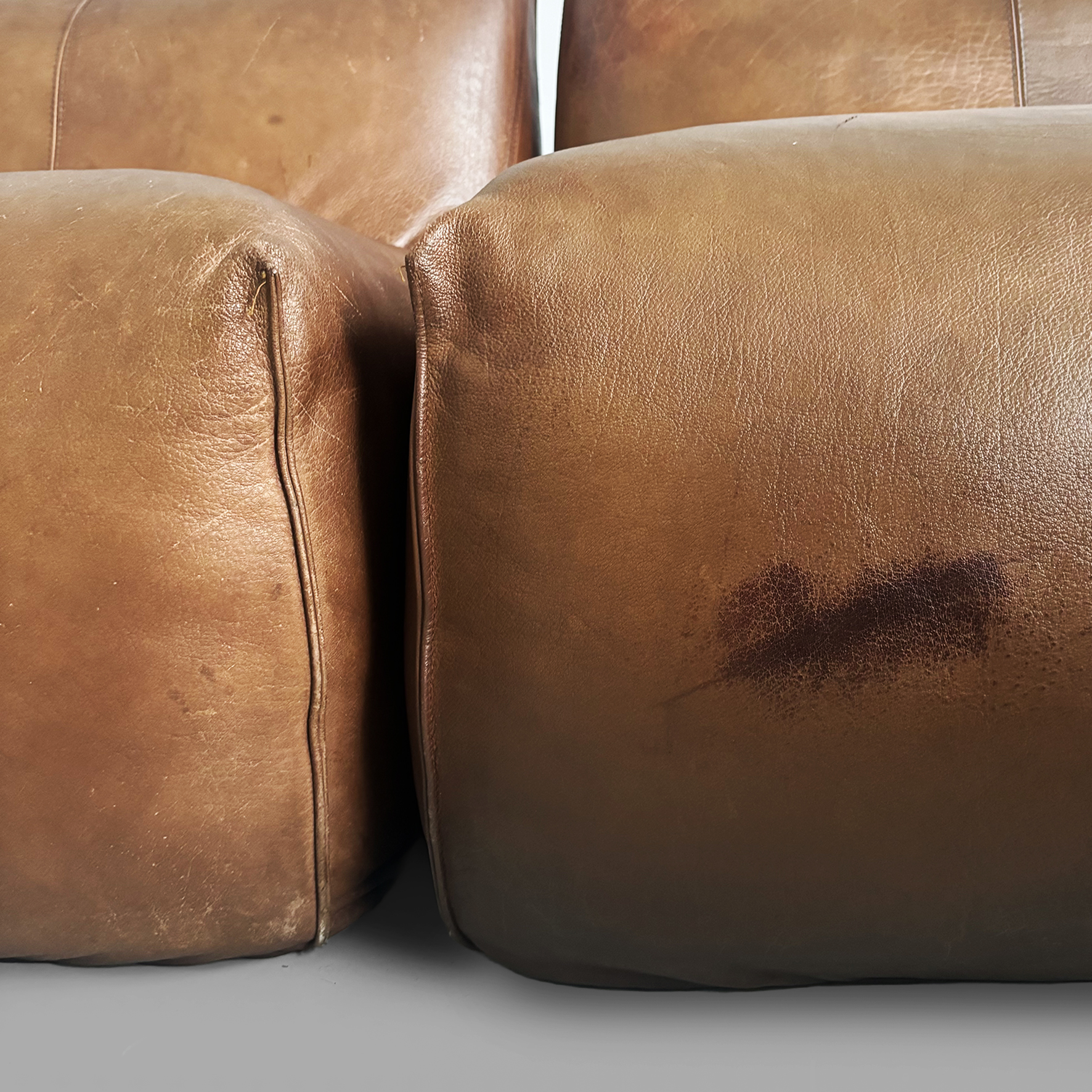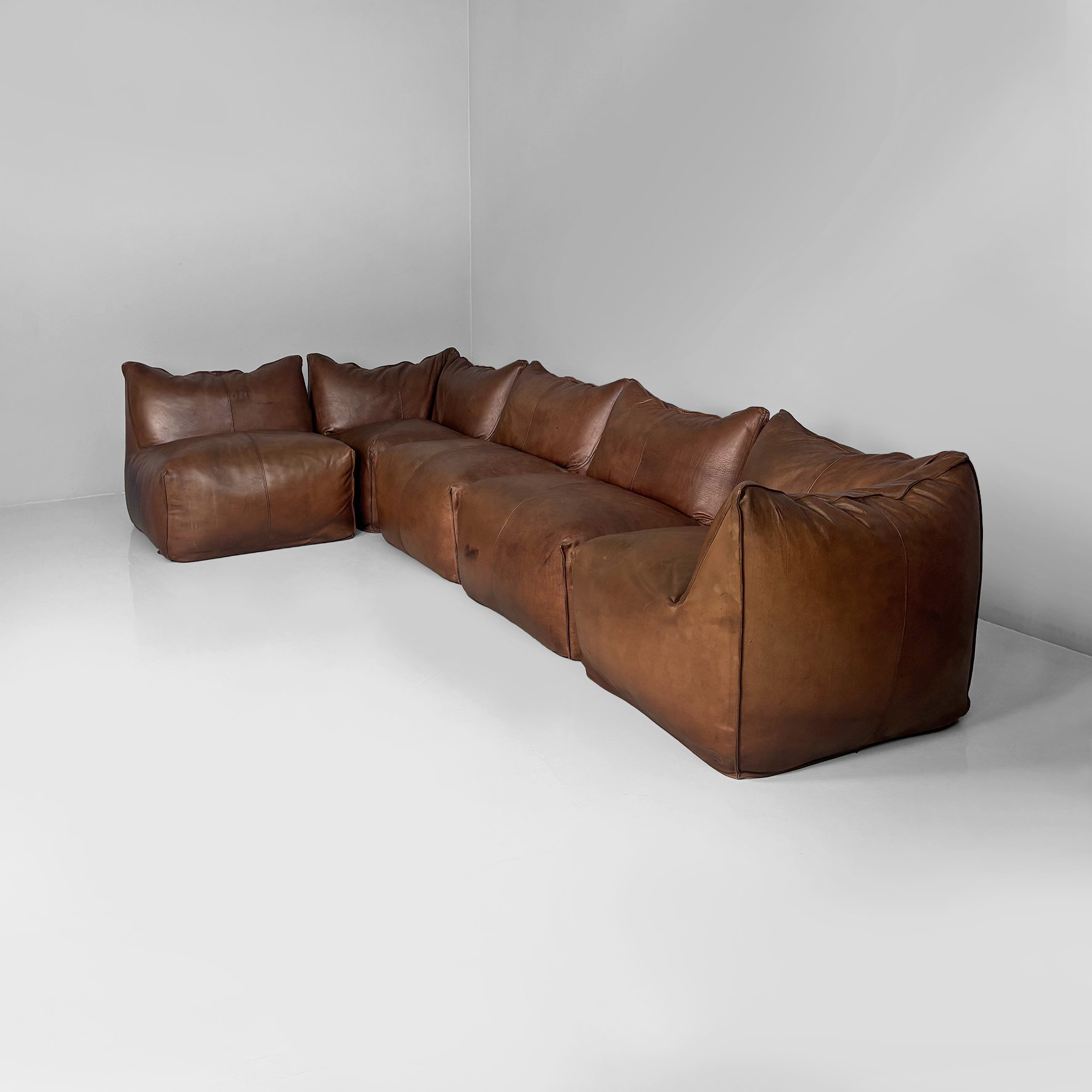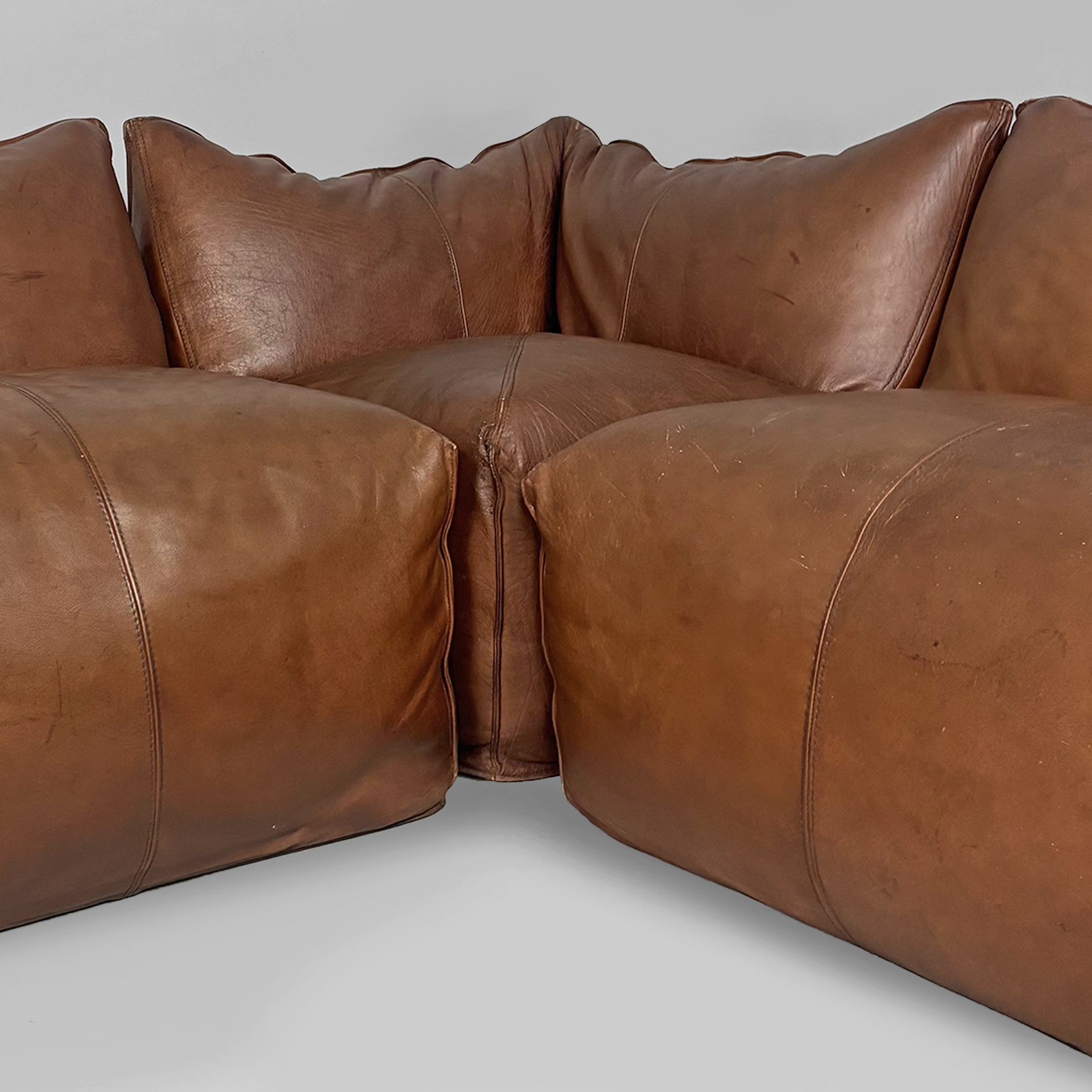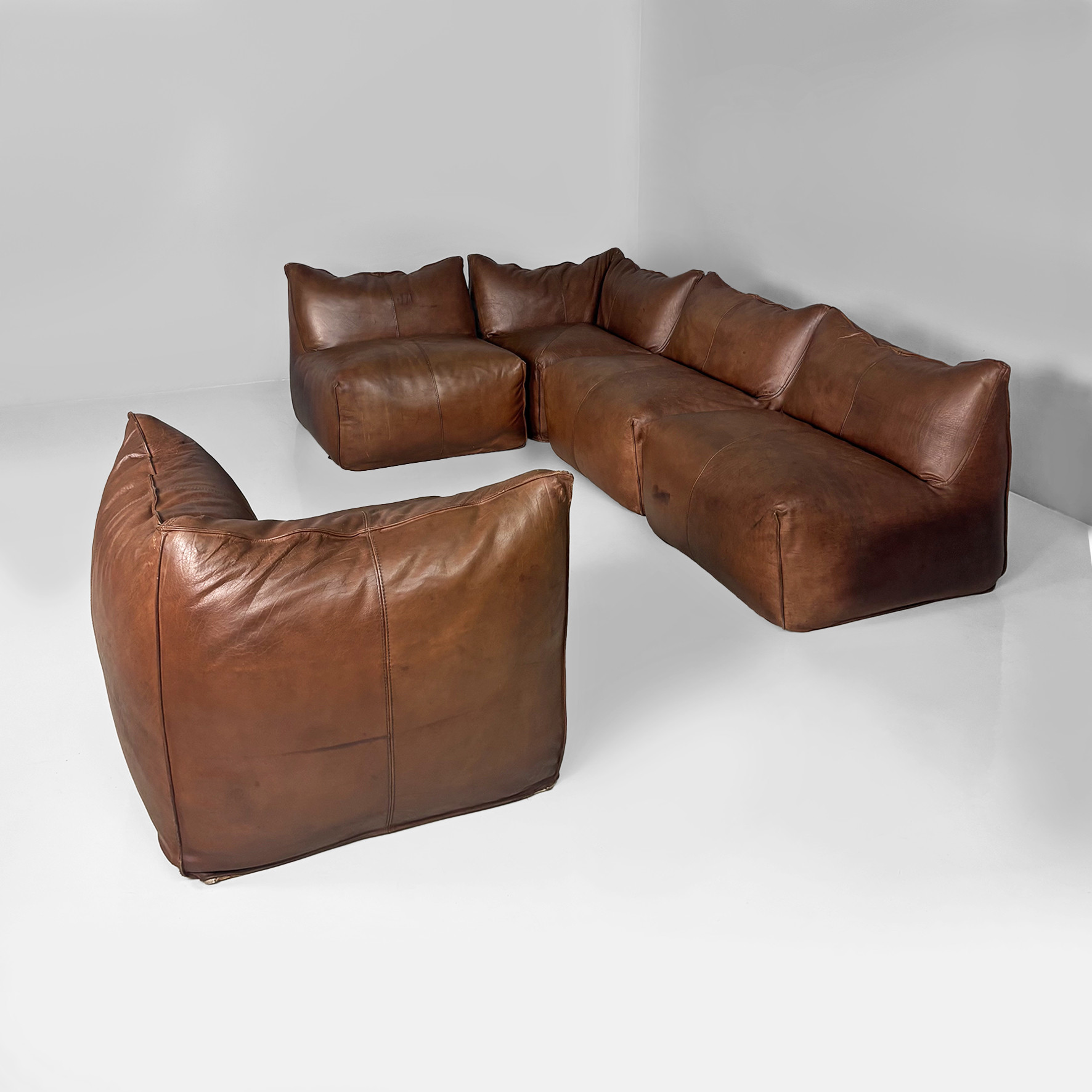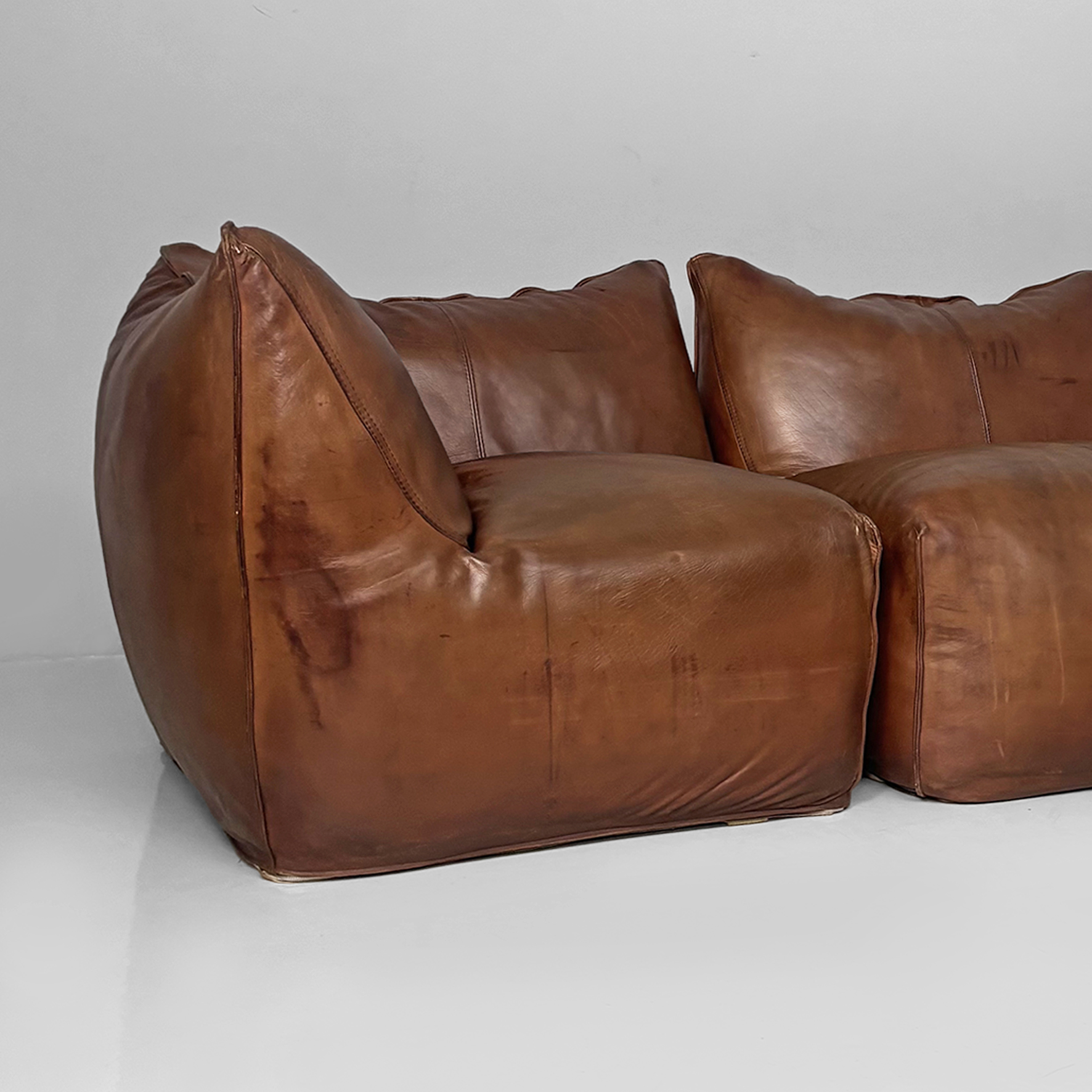 Divano modulare modello Le Bambole interamente imbottito e rivestito in pelle di Buffalo marrone, marcata Gran Zebù. Il divano ha due moduli angolari, utilizzabili anche come braccioli, e tre moduli semplici. Ogni modulo è caratterizzato da una silhouette morbida e tondeggiante. I moduli possono essere posizionati a piacere, possono essere anche usati come poltrone