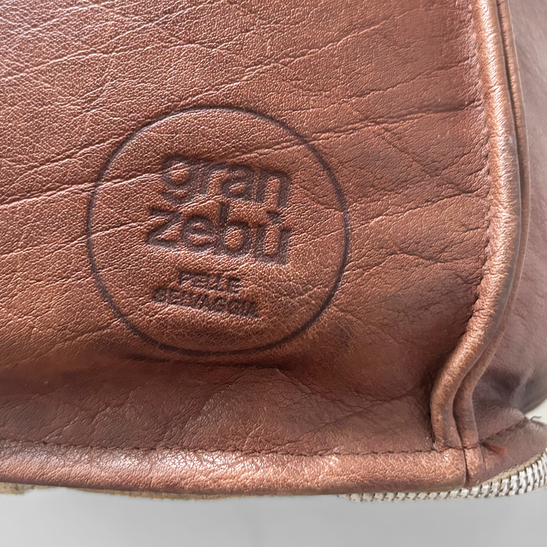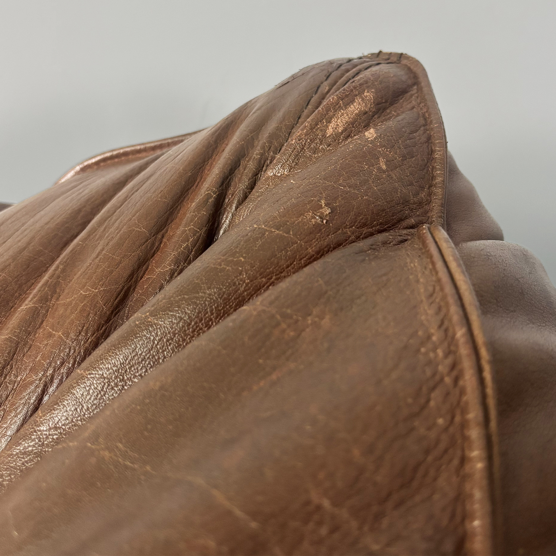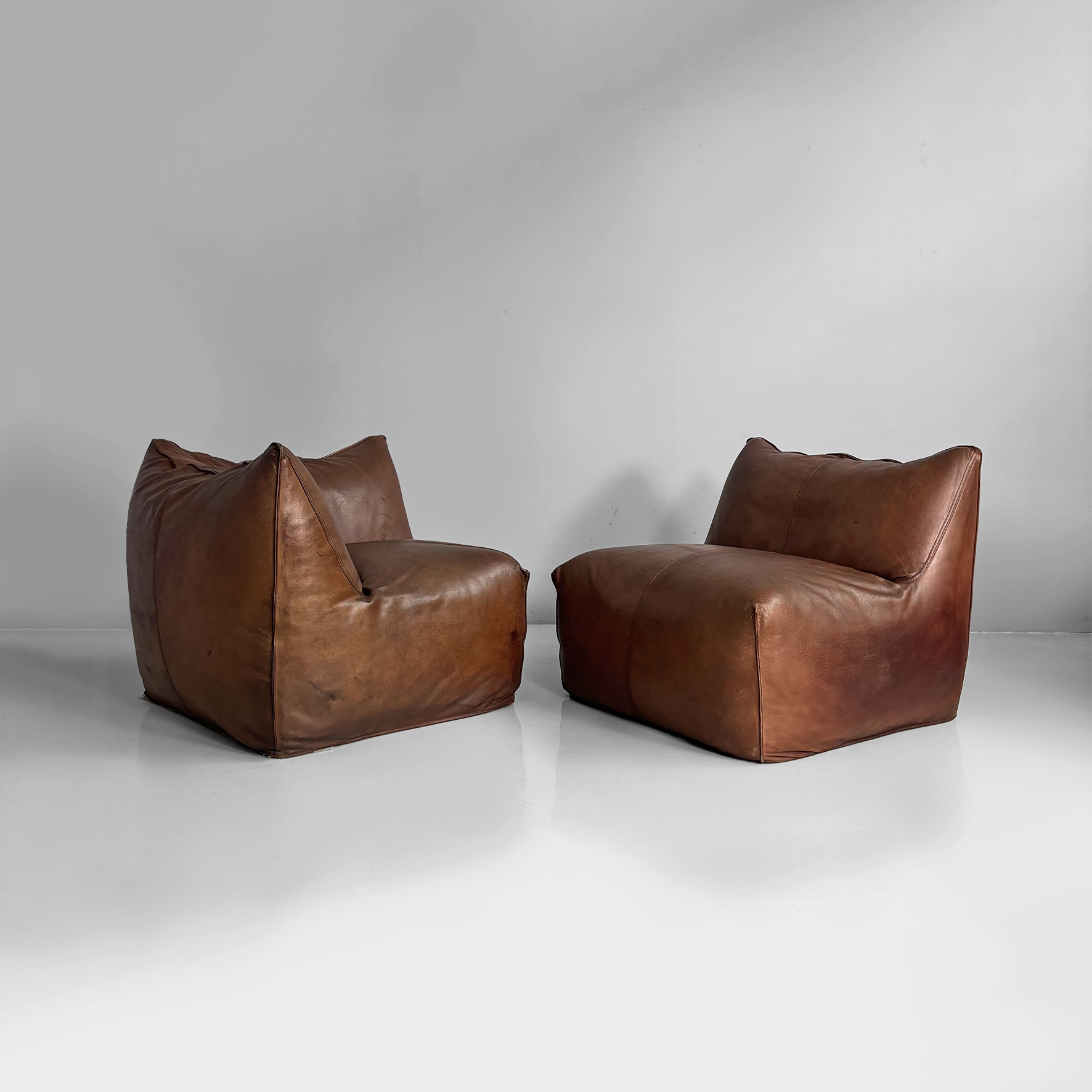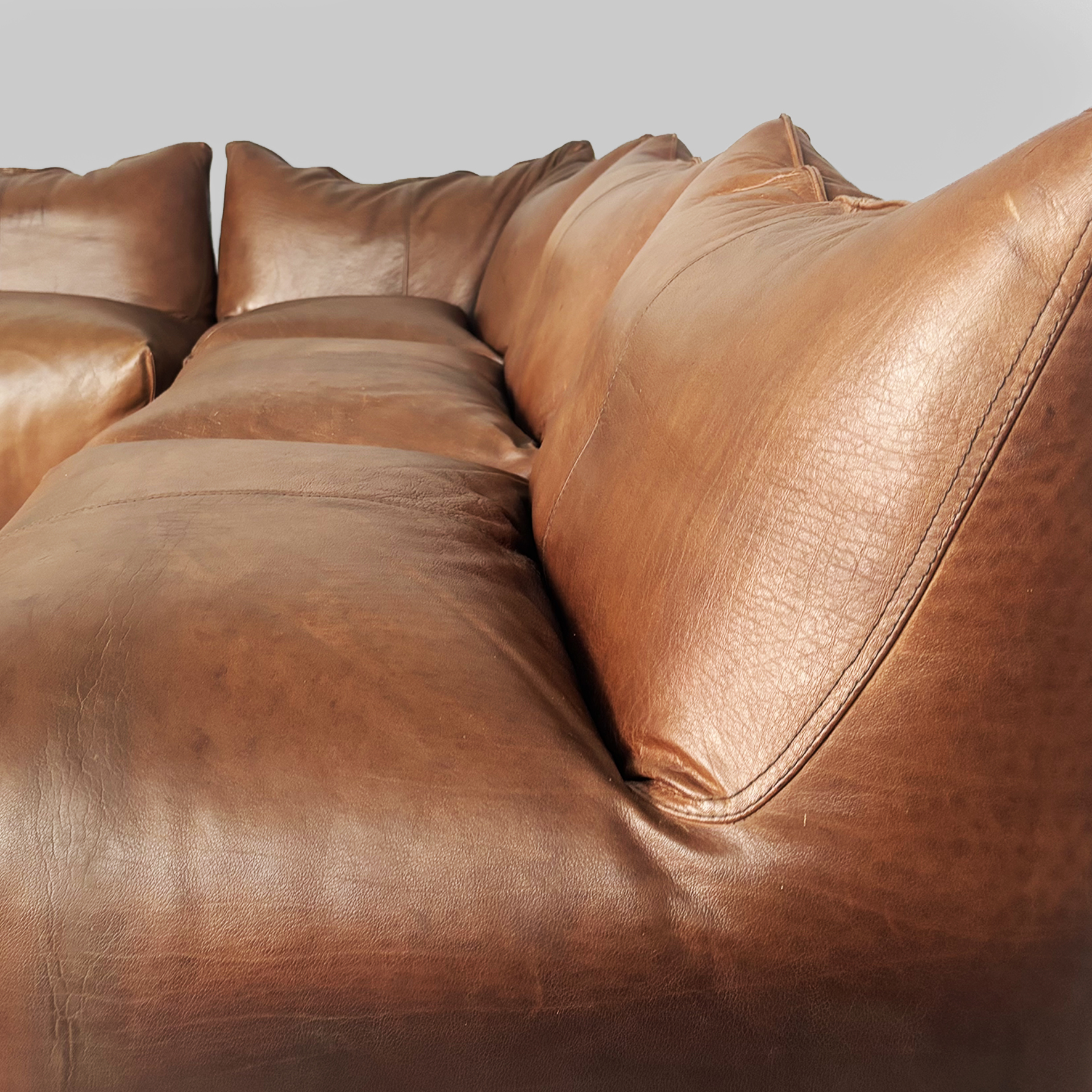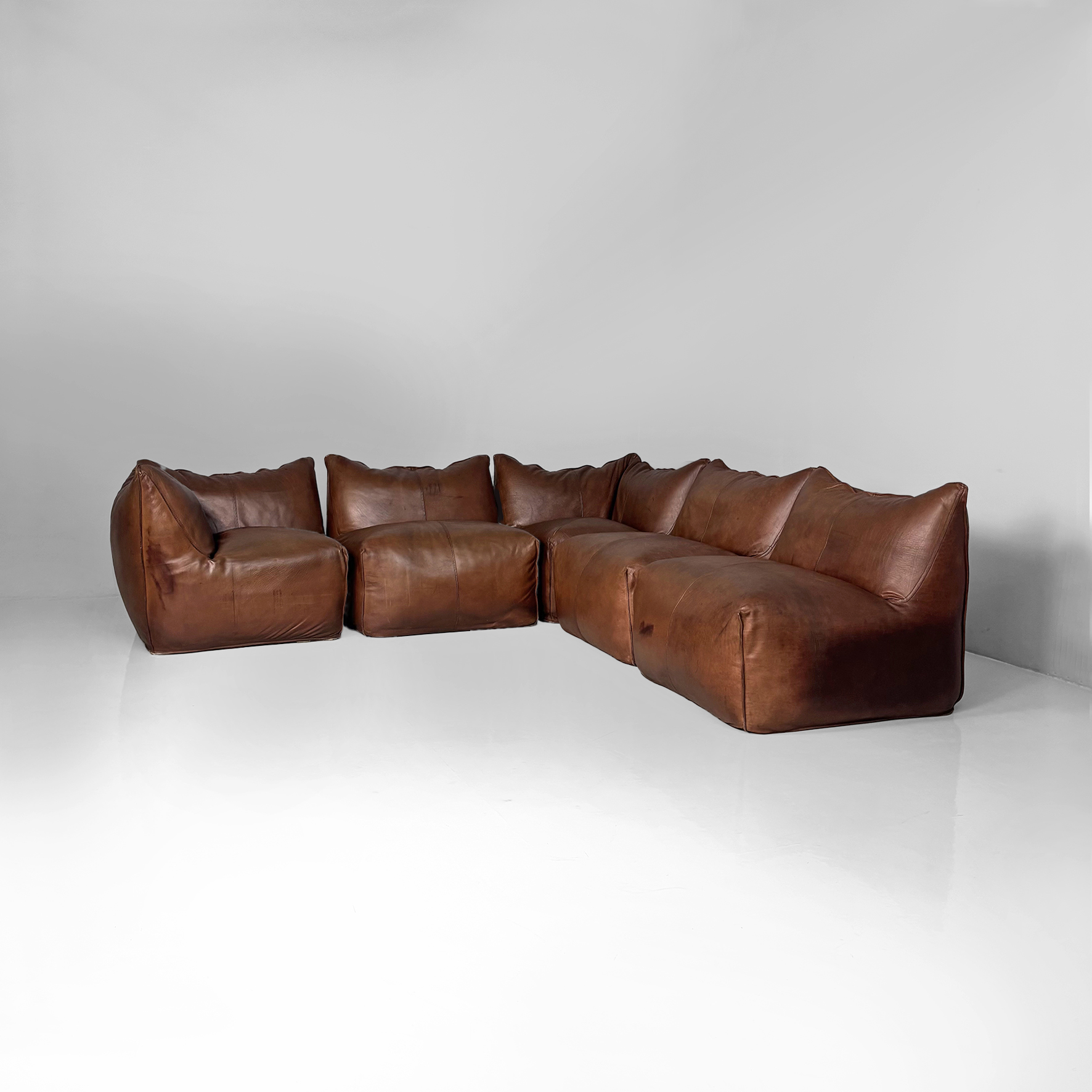 Divano modulare modello Le Bambole interamente imbottito e rivestito in pelle di Buffalo marrone, marcata Gran Zebù. Il divano ha due moduli angolari, utilizzabili anche come braccioli, e tre moduli semplici. Ogni modulo è caratterizzato da una silhouette morbida e tondeggiante. I moduli possono essere posizionati a piacere, possono essere anche usati come poltrone