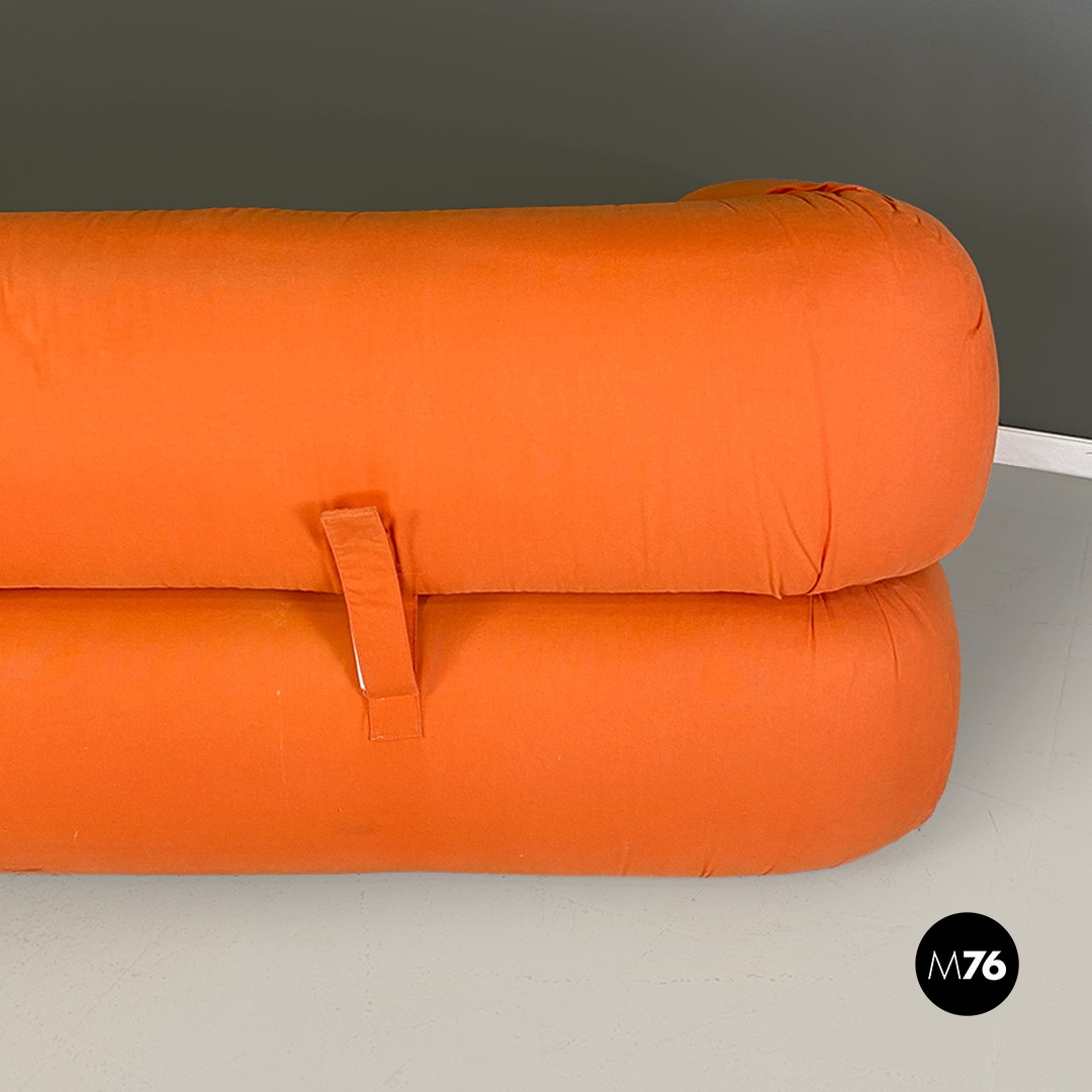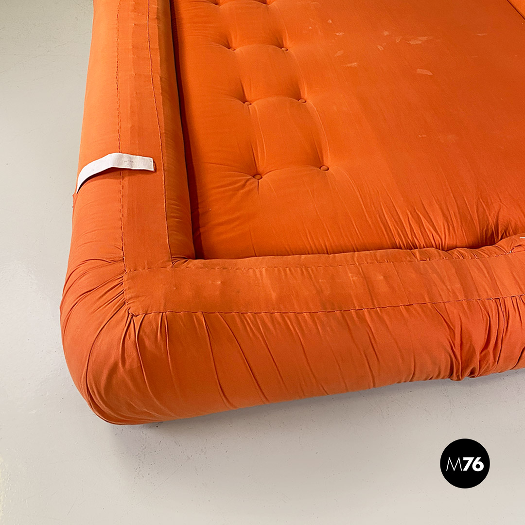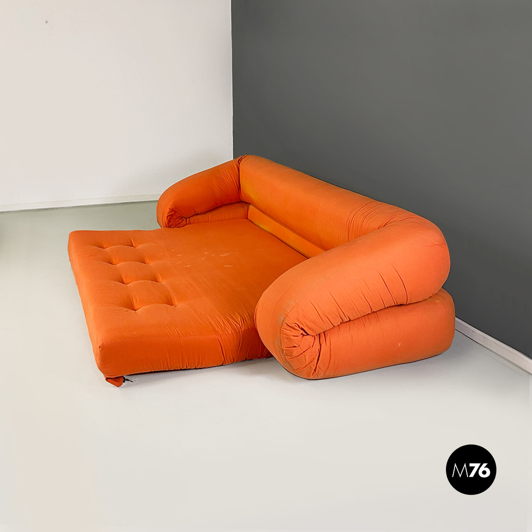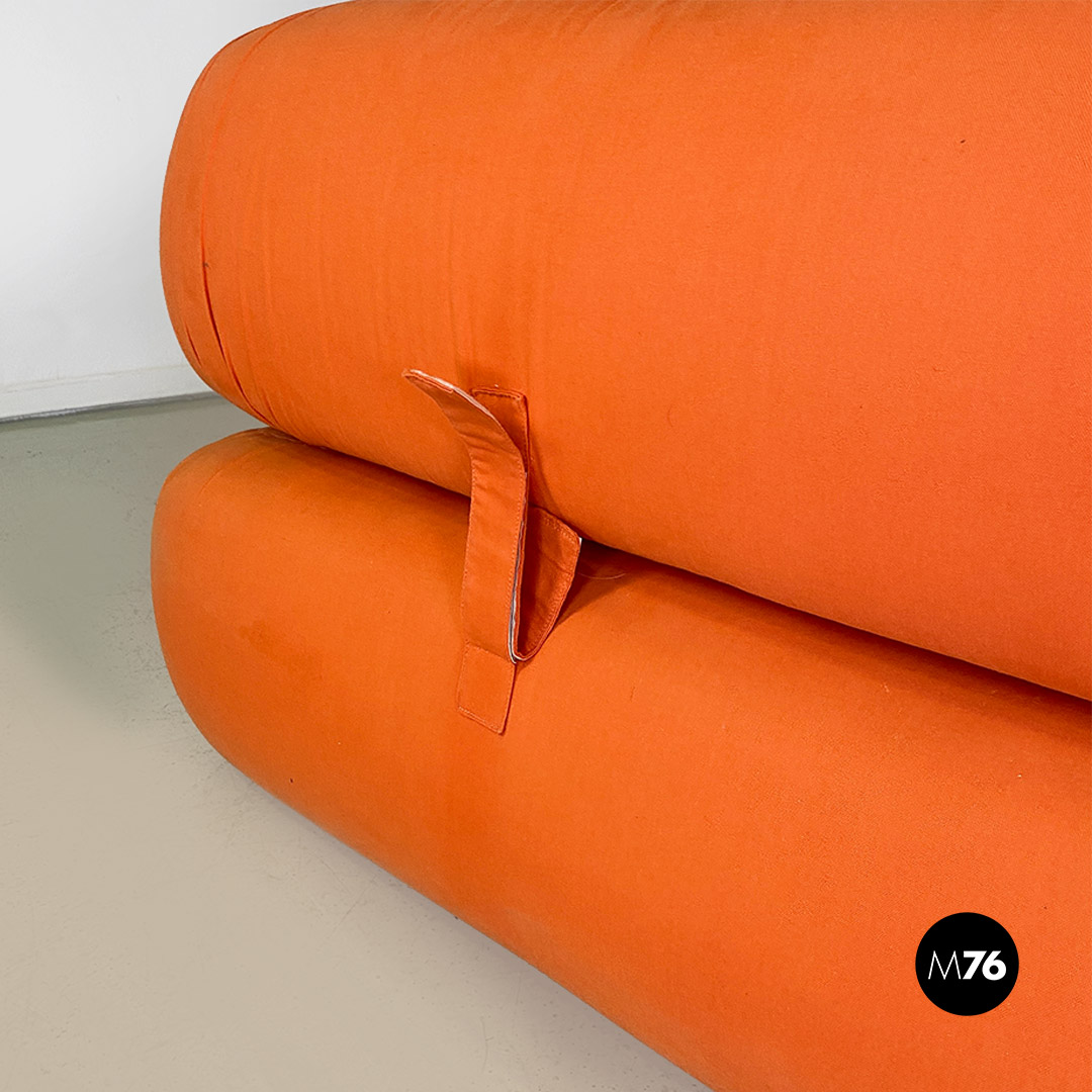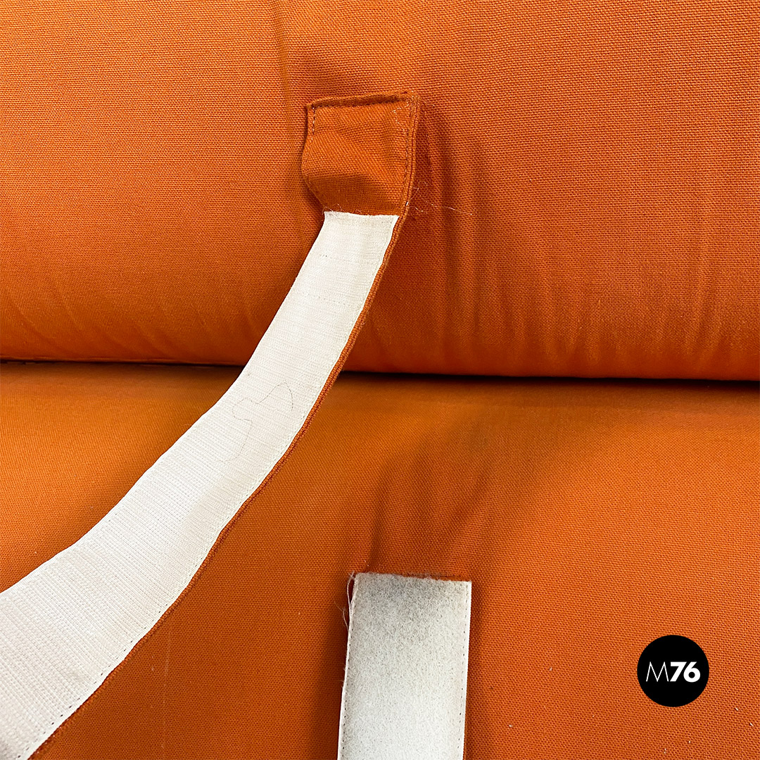 Divano letto in tessuto arancione privo di struttura di base e composto da uno schienale ribaltabile incluso della parte dei braccioli. Quest’ultimo una volta aperto fa da cornice allo stesso materasso, anch’esso ribaltabile ed utilizzabile da chiuso come semplice seduta per il divano, oppure da aperto come materasso matrimoniale. Tessuto in cotone di colore arancione, con velcro posto sulle due cinghie presenti dietro lo schienale, necessarie a tenerlo chiuso, ed infine zip in metallo nera utile a tenere chiusa la seduta nella sua versione divano.