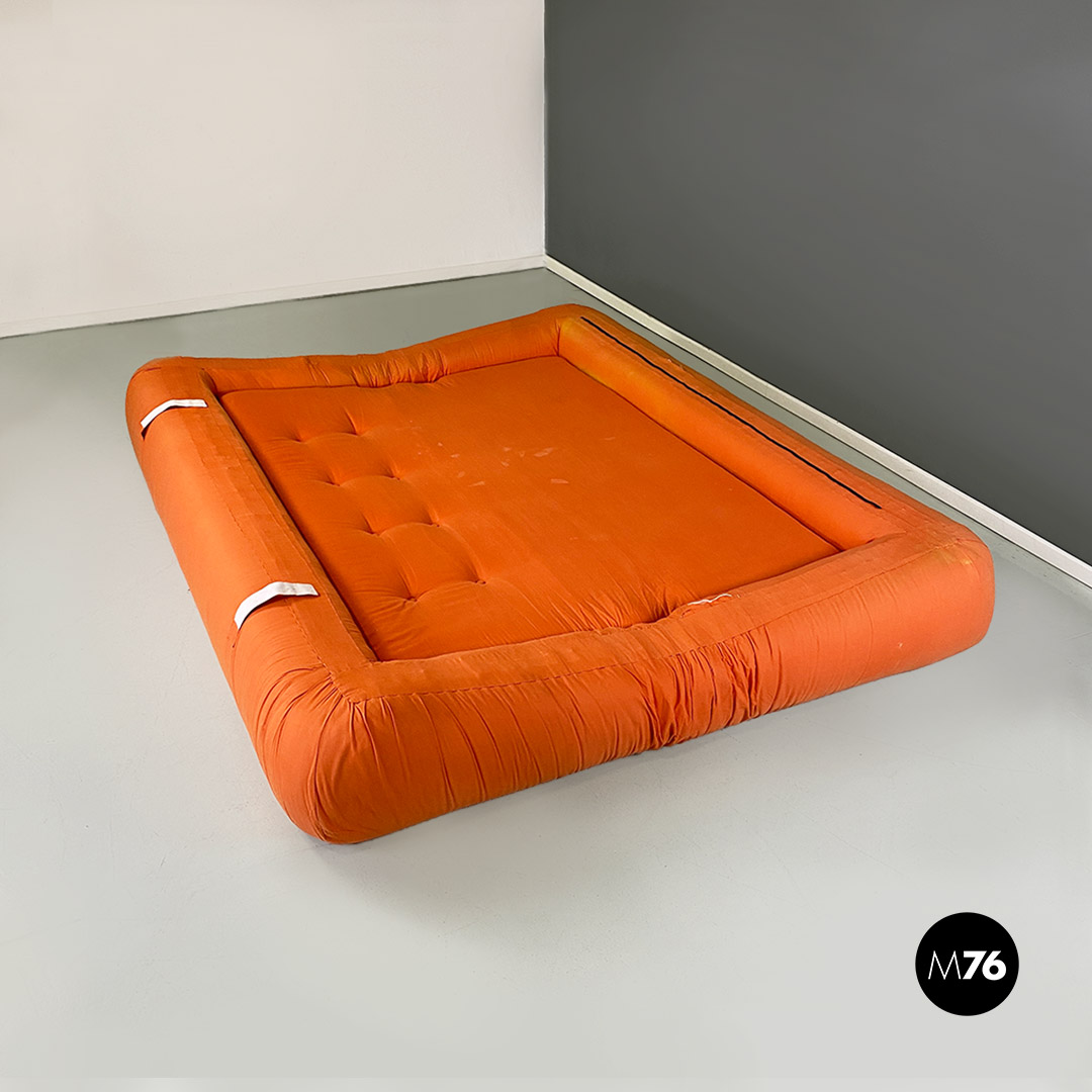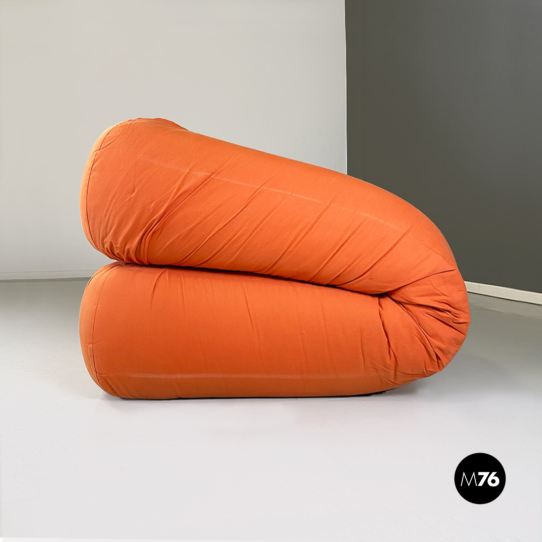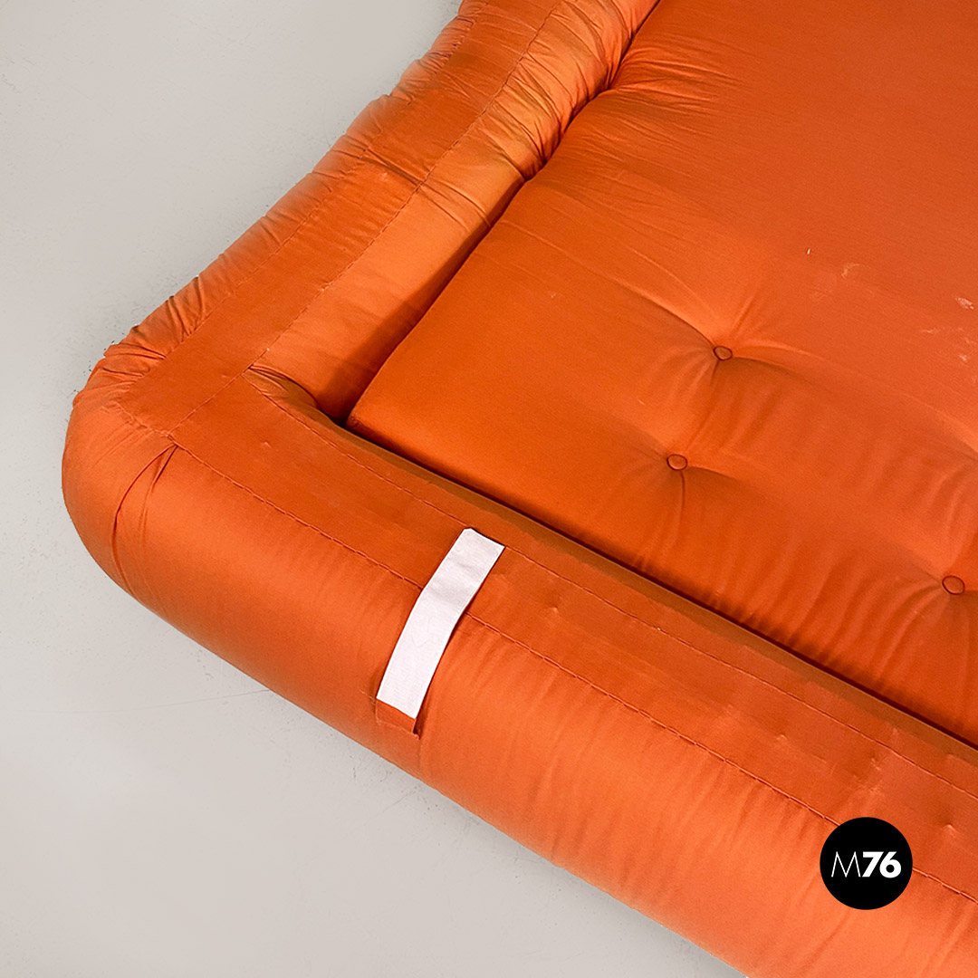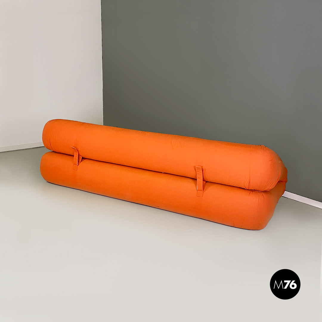 Divano letto in tessuto arancione privo di struttura di base e composto da uno schienale ribaltabile incluso della parte dei braccioli. Quest’ultimo una volta aperto fa da cornice allo stesso materasso, anch’esso ribaltabile ed utilizzabile da chiuso come semplice seduta per il divano, oppure da aperto come materasso matrimoniale. Tessuto in cotone di colore arancione, con velcro posto sulle due cinghie presenti dietro lo schienale, necessarie a tenerlo chiuso, ed infine zip in metallo nera utile a tenere chiusa la seduta nella sua versione divano.