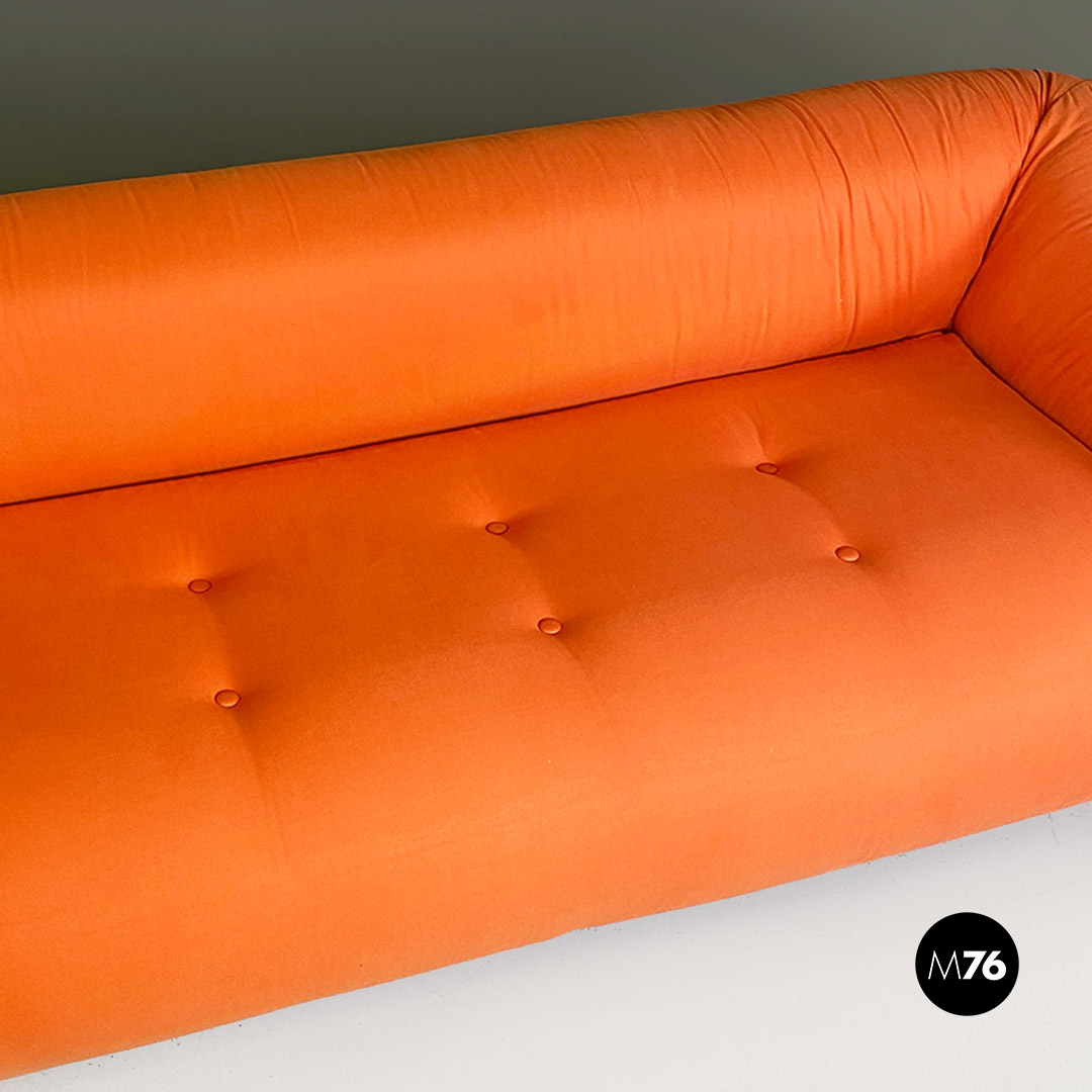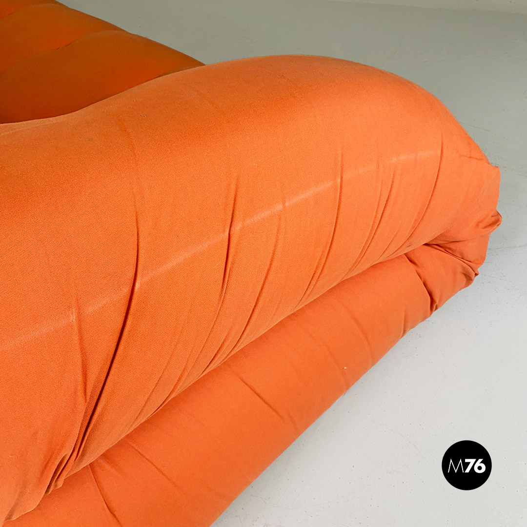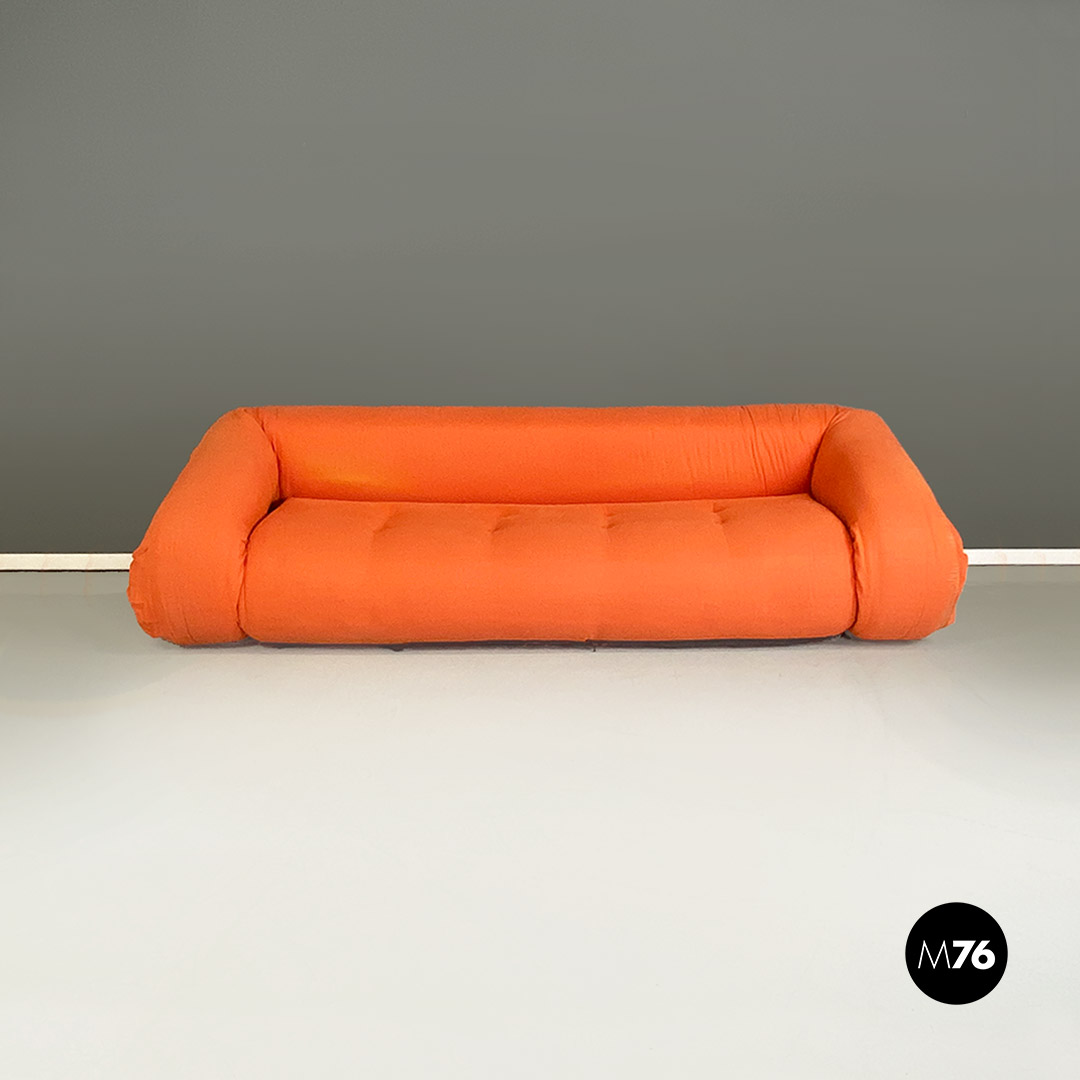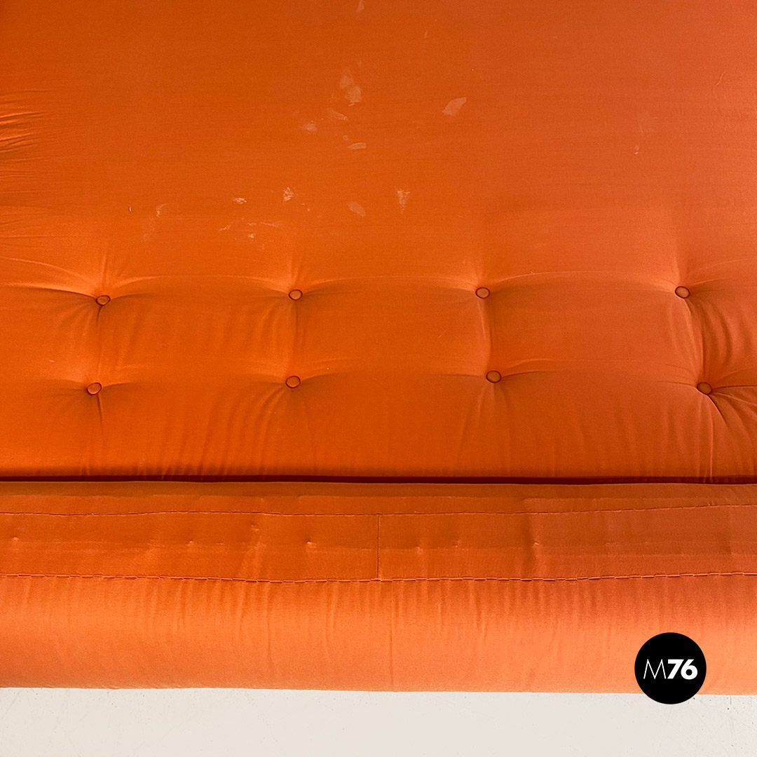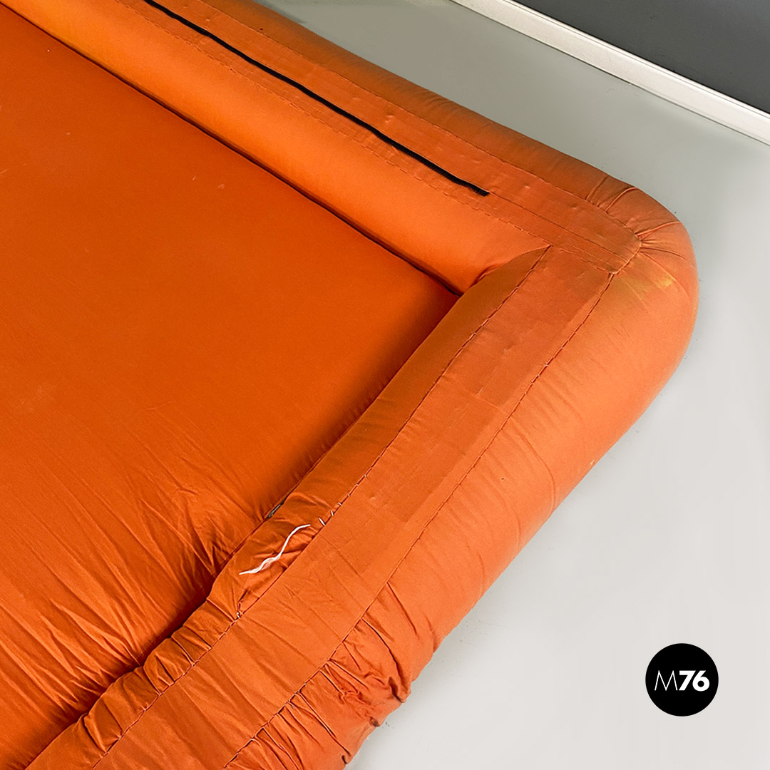 Divano letto in tessuto arancione privo di struttura di base e composto da uno schienale ribaltabile incluso della parte dei braccioli. Quest’ultimo una volta aperto fa da cornice allo stesso materasso, anch’esso ribaltabile ed utilizzabile da chiuso come semplice seduta per il divano, oppure da aperto come materasso matrimoniale. Tessuto in cotone di colore arancione, con velcro posto sulle due cinghie presenti dietro lo schienale, necessarie a tenerlo chiuso, ed infine zip in metallo nera utile a tenere chiusa la seduta nella sua versione divano.