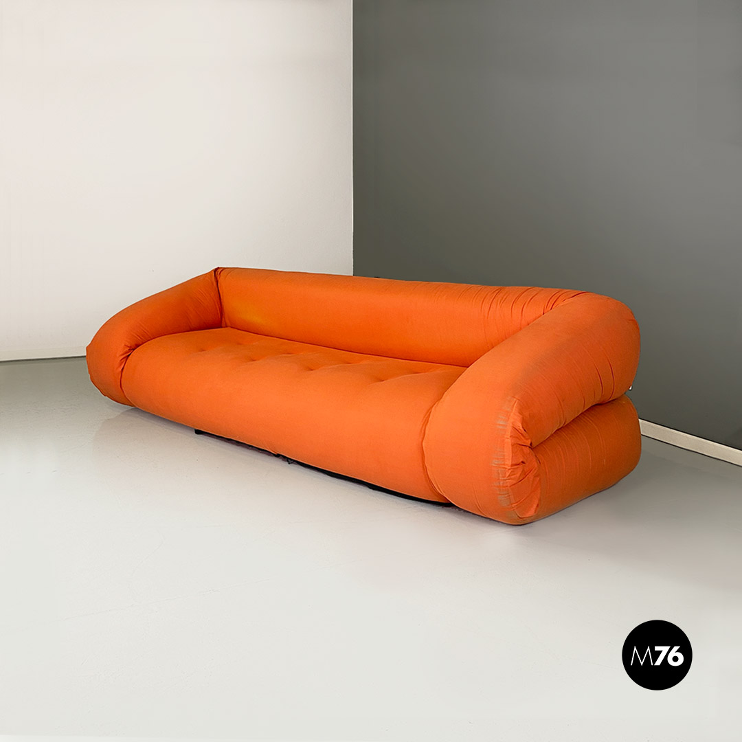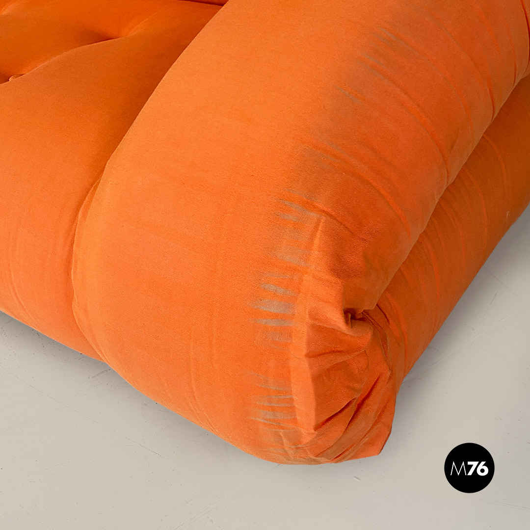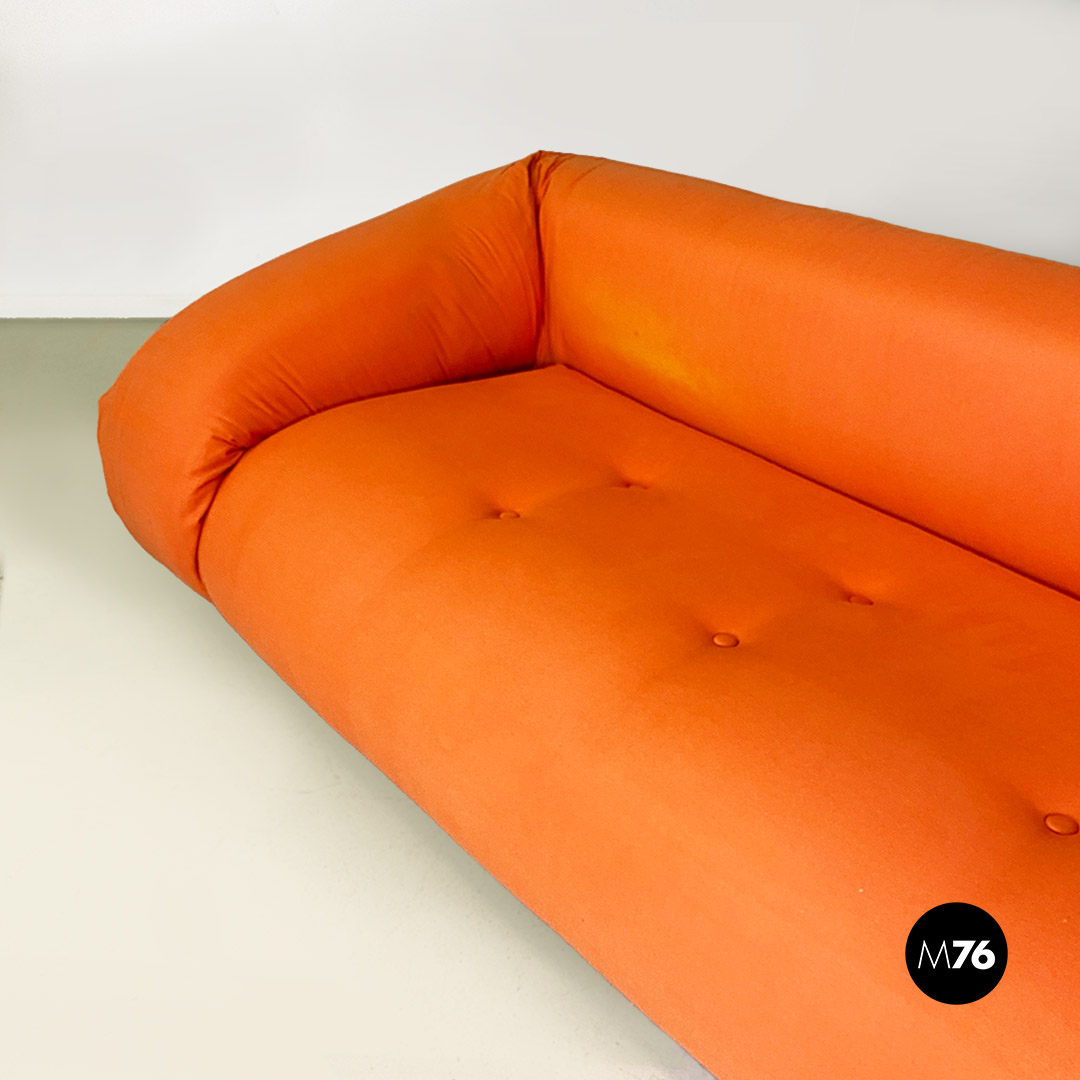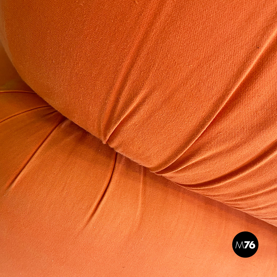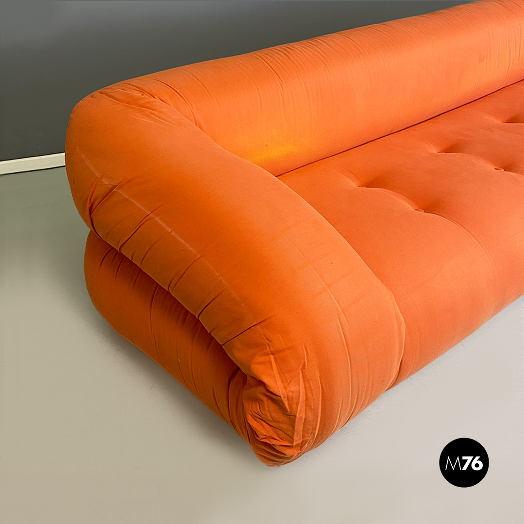 Divano letto in tessuto arancione privo di struttura di base e composto da uno schienale ribaltabile incluso della parte dei braccioli. Quest’ultimo una volta aperto fa da cornice allo stesso materasso, anch’esso ribaltabile ed utilizzabile da chiuso come semplice seduta per il divano, oppure da aperto come materasso matrimoniale. Tessuto in cotone di colore arancione, con velcro posto sulle due cinghie presenti dietro lo schienale, necessarie a tenerlo chiuso, ed infine zip in metallo nera utile a tenere chiusa la seduta nella sua versione divano.
