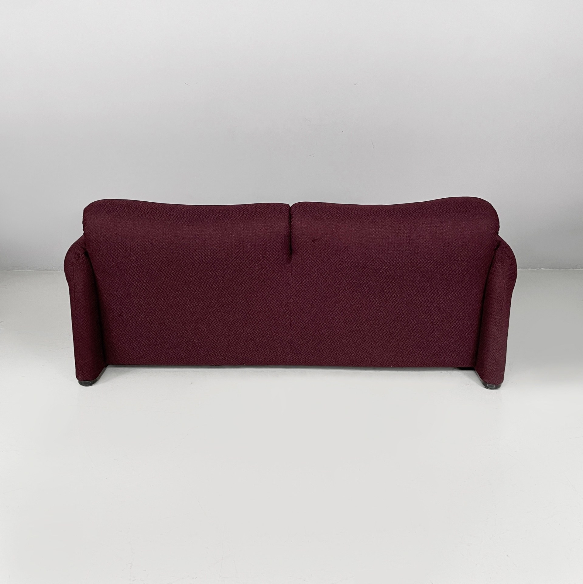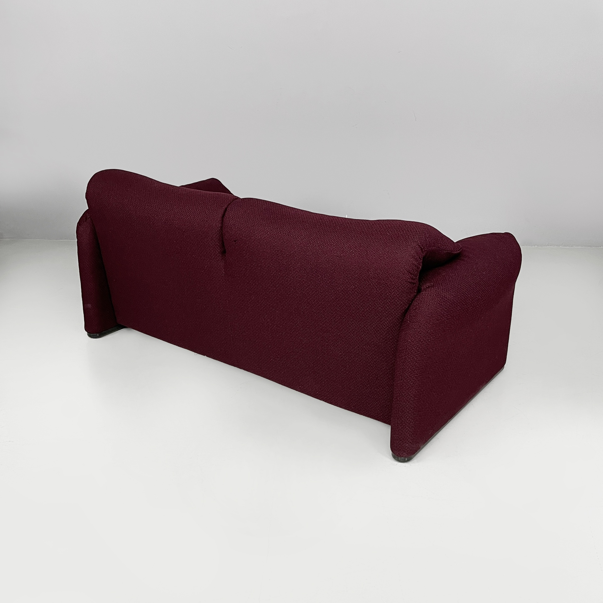 Divano modello Maralunga a due posti in tessuto bordeaux-viola. Il divano è dotato di poggiatesta ribaltabile indipendenti per ogni singolo posto, i due braccioli sono curvi e “ripiegati” verso la seduta. Piedini in plastica nera.