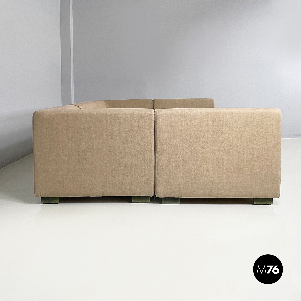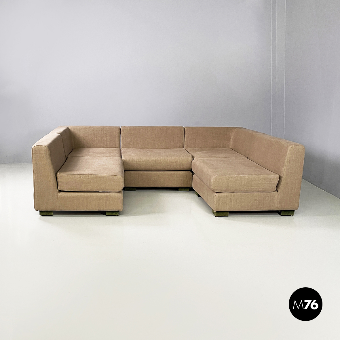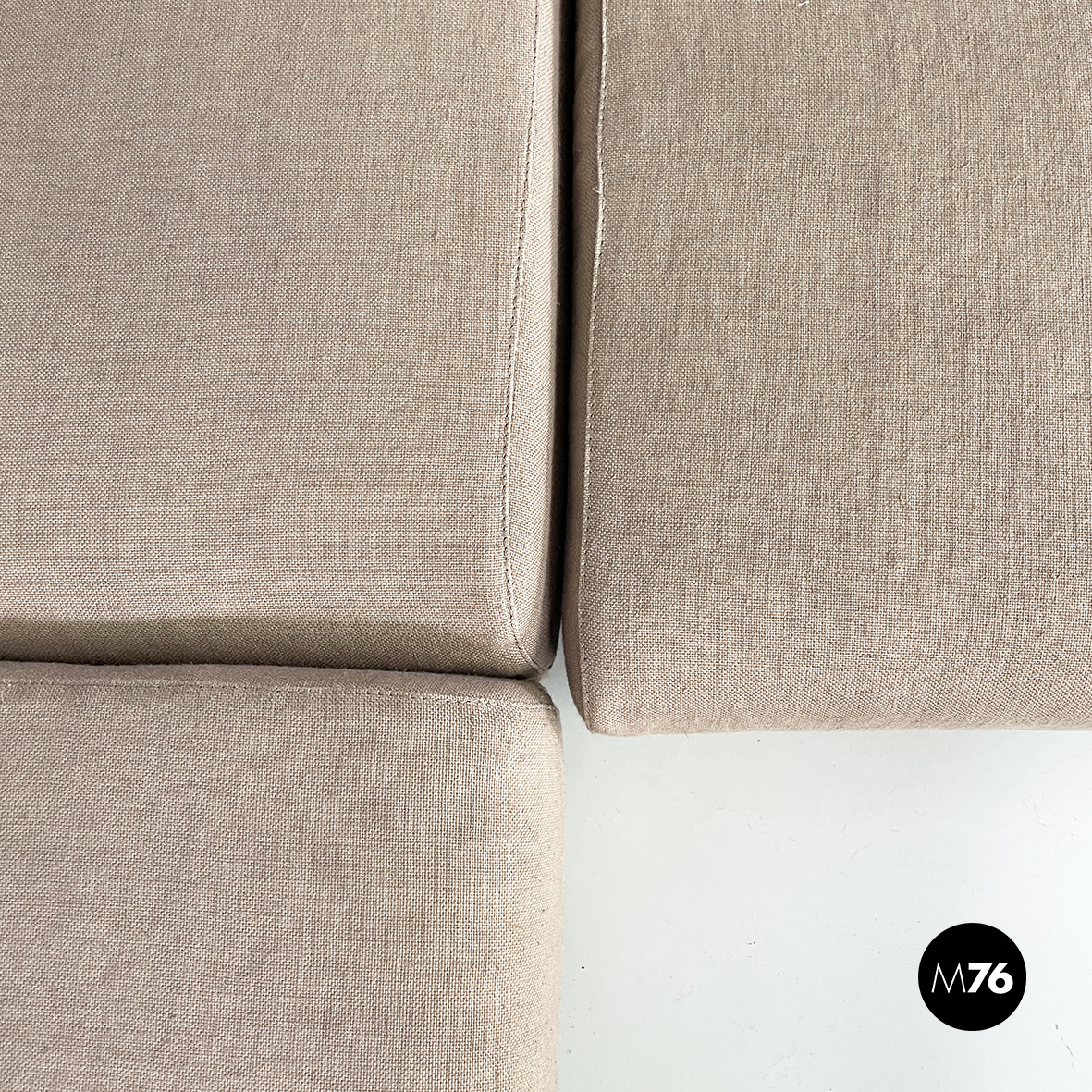 Divano modulare e angolare interamente imbottito e rivestito in tessuto di lino marrone-beige. Il divano è composto da tre moduli semplici e due angolari, posizionabili a piacere. La seduta ha un cuscino squadrato imbottito, mentre lo schienale imbottito è leggermente incurvato. Piedini squadrati.