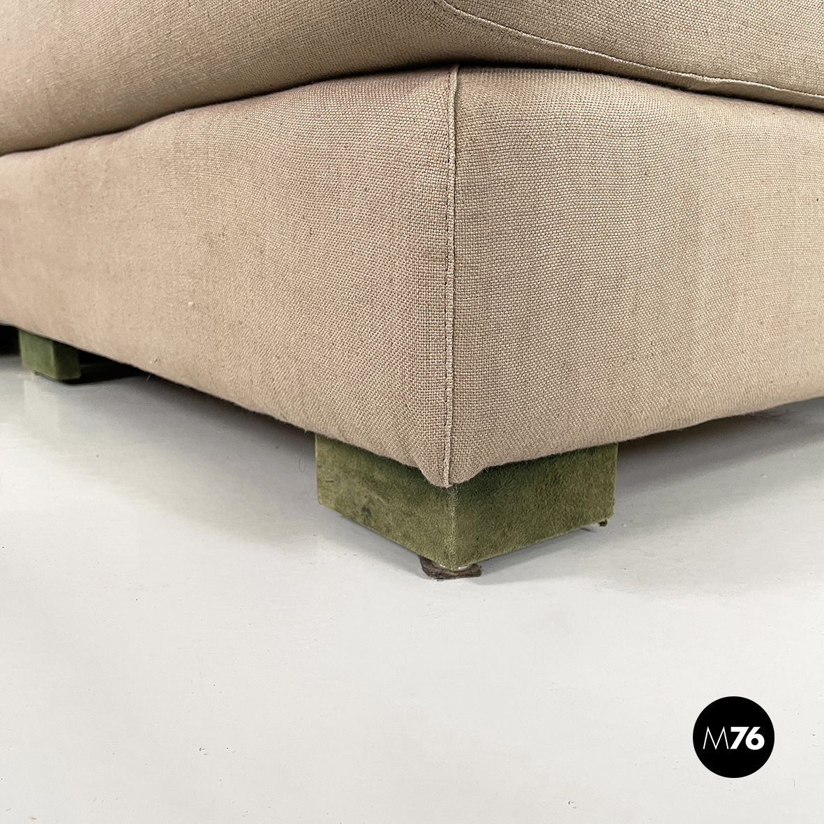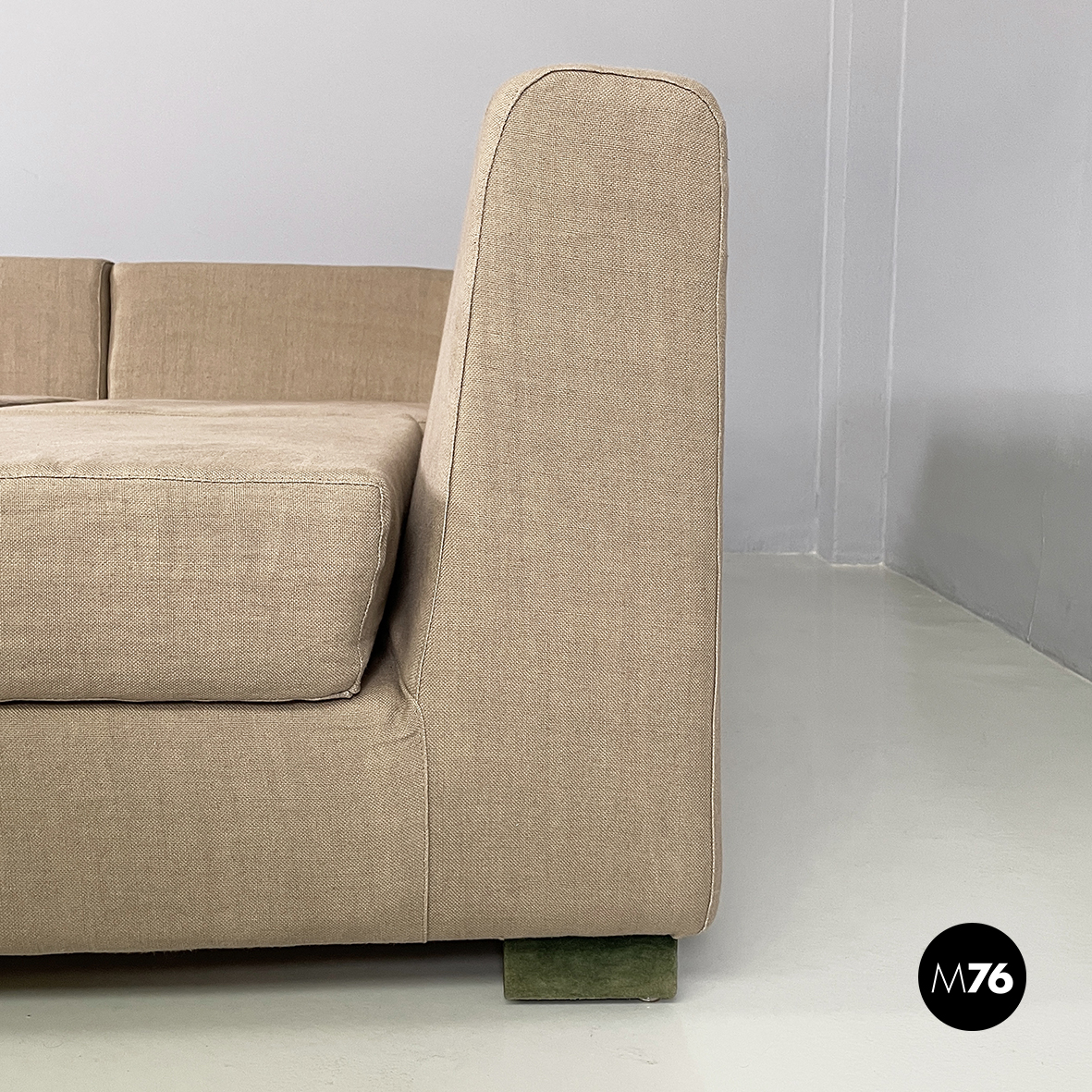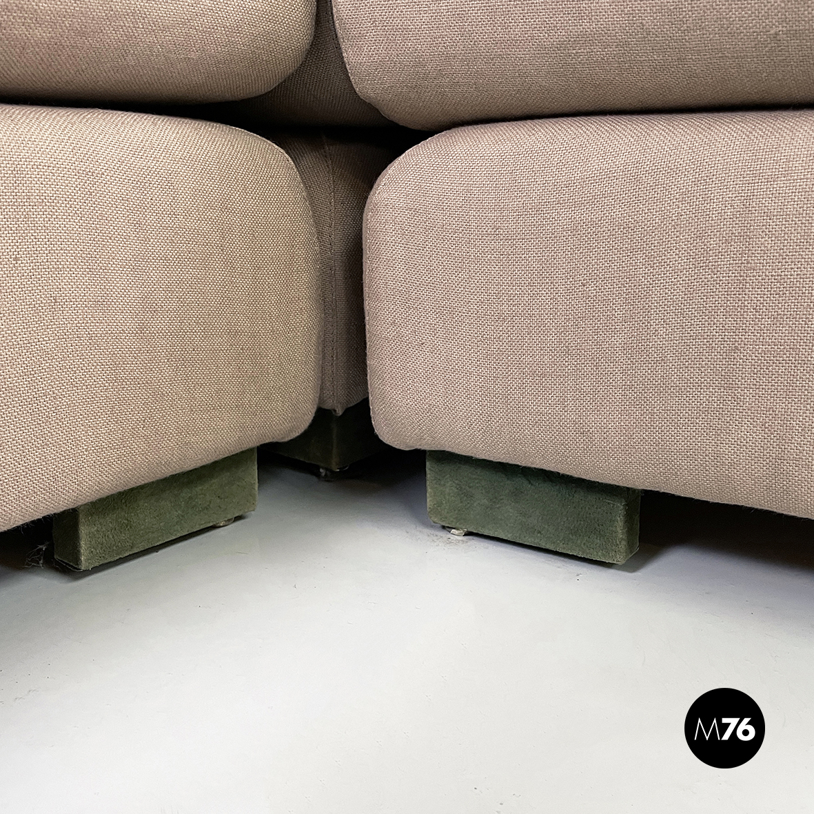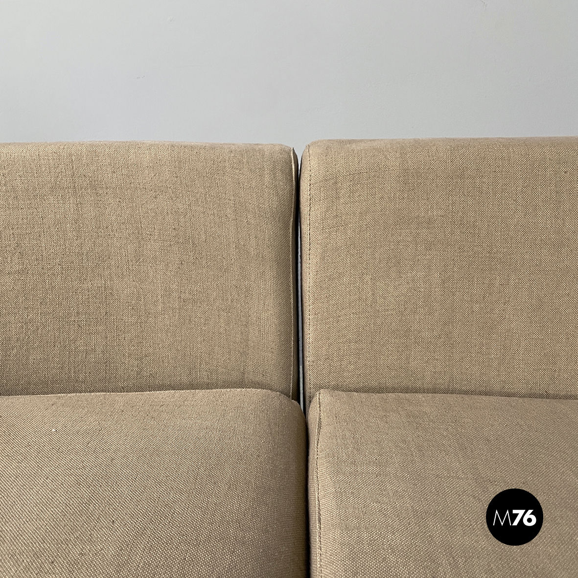 Divano modulare e angolare interamente imbottito e rivestito in tessuto di lino marrone-beige. Il divano è composto da tre moduli semplici e due angolari, posizionabili a piacere. La seduta ha un cuscino squadrato imbottito, mentre lo schienale imbottito è leggermente incurvato. Piedini squadrati.