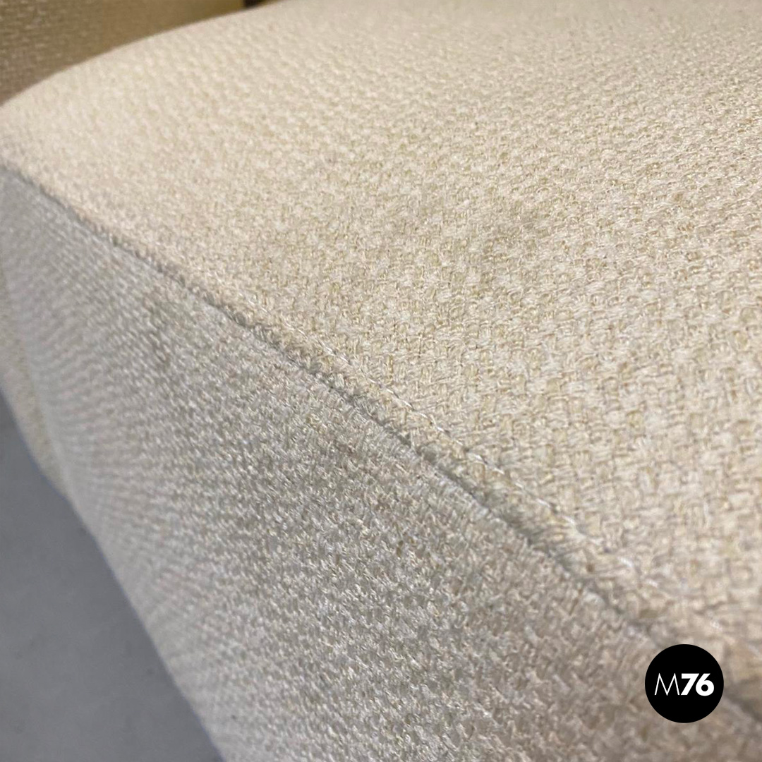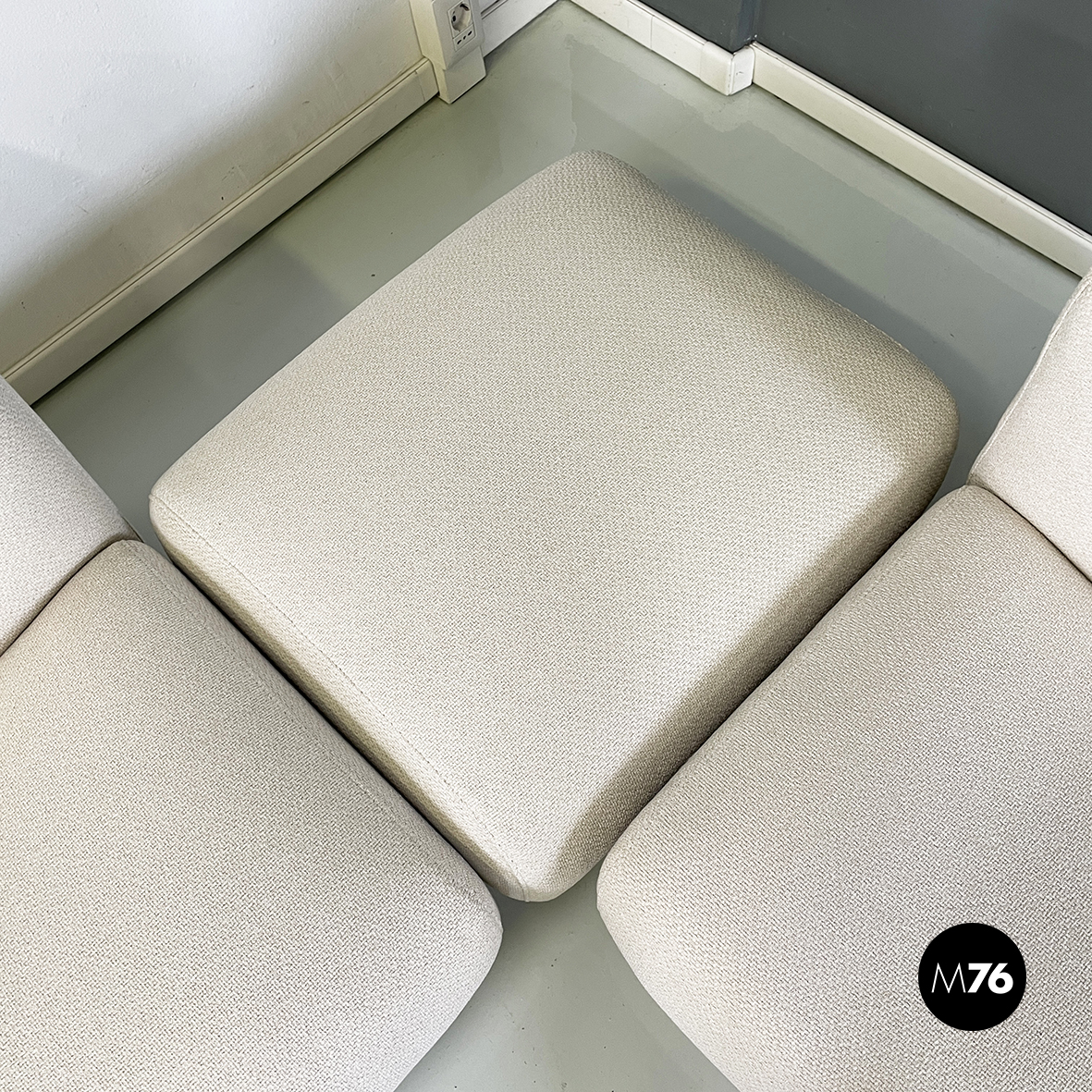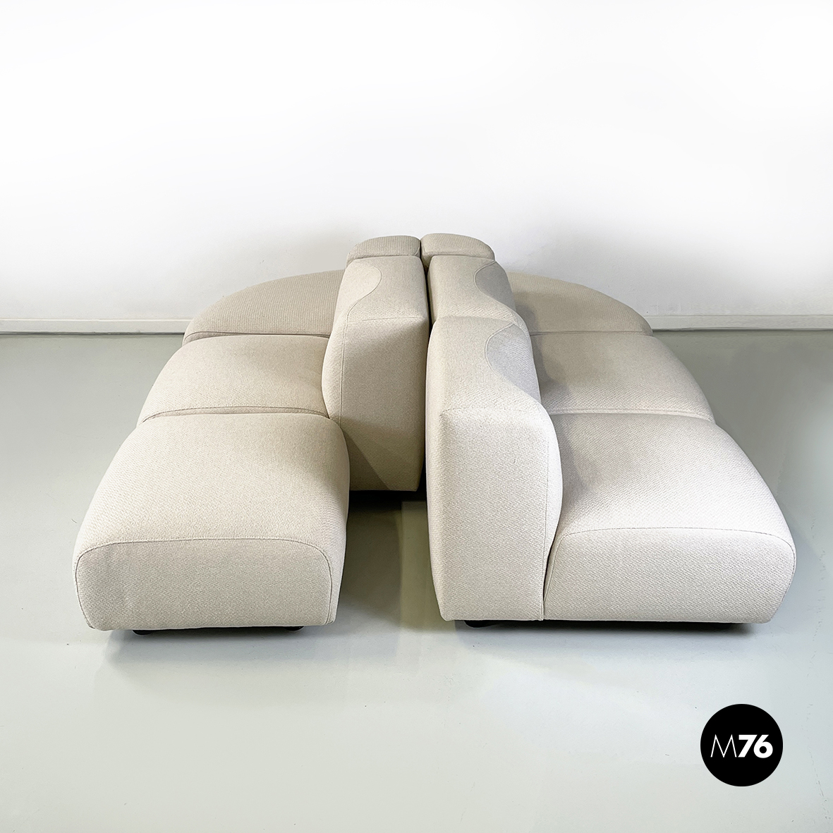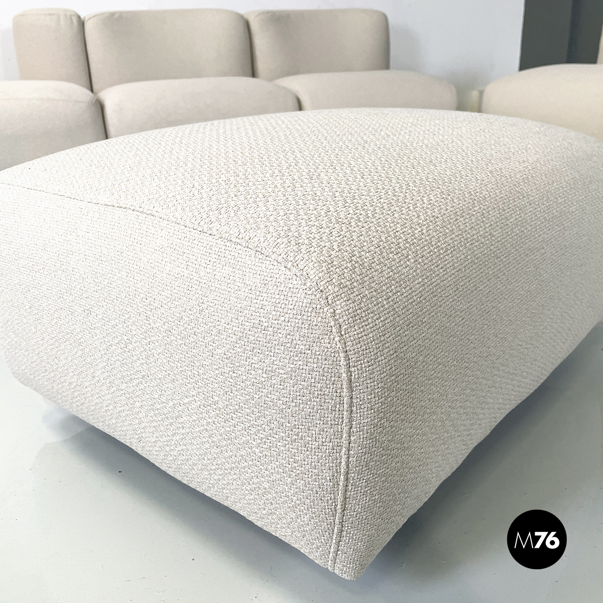 Divano modulare modello Novemila composto da sei moduli rivestiti in tessuto bianco-beige. I tre moduli semplici sono composti da seduta squadrata e schienale concavo. I due moduli terminali hanno la seduta a quarto di luna e schienale sottile. Infine è presente un pouf squadrato. Le zampe nere sono cilindriche. Ogni modulo del divano è posizionabile a piacere.
