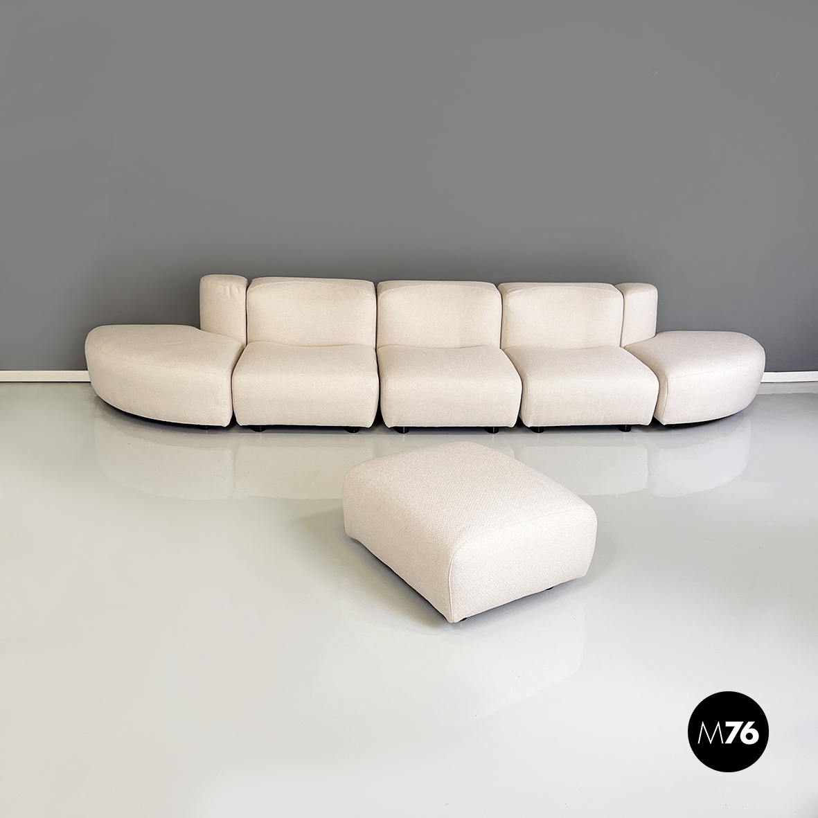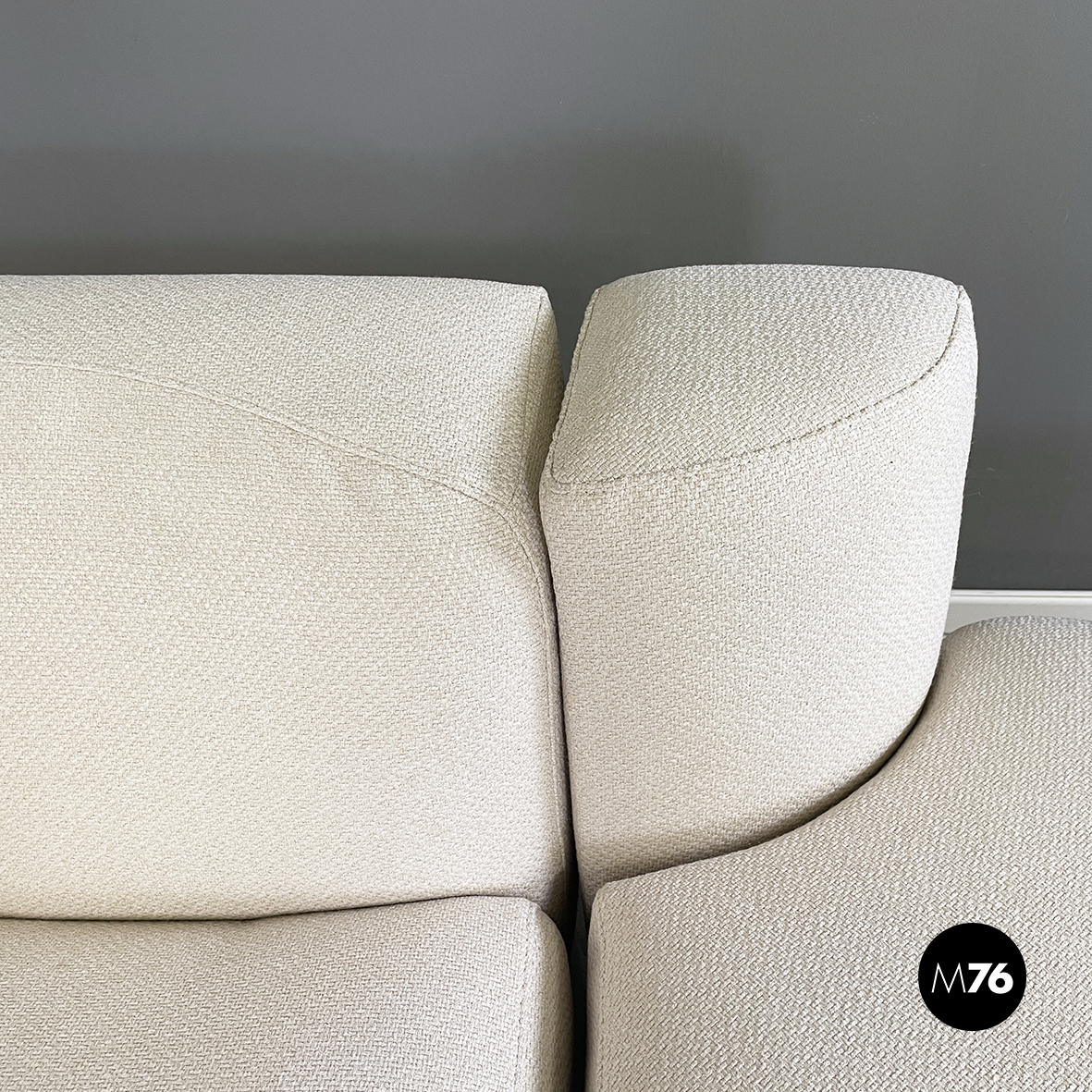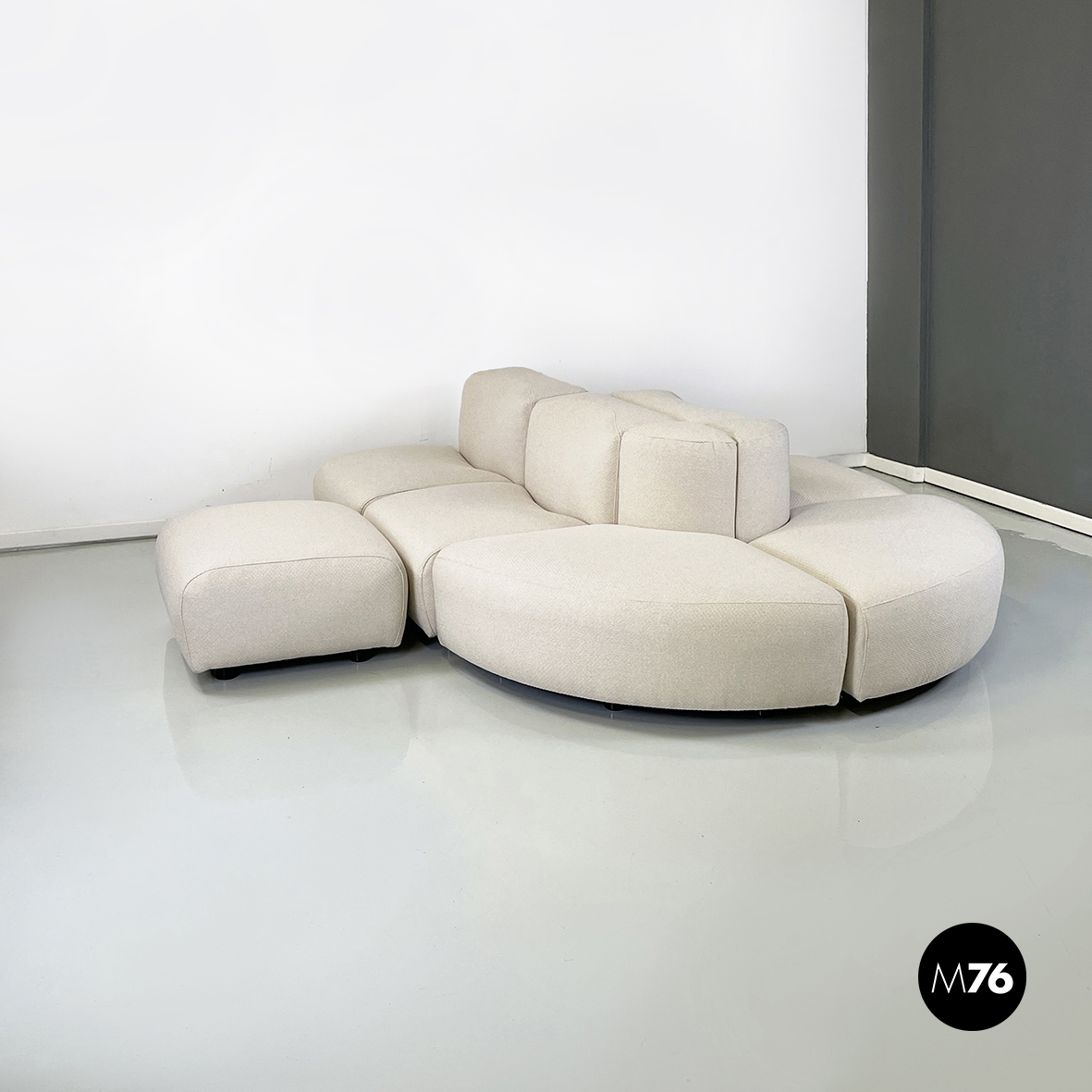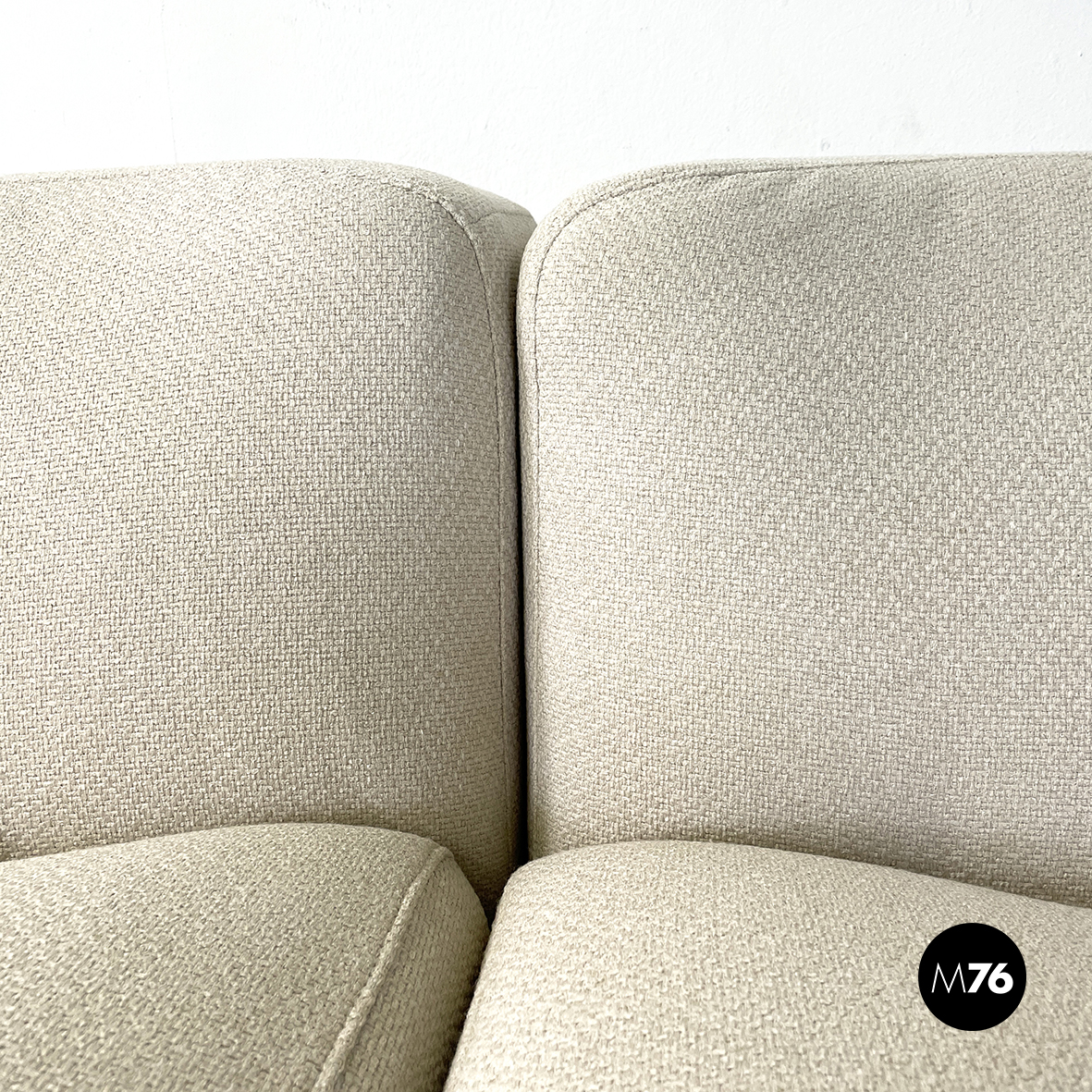 Divano modulare modello Novemila composto da sei moduli rivestiti in tessuto bianco-beige. I tre moduli semplici sono composti da seduta squadrata e schienale concavo. I due moduli terminali hanno la seduta a quarto di luna e schienale sottile. Infine è presente un pouf squadrato. Le zampe nere sono cilindriche. Ogni modulo del divano è posizionabile a piacere.