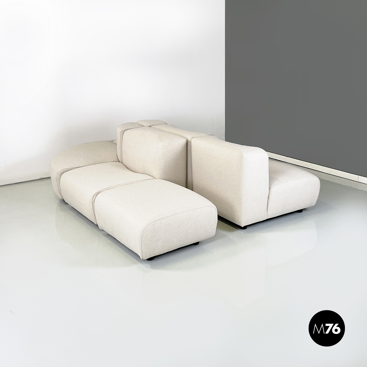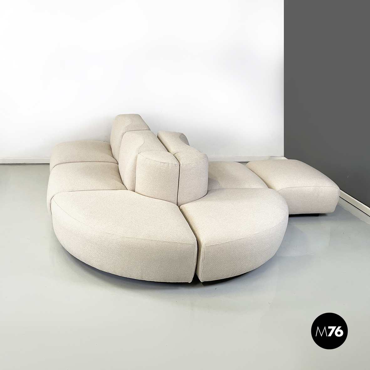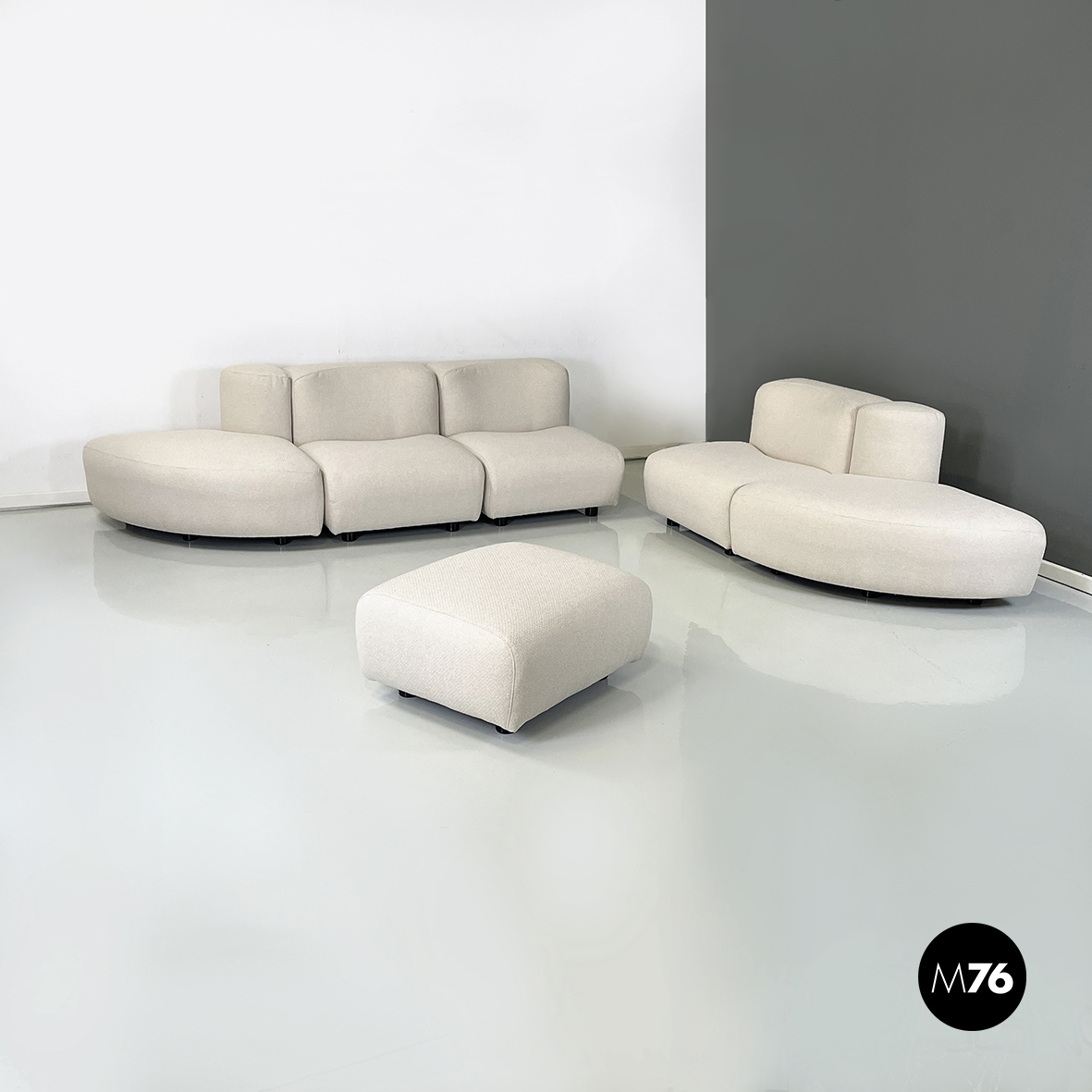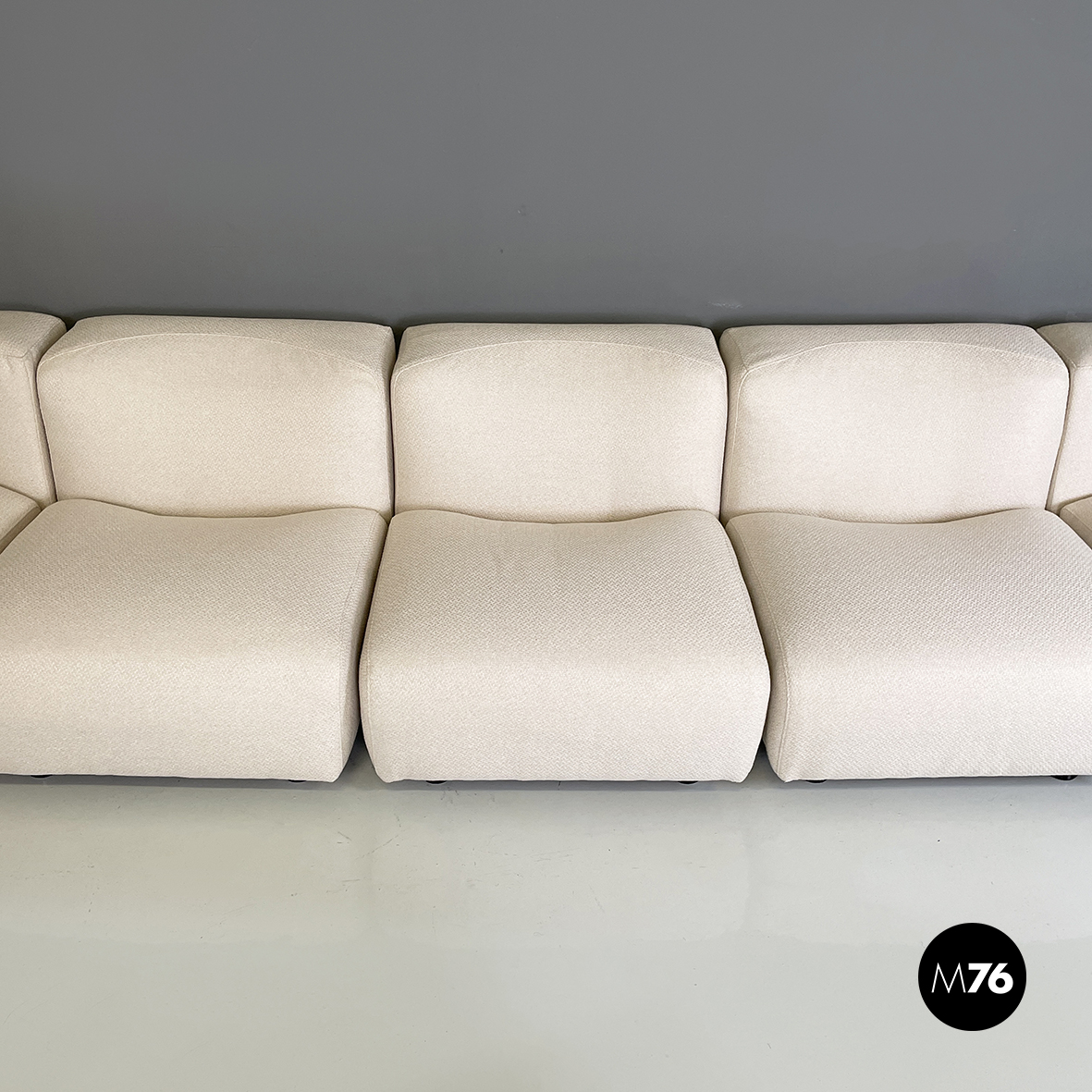 Divano modulare modello Novemila composto da sei moduli rivestiti in tessuto bianco-beige. I tre moduli semplici sono composti da seduta squadrata e schienale concavo. I due moduli terminali hanno la seduta a quarto di luna e schienale sottile. Infine è presente un pouf squadrato. Le zampe nere sono cilindriche. Ogni modulo del divano è posizionabile a piacere.