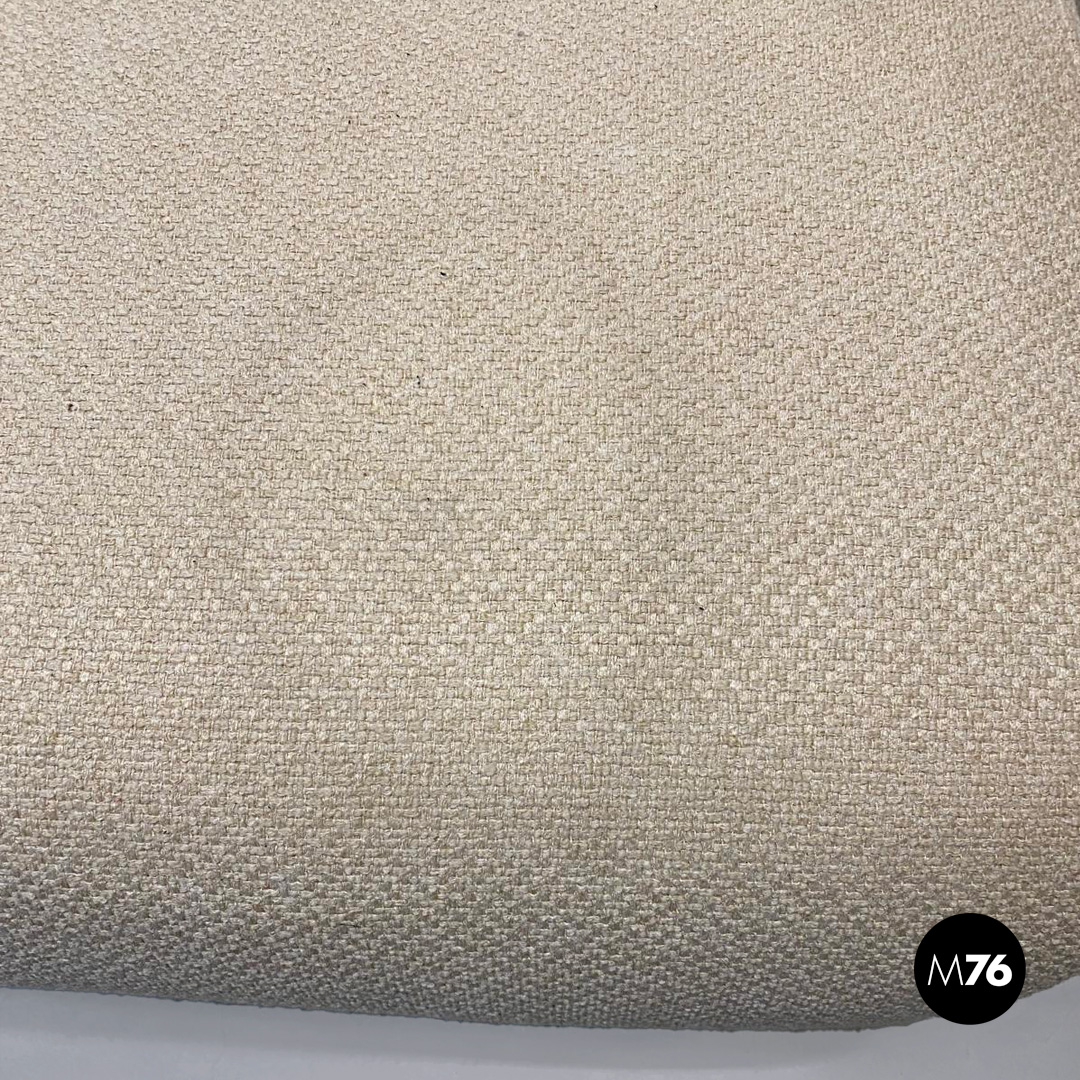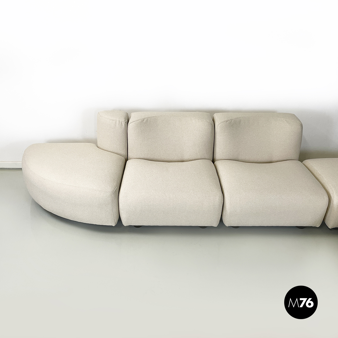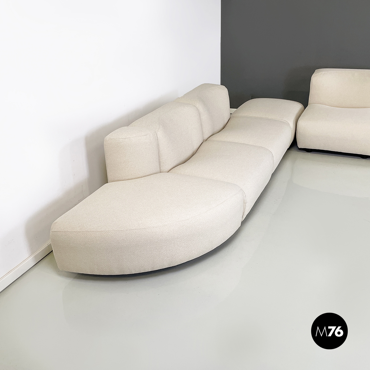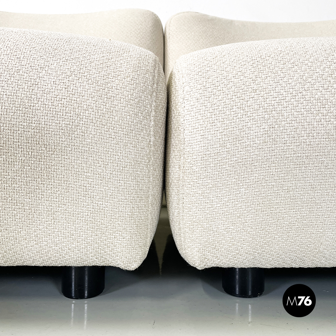 Divano modulare modello Novemila composto da sei moduli rivestiti in tessuto bianco-beige. I tre moduli semplici sono composti da seduta squadrata e schienale concavo. I due moduli terminali hanno la seduta a quarto di luna e schienale sottile. Infine è presente un pouf squadrato. Le zampe nere sono cilindriche. Ogni modulo del divano è posizionabile a piacere.