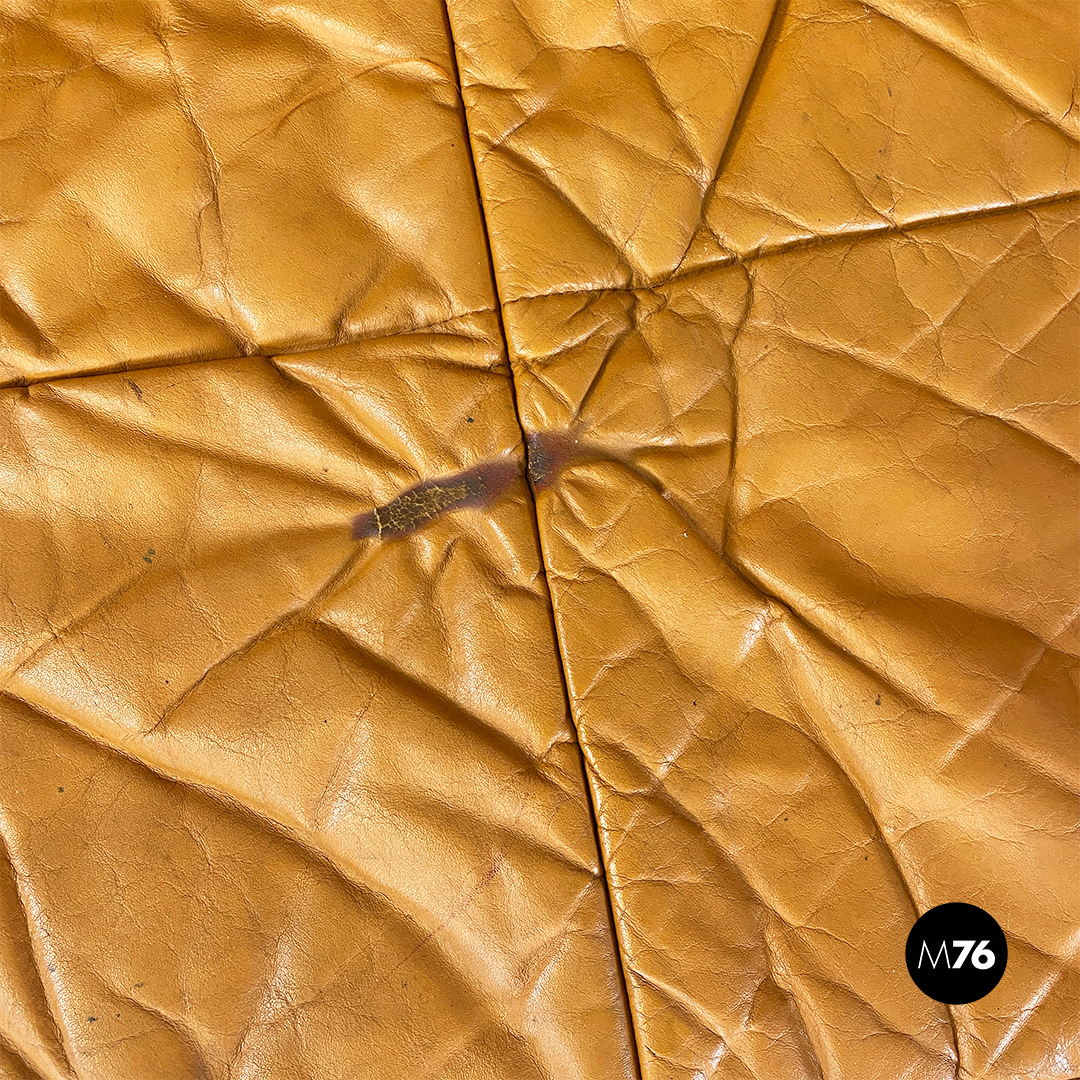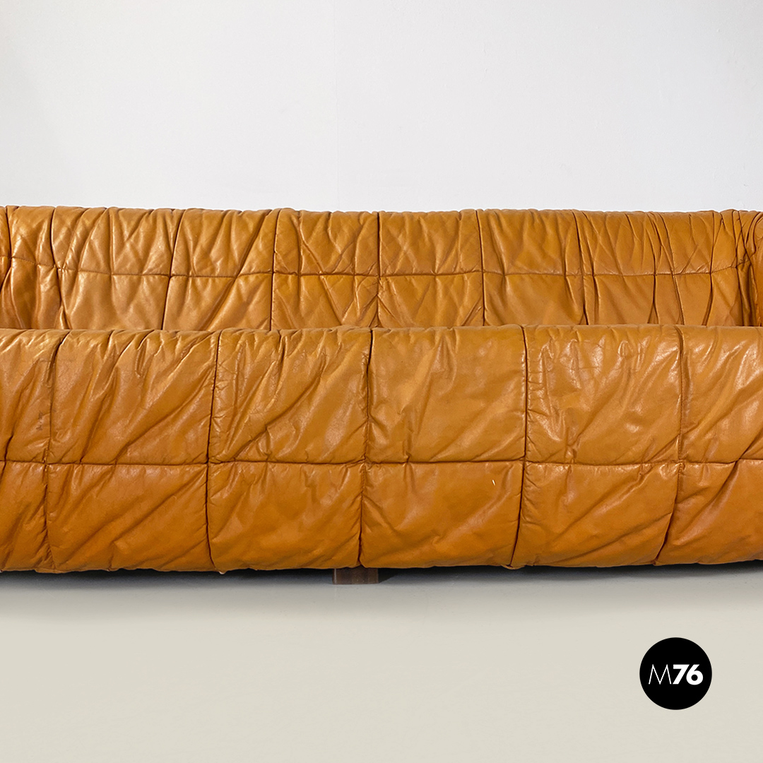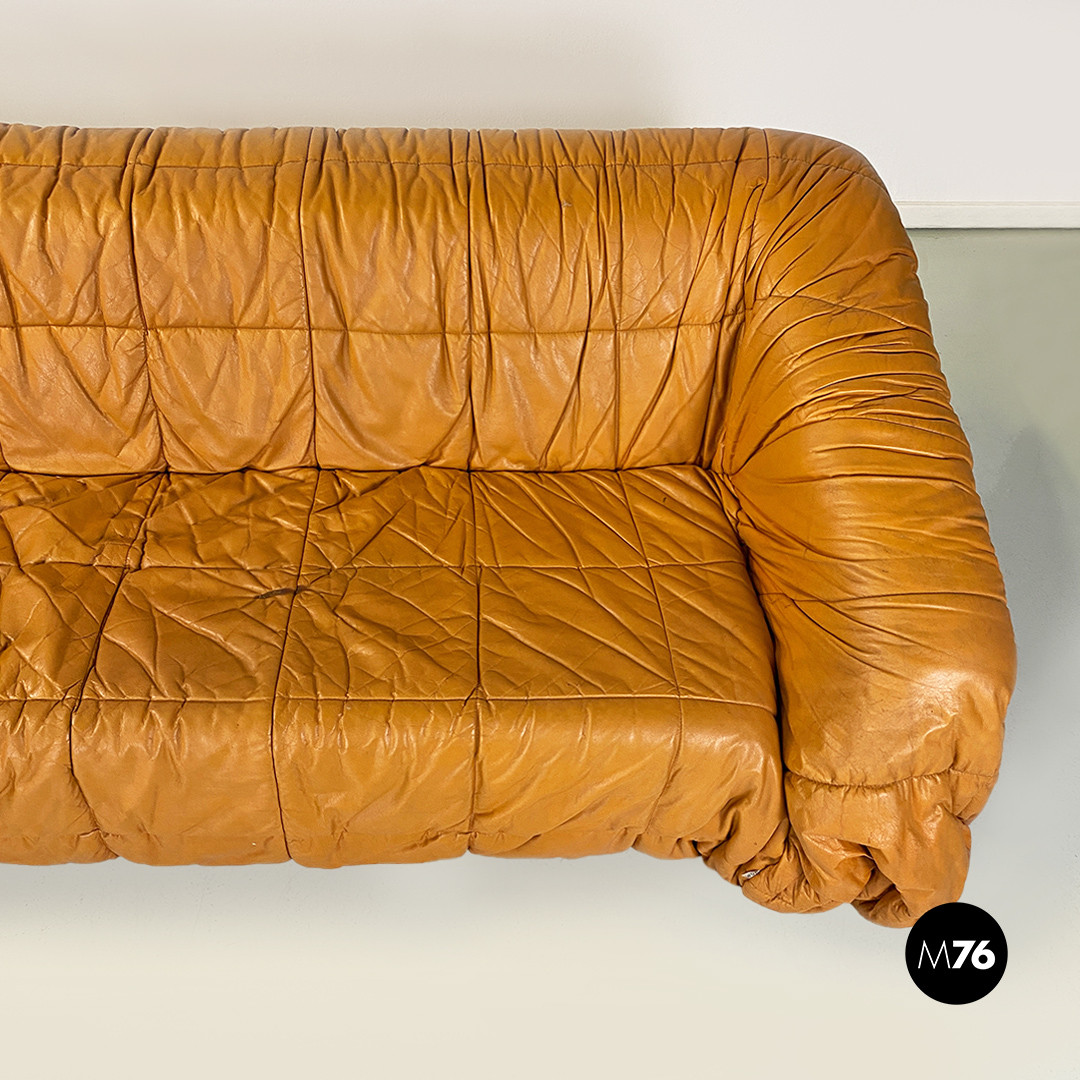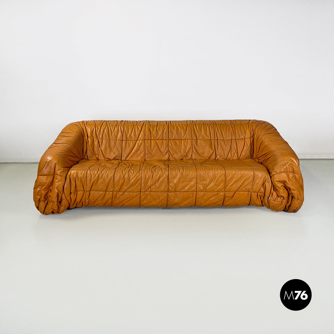 Divano modello Piumino con struttura interna in schiuma espansa e con una comoda seduta rivestita in pelle morbida arricciata, con colorazione tra il marrone chiaro e il caramello.