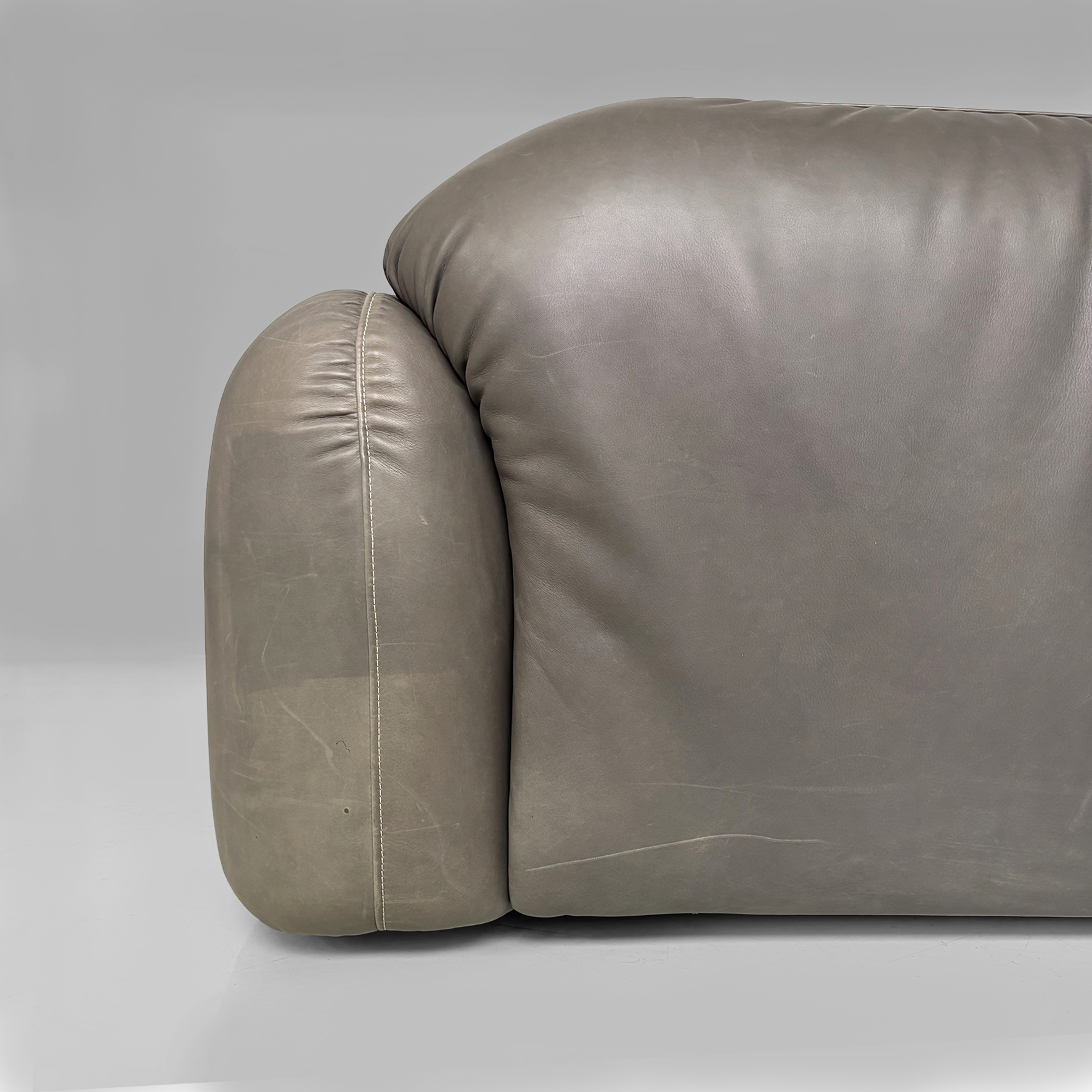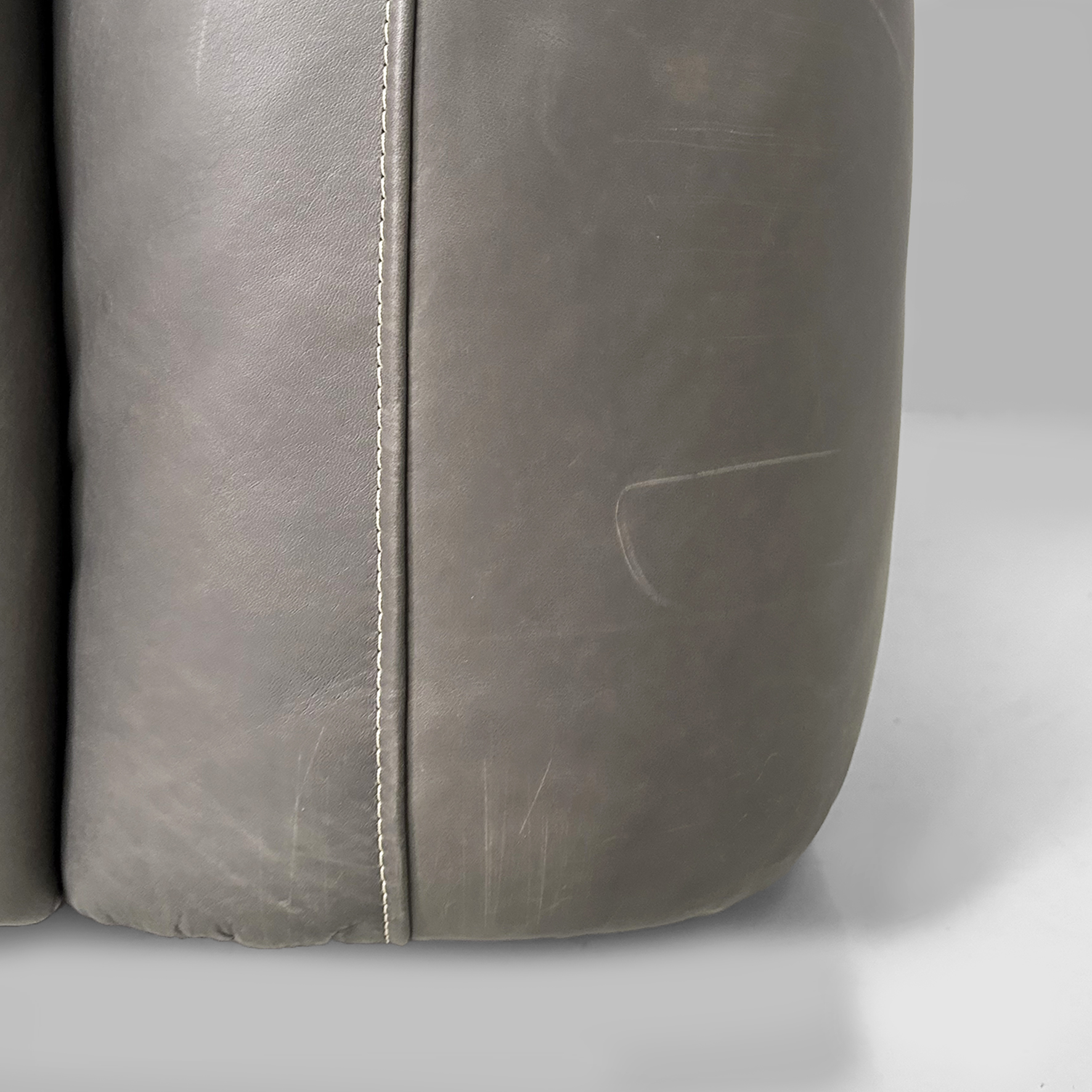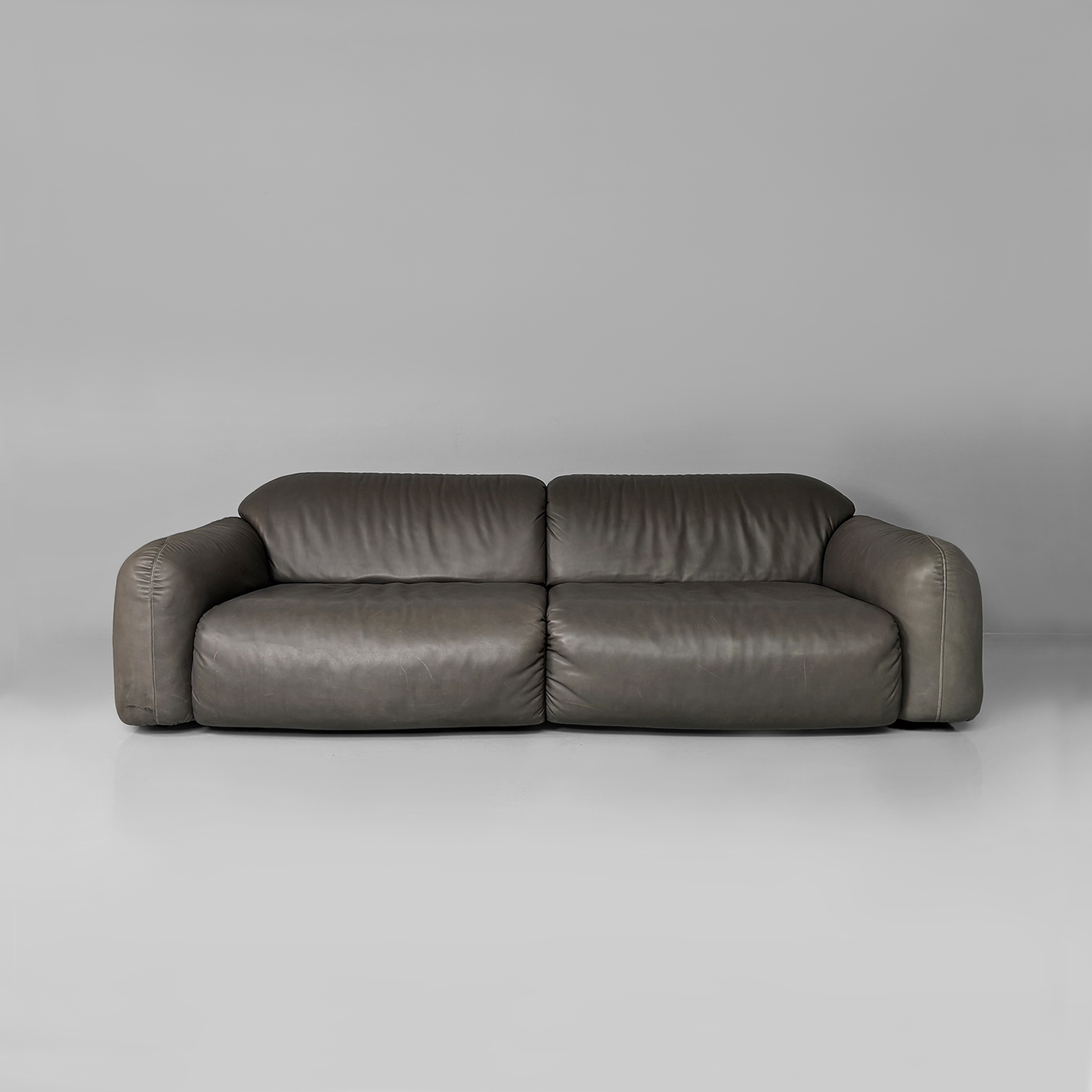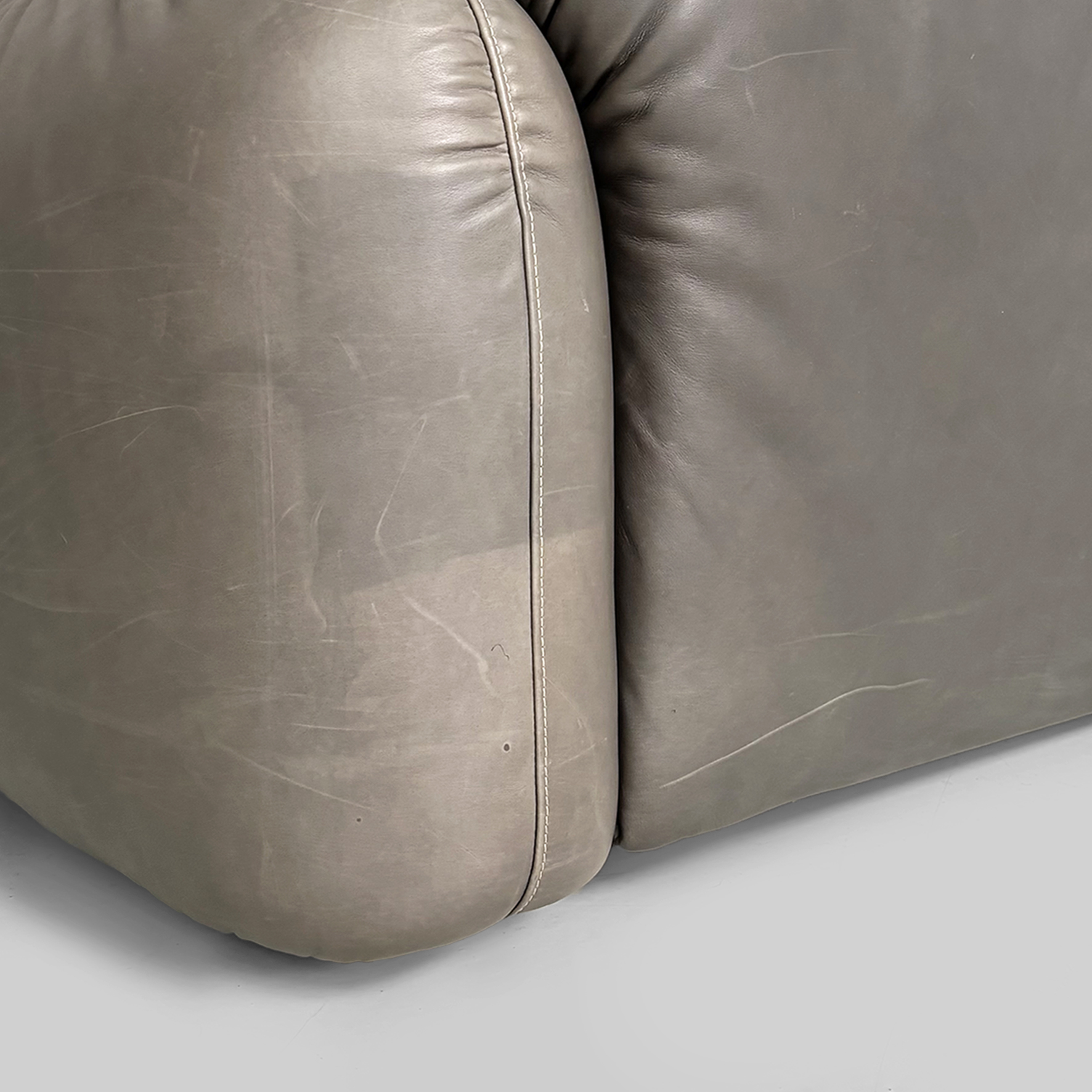 Divano modello Piumotto a due posti, interamente imbottito e rivestito in pelle grigia. La seduta, i braccioli e lo schienale sono composti da cuscini squadrati.