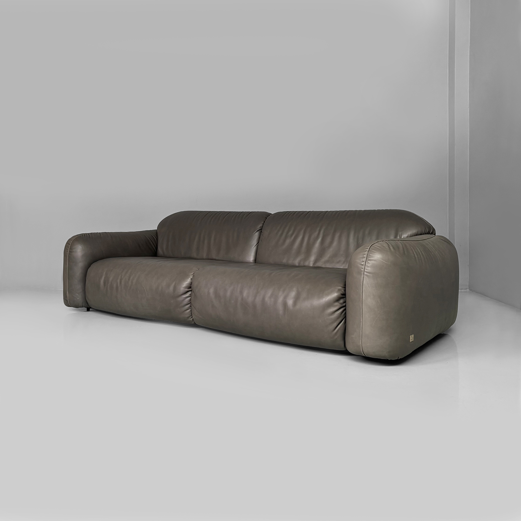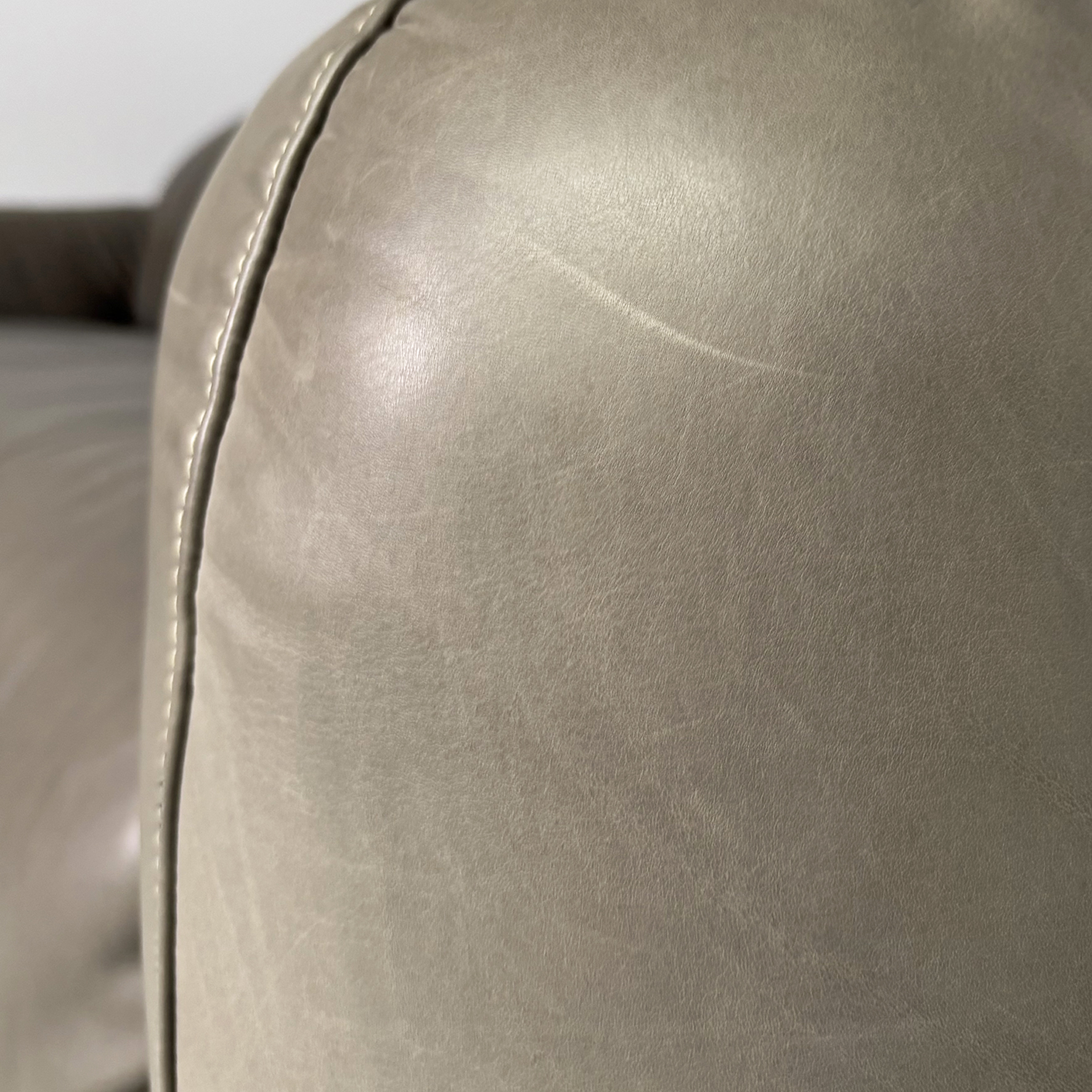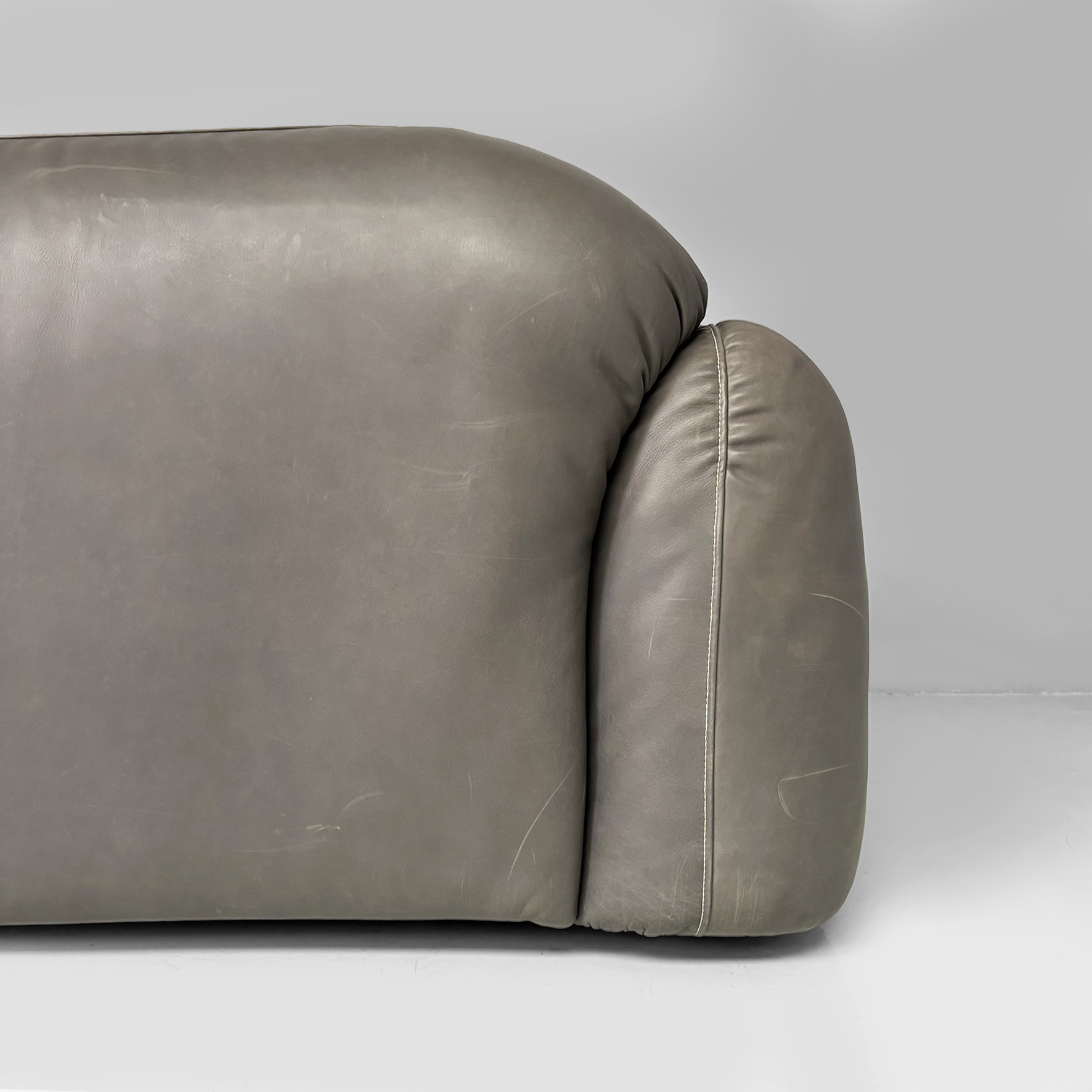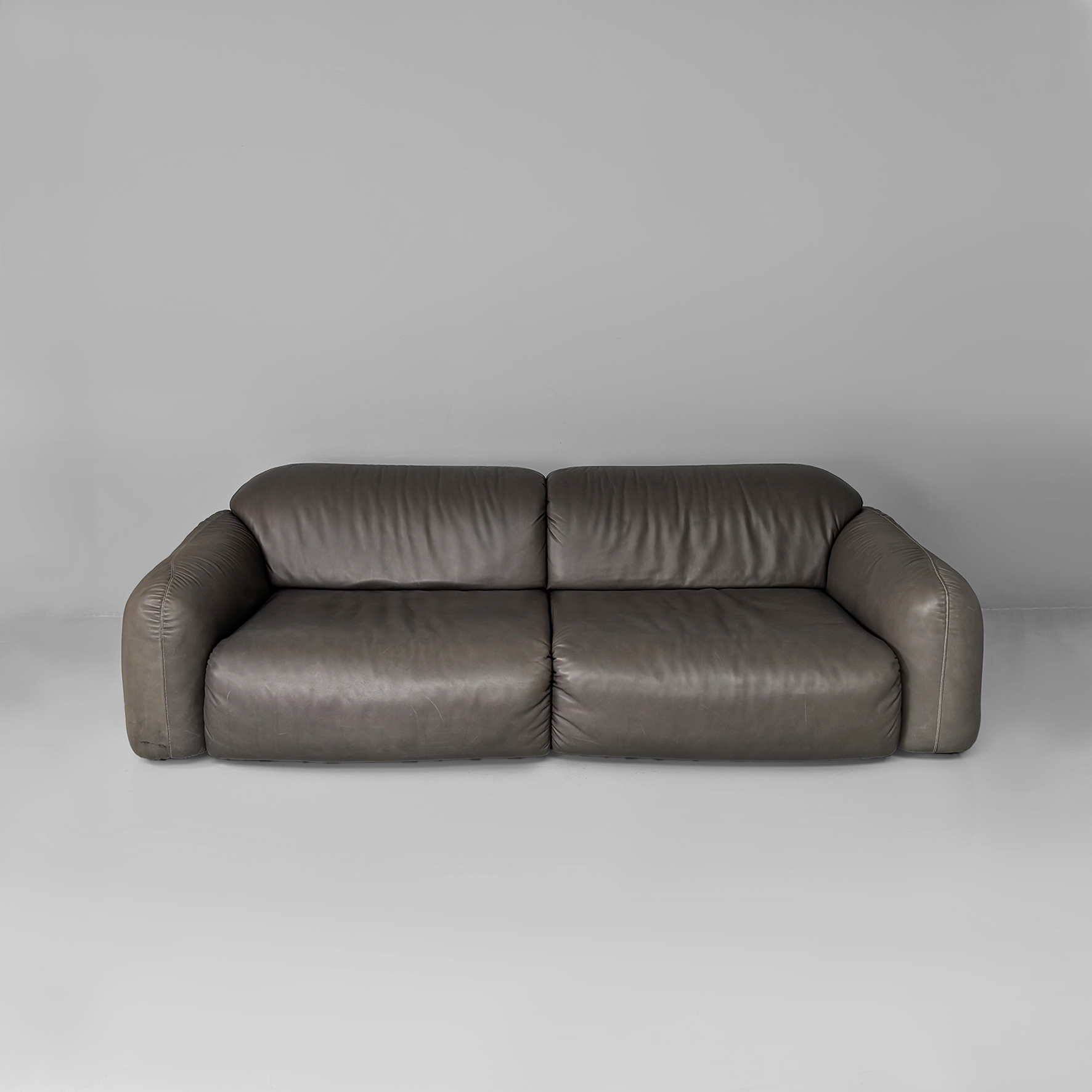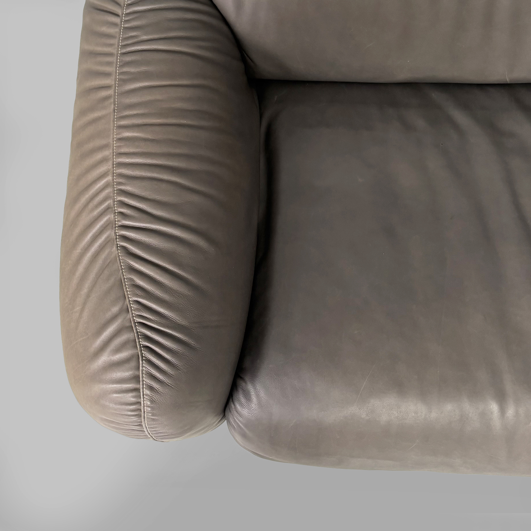 Divano modello Piumotto a due posti, interamente imbottito e rivestito in pelle grigia. La seduta, i braccioli e lo schienale sono composti da cuscini squadrati.