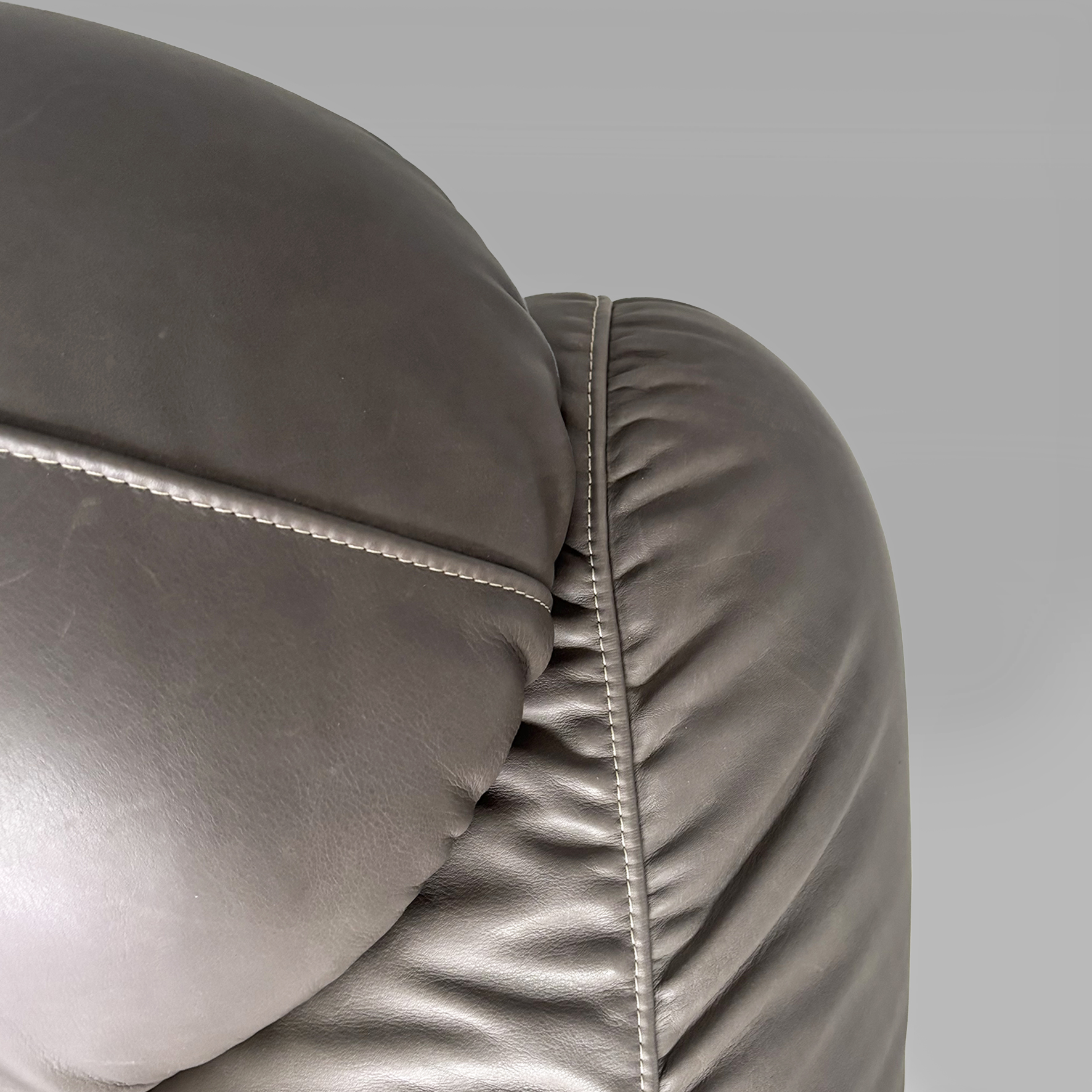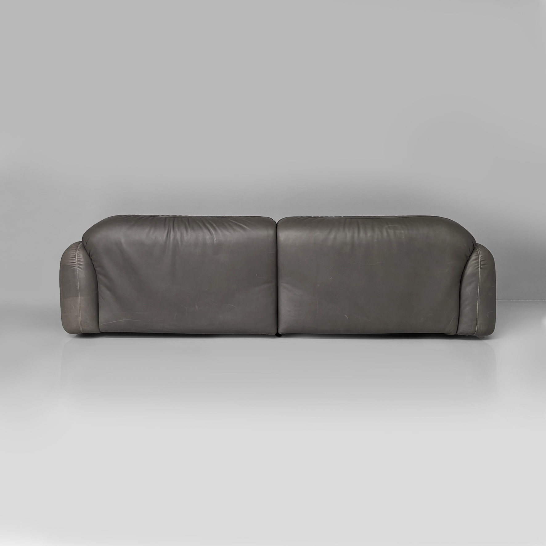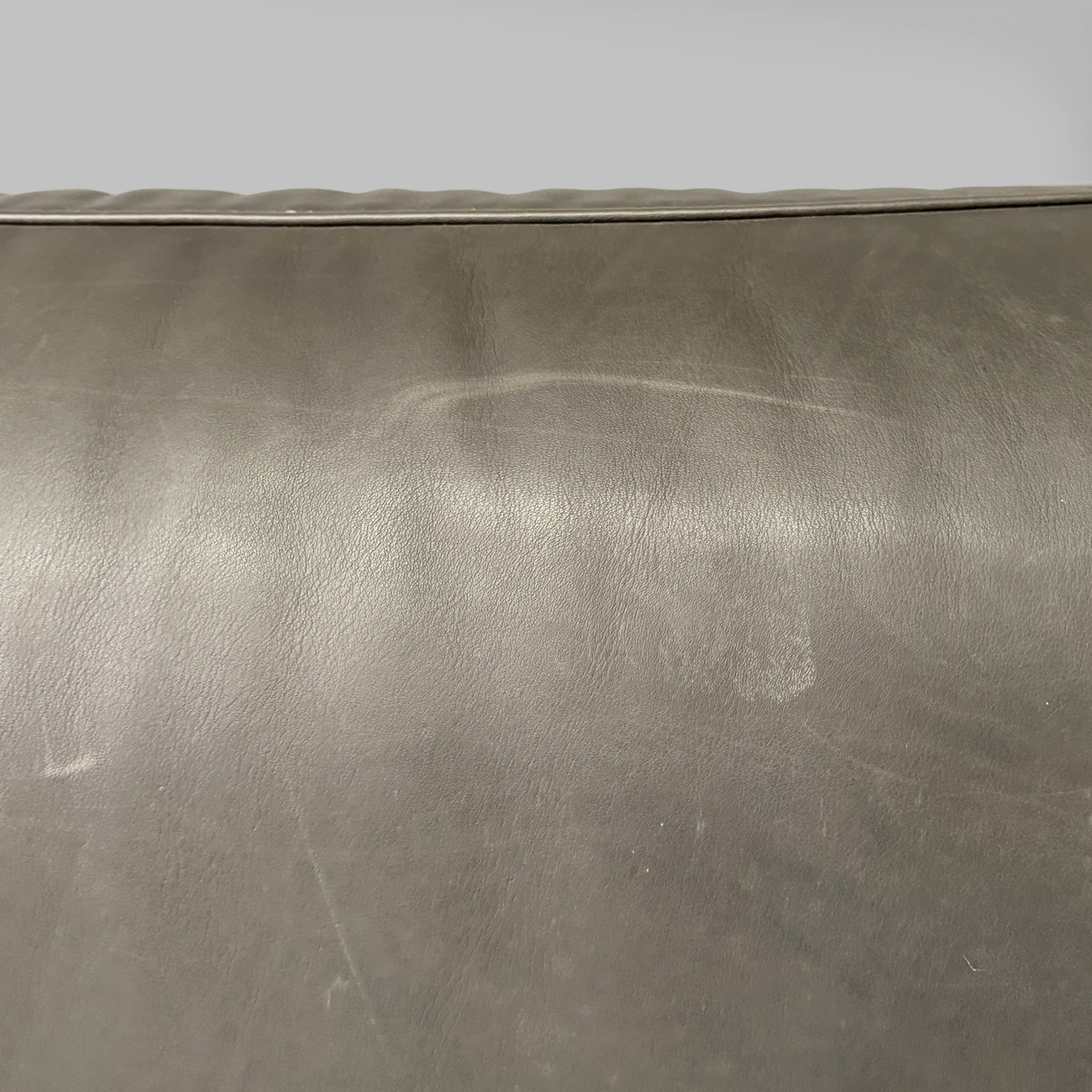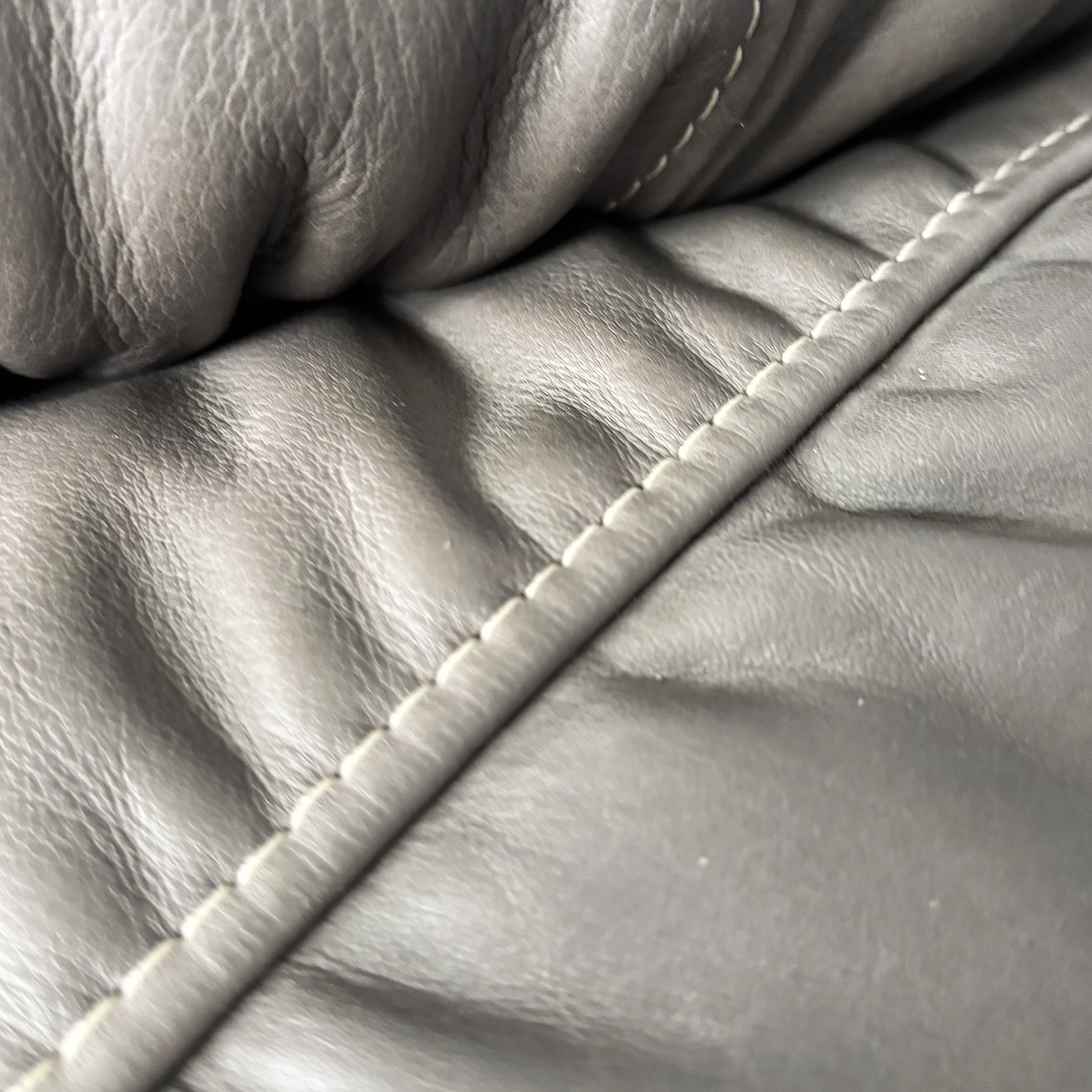 Divano modello Piumotto a due posti, interamente imbottito e rivestito in pelle grigia. La seduta, i braccioli e lo schienale sono composti da cuscini squadrati.