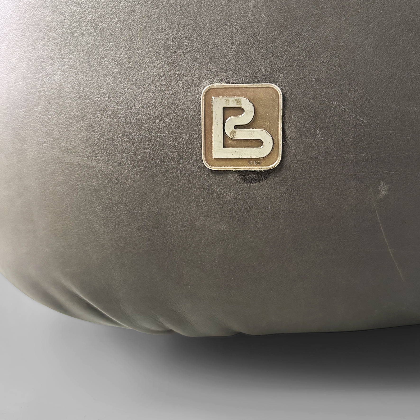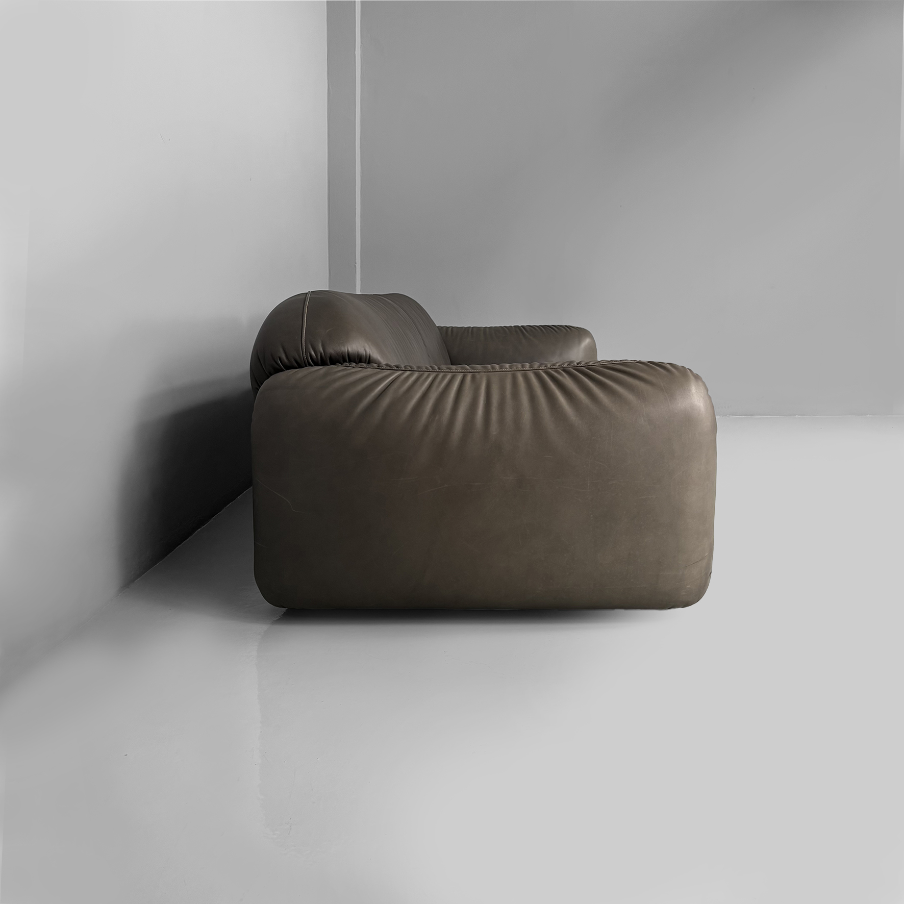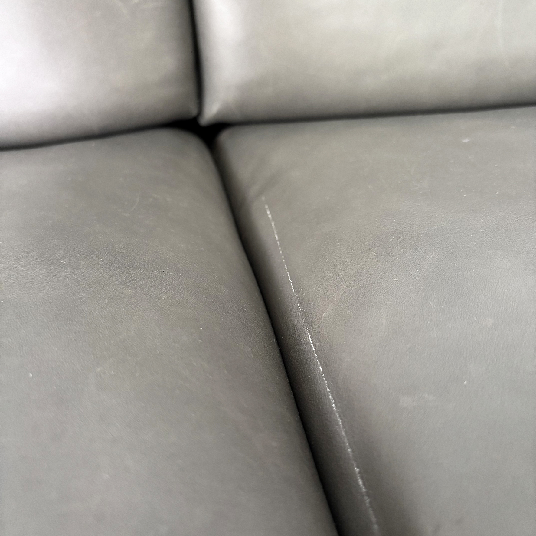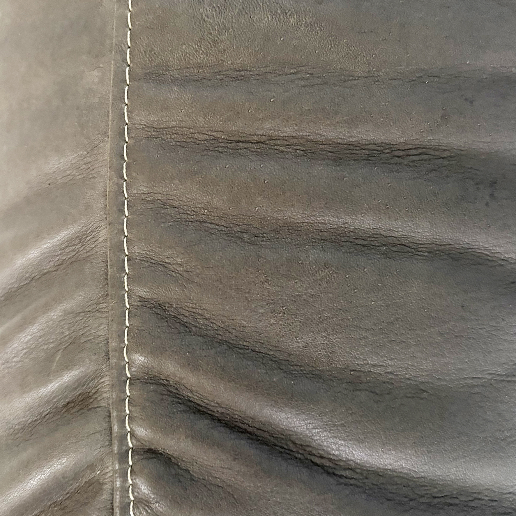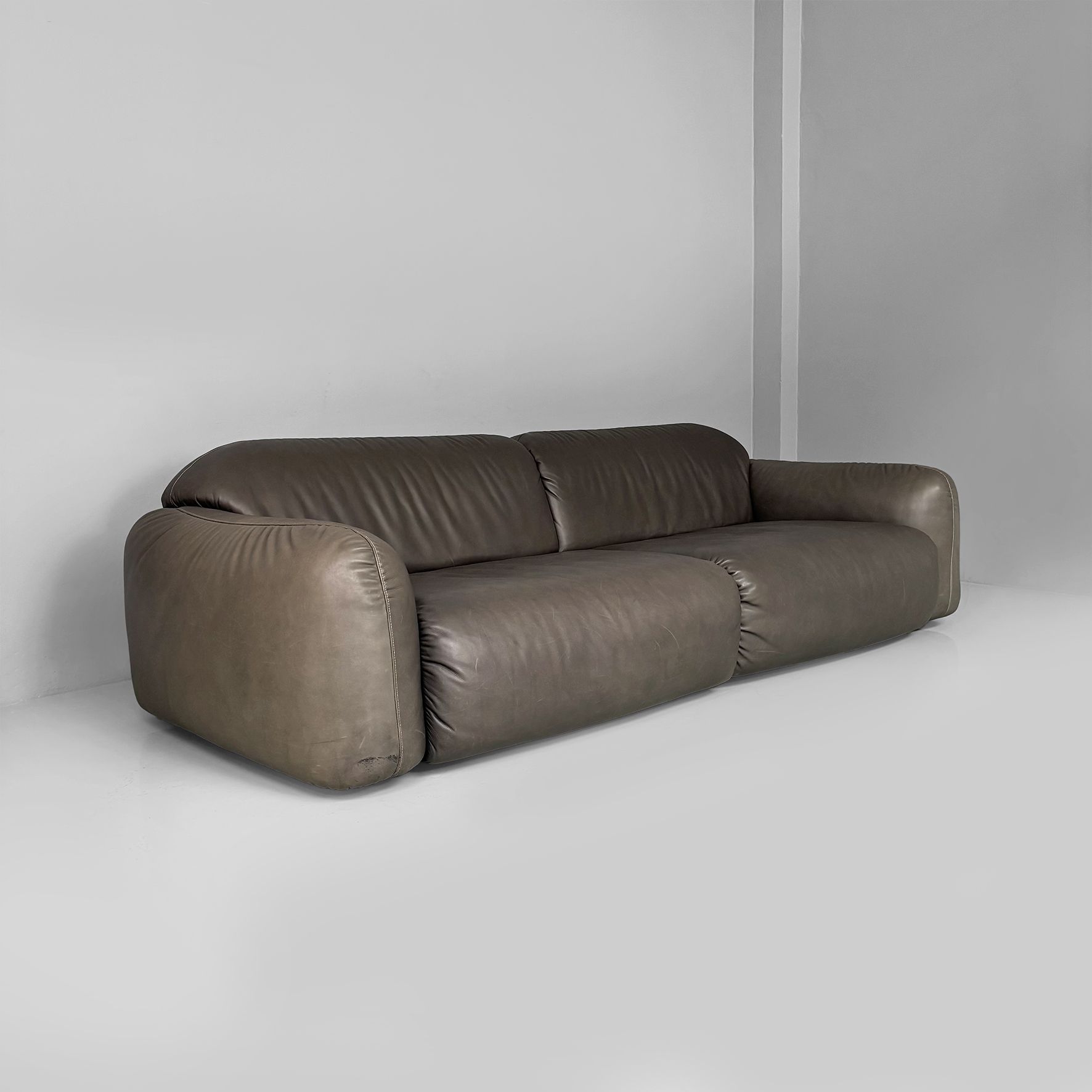 Divano modello Piumotto a due posti, interamente imbottito e rivestito in pelle grigia. La seduta, i braccioli e lo schienale sono composti da cuscini squadrati.