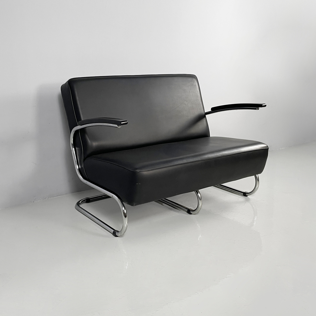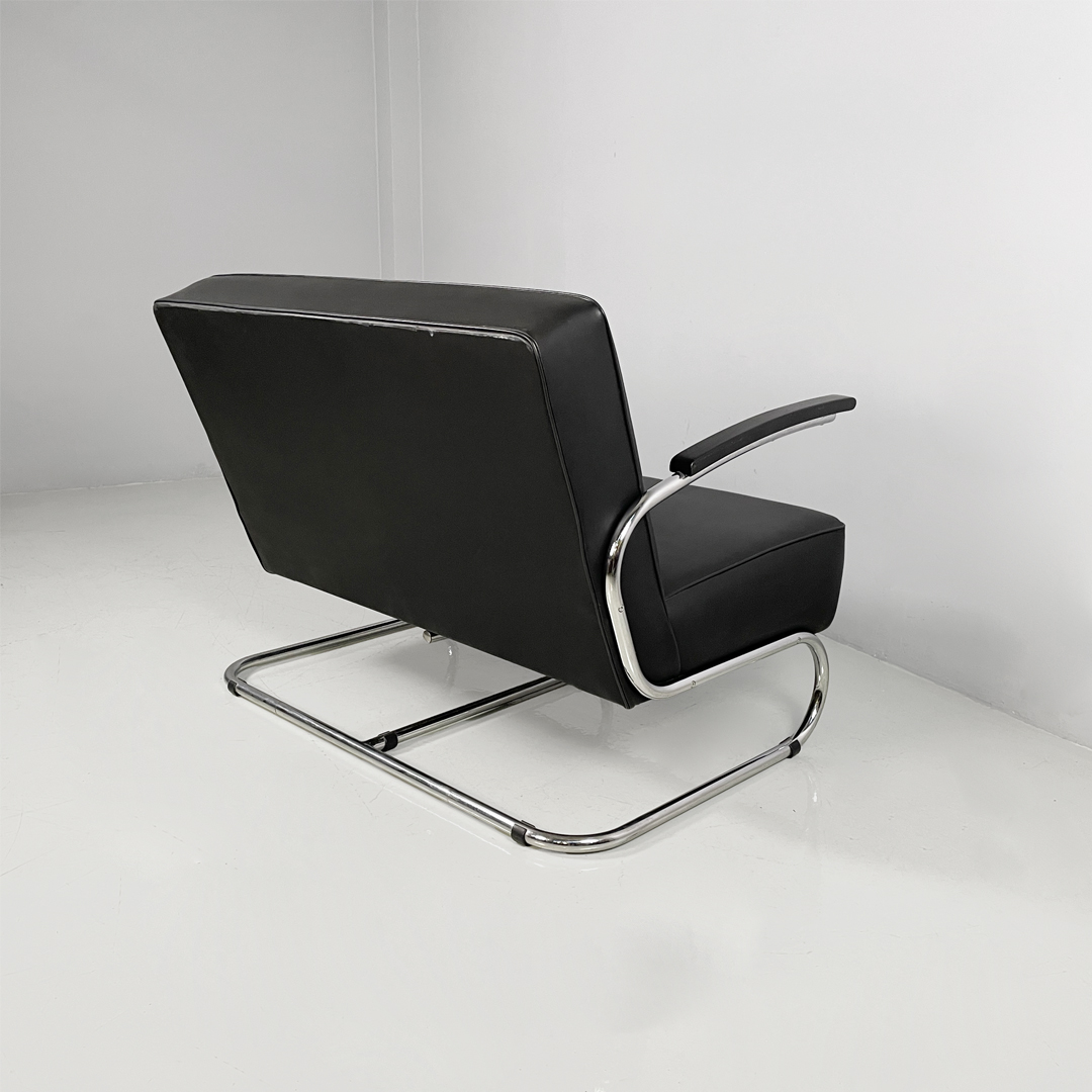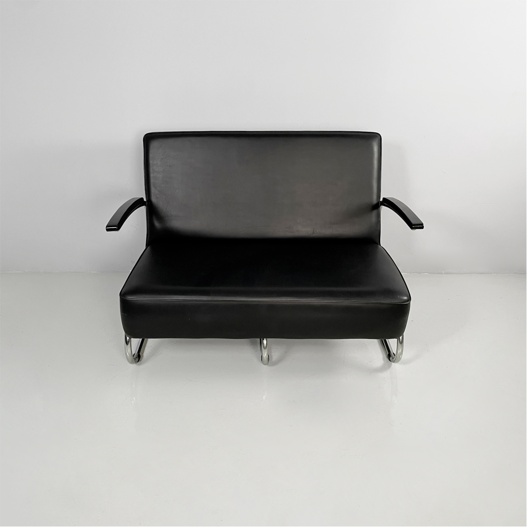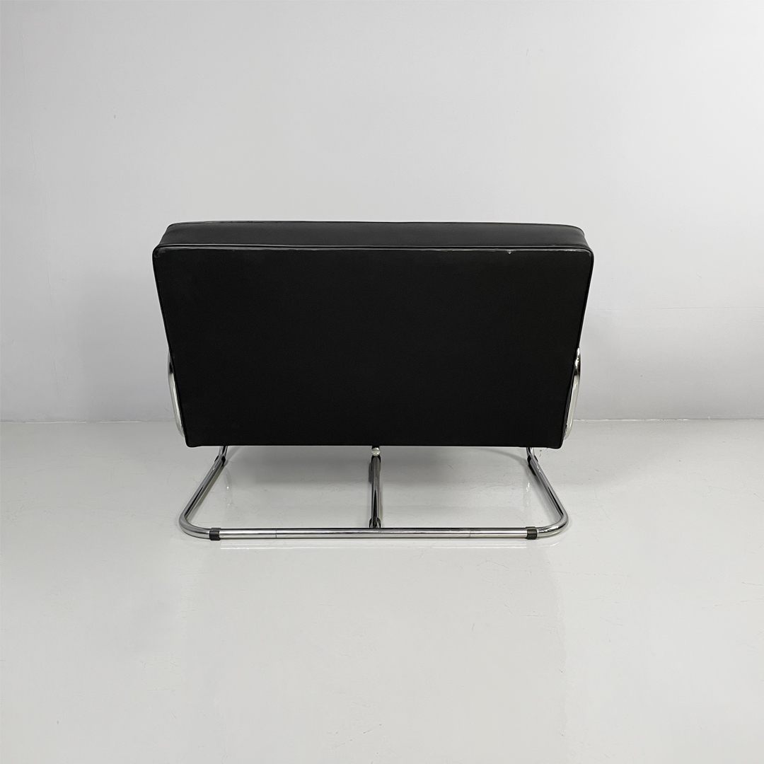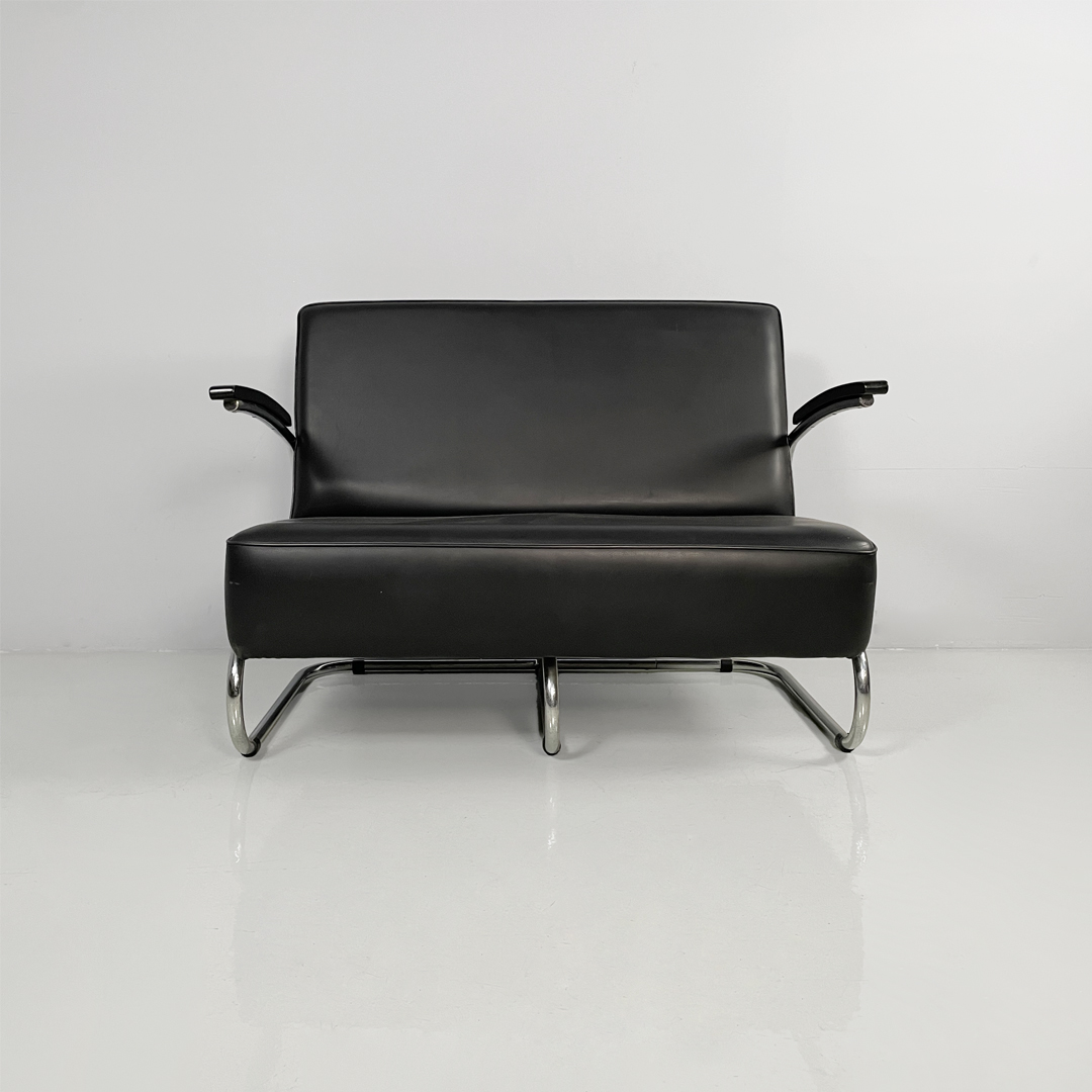 Divano a due posti modello S 411 in pelle. La seduta e lo schienale sono composti da cuscini squadrati imbottiti e rivestiti in pelle nera. Troviamo due braccioli con listello in legno nella parte superiore. La struttura è in tubolare di acciaio cromato e presenta piedini a sella.