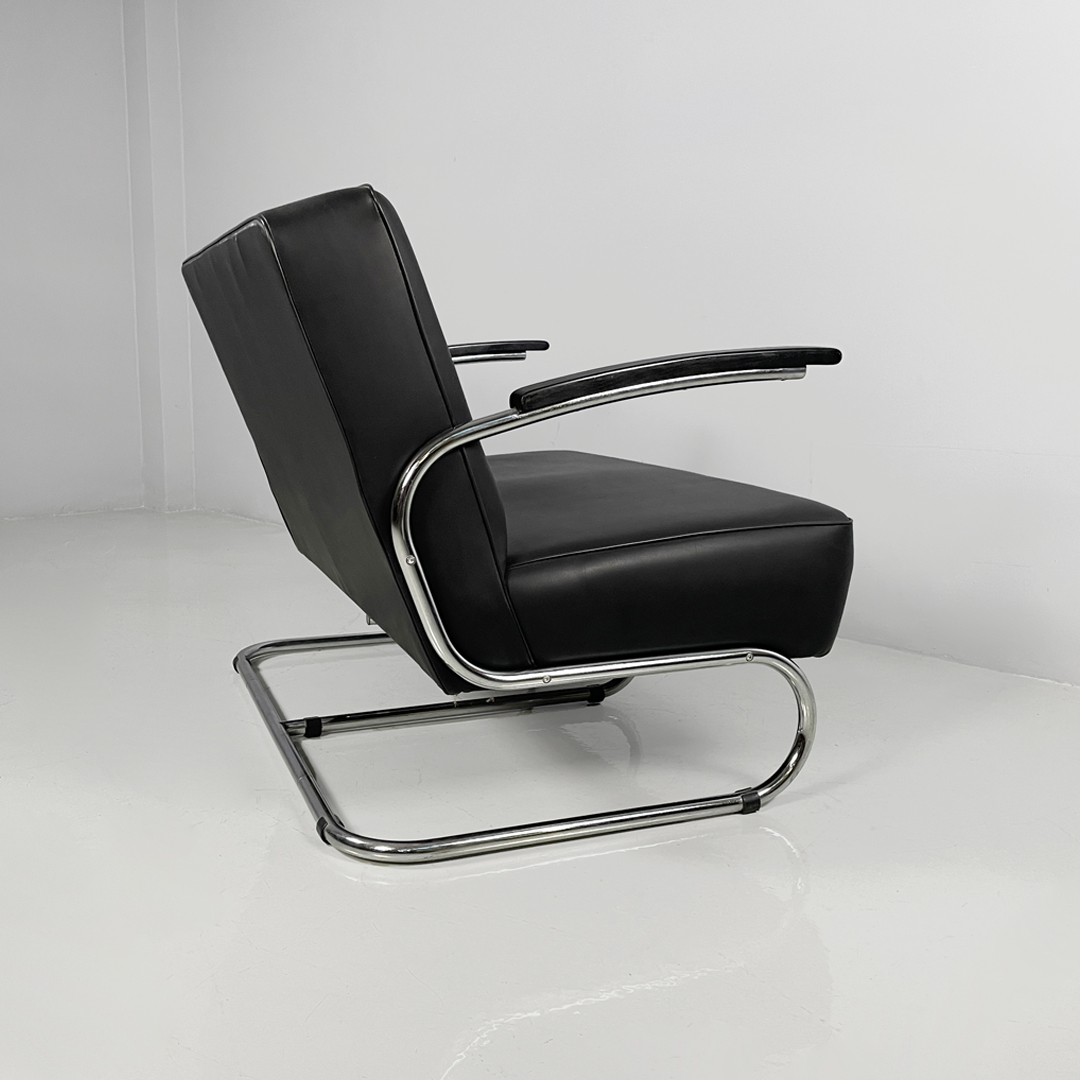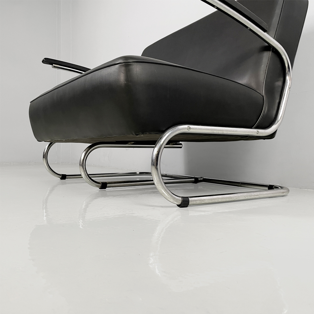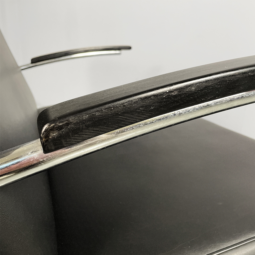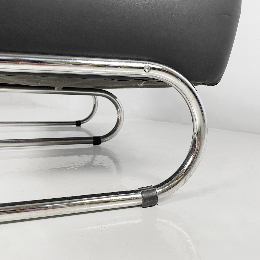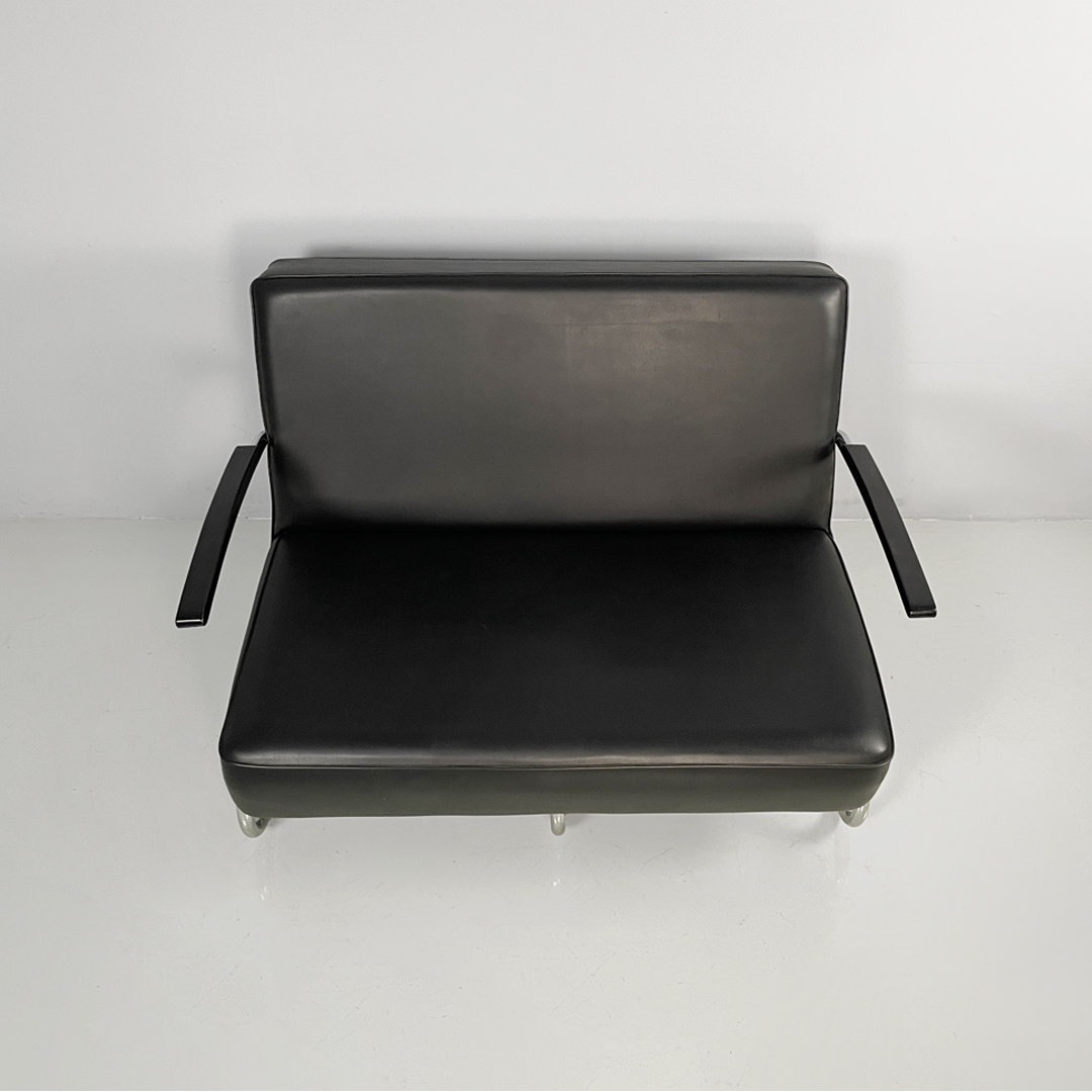 Divano a due posti modello S 411 in pelle. La seduta e lo schienale sono composti da cuscini squadrati imbottiti e rivestiti in pelle nera. Troviamo due braccioli con listello in legno nella parte superiore. La struttura è in tubolare di acciaio cromato e presenta piedini a sella.