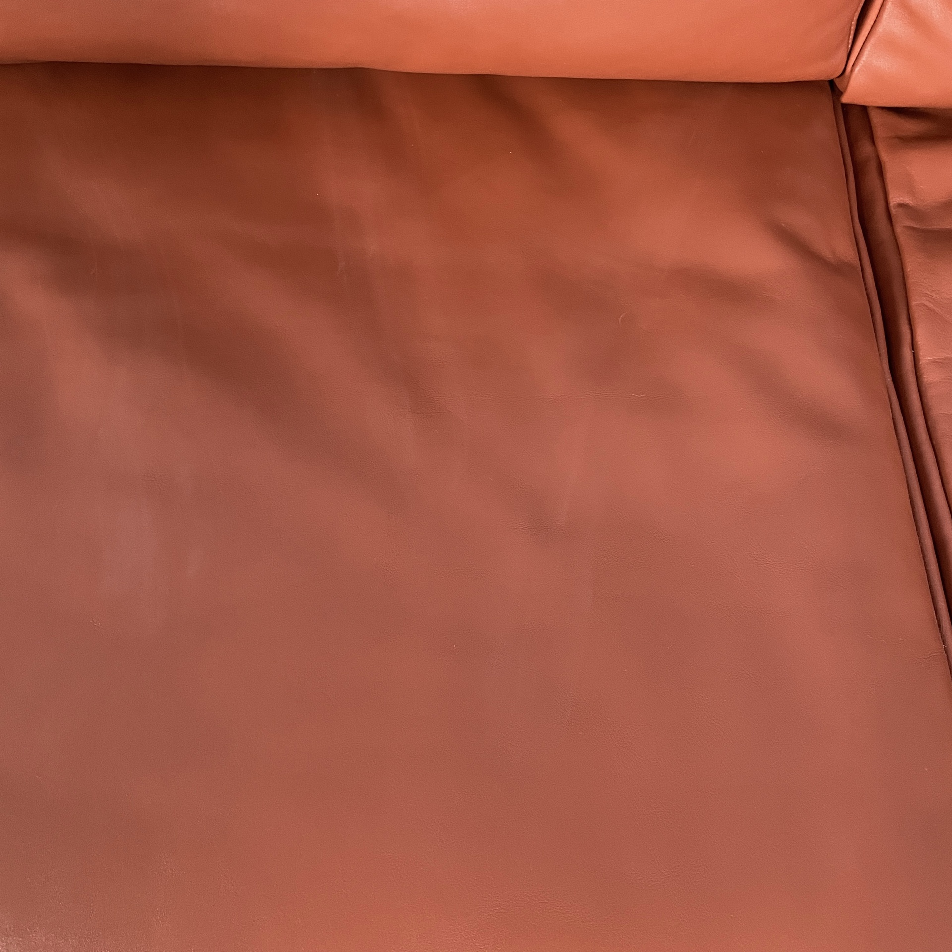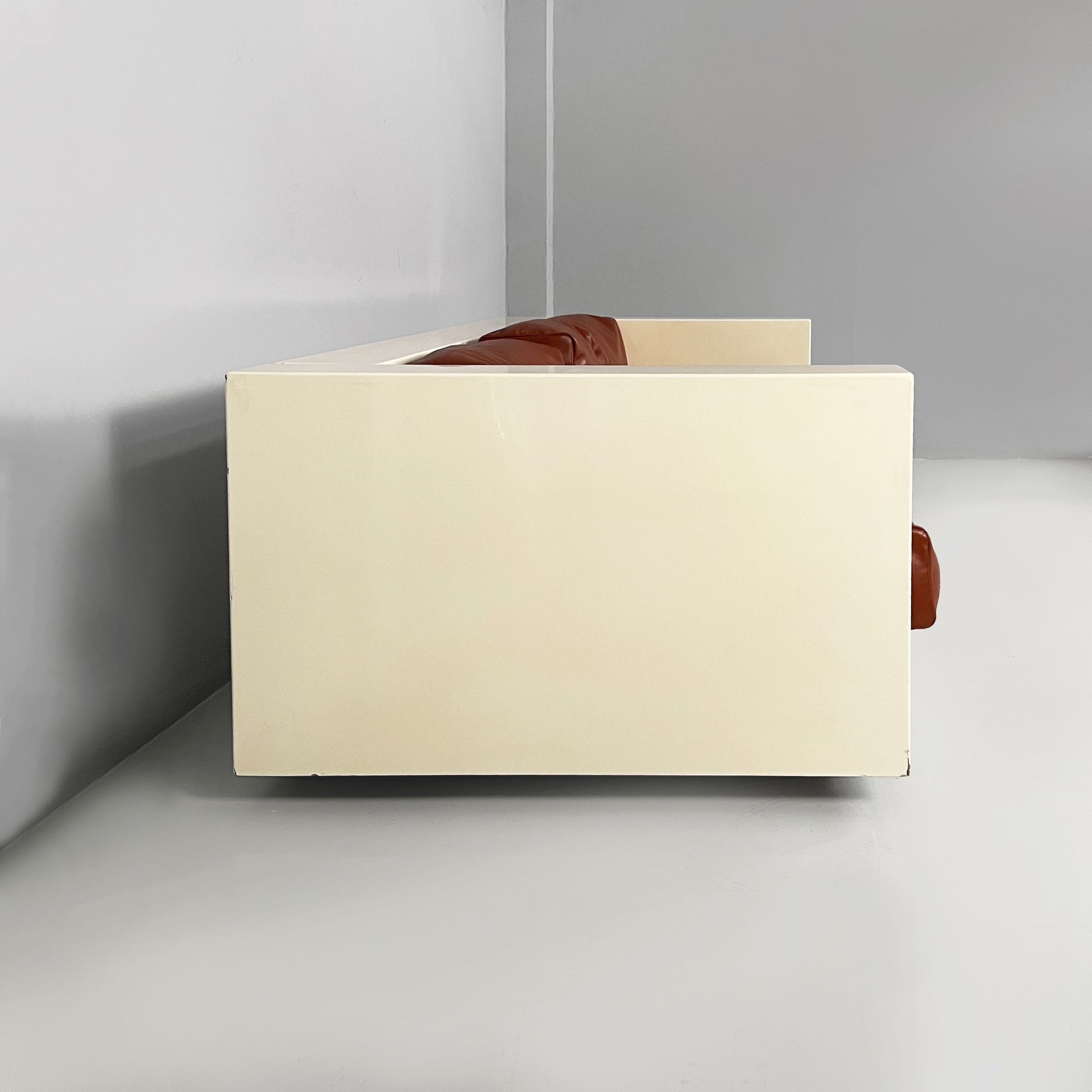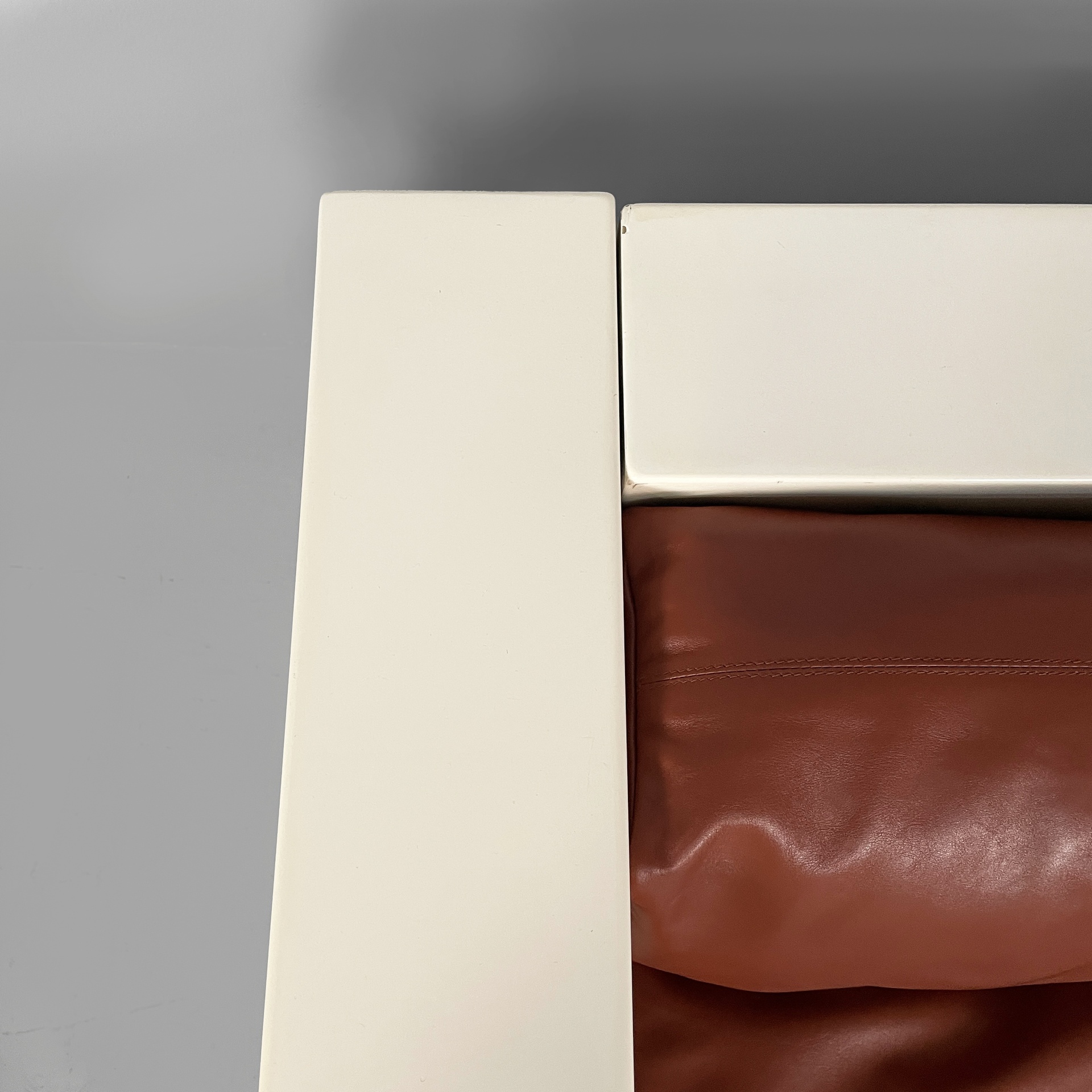 Divano a tre posti modello Saratoga con seduta e schienale composti da cuscini in pelle marrone. La struttura e i braccioli sono in legno laccato bianco.