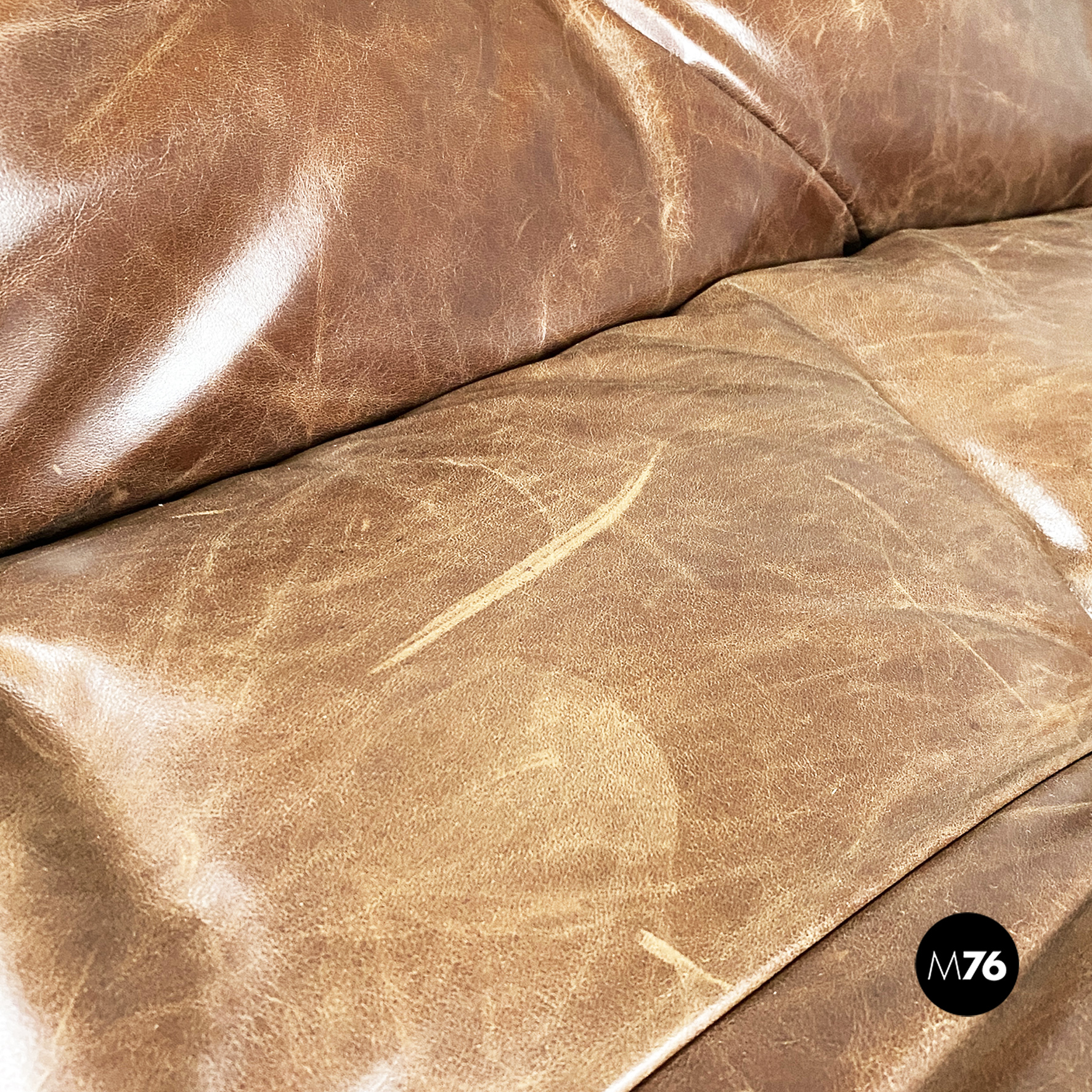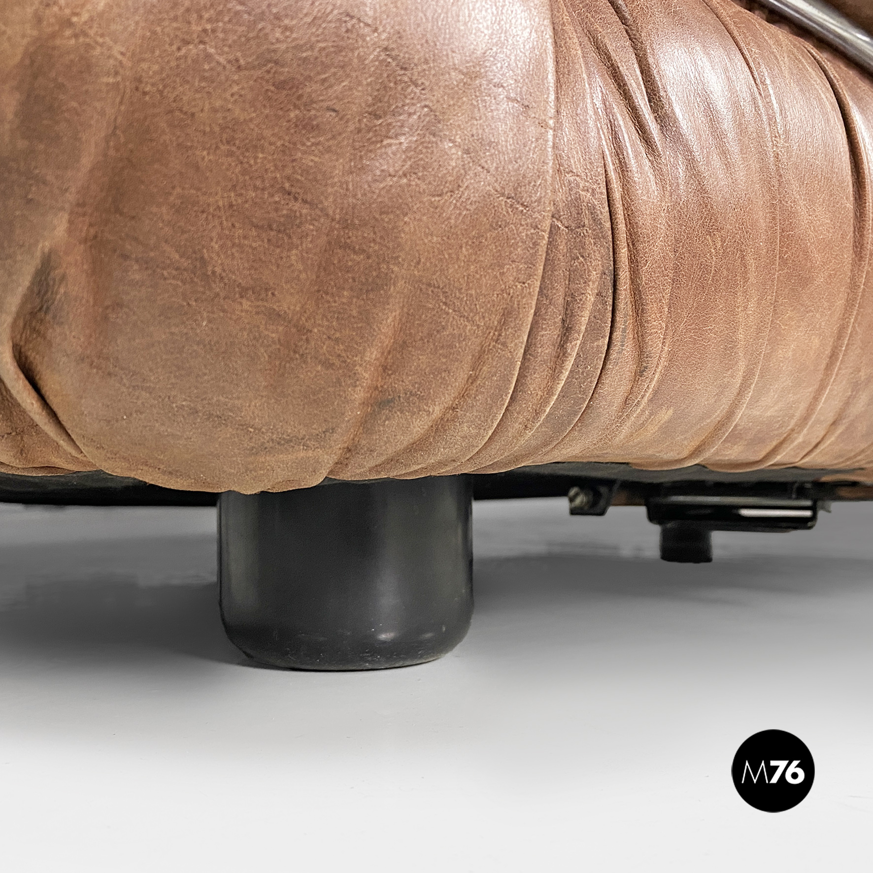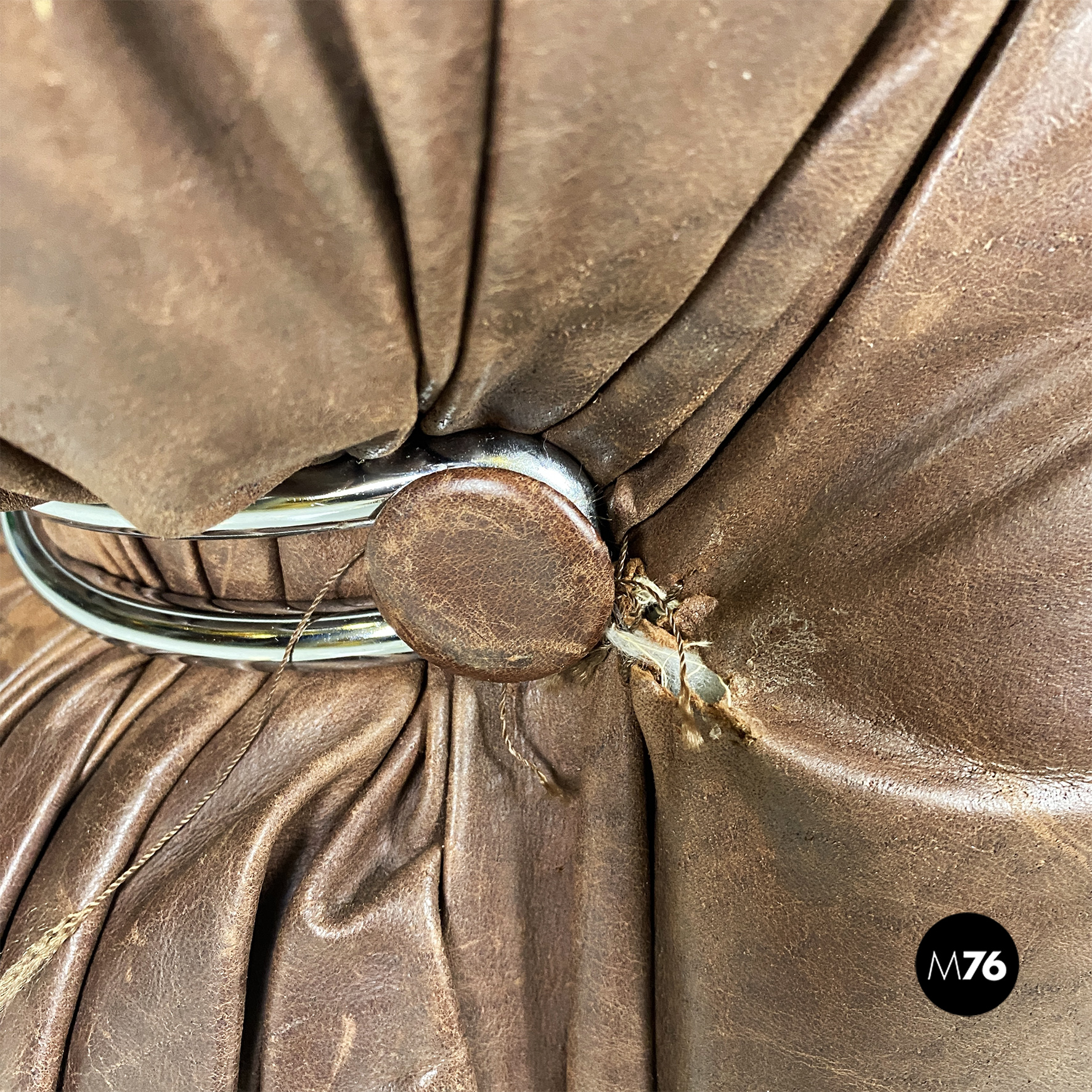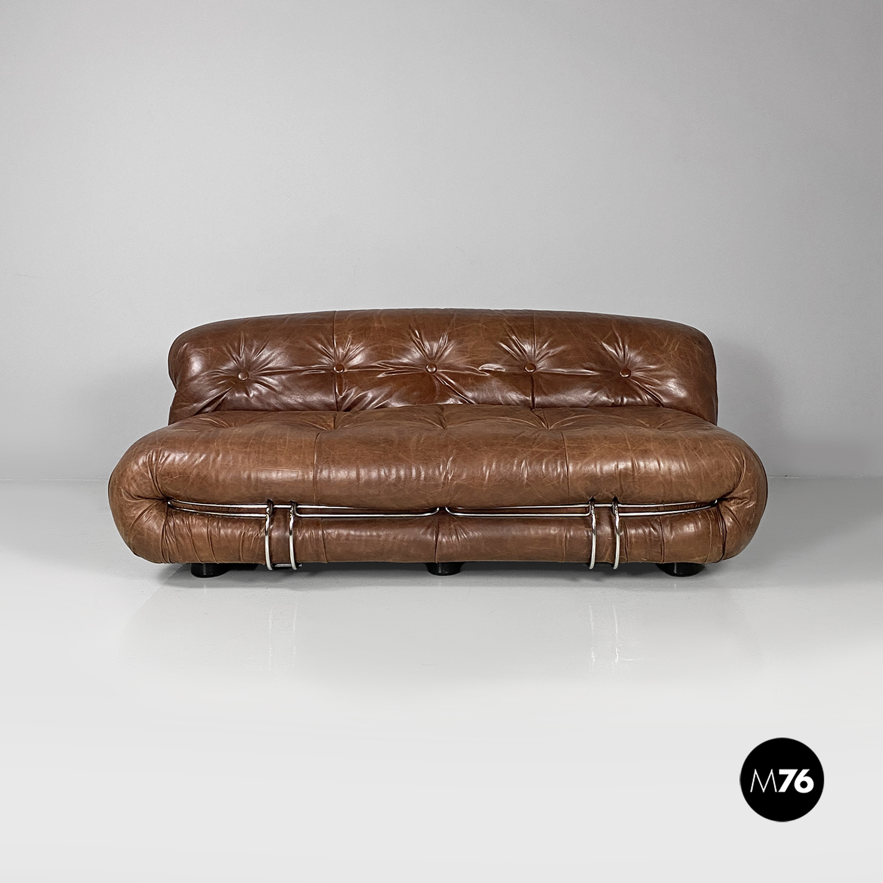 Divano modello Soriana a due posti con imbottitura contenuta da elementi in tondino di acciaio cromato e rivestimento in pelle marrone. Bottoni presenti sulla seduta e sullo schienale.