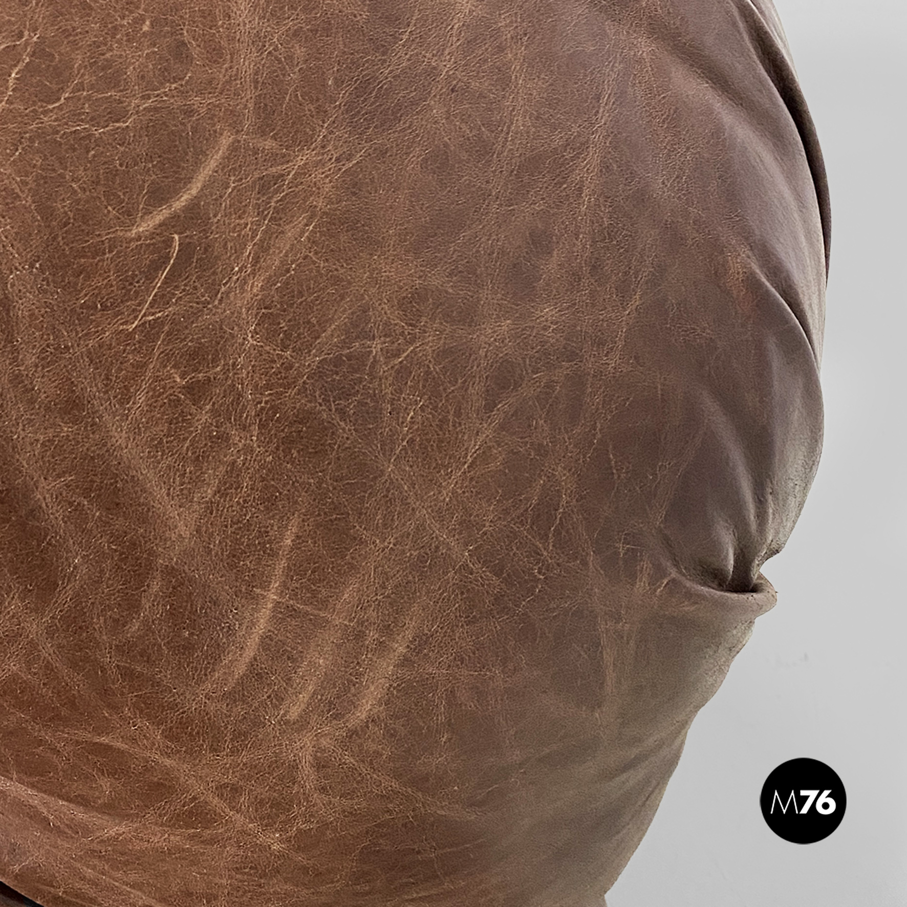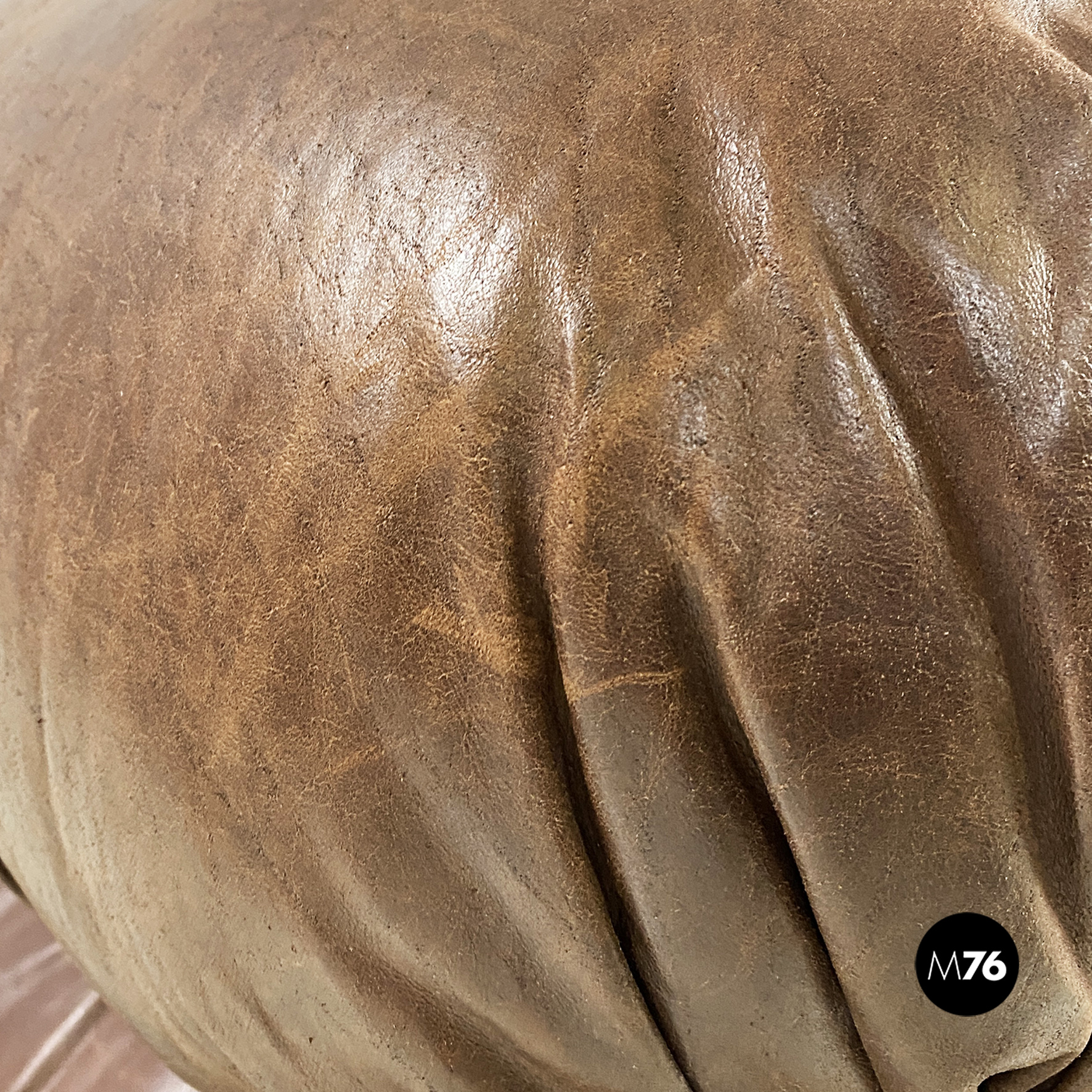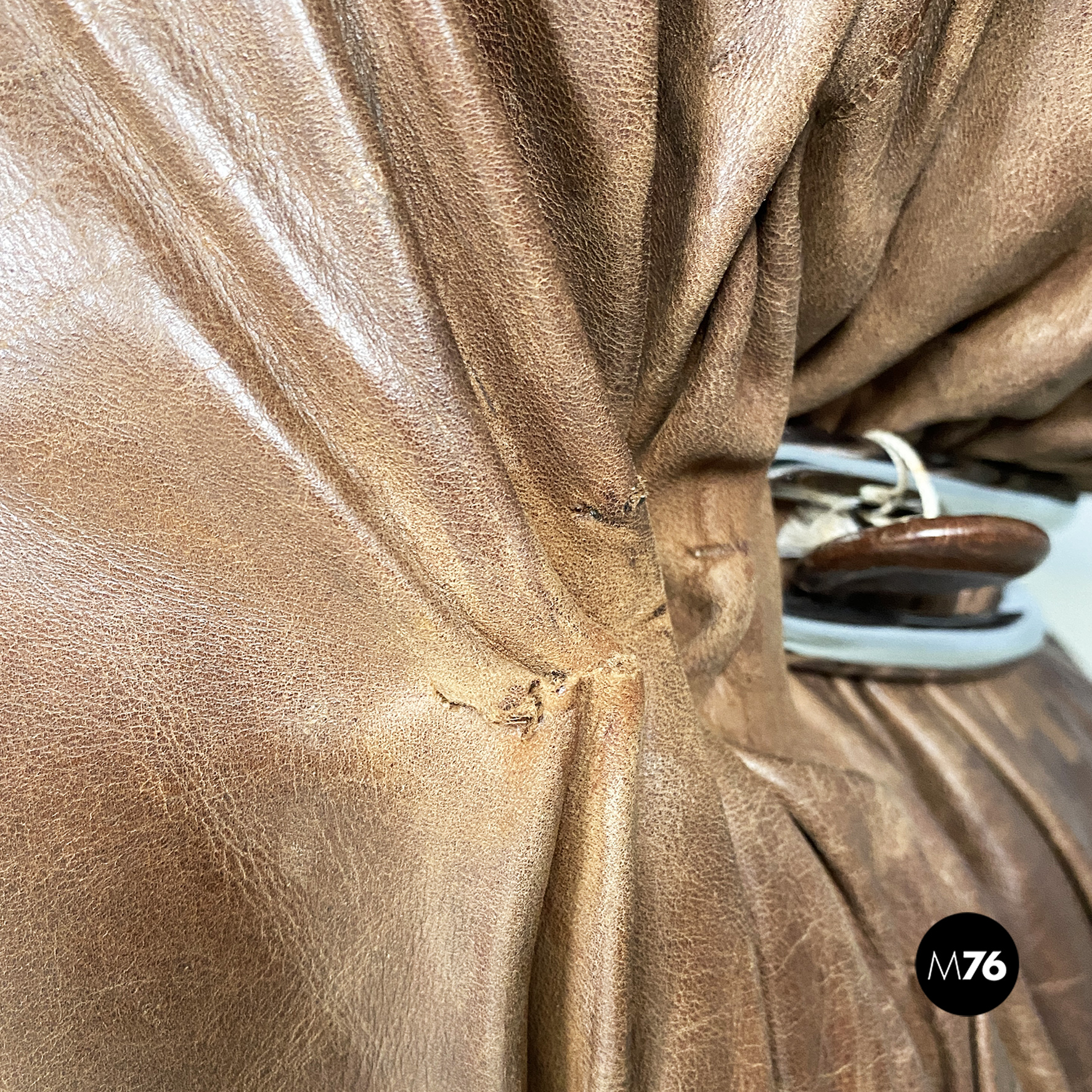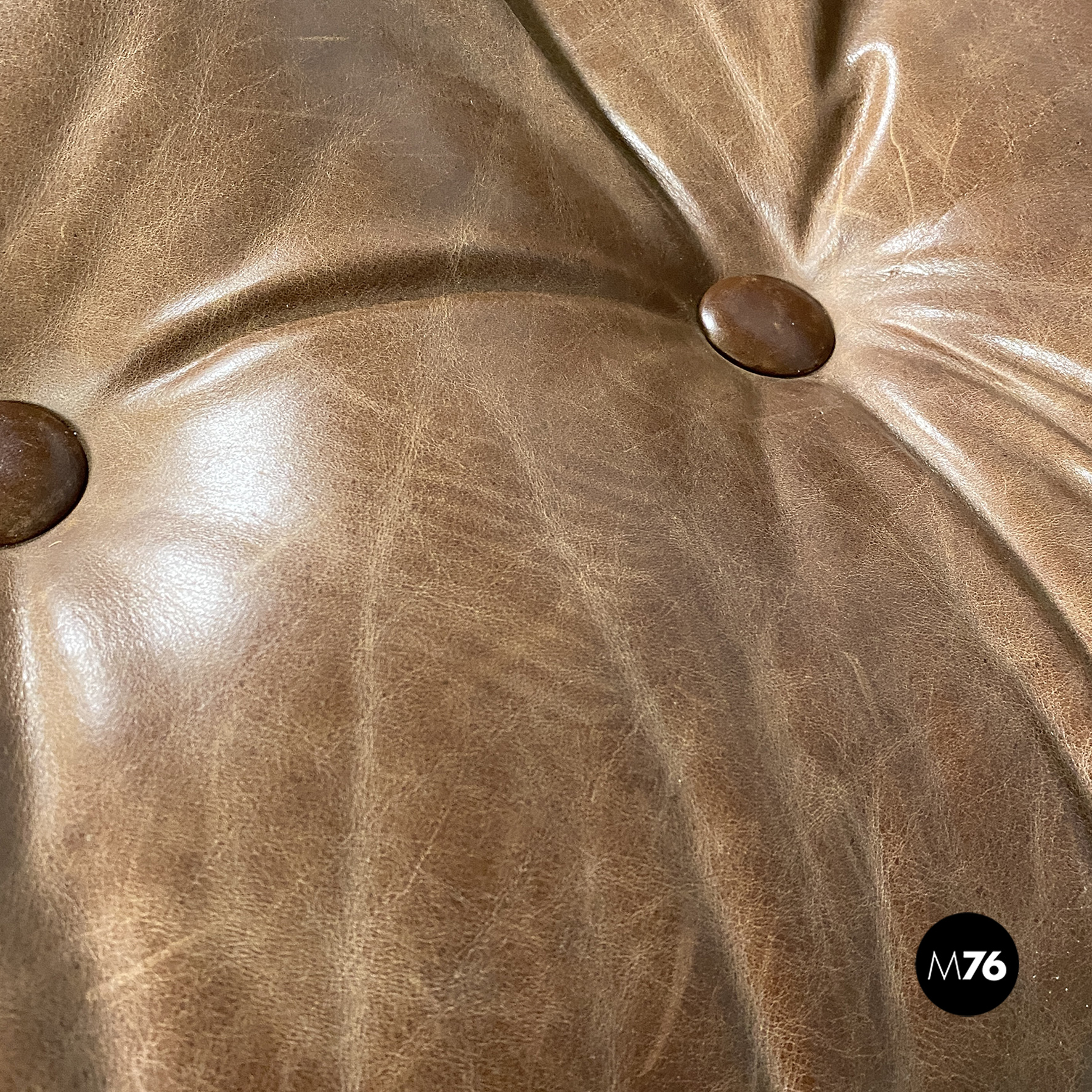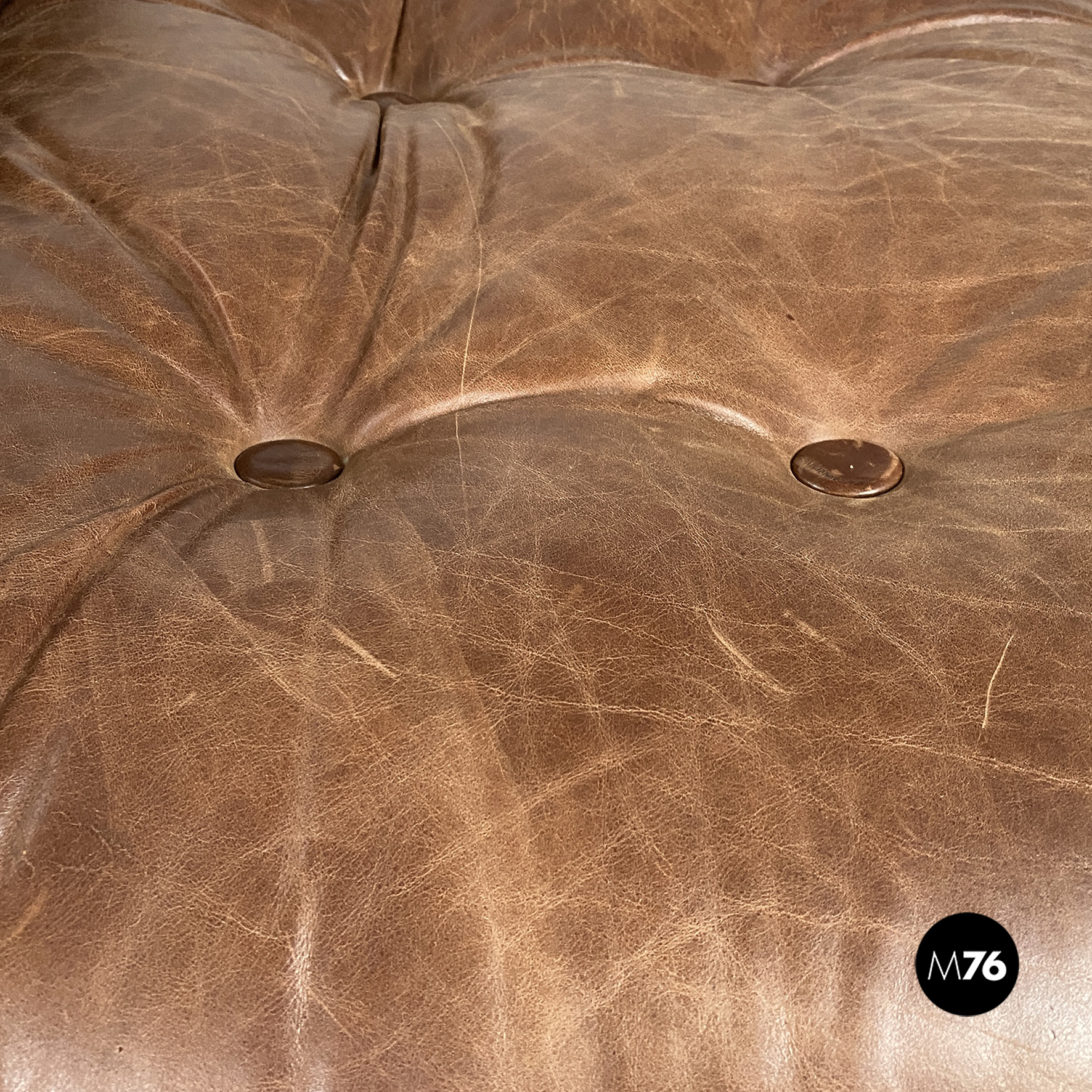 Divano modello Soriana a due posti con imbottitura contenuta da elementi in tondino di acciaio cromato e rivestimento in pelle marrone. Bottoni presenti sulla seduta e sullo schienale.