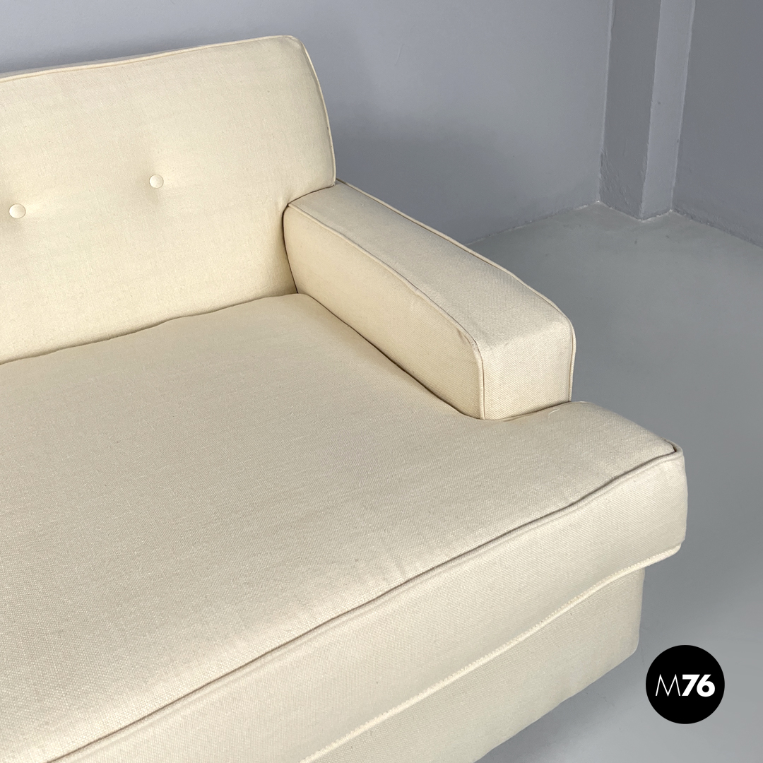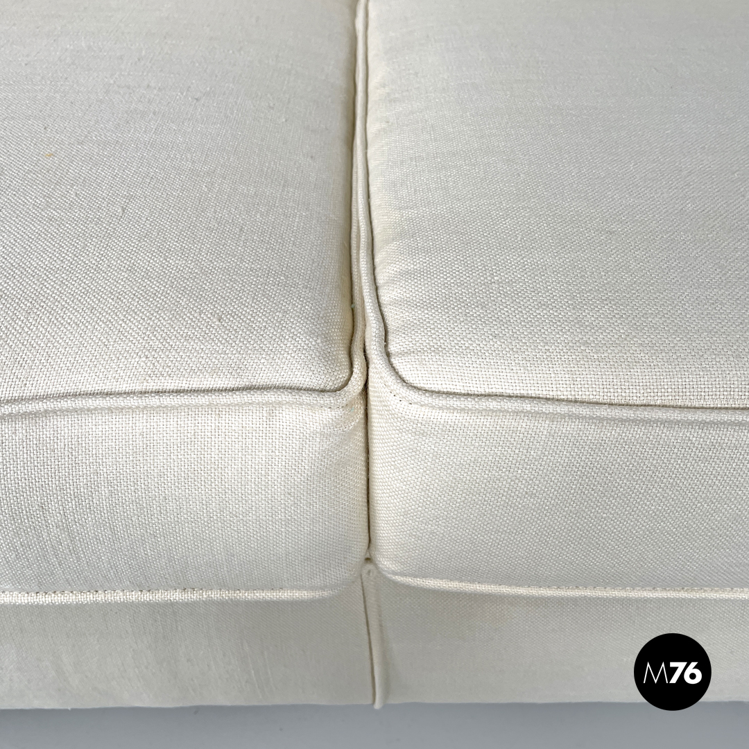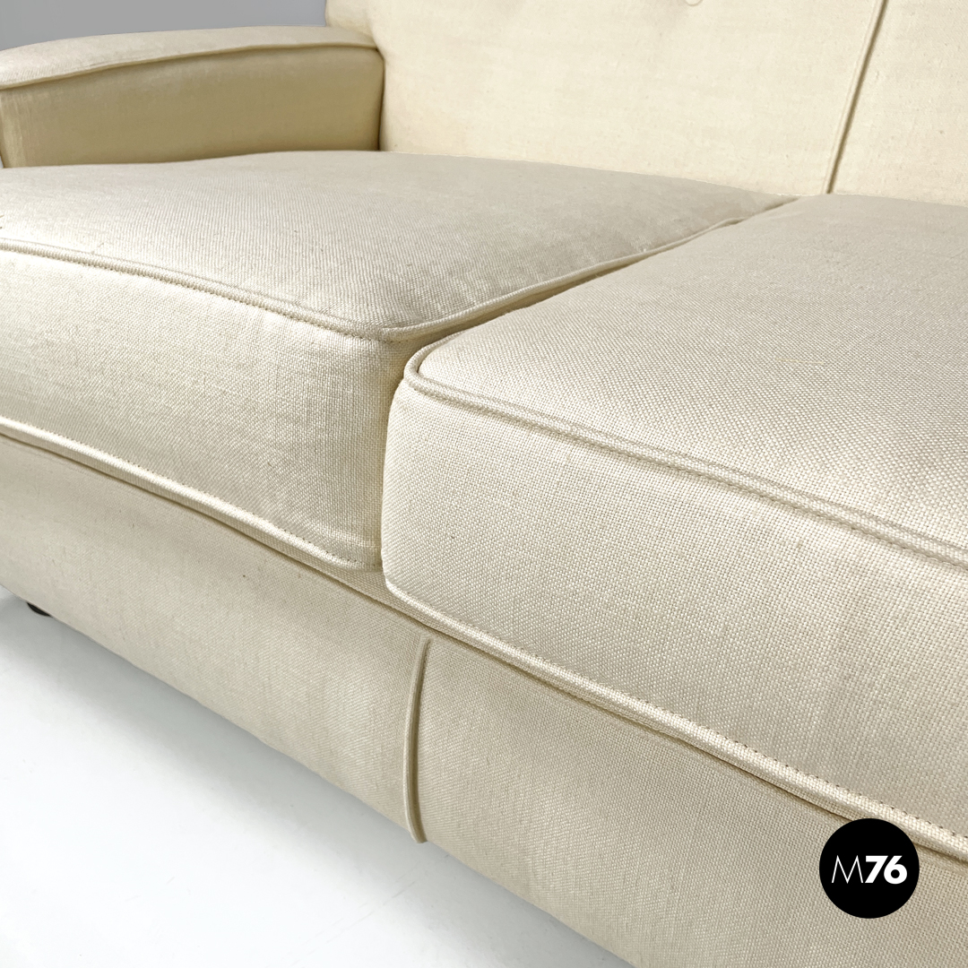 Divano a tre posti modello Square rivestito con tessuto di lino bianco panna. Lo schienale presenta due bottoni tondi su ciascuna seduta, e così come i braccioli e la seduta, questo divano presenta linee squadrate e regolari. I quattro piedini sono composti da un cilindro in metallo nero con appoggio a terra tondo in legno.