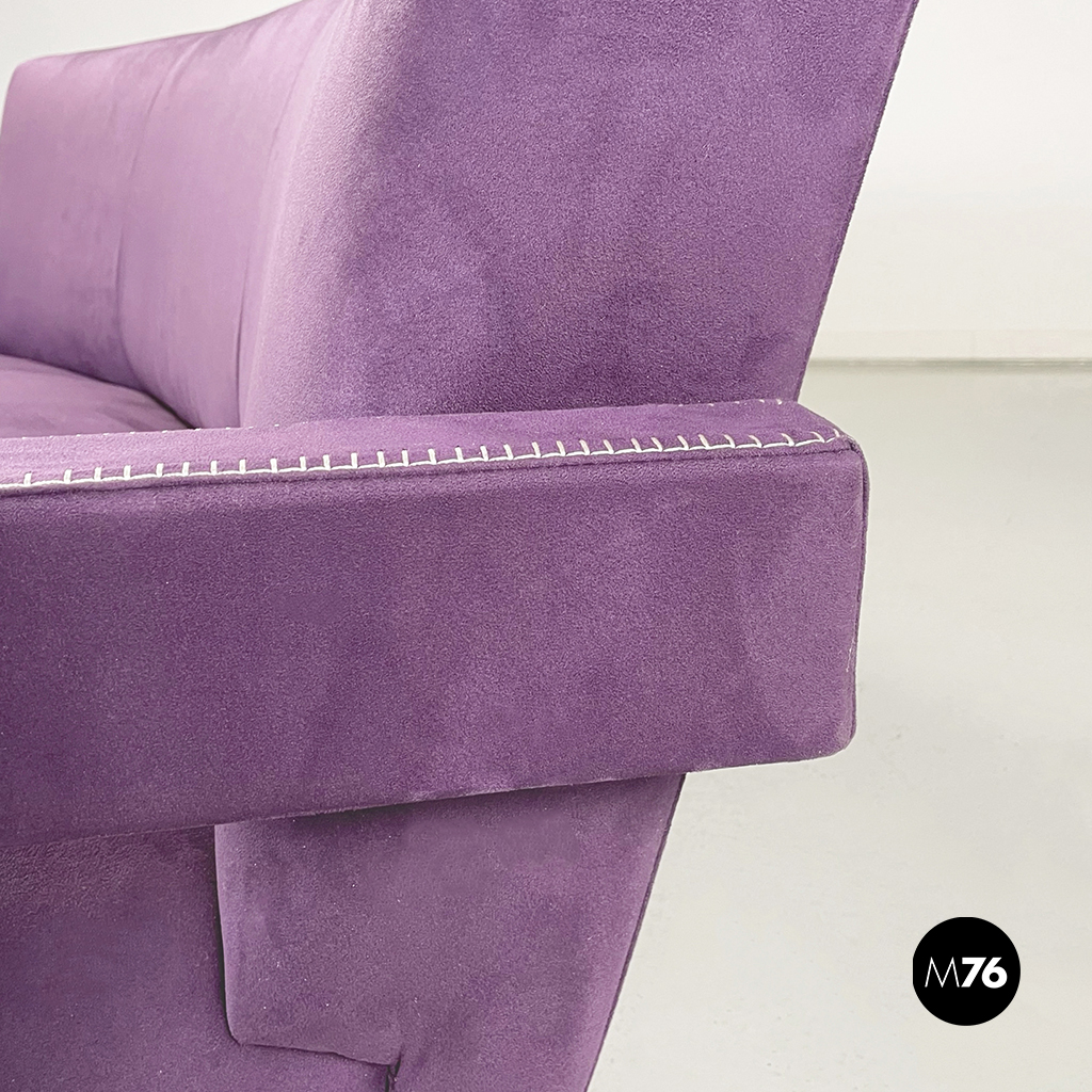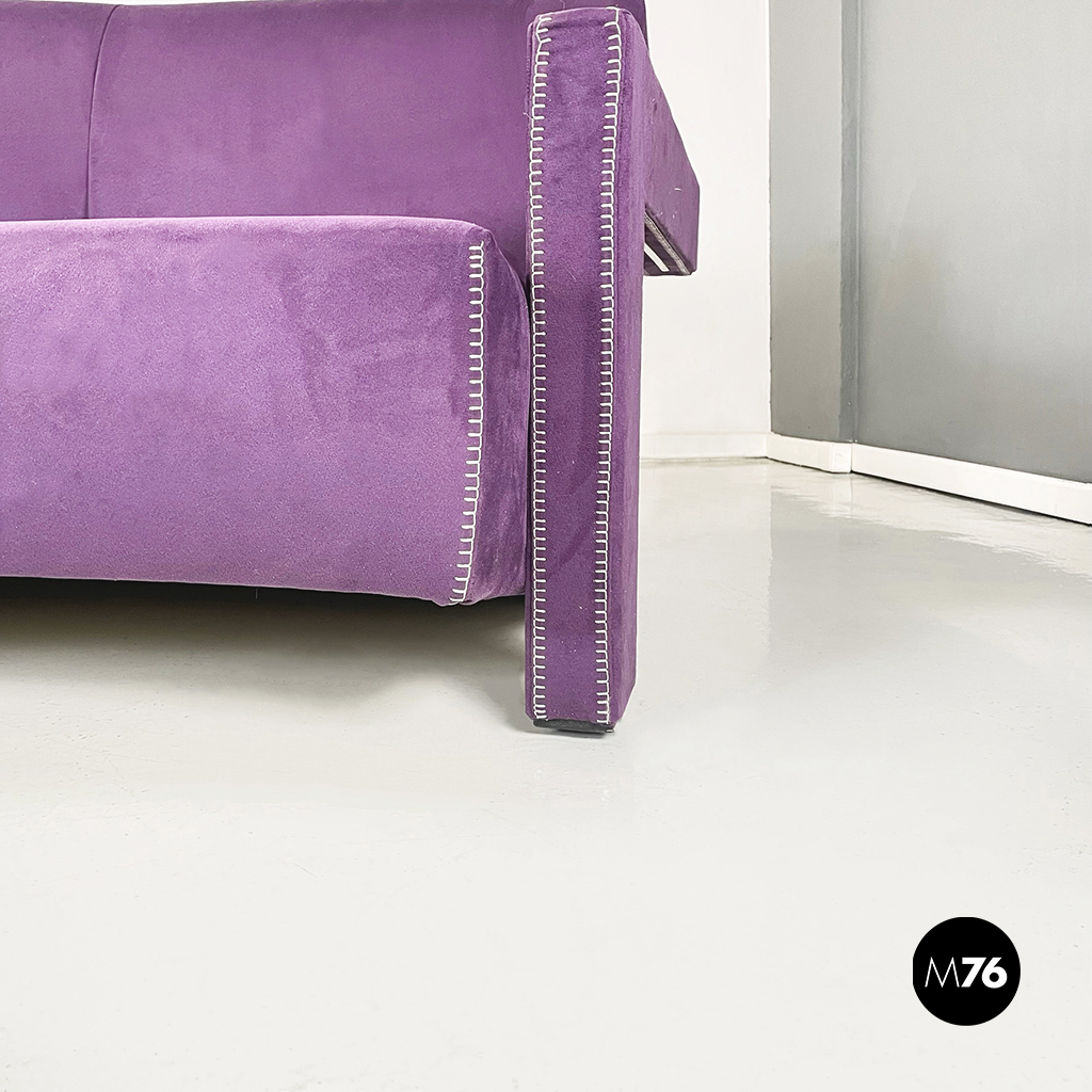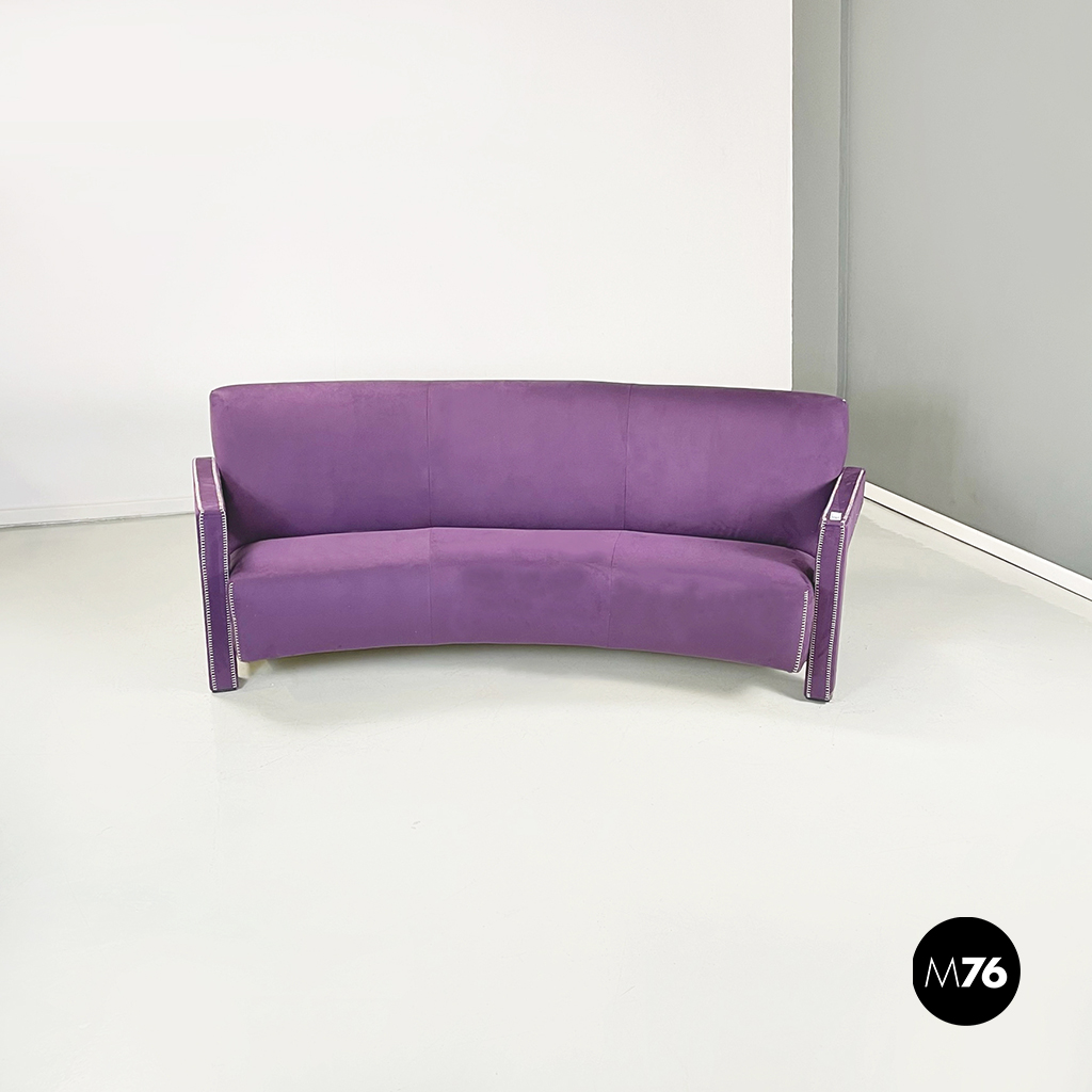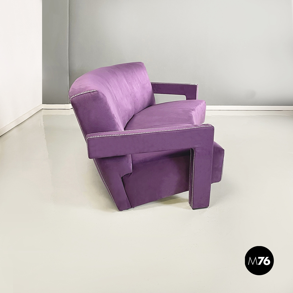 Divano a tre posti modello Utrecht con seduta e schienale curvati, imbottito e rivestito in velluto viola con cuciture bianche a vista. i braccioli squadrati sono rivestiti in velluto viola.