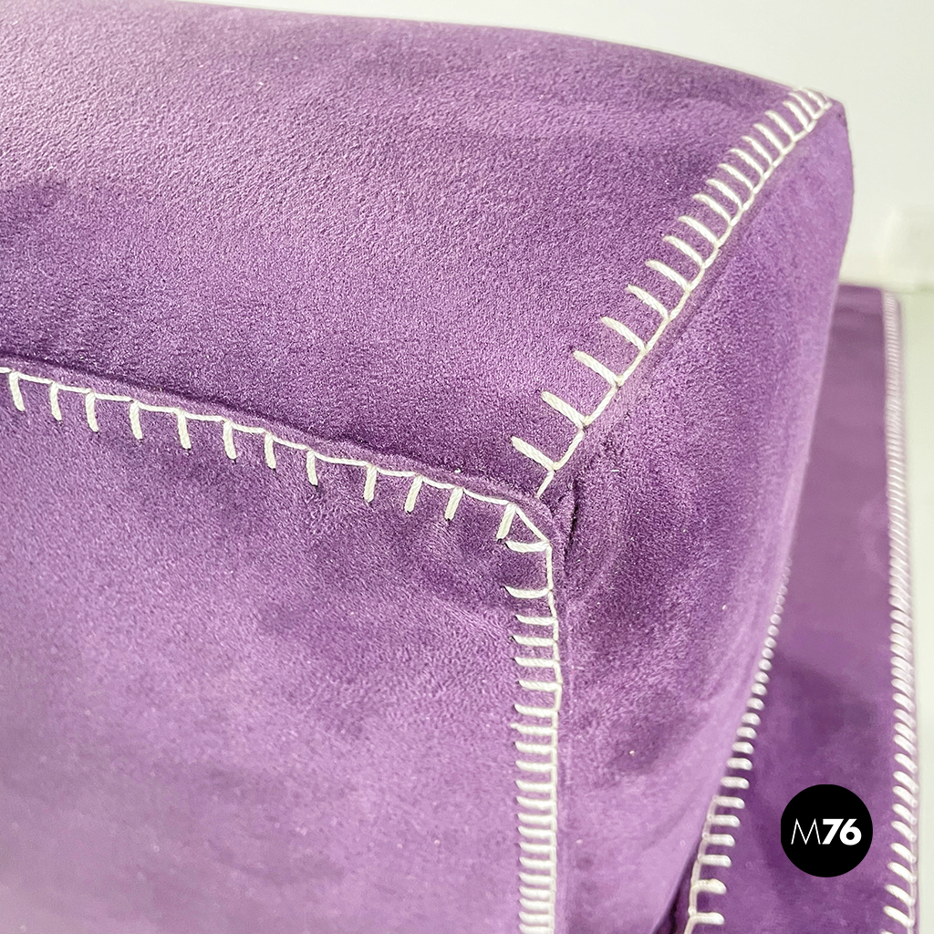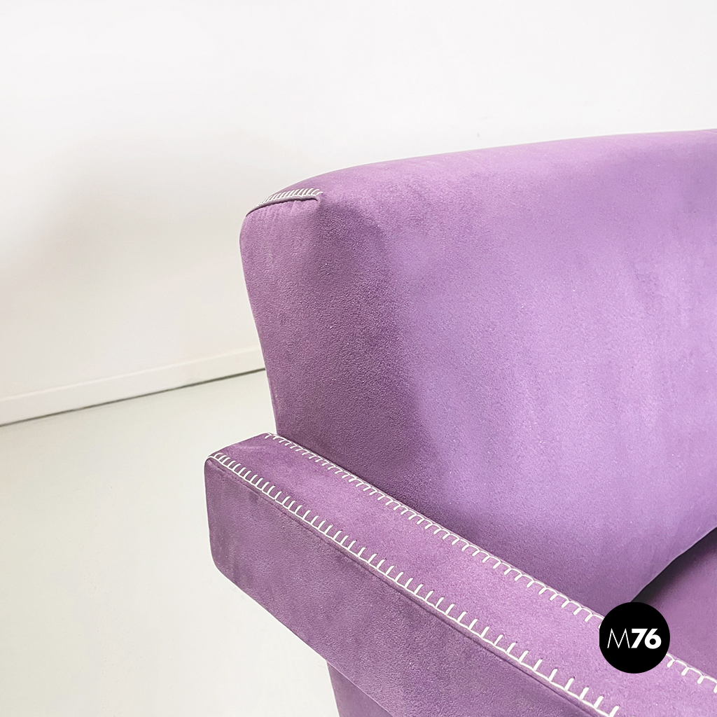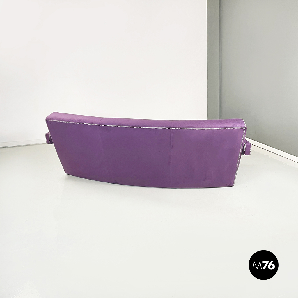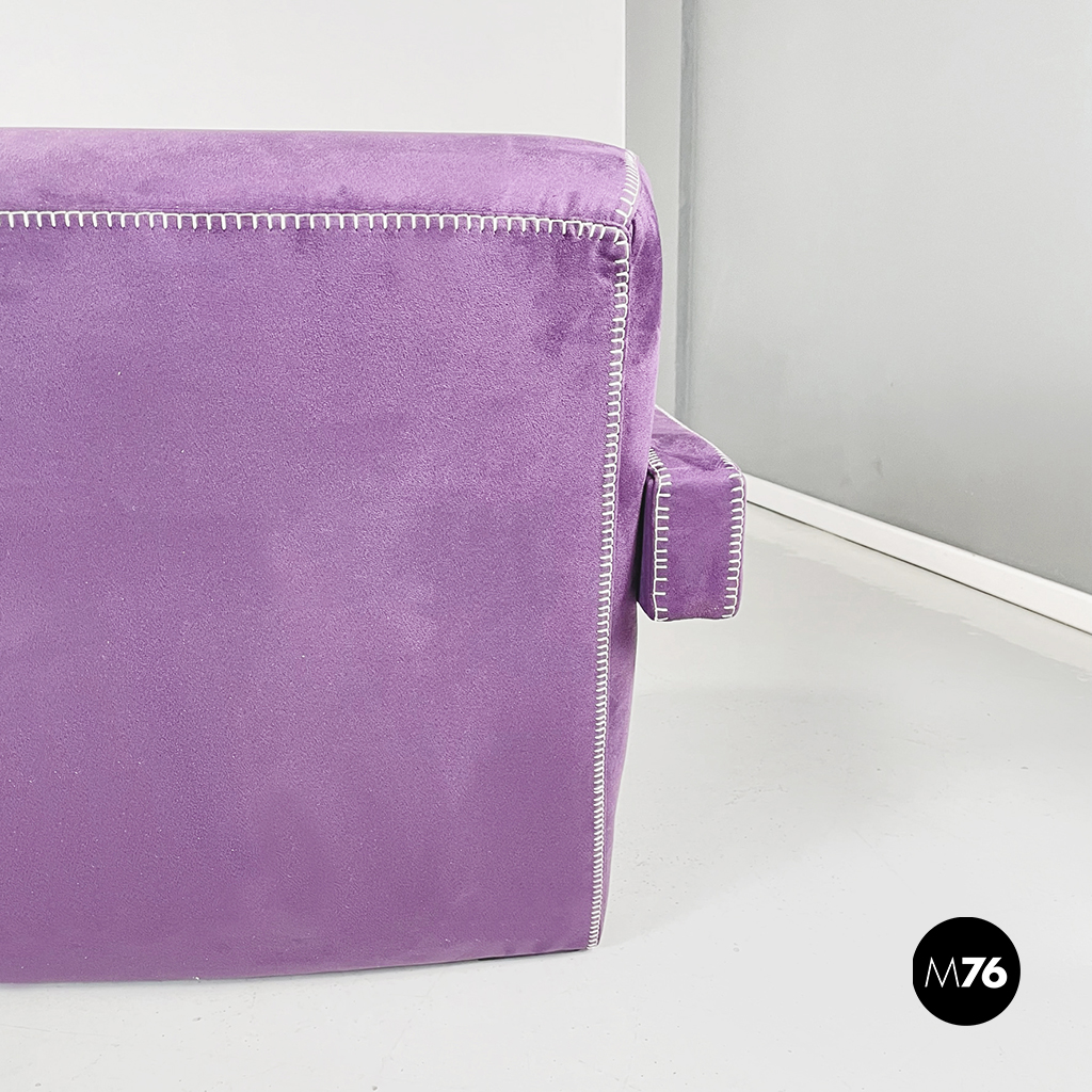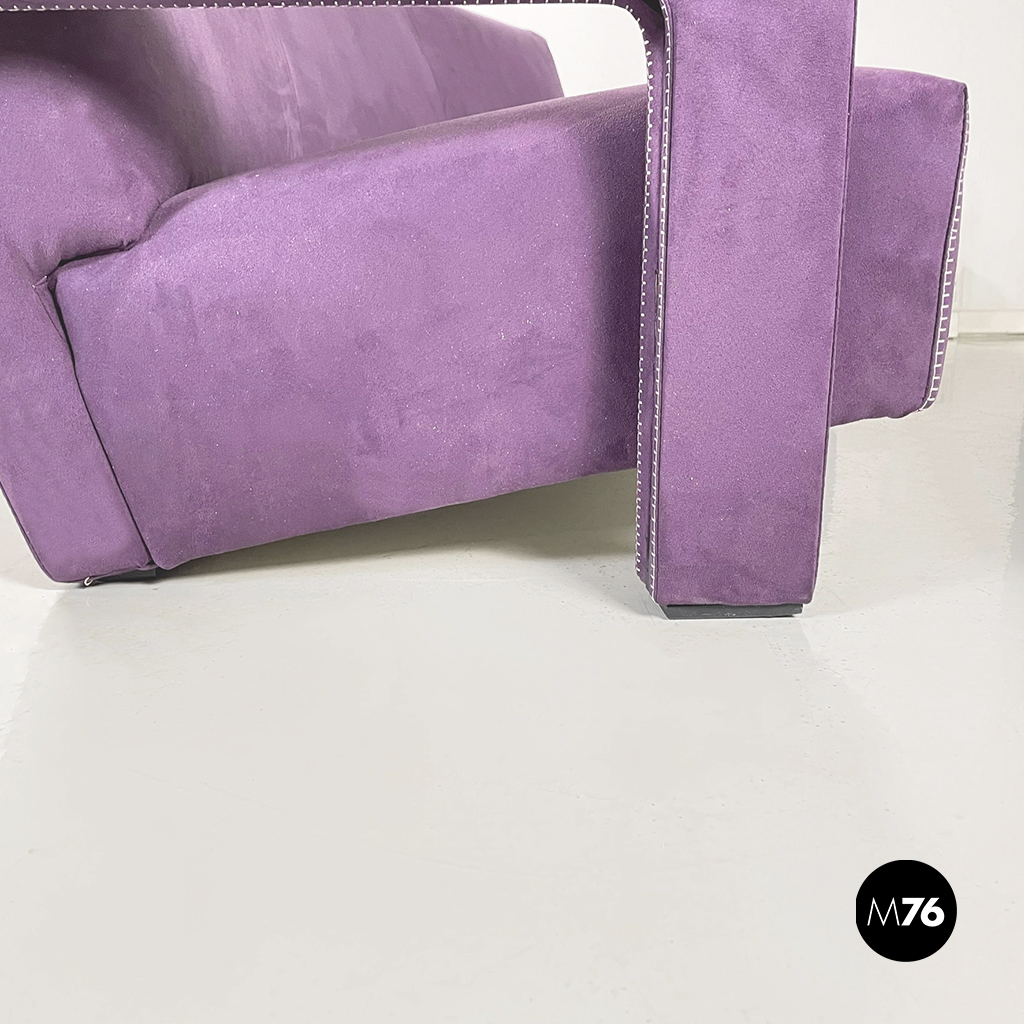 Divano a tre posti modello Utrecht con seduta e schienale curvati, imbottito e rivestito in velluto viola con cuciture bianche a vista. i braccioli squadrati sono rivestiti in velluto viola.