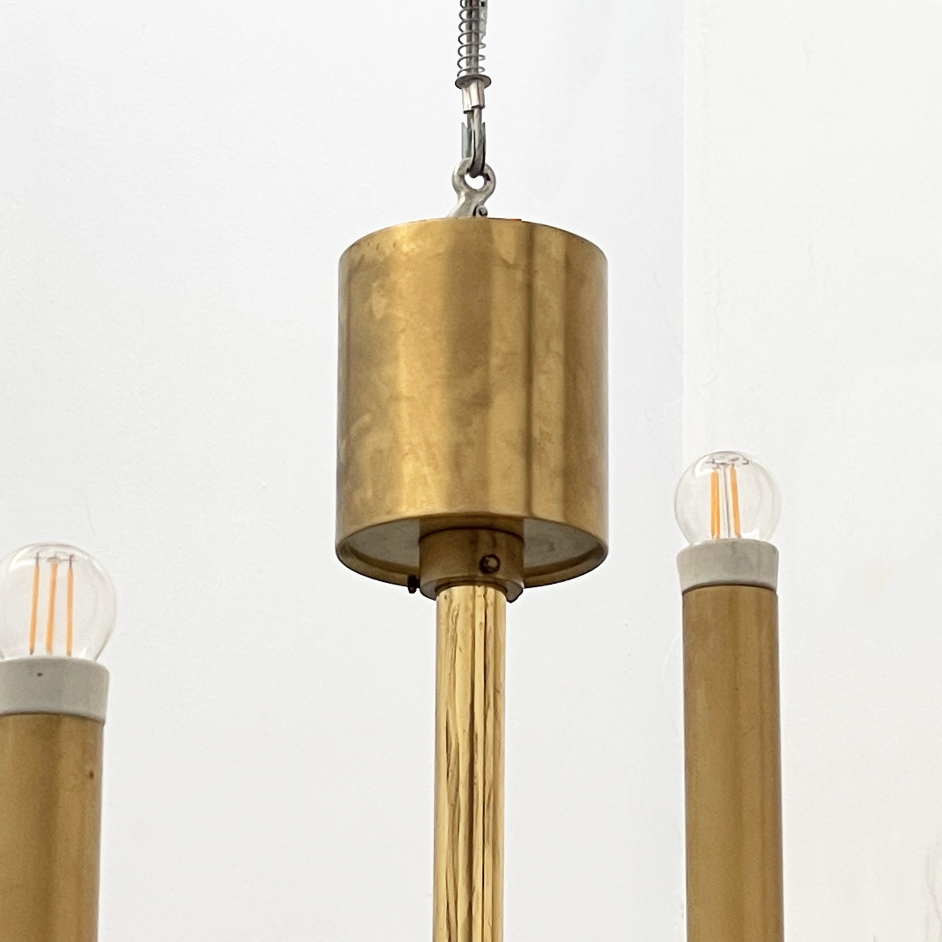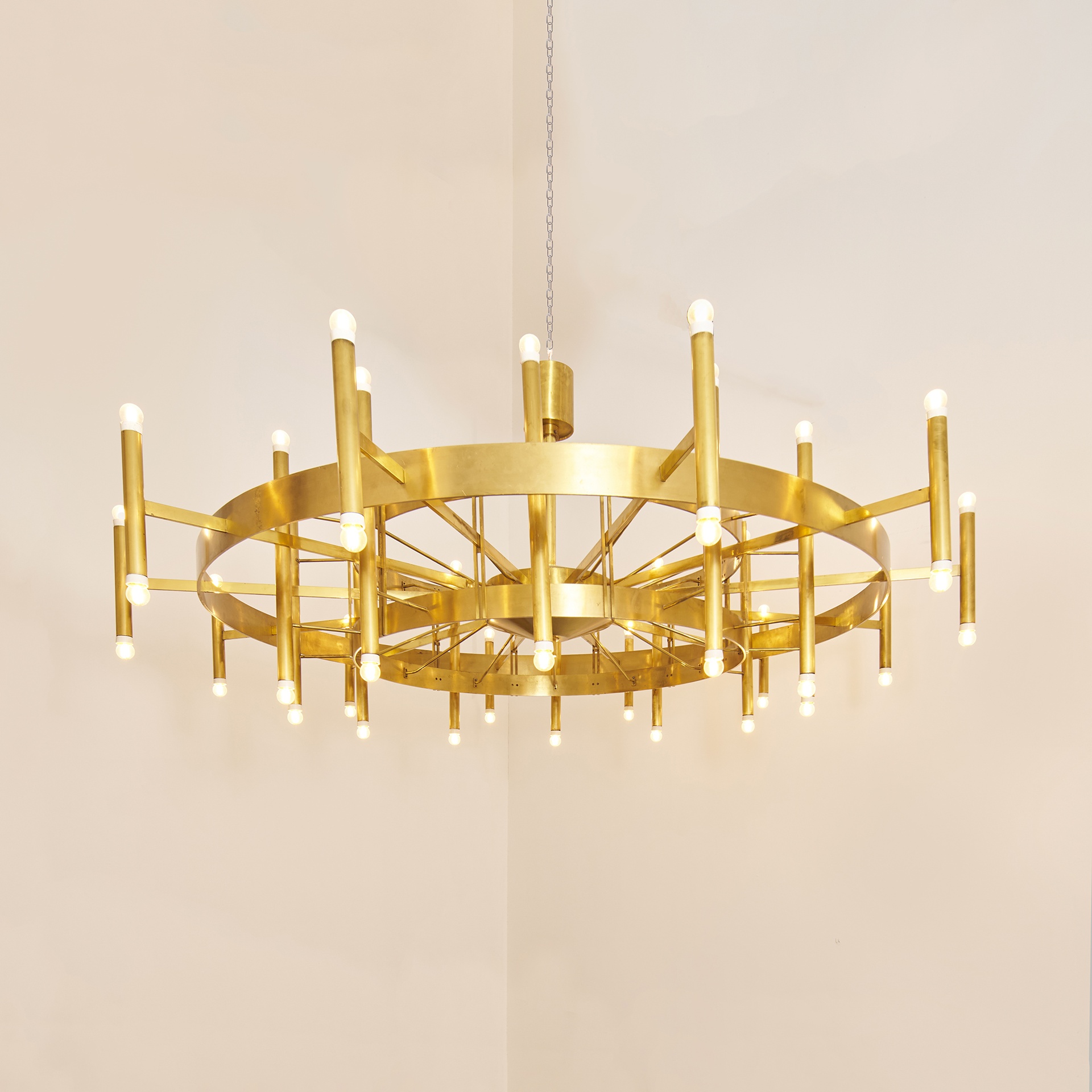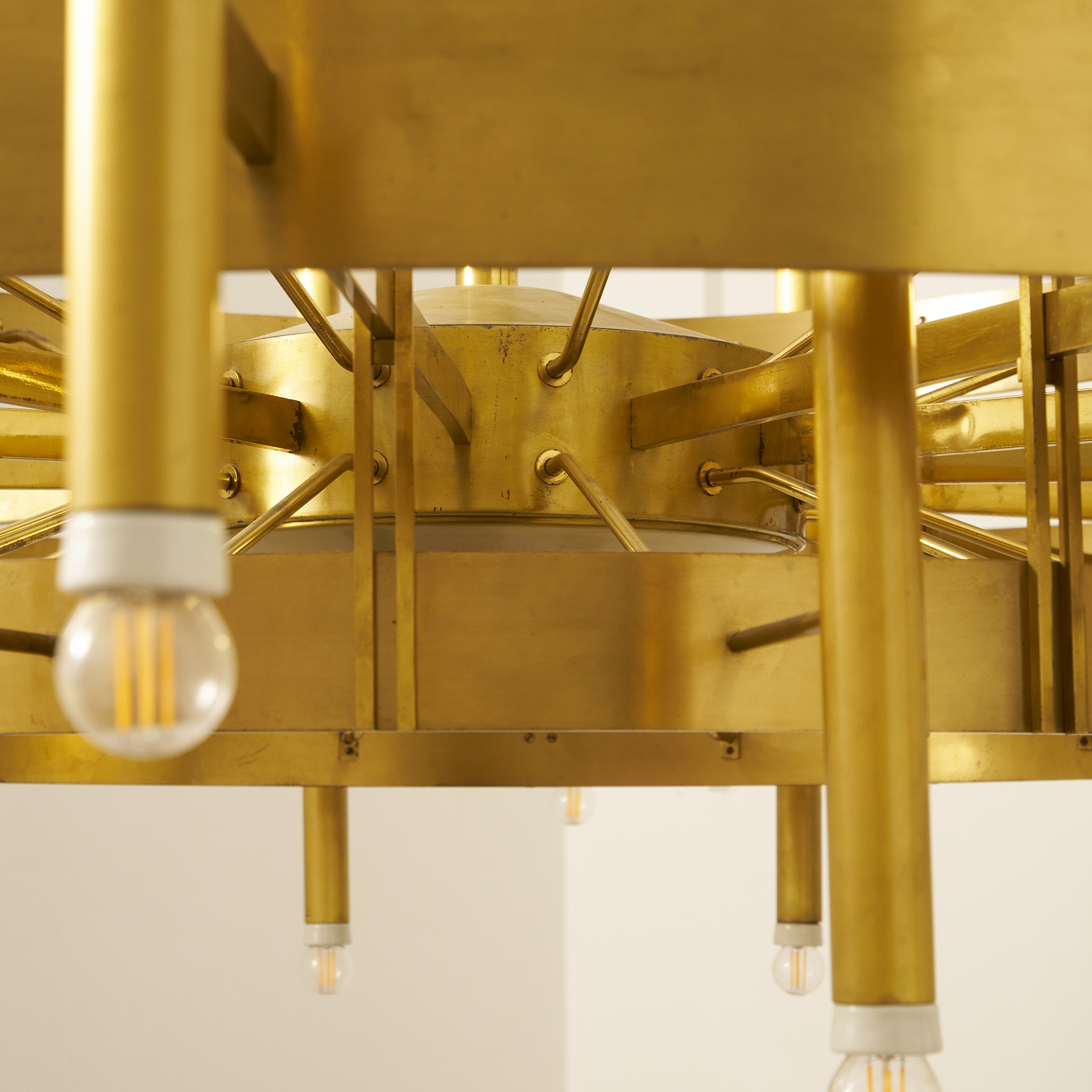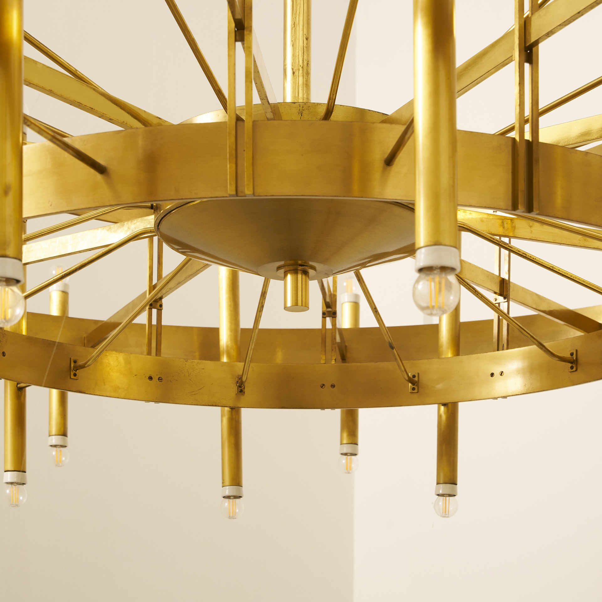 Lampadario di enormi dimensioni in ottone con quarantotto punti luce. La struttura centrale tonda si collega a due anelli concentrici attraverso dei listelli e tondini in ottone. I porta-lampadina cilindrici sono disposti intorno agli anelli.