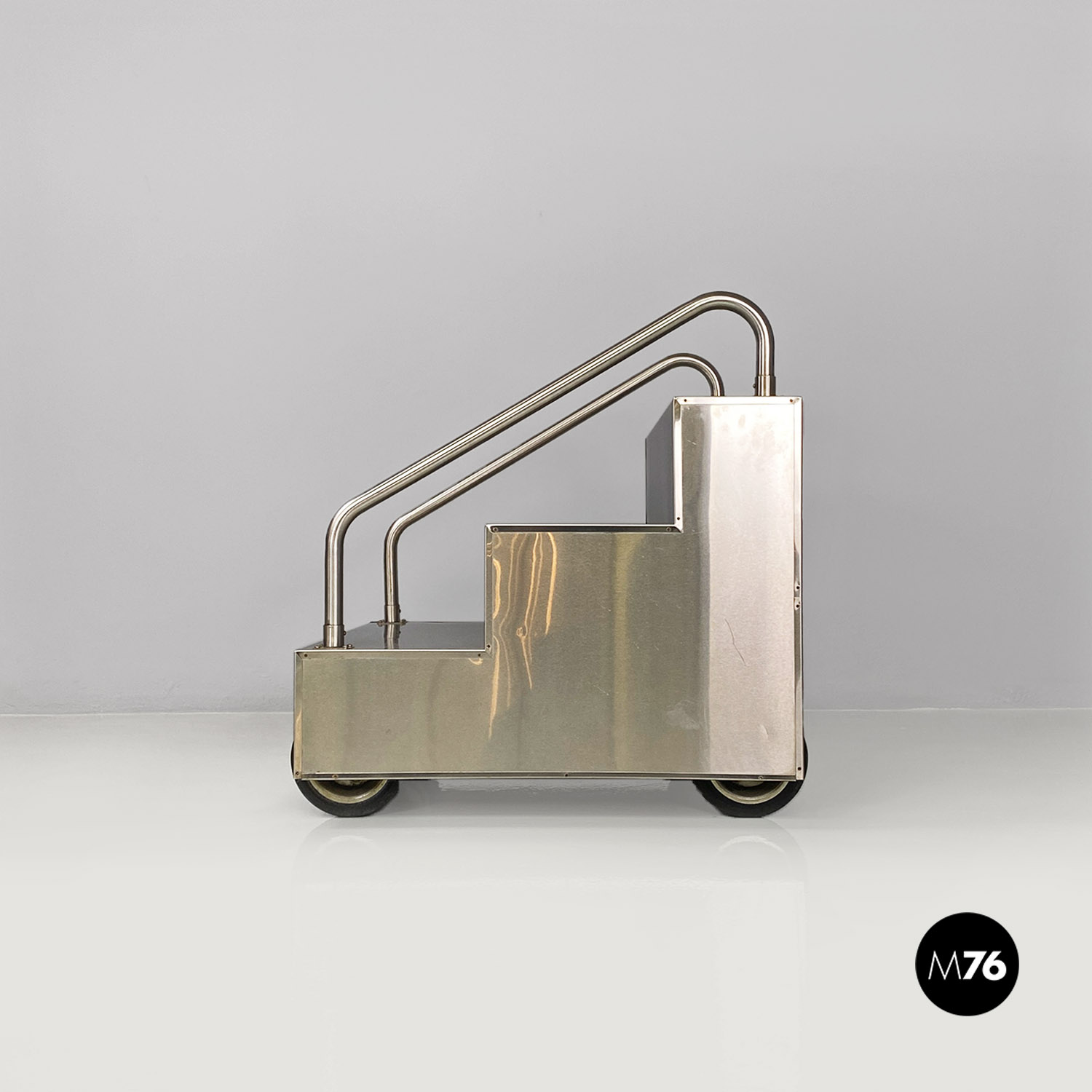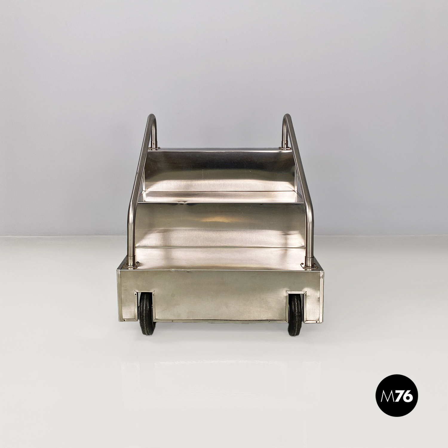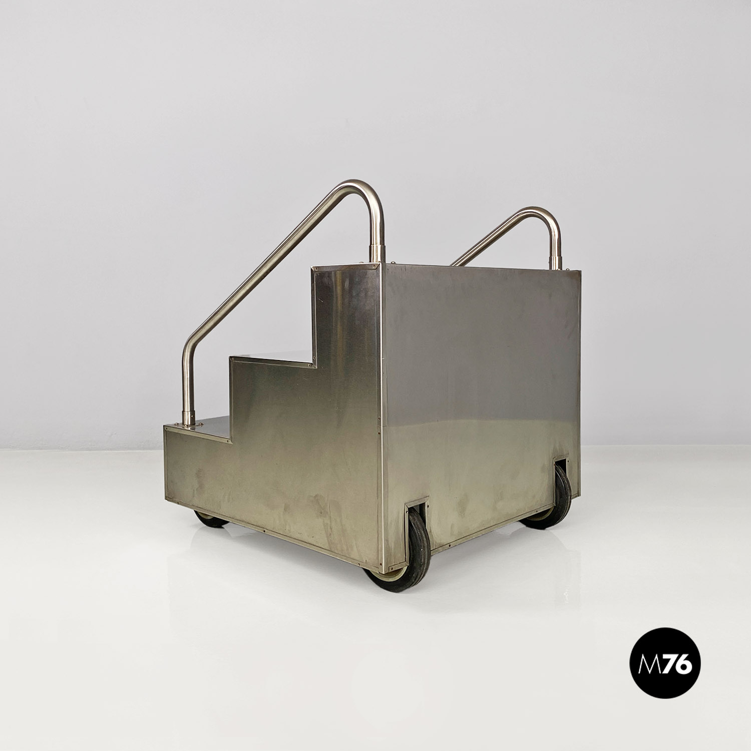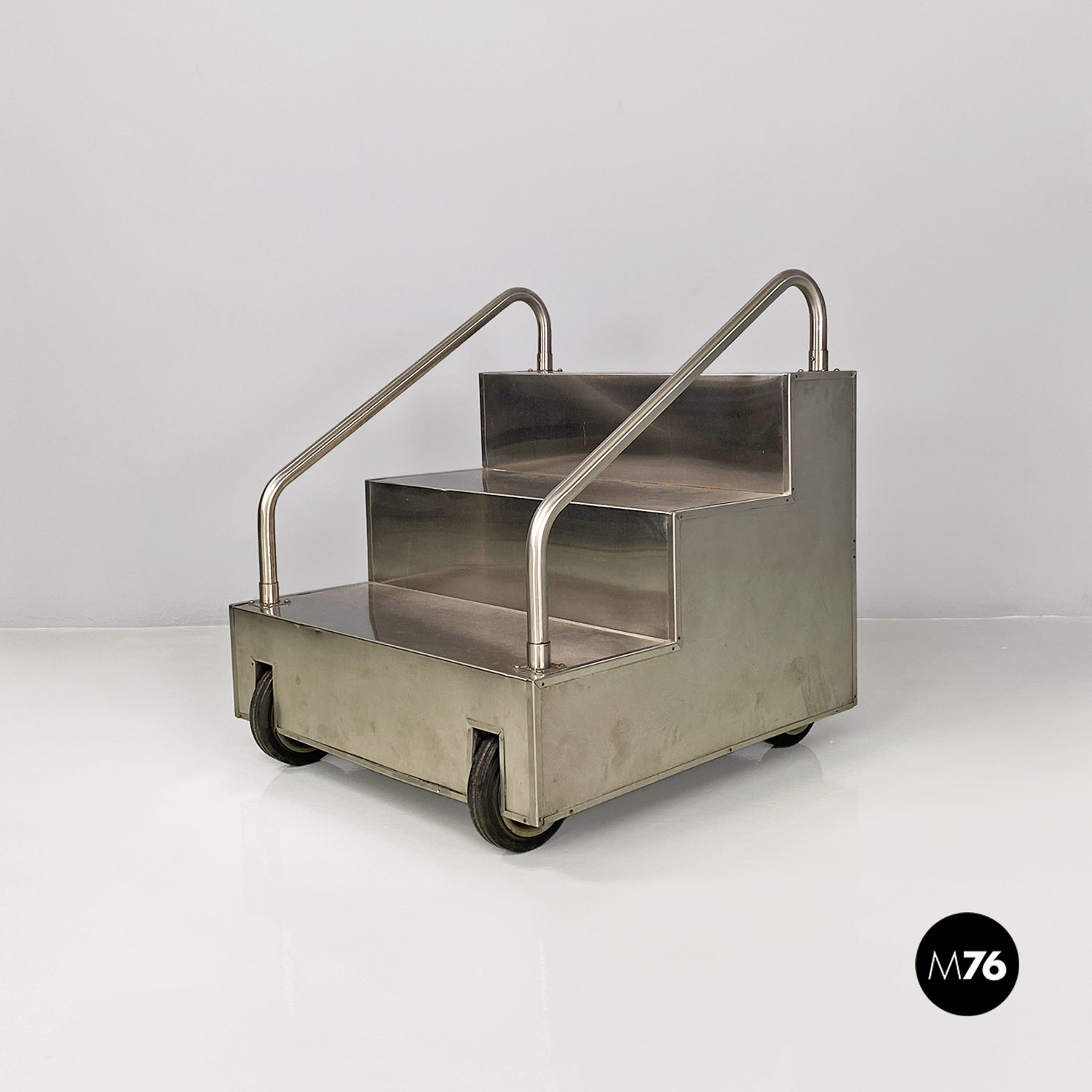 Mobile espositore con forma a scala su ruote, con struttura in legno rivestita in acciaio, con corrimano e ruote in gomma.
