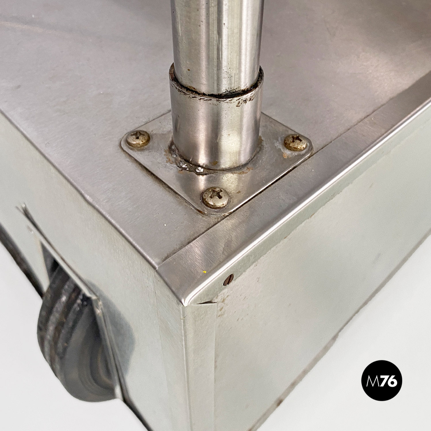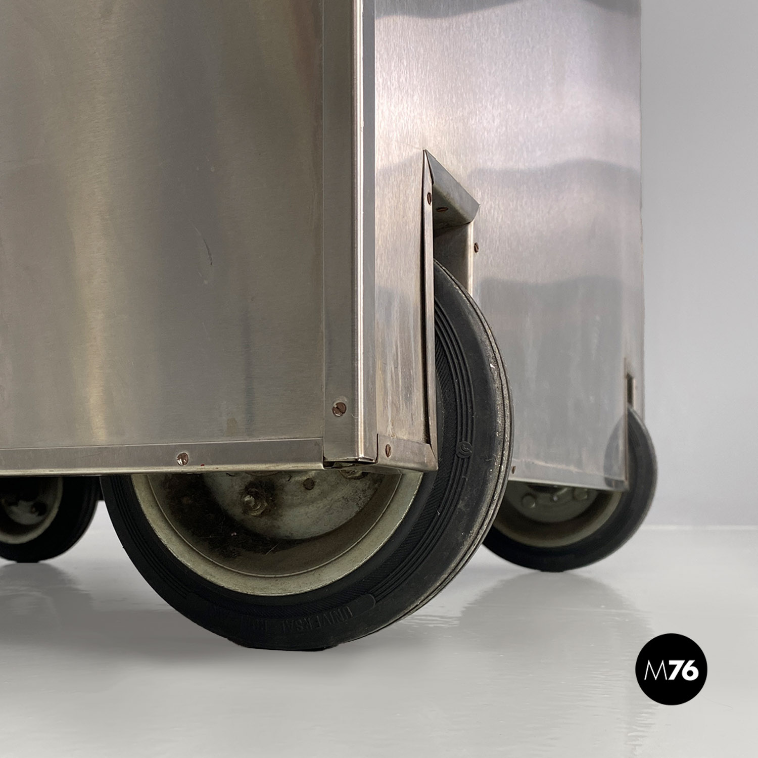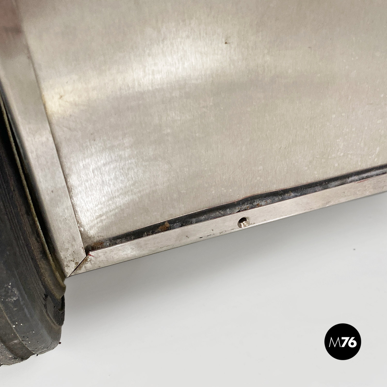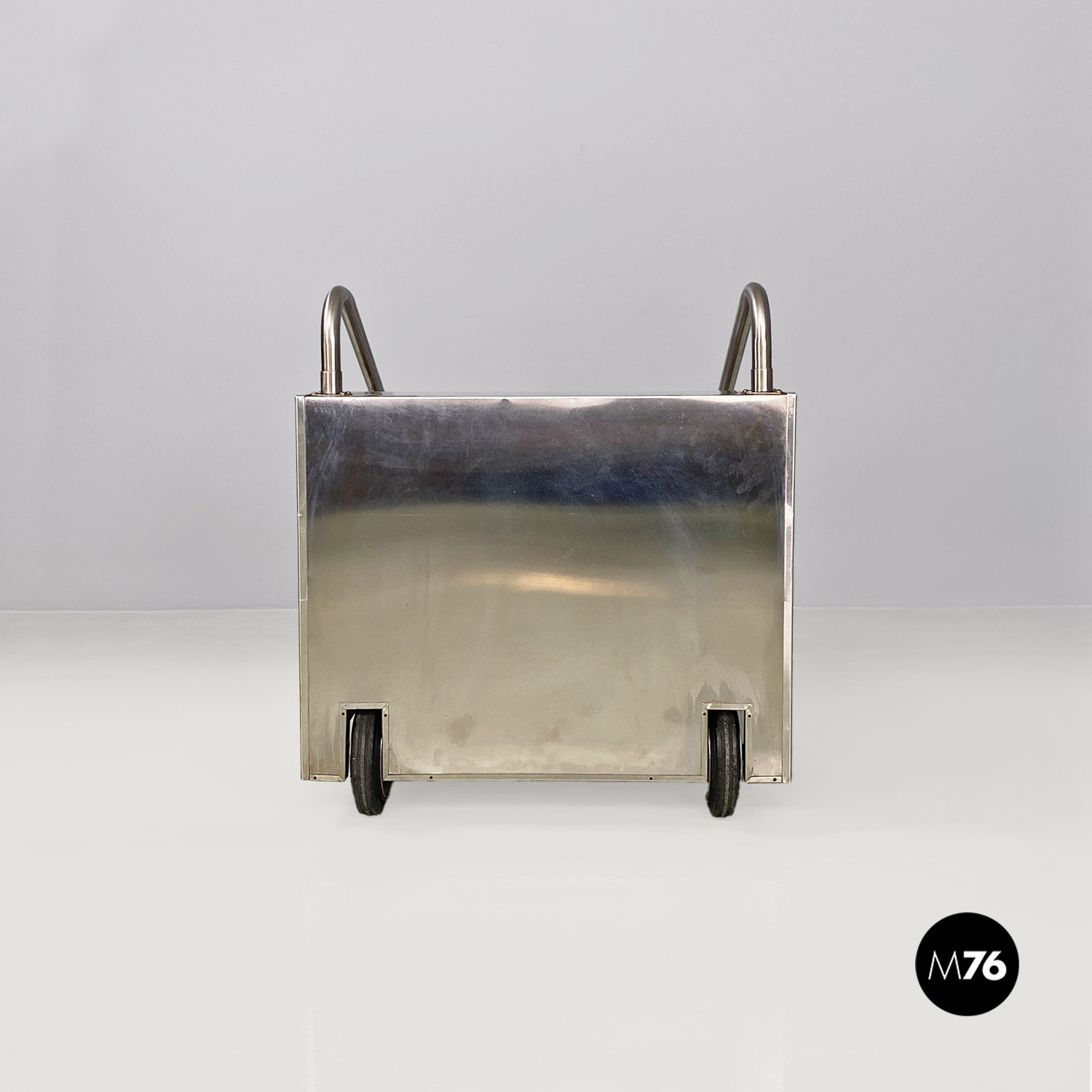 Mobile espositore con forma a scala su ruote, con struttura in legno rivestita in acciaio, con corrimano e ruote in gomma.