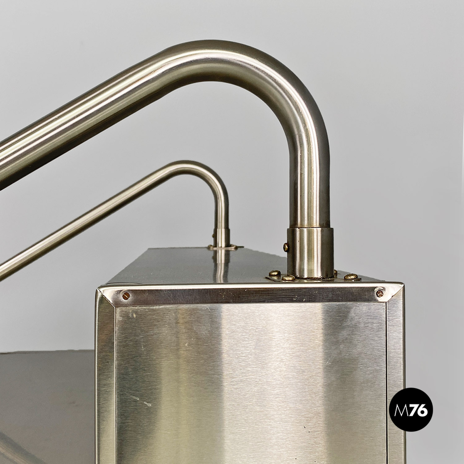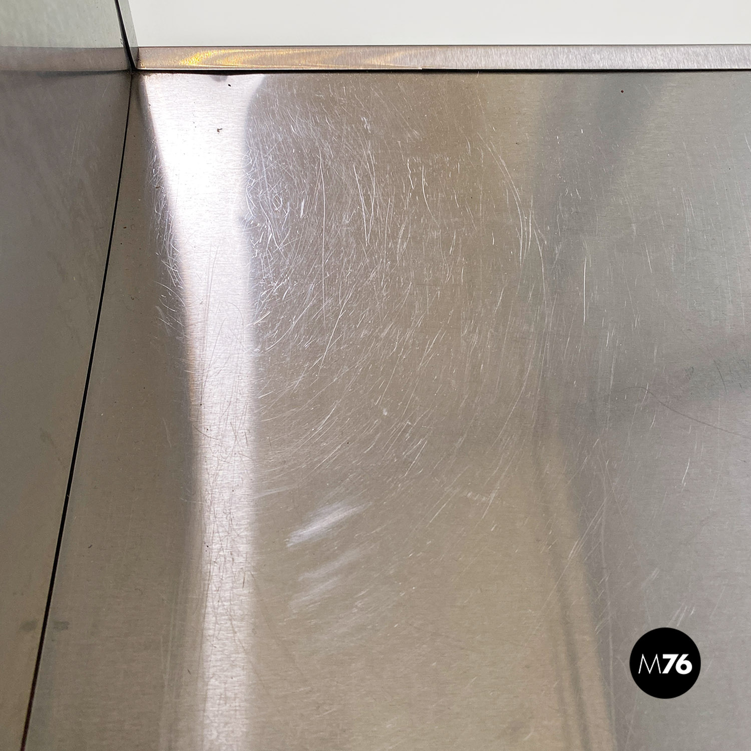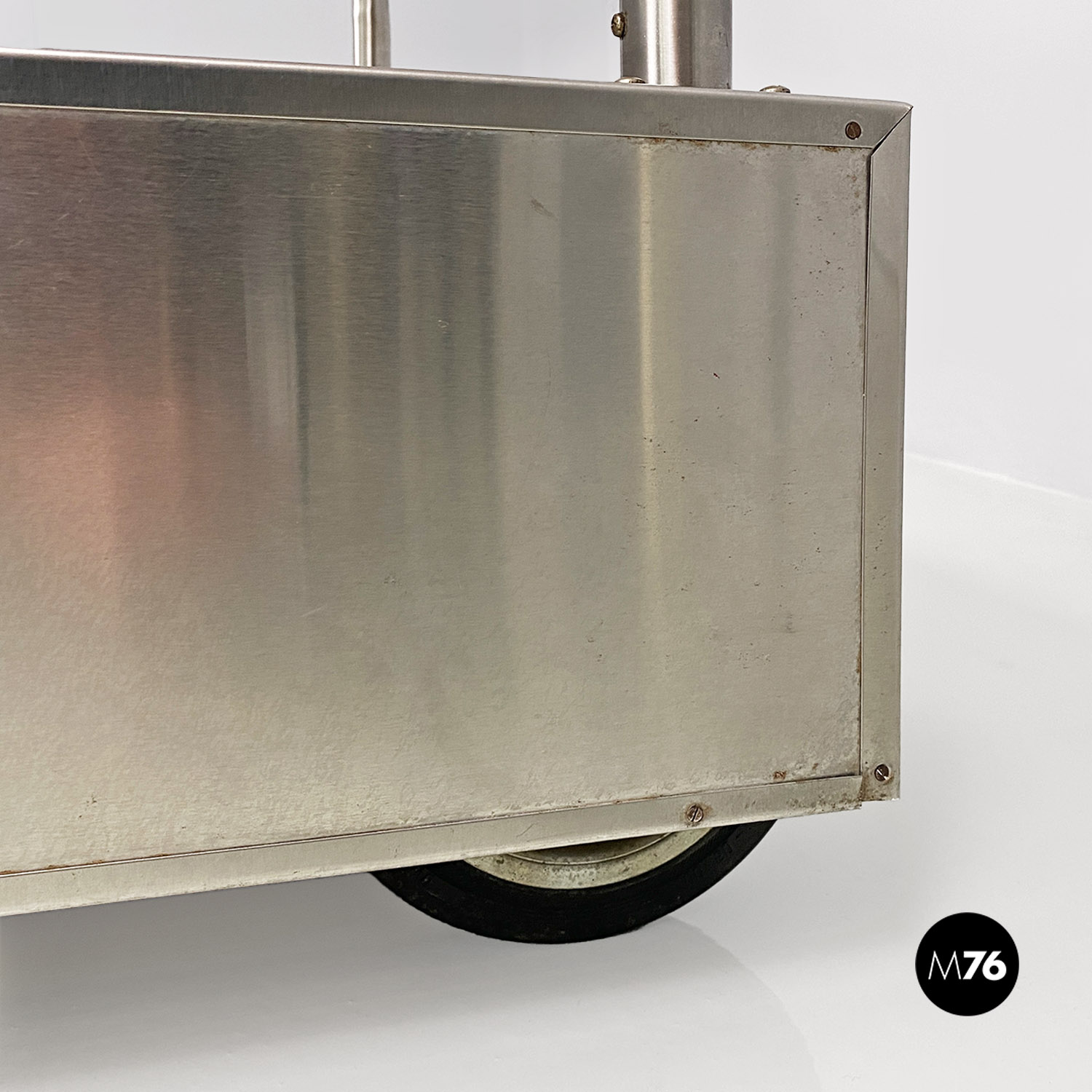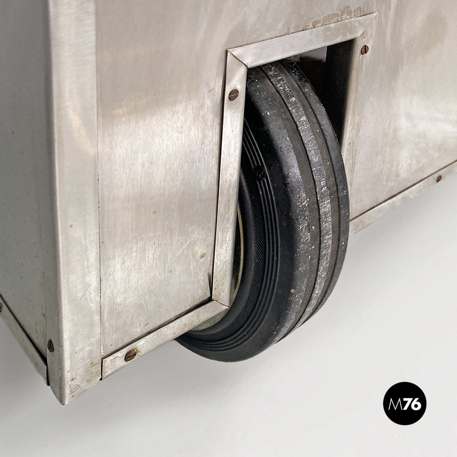 Mobile espositore con forma a scala su ruote, con struttura in legno rivestita in acciaio, con corrimano e ruote in gomma.