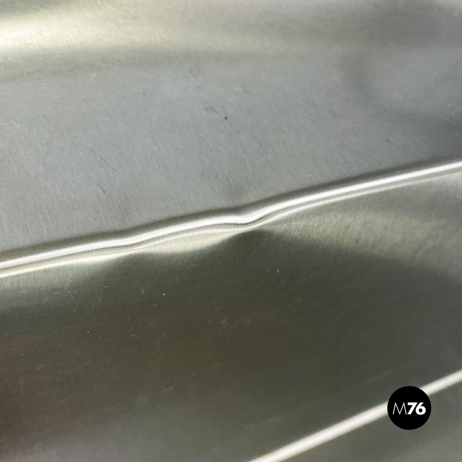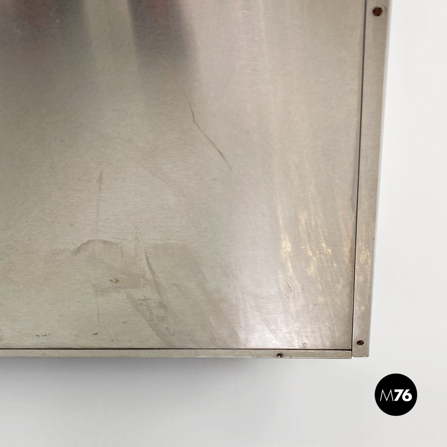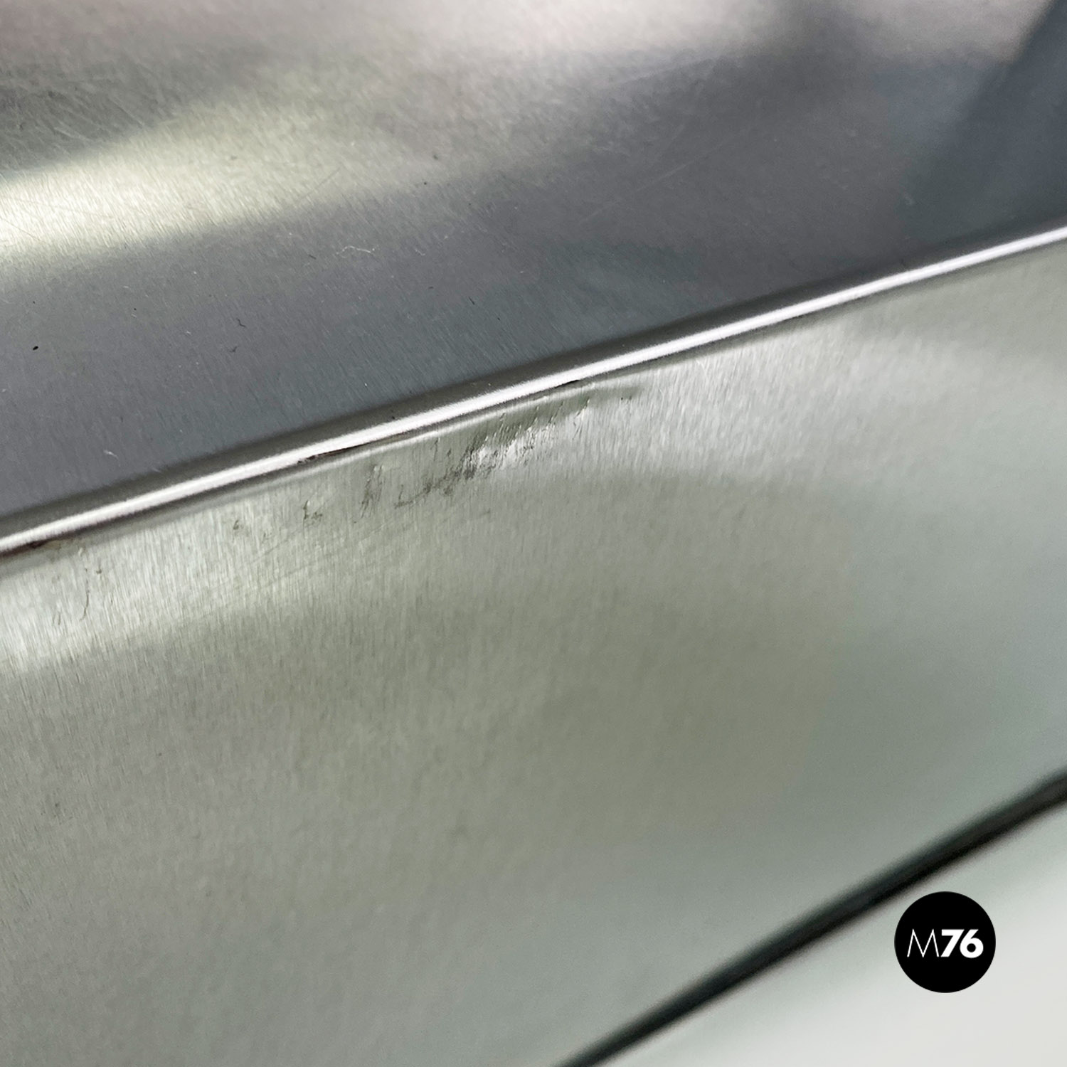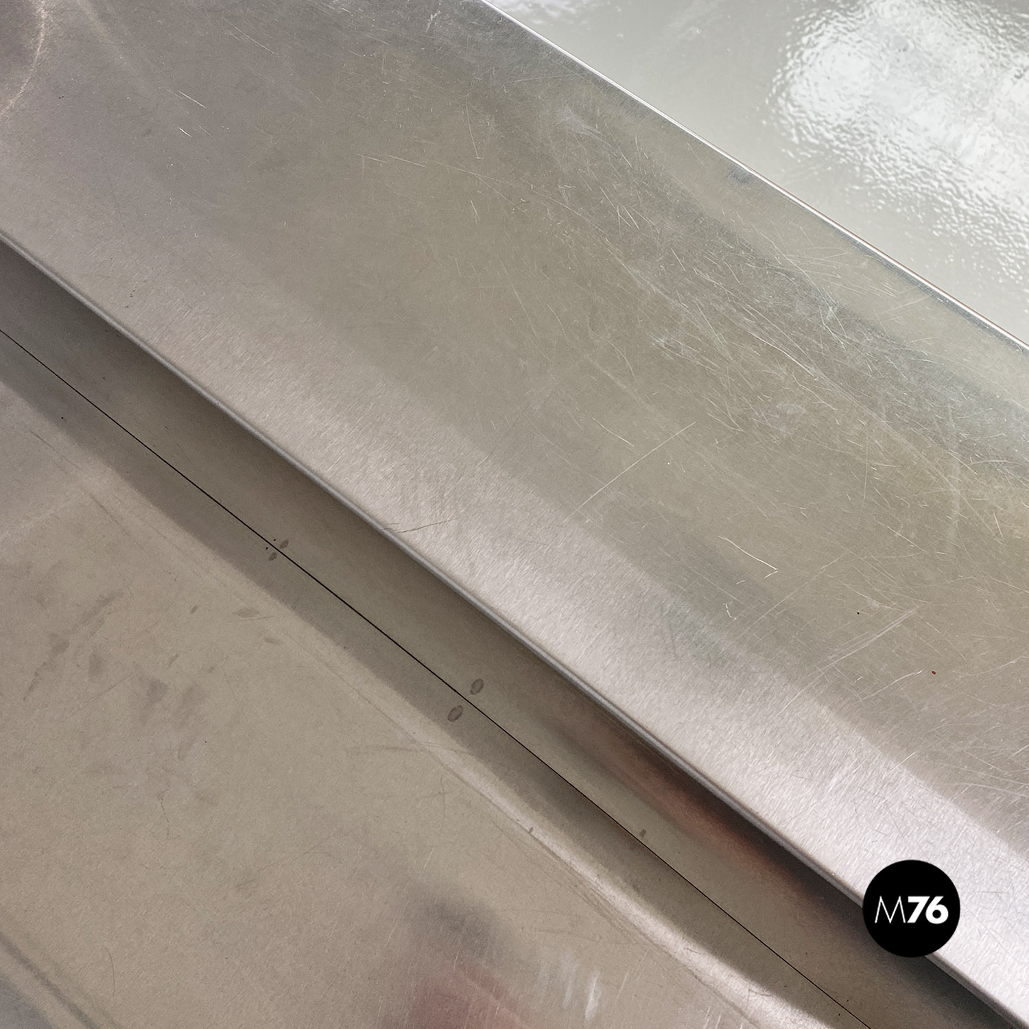 Mobile espositore con forma a scala su ruote, con struttura in legno rivestita in acciaio, con corrimano e ruote in gomma.