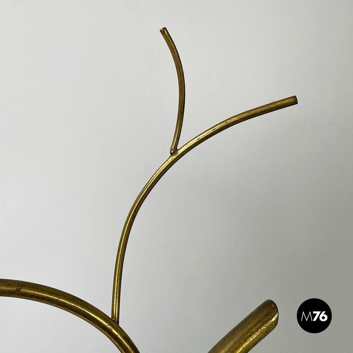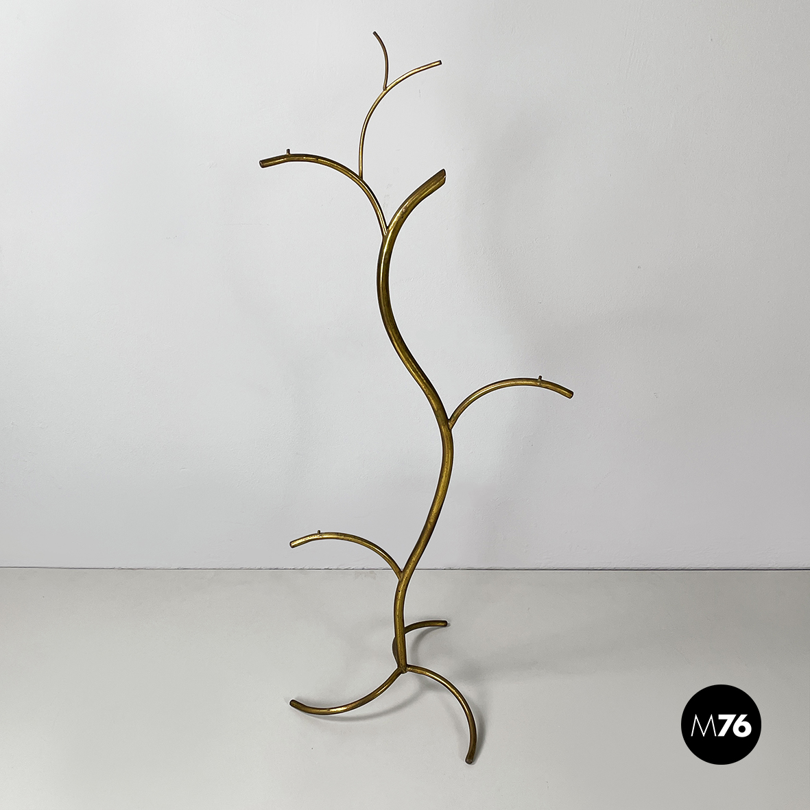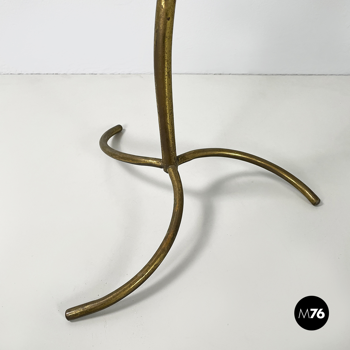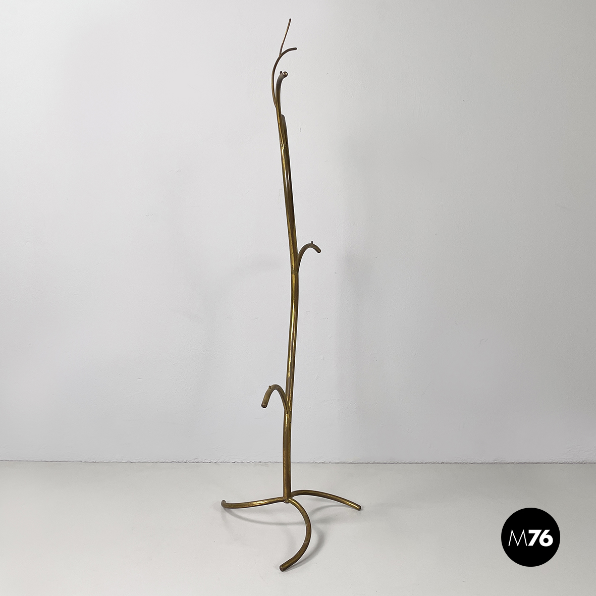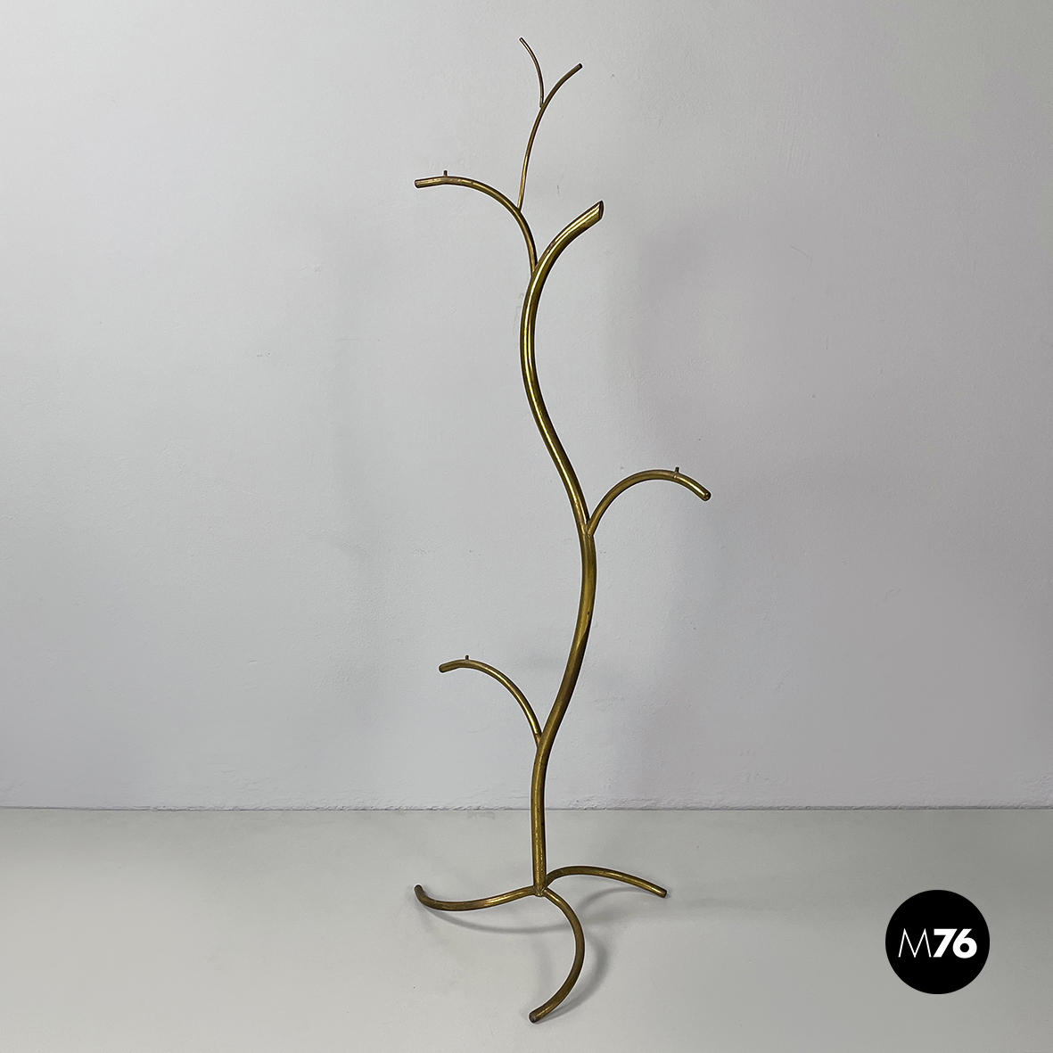 Espositore da terra con struttura in tondino di ottone. Base a tre zampe in tondino di ottone. Utilizzabile anche come piccolo appendino per cappelli.