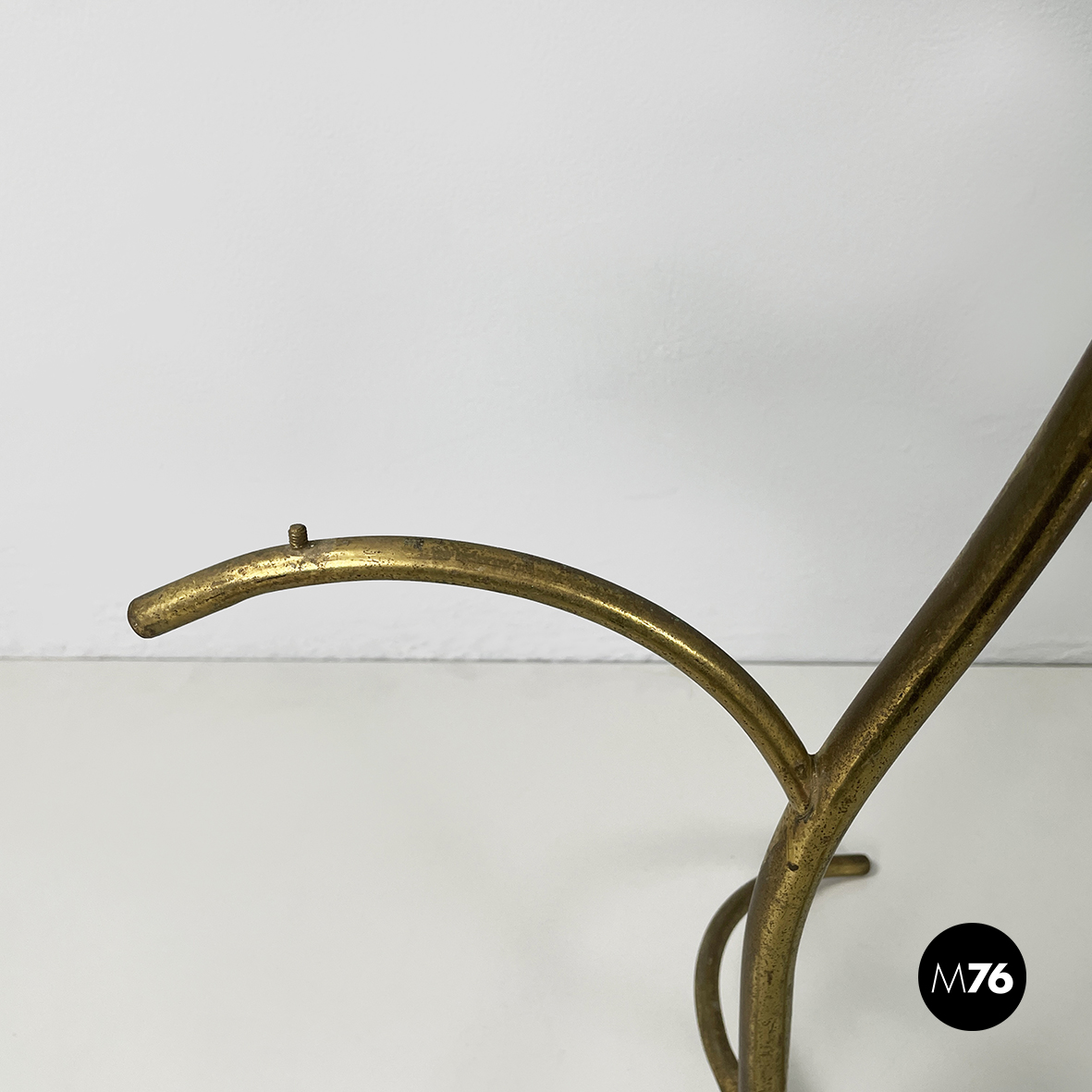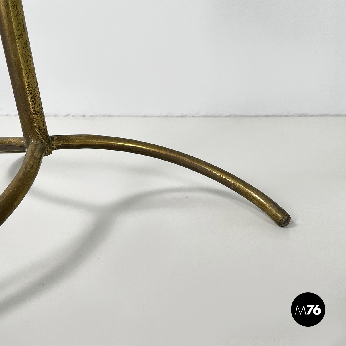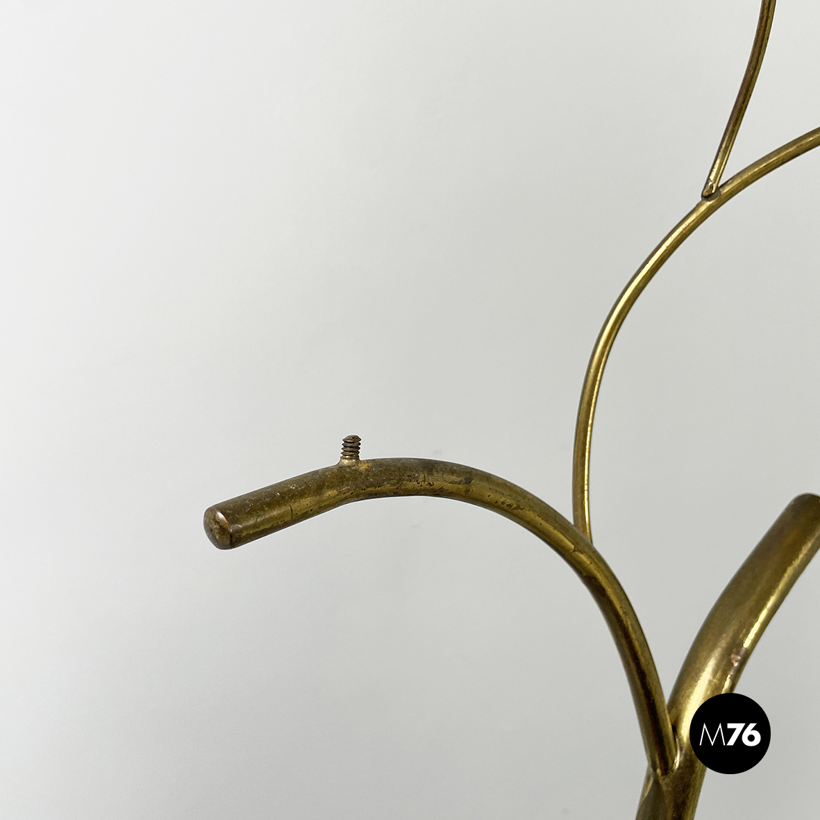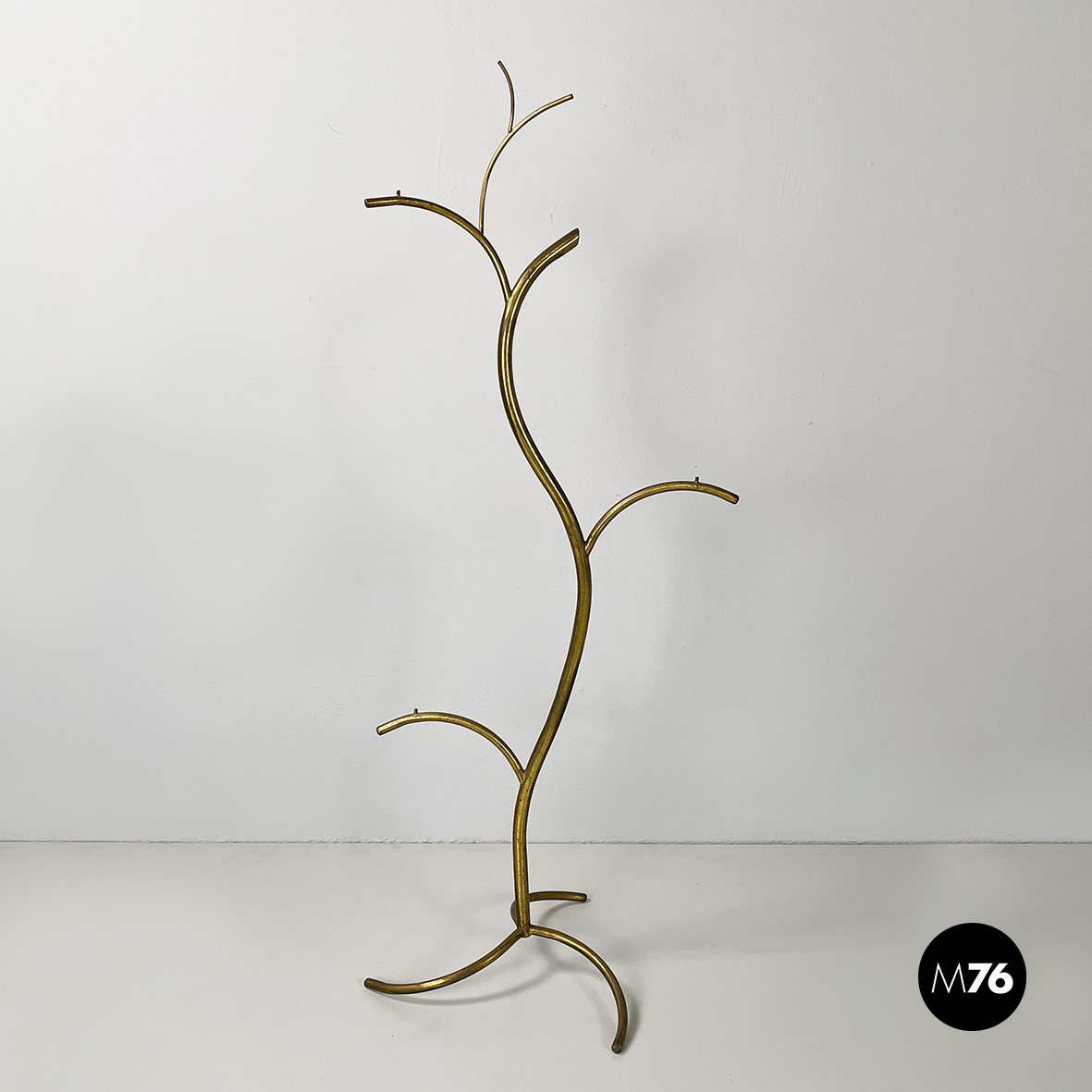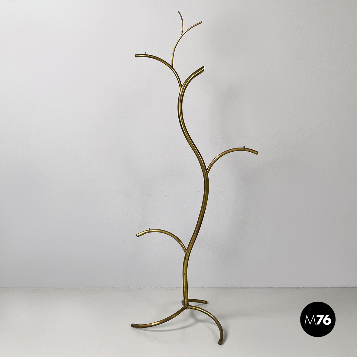 Espositore da terra con struttura in tondino di ottone. Base a tre zampe in tondino di ottone. Utilizzabile anche come piccolo appendino per cappelli.