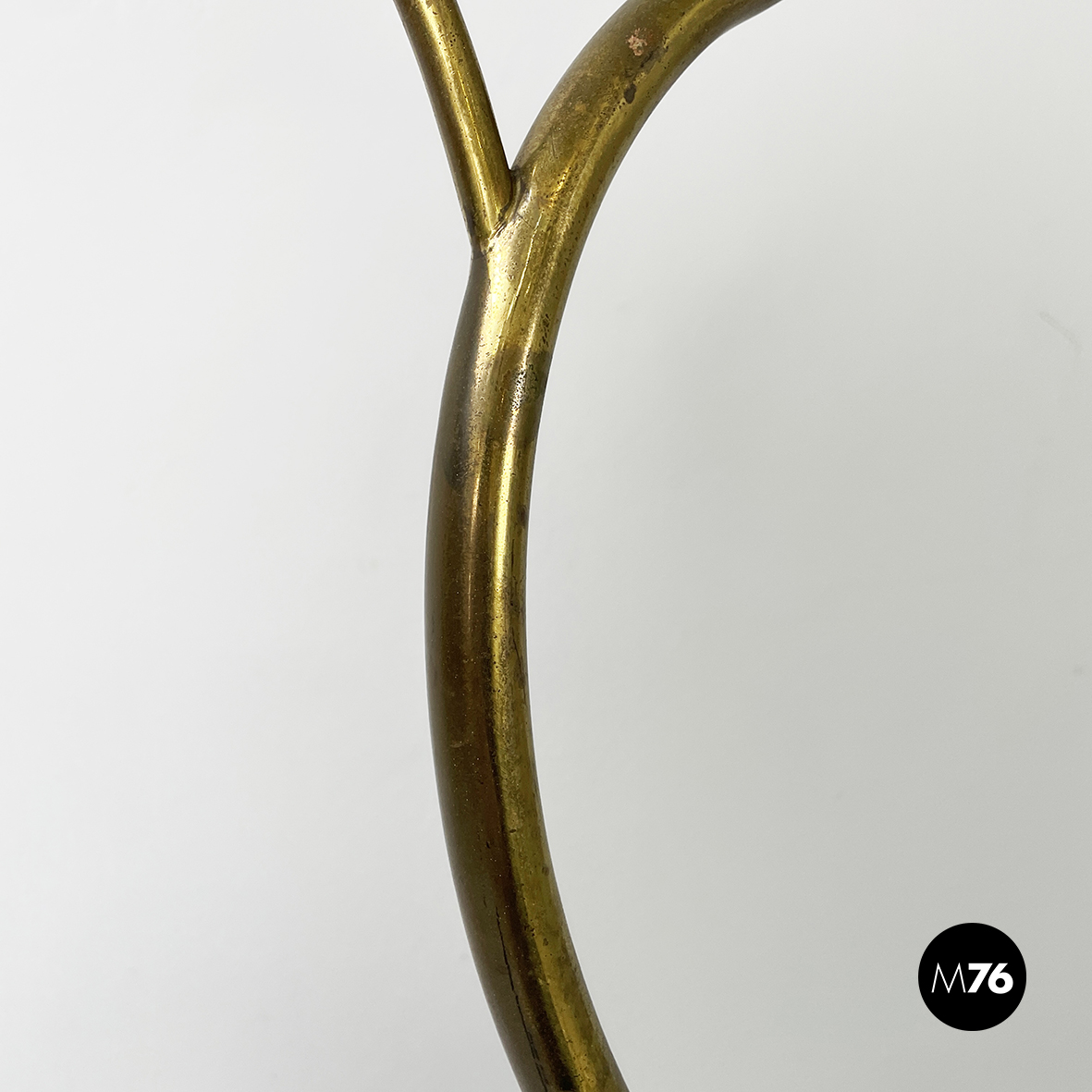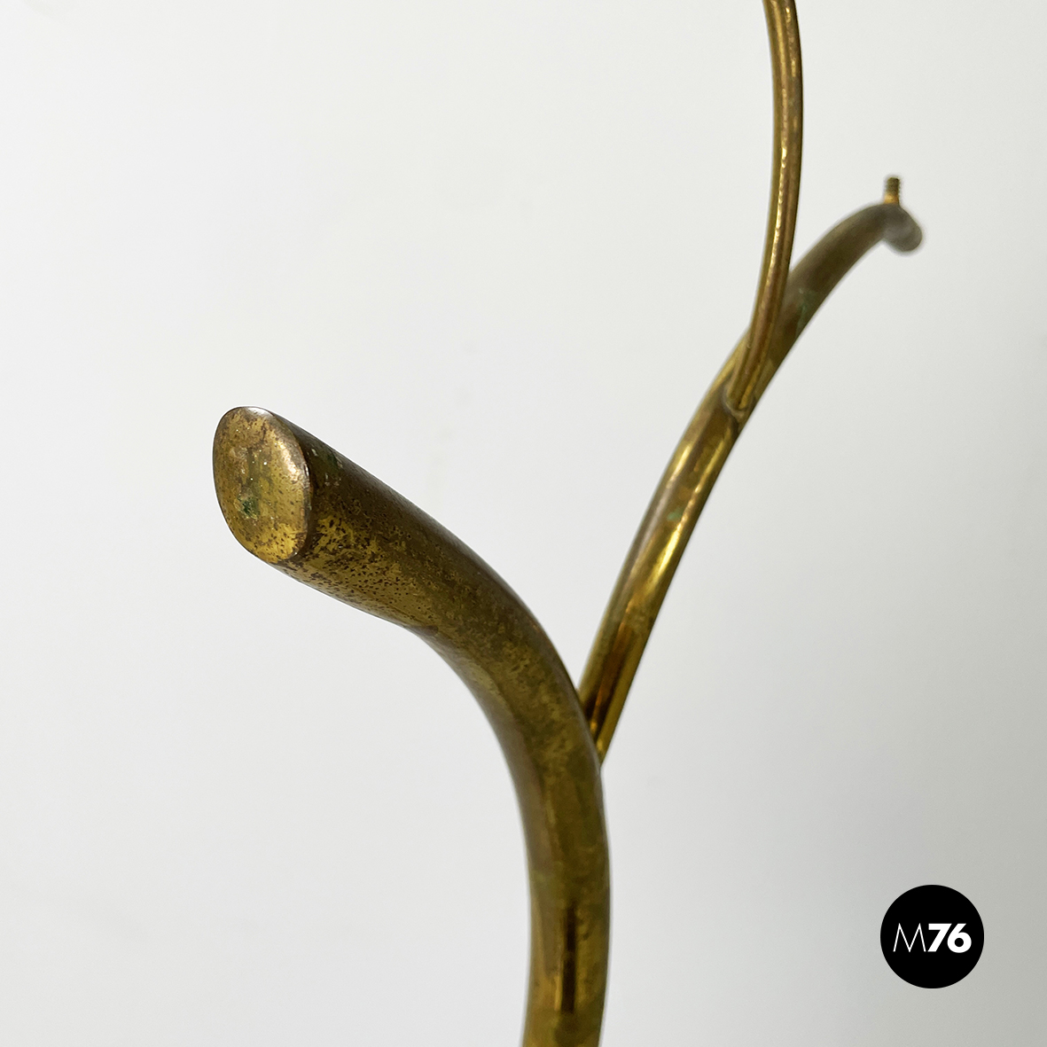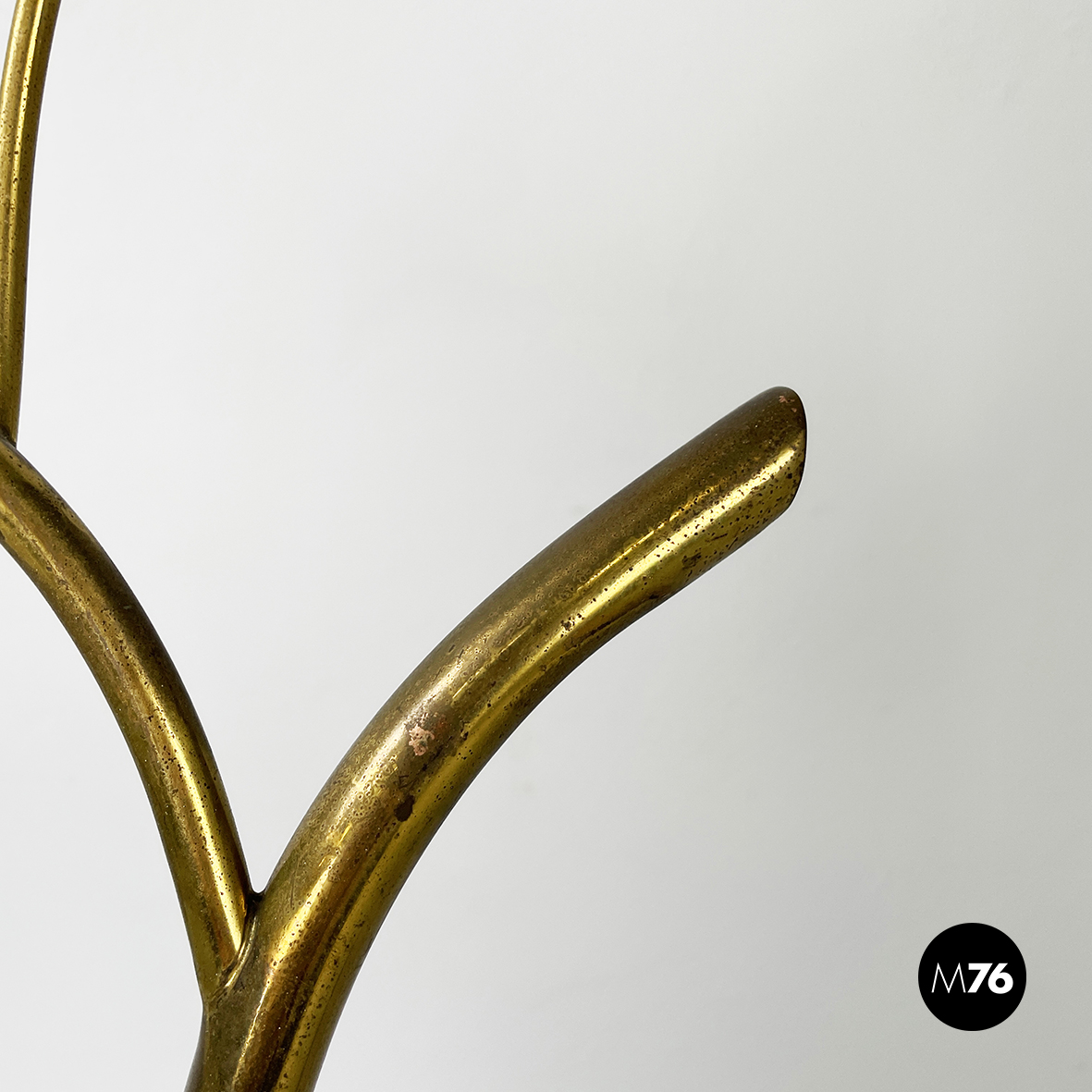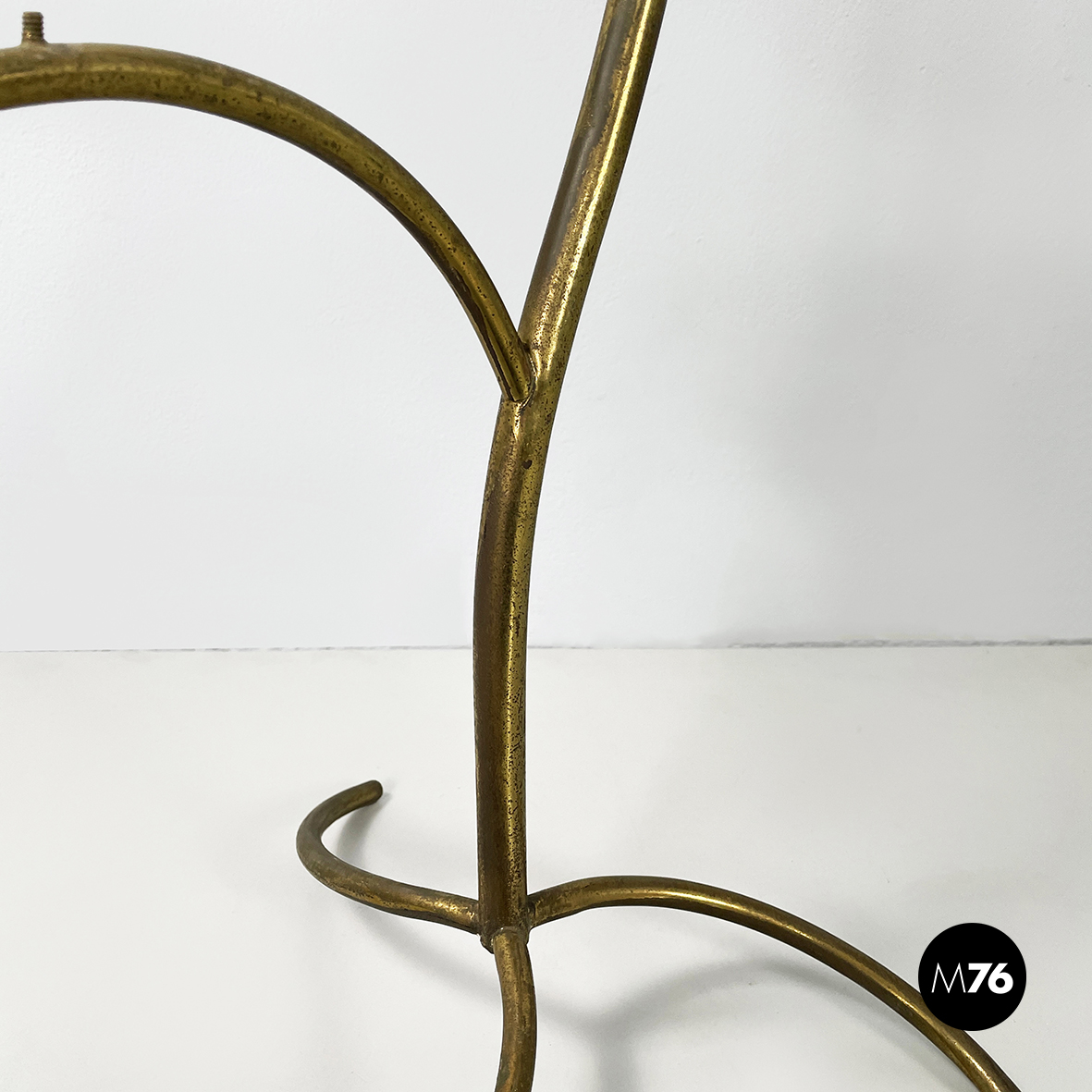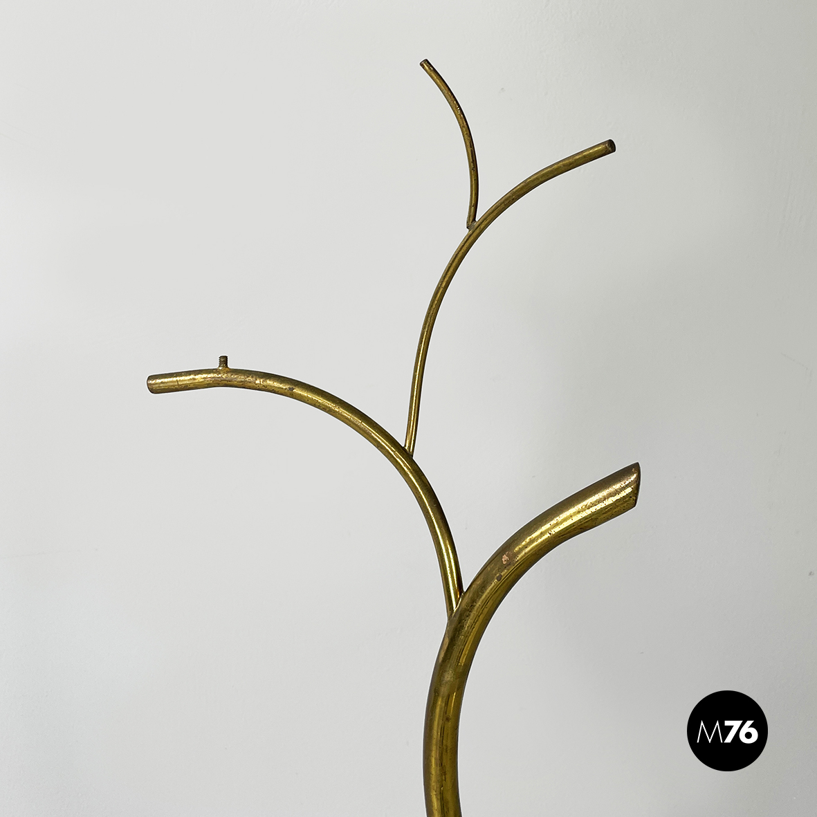 Espositore da terra con struttura in tondino di ottone. Base a tre zampe in tondino di ottone. Utilizzabile anche come piccolo appendino per cappelli.