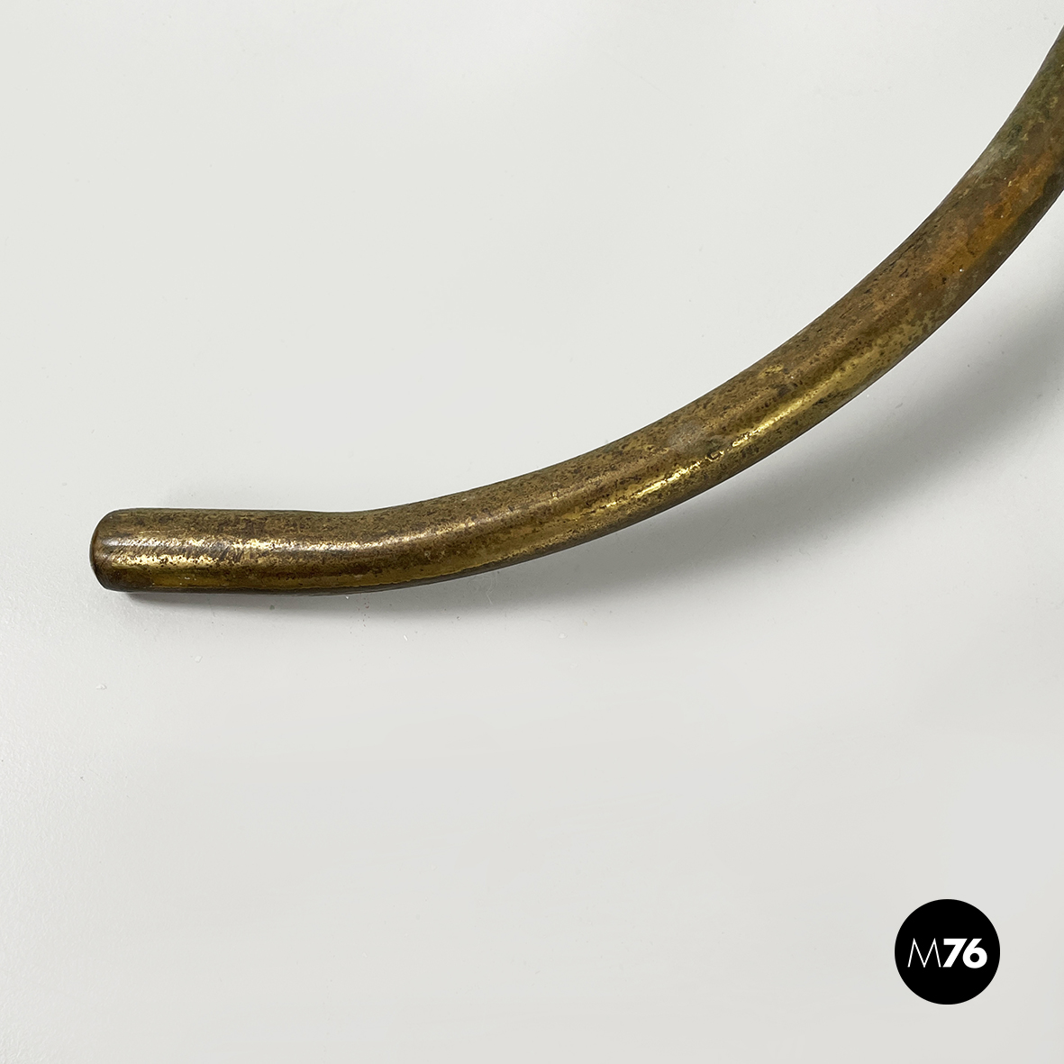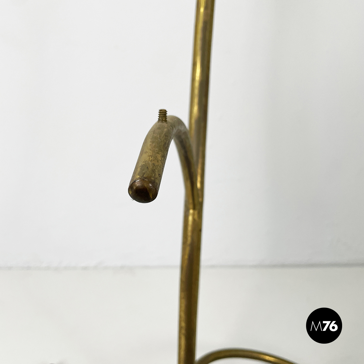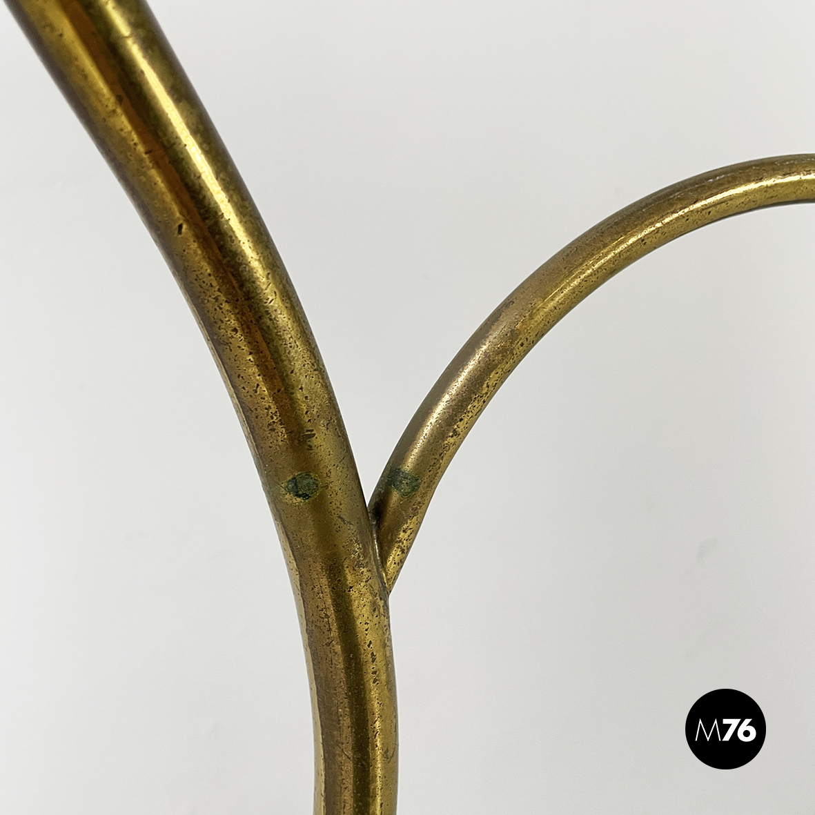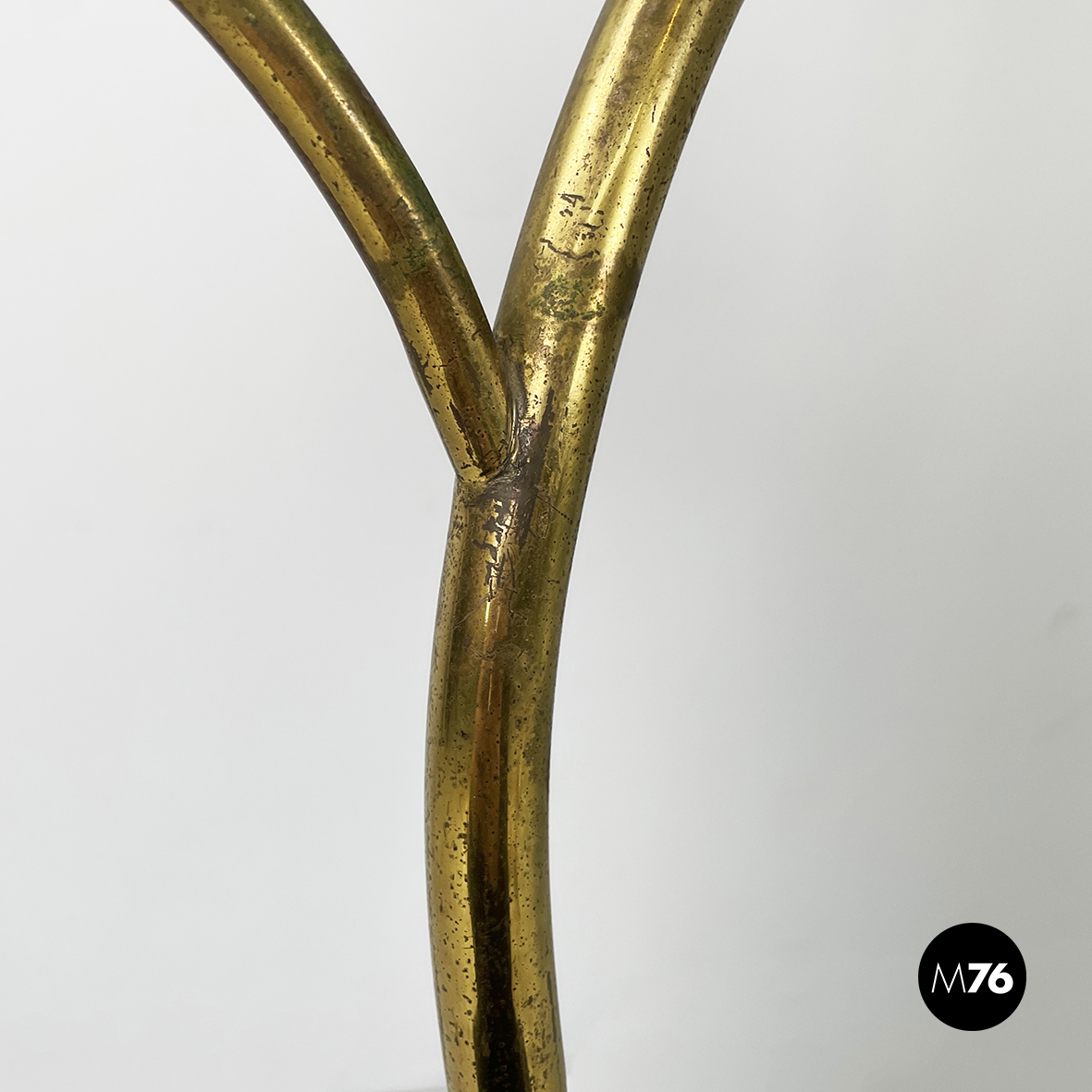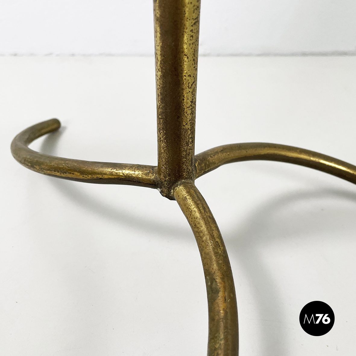 Espositore da terra con struttura in tondino di ottone. Base a tre zampe in tondino di ottone. Utilizzabile anche come piccolo appendino per cappelli.