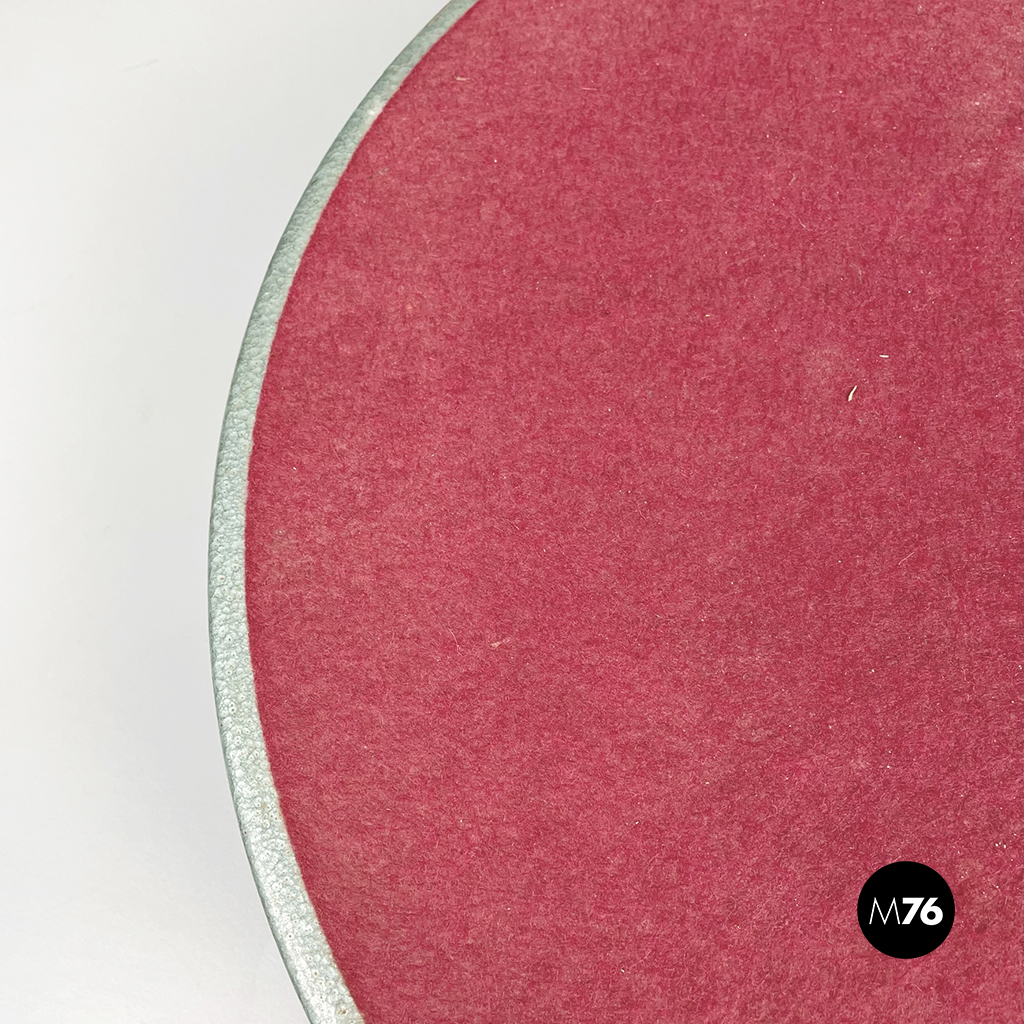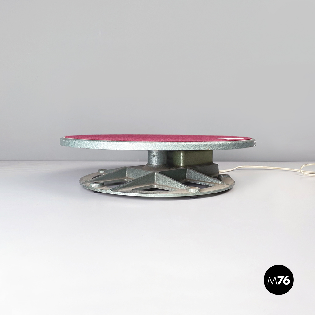Espositore da tavolo girevole in metallo e tessuto rosso. Il ripiano tondo presenta una struttura in metallo con al centro un tessuto rosso bordeaux. La struttura presenta un meccanismo interno, alimentato a corrette tramite presa elettrica, che permette al piano di girare a velocità costante.