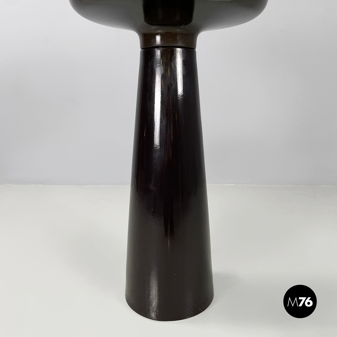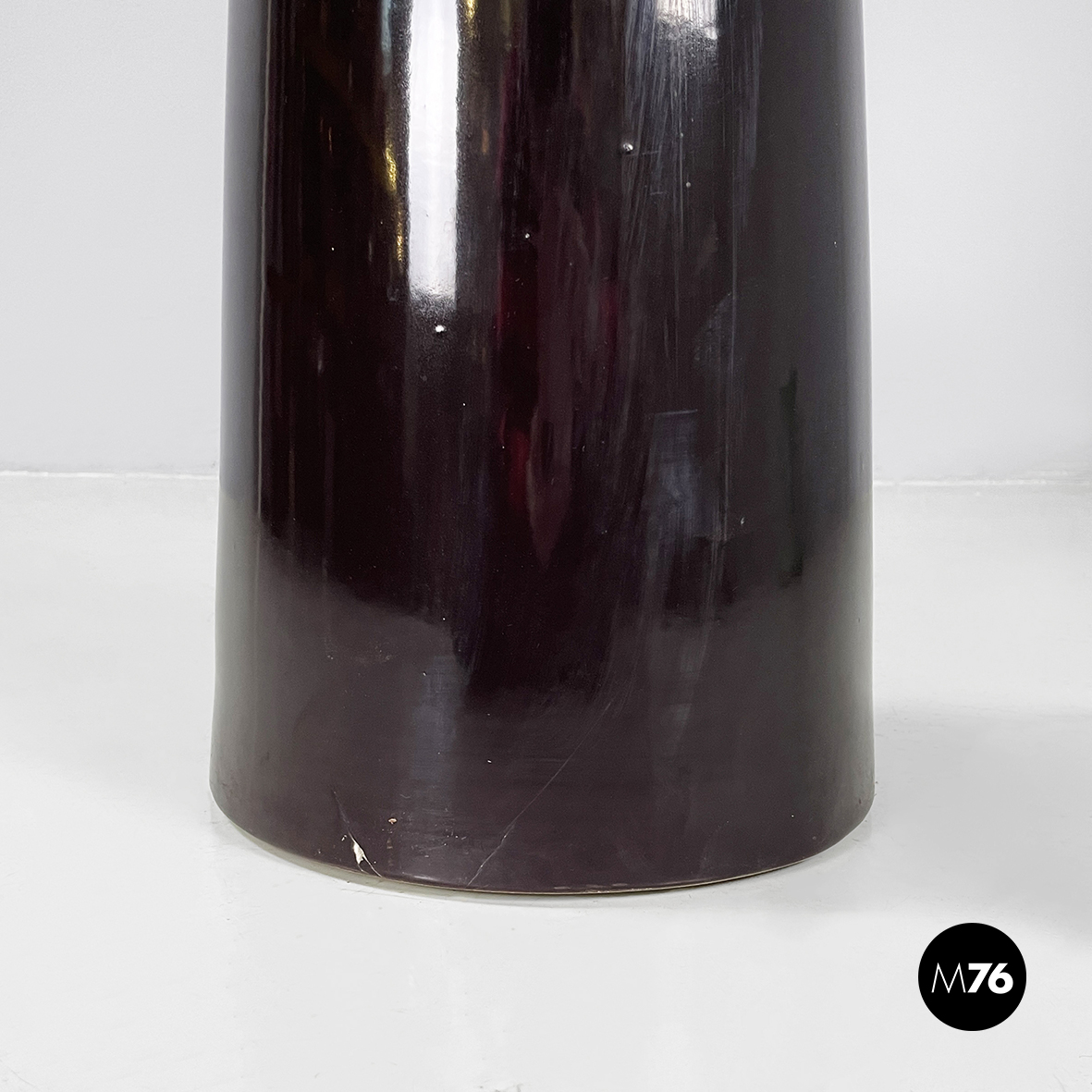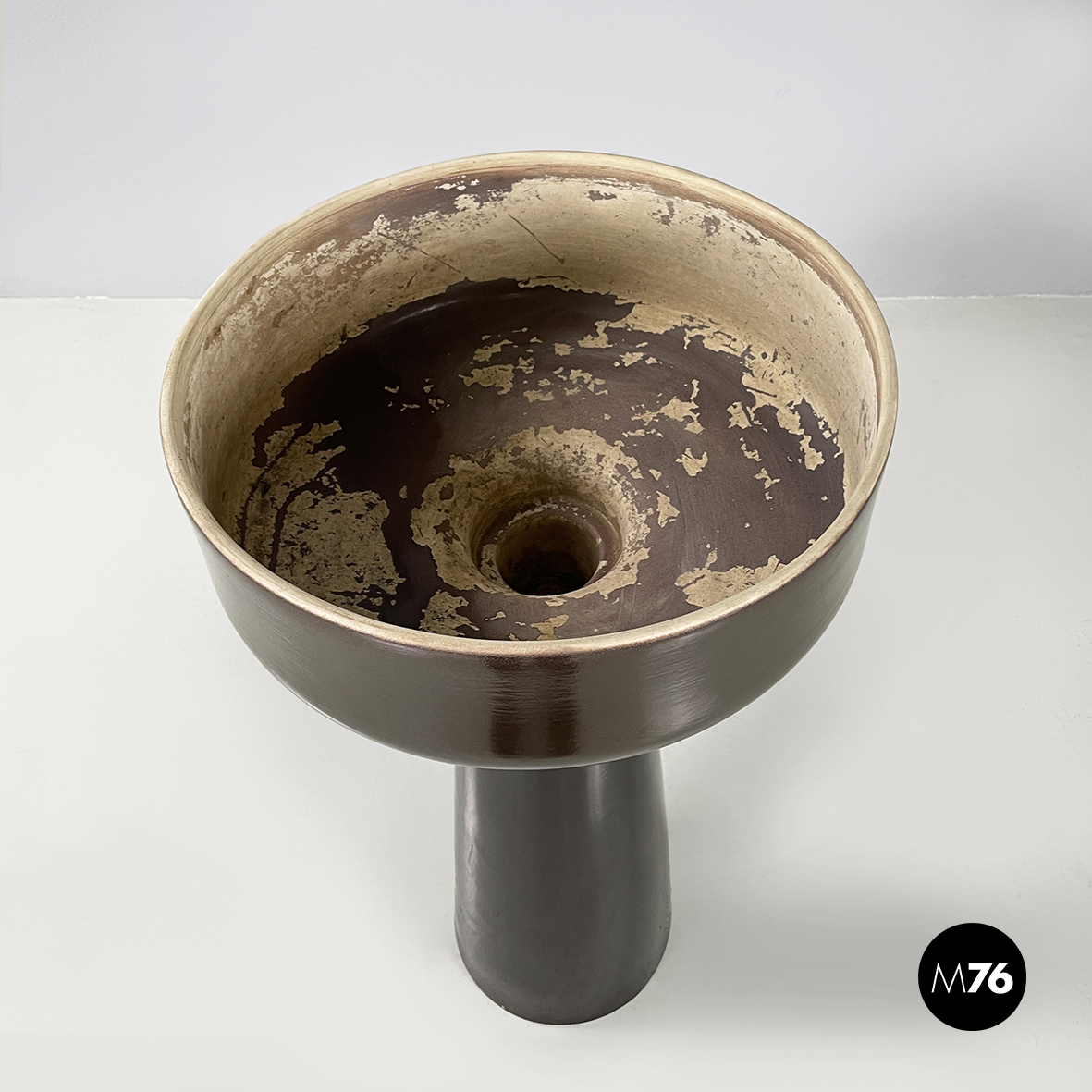 Fioriera a base tonda in ceramica smaltata marrone chiaro e scuro. La parte superiore è composta da un vano cilindrico in marrone chiaro con interni beige. Questo si poggia sulla base a sezione tonda in marrone scuro, la quale si allarga leggermente verso l’appoggio a terra. Utilizzabile anche in un ambiente esterno come in giardino.
