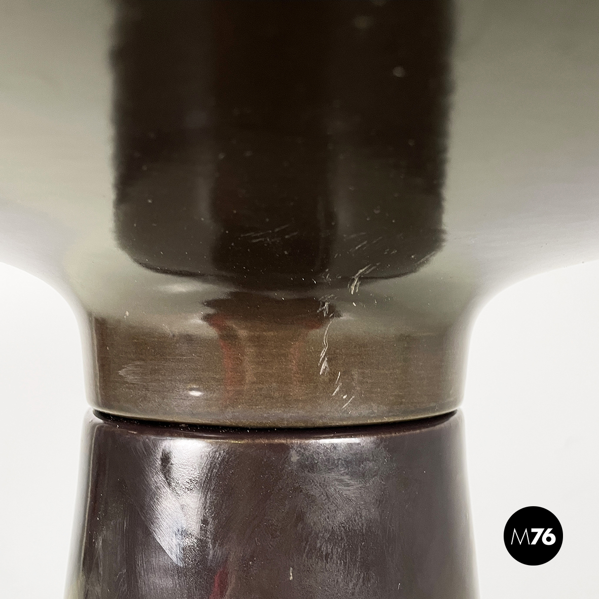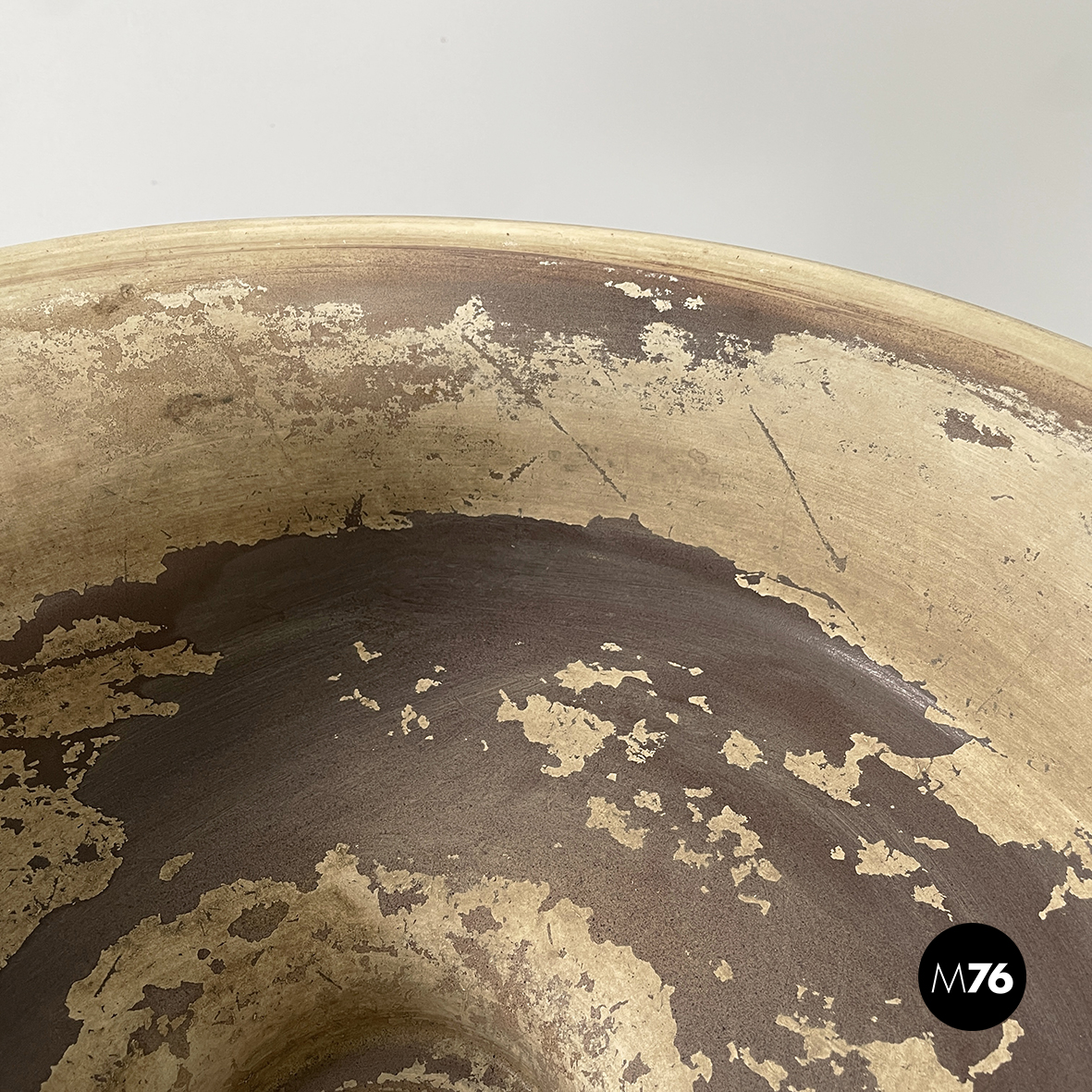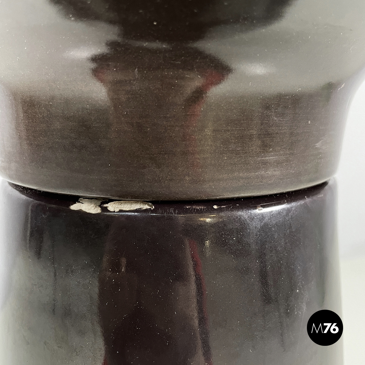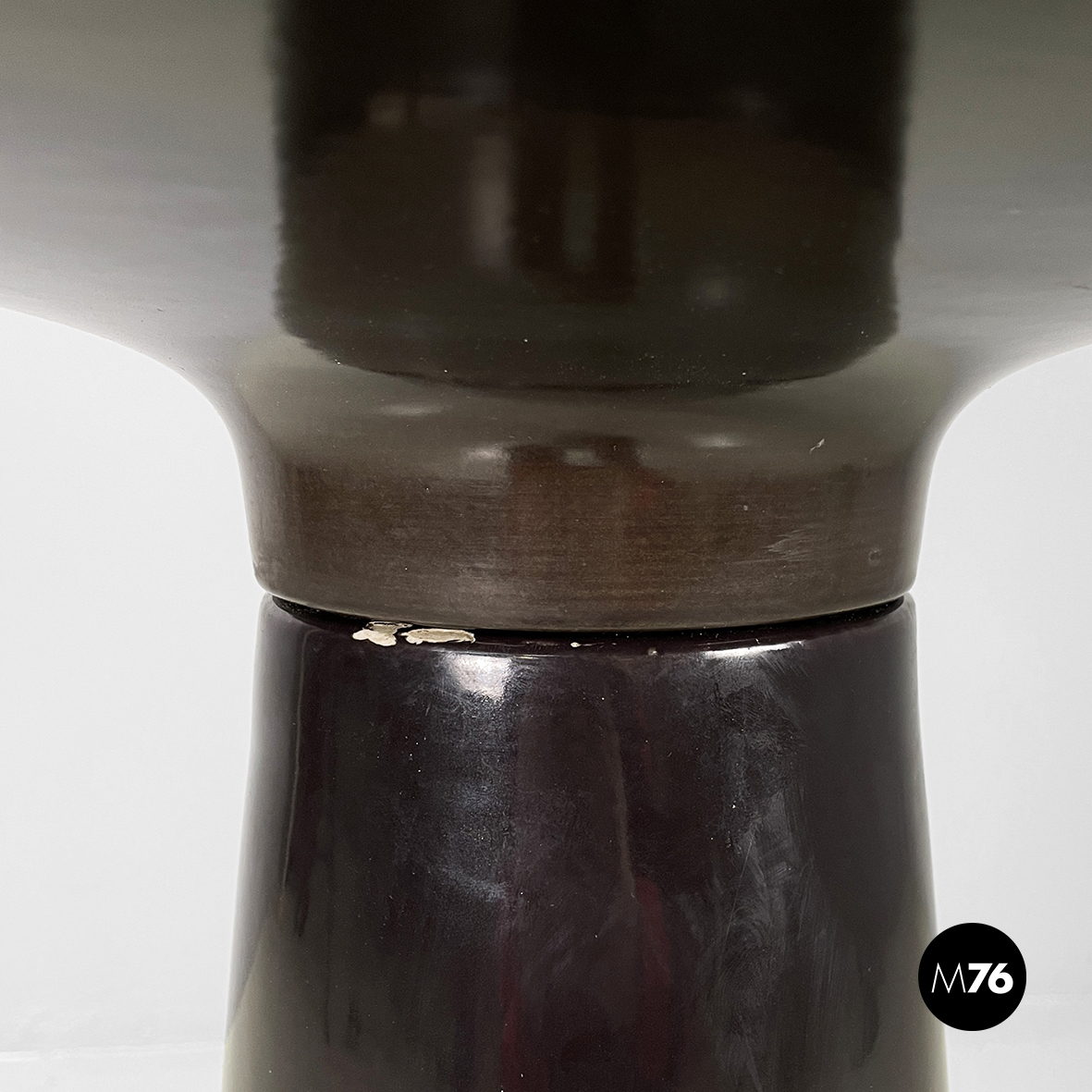 Fioriera a base tonda in ceramica smaltata marrone chiaro e scuro. La parte superiore è composta da un vano cilindrico in marrone chiaro con interni beige. Questo si poggia sulla base a sezione tonda in marrone scuro, la quale si allarga leggermente verso l’appoggio a terra. Utilizzabile anche in un ambiente esterno come in giardino.