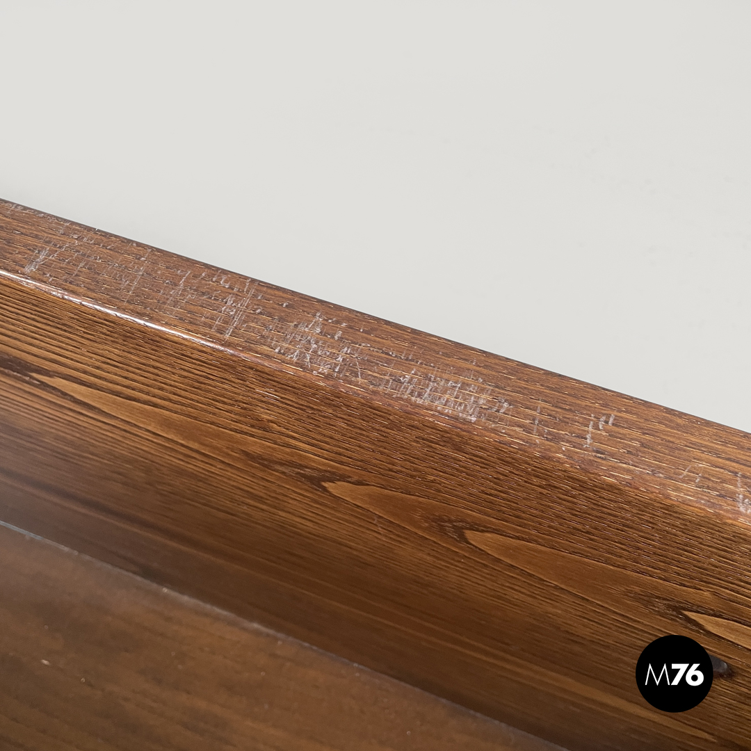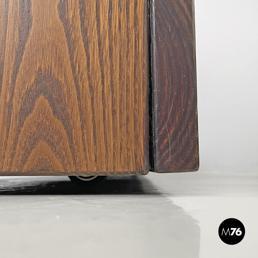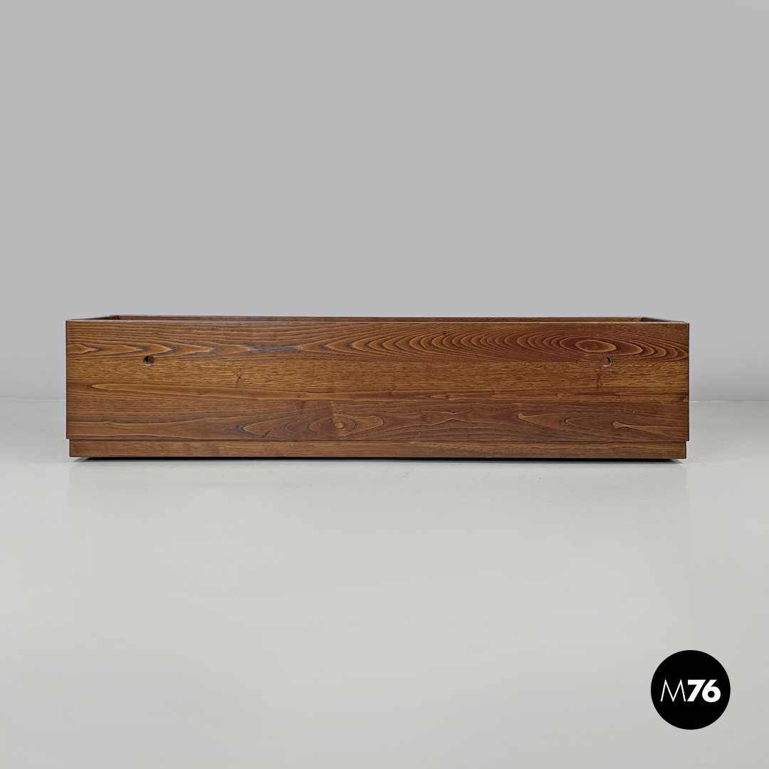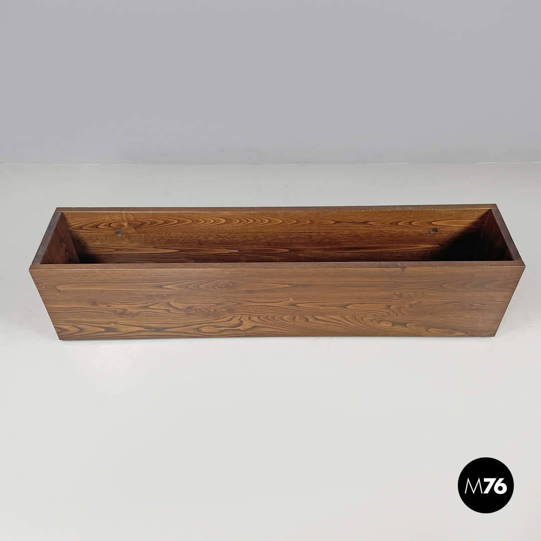 Fioriera interamente in legno con ruote. La struttura del porta-vaso presenta una forma rettangolare allungata, su un lato sono presenti due fori. All’interno della fioriera, alla base, sono presenti due bulloni in metallo ad ogni angolo che corrispondono alle ruote.