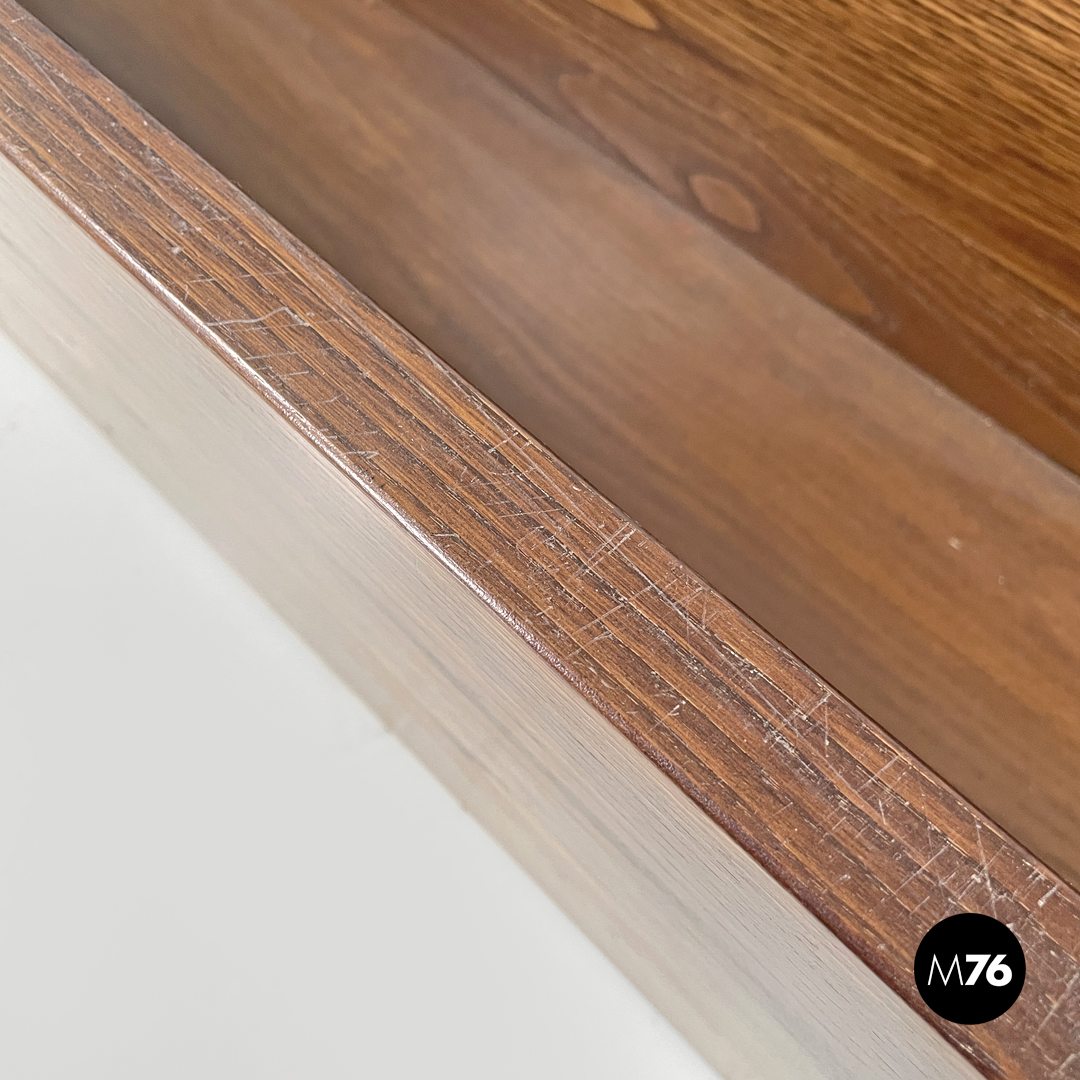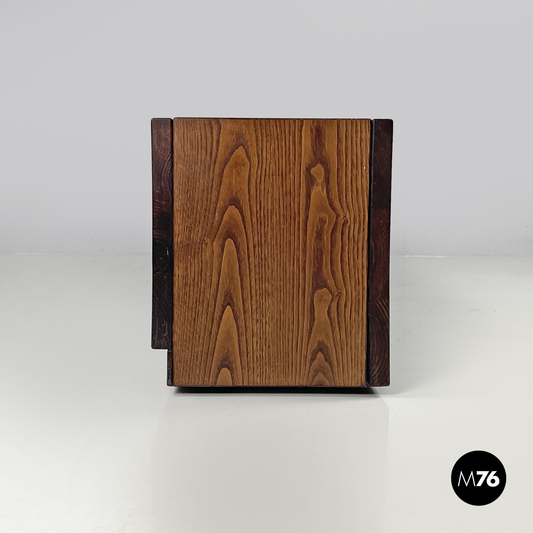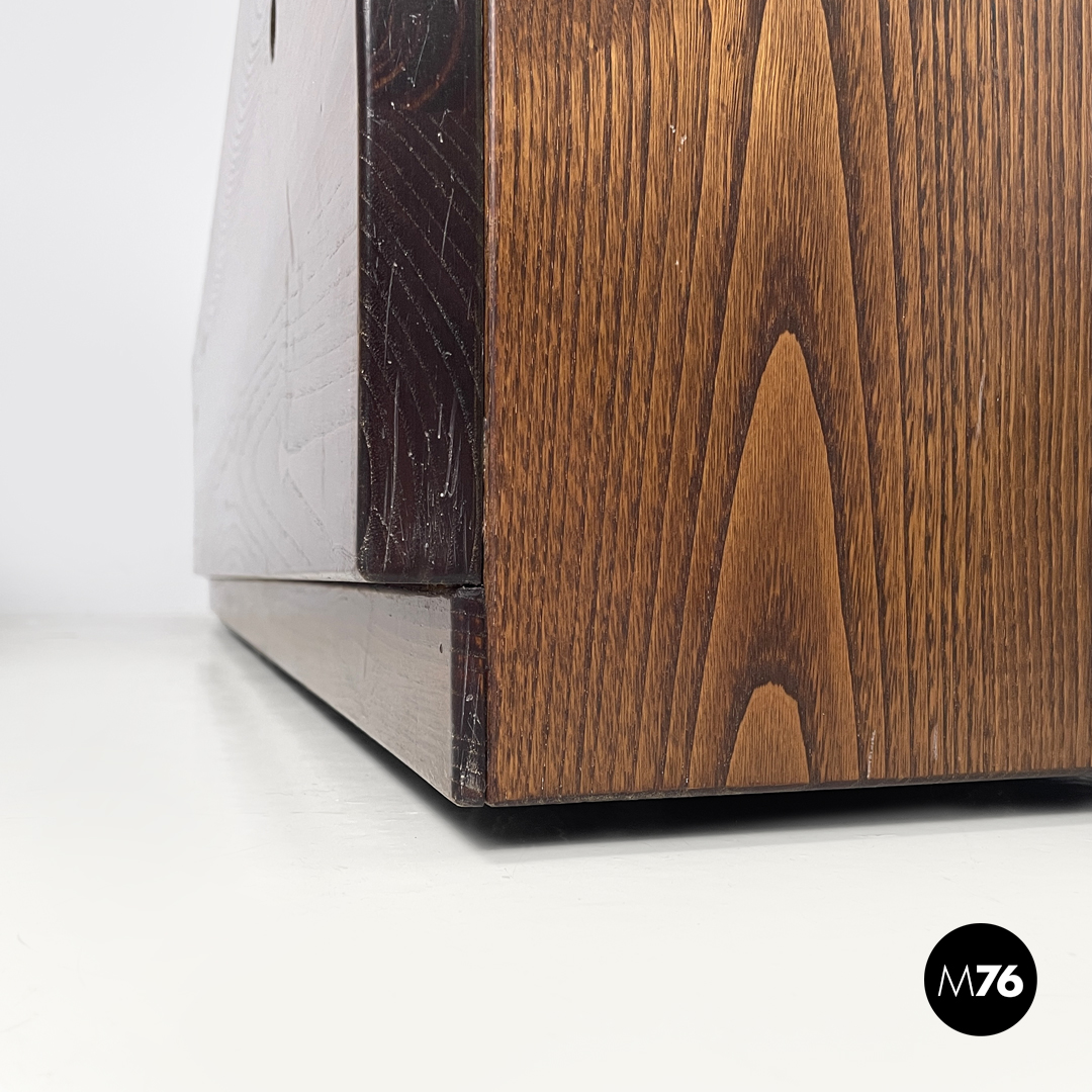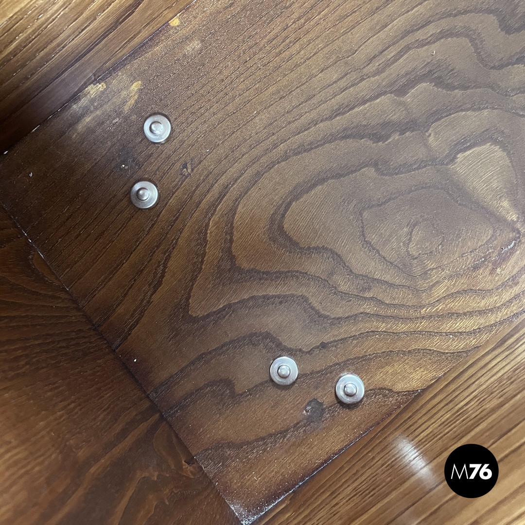 Fioriera interamente in legno con ruote. La struttura del porta-vaso presenta una forma rettangolare allungata, su un lato sono presenti due fori. All’interno della fioriera, alla base, sono presenti due bulloni in metallo ad ogni angolo che corrispondono alle ruote.