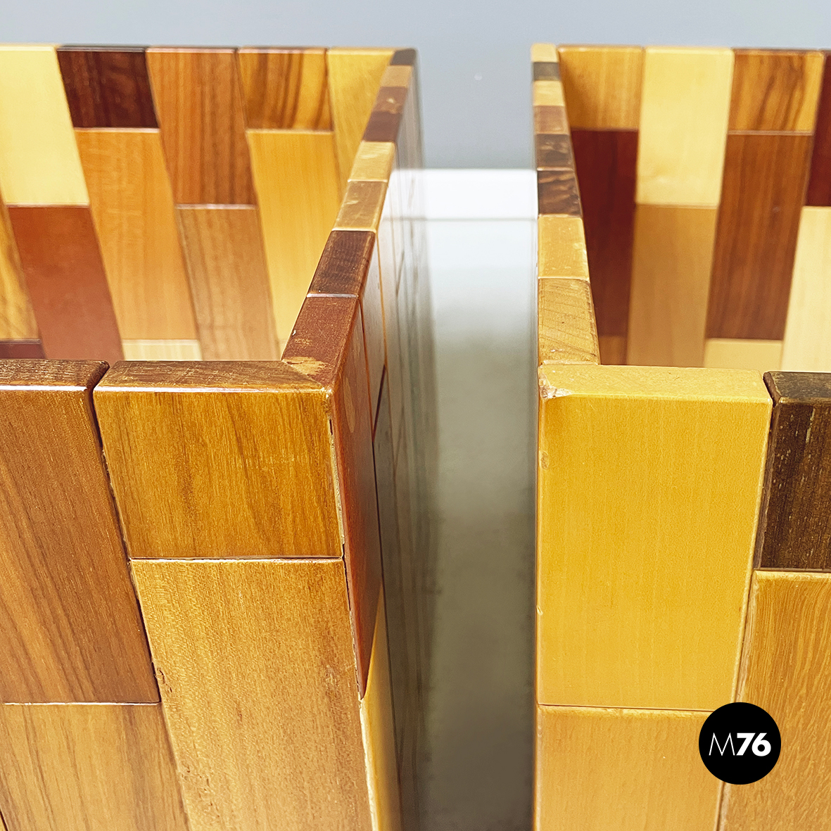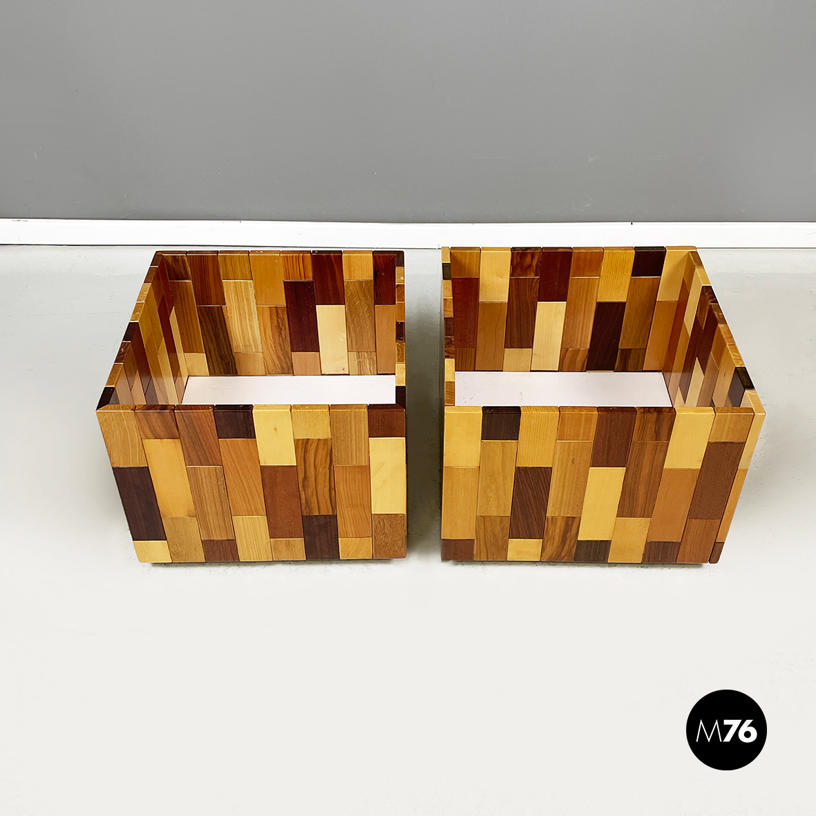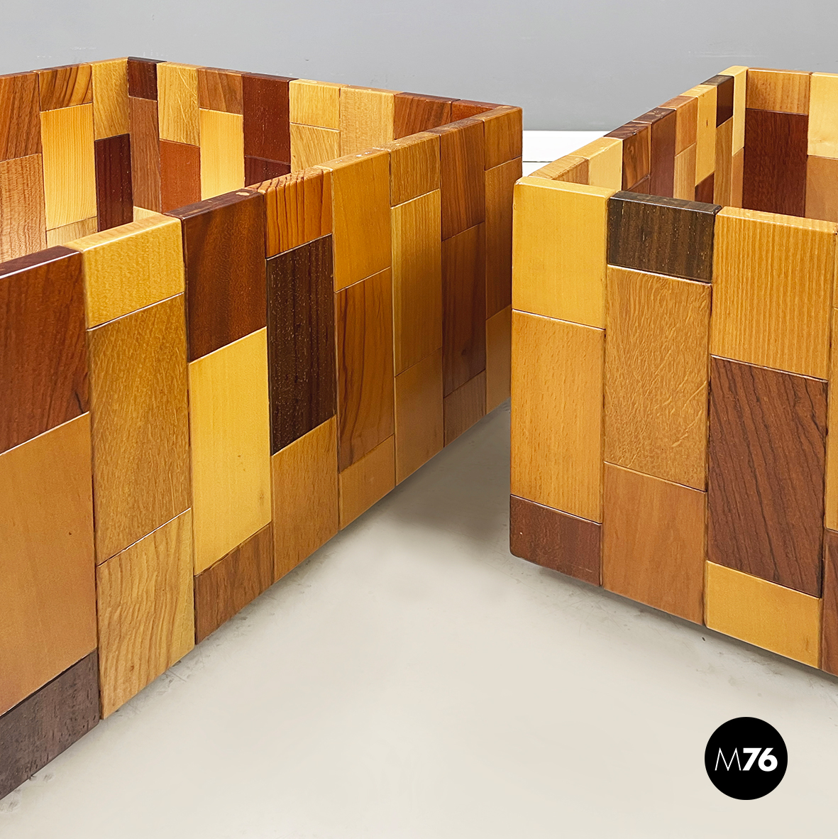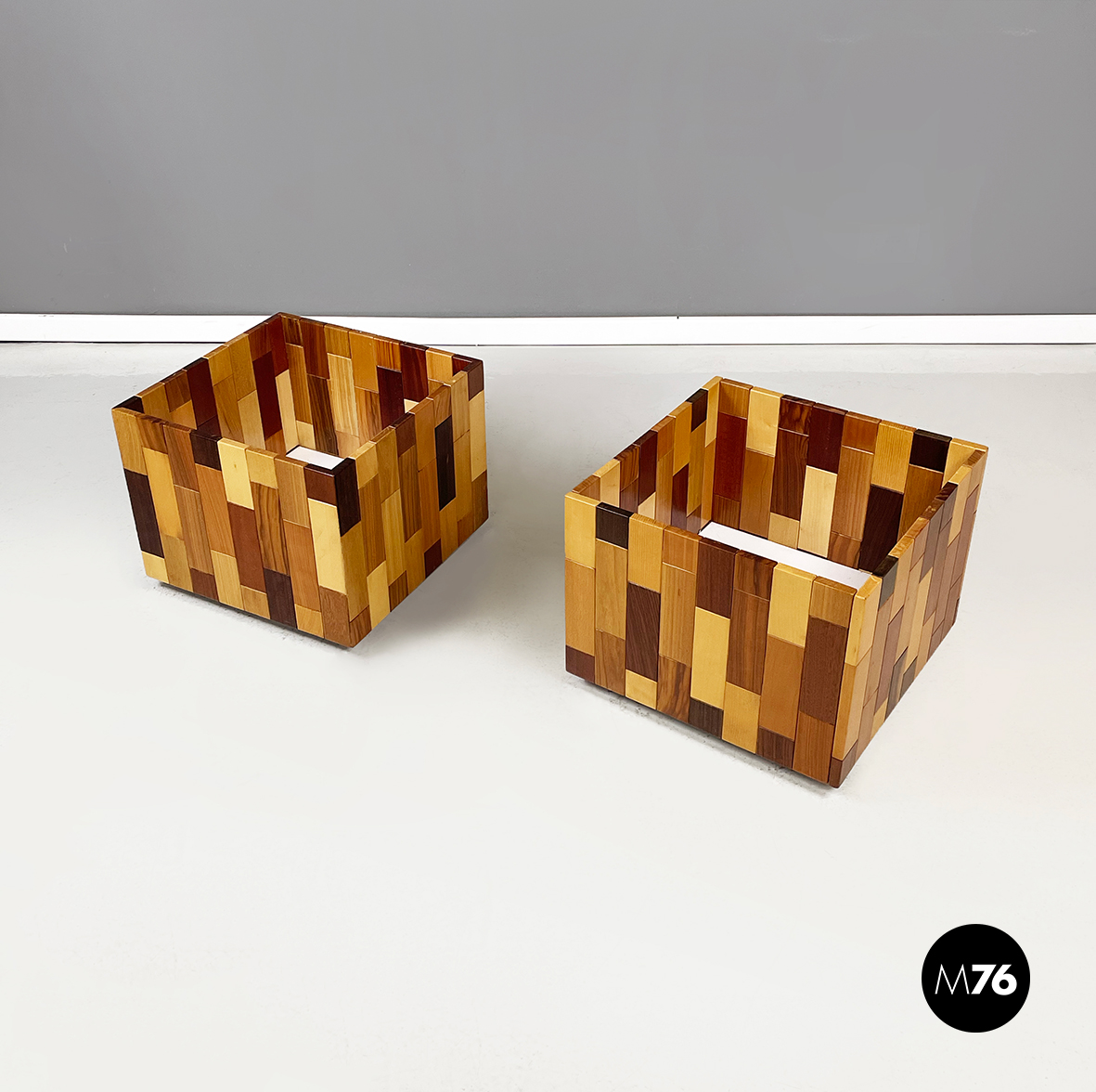 Coppia di fioriere a base quadrata con struttura in listelli di legno di differenti colori. La base è bianca. Sotto presenta quattro ruote nere.