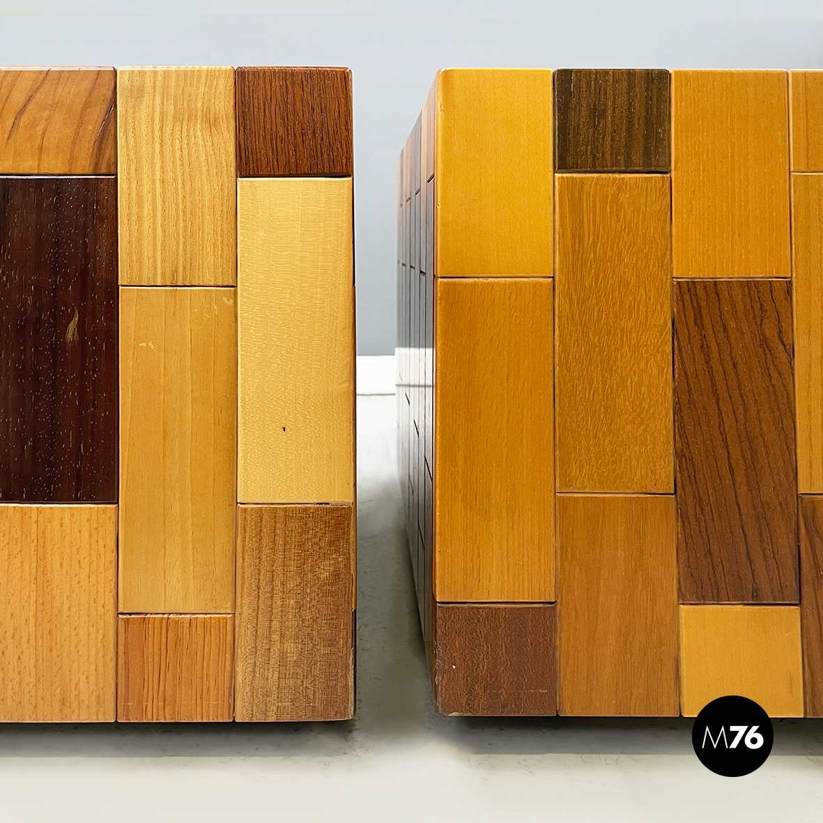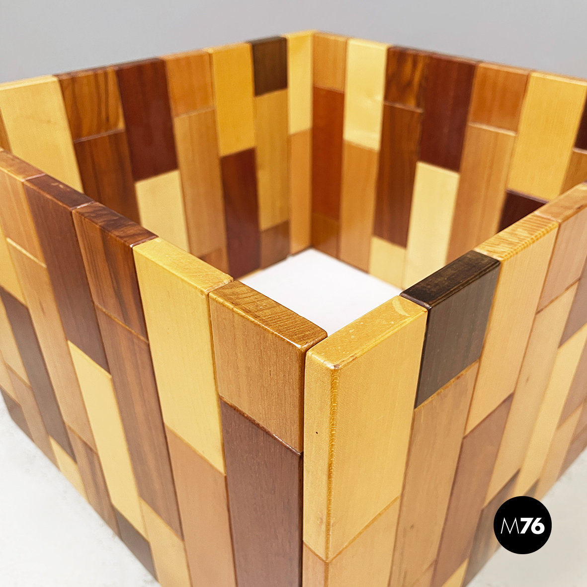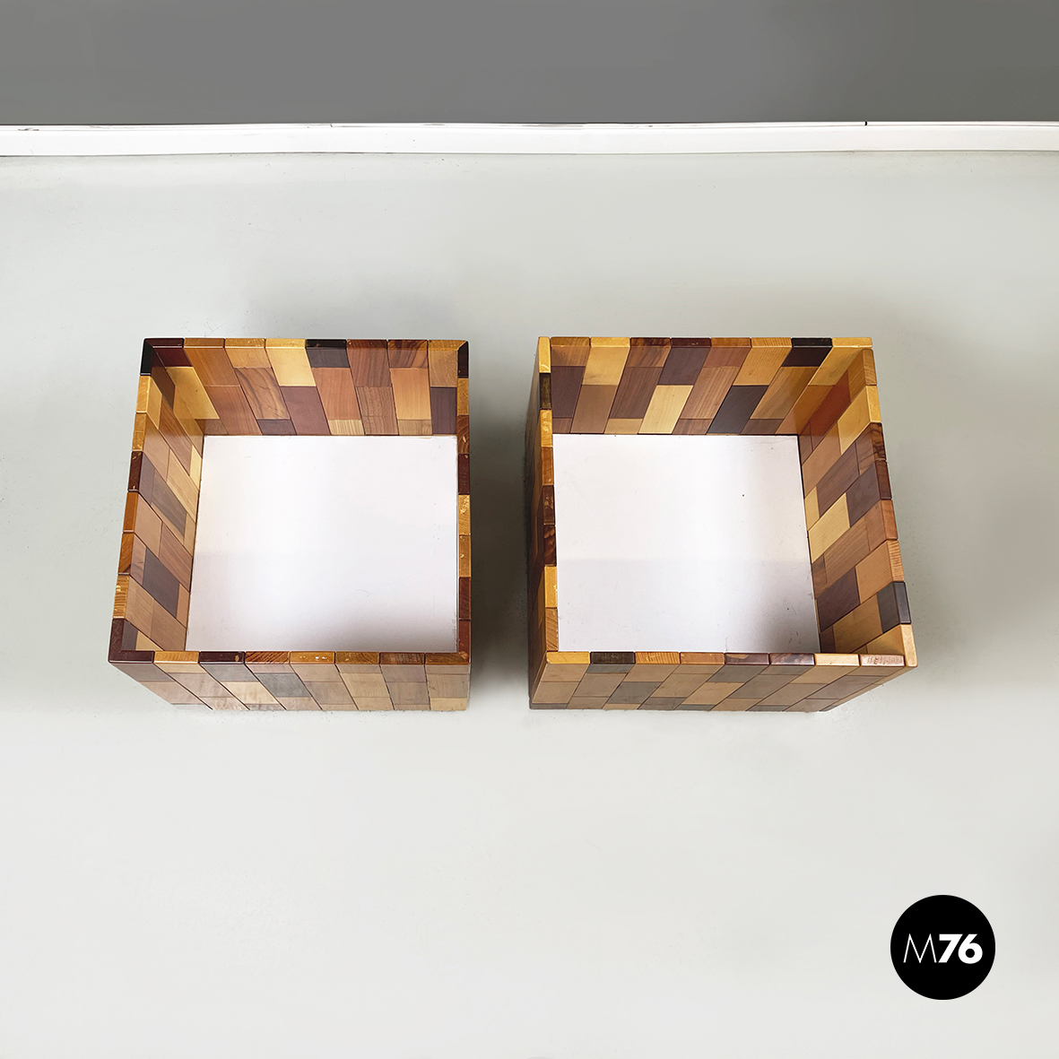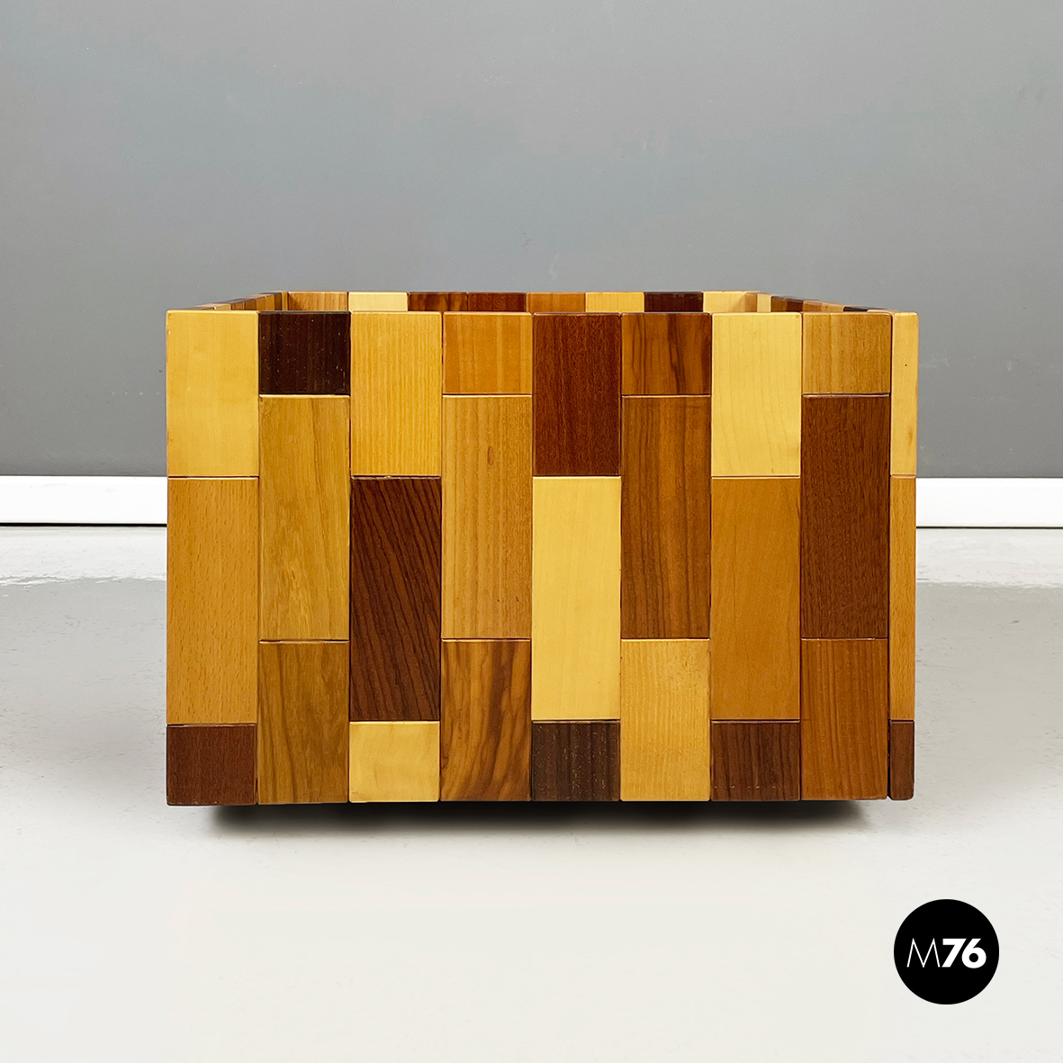 Coppia di fioriere a base quadrata con struttura in listelli di legno di differenti colori. La base è bianca. Sotto presenta quattro ruote nere.